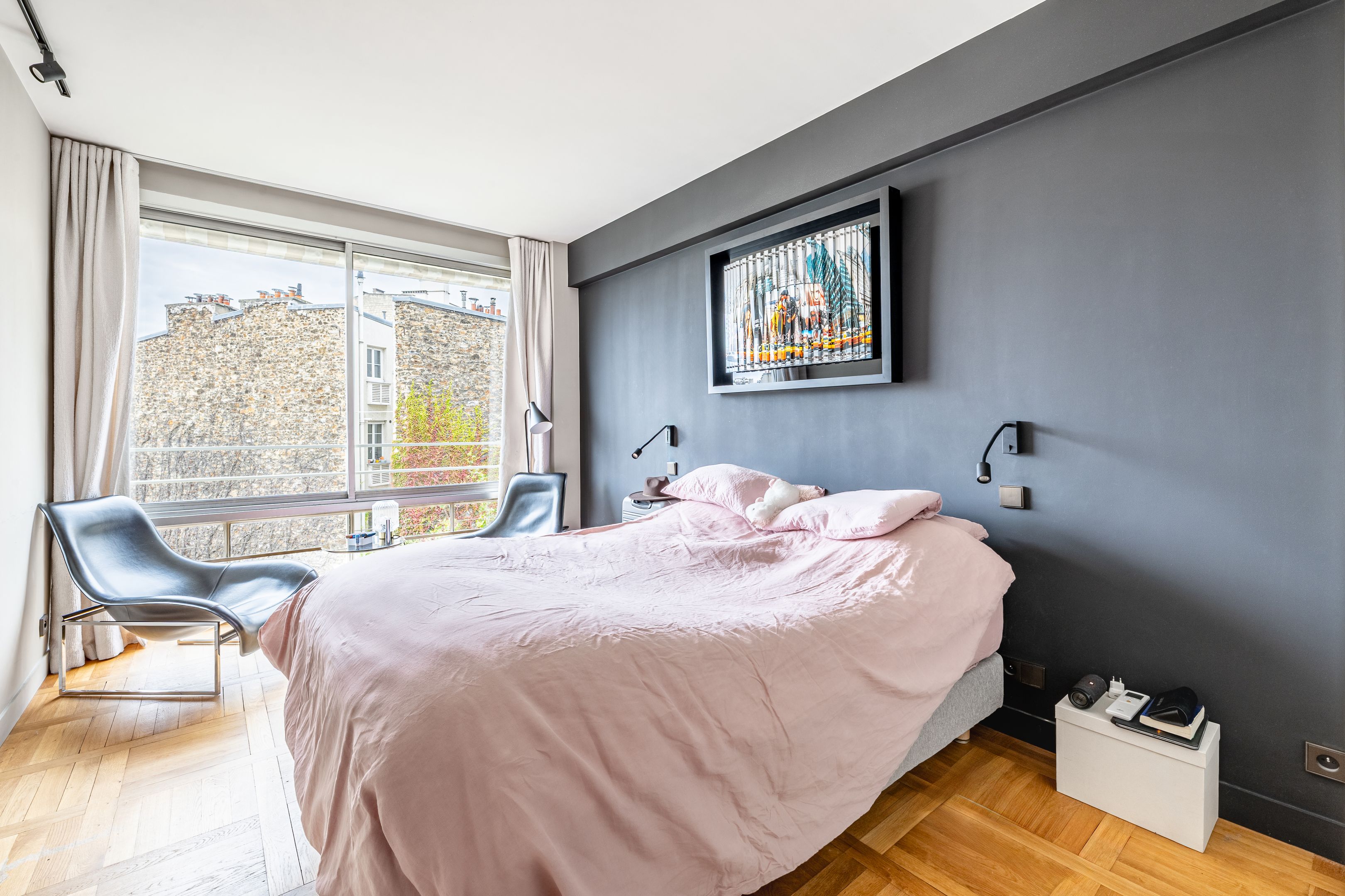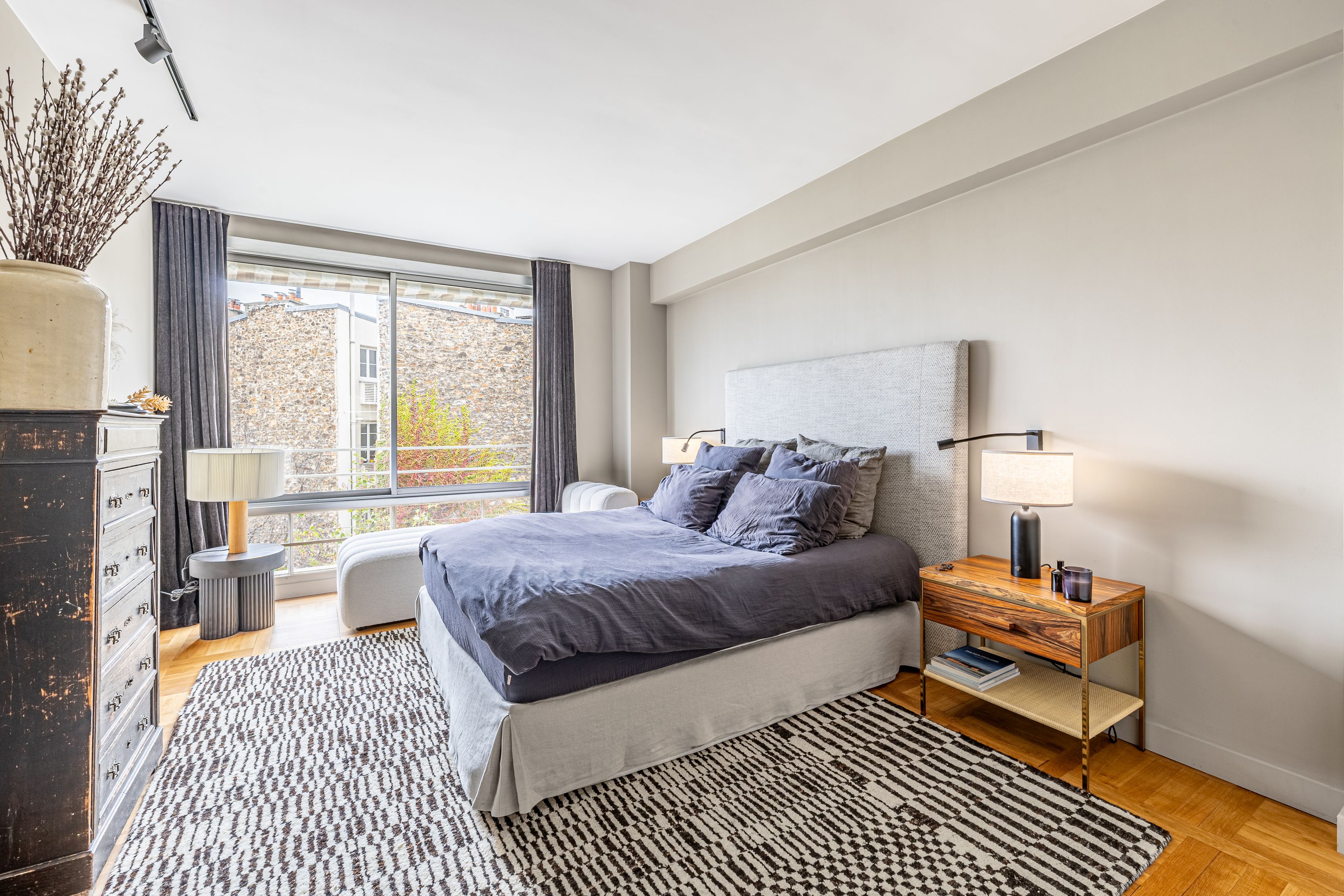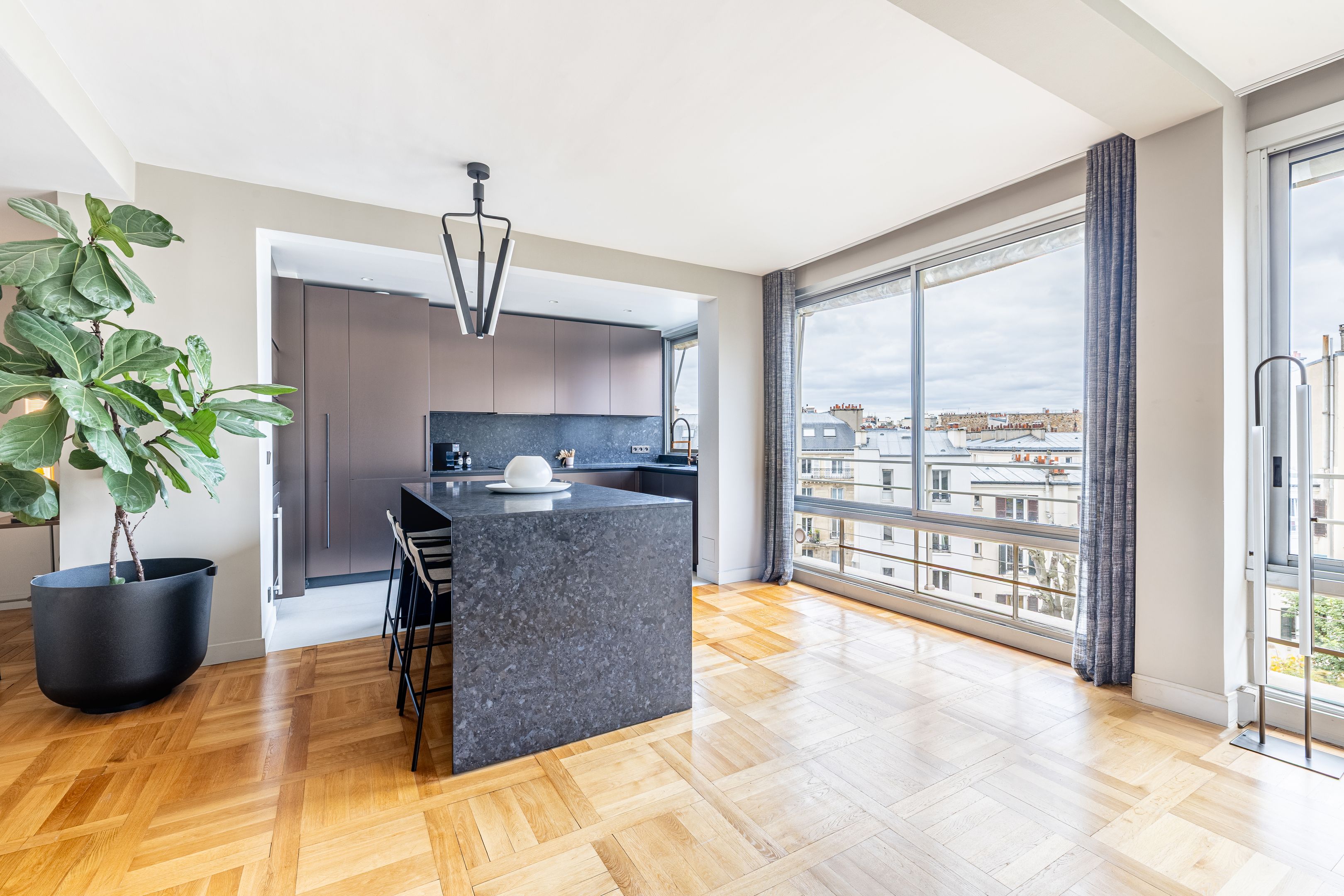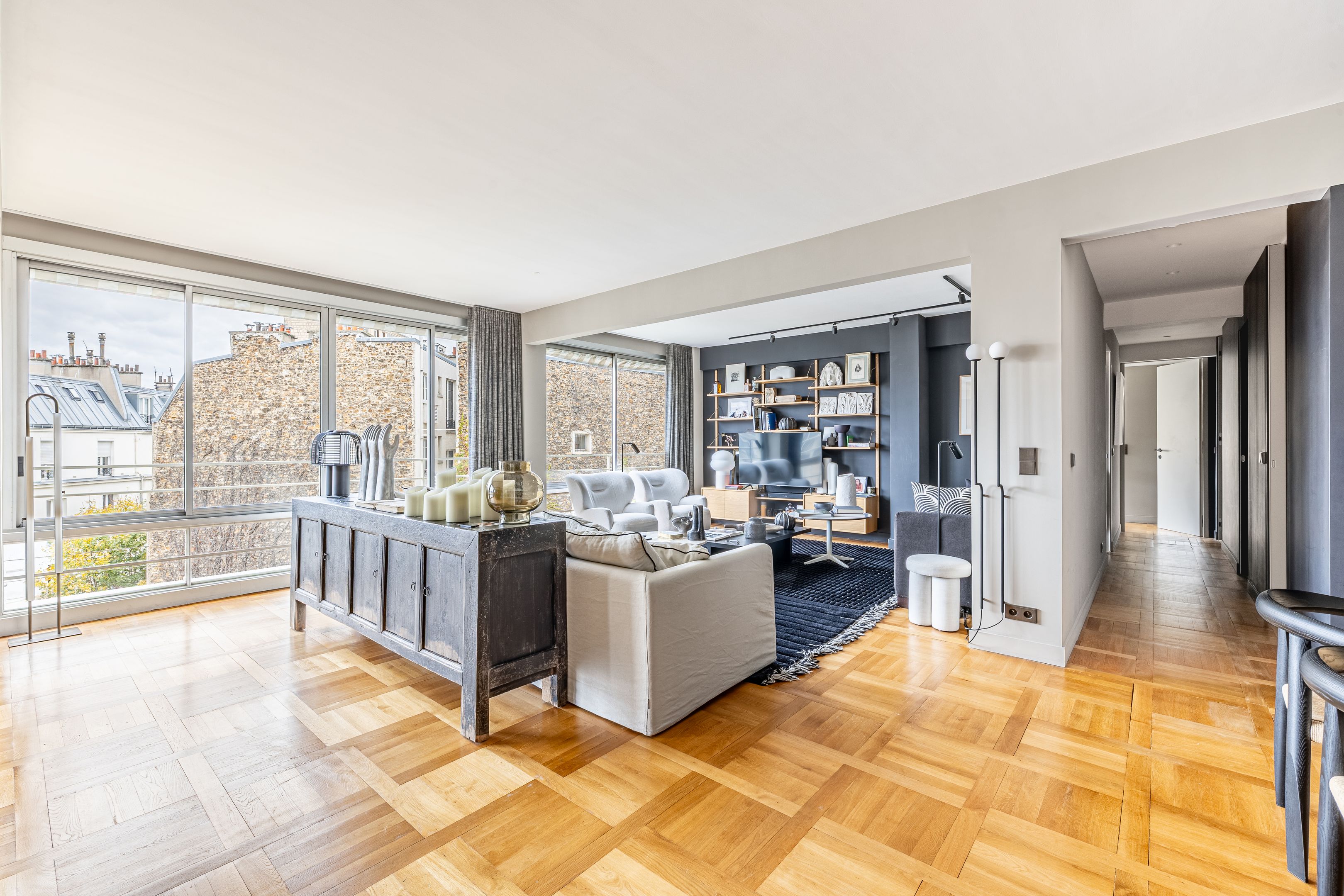 Ideally located in the heart of Passy's many shops, transport facilities and renowned schools. On the sixth floor, served by elevator, of a pleasant mid-twentieth century luxury residence, secure and planted with trees, superb air-conditioned family apartment with a surface area of 128.15m² loi Carrez, in absolute calm and unoverlooked, tastefully renovated and benefiting from an exemplary floor plan and sunshine thanks to its south-west orientation. Entrance hall, vast reception room, dining area, open-plan fitted and equipped kitchen, two large bedrooms (possibility of 3 as originally), including a master suite with en-suite shower room and toilet, bathroom, guest toilet, dressing room and plenty of storage space. Original three-bedroom configuration. Cellar.
