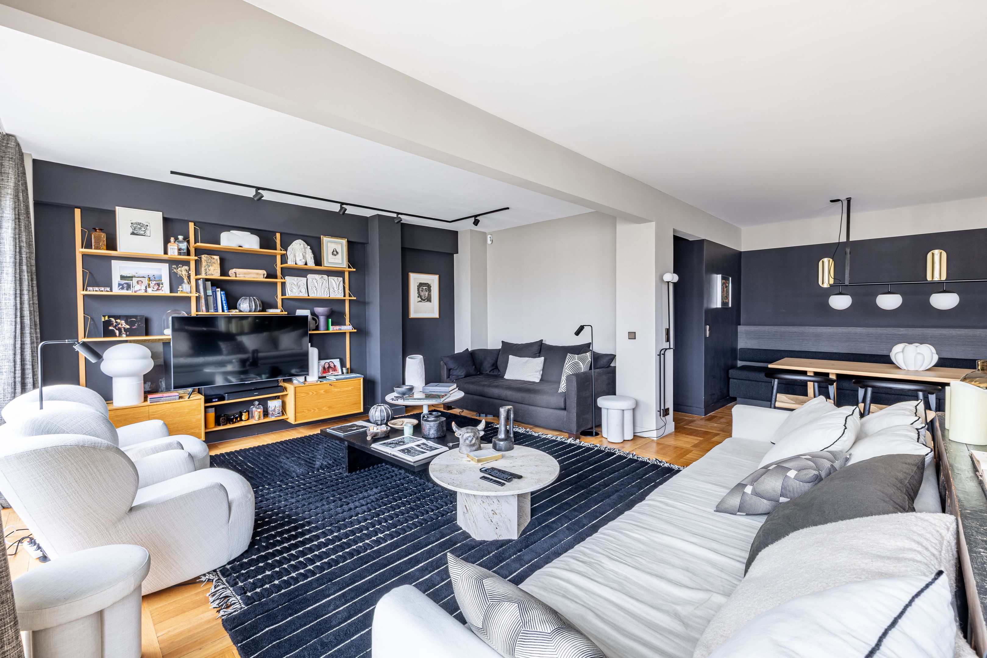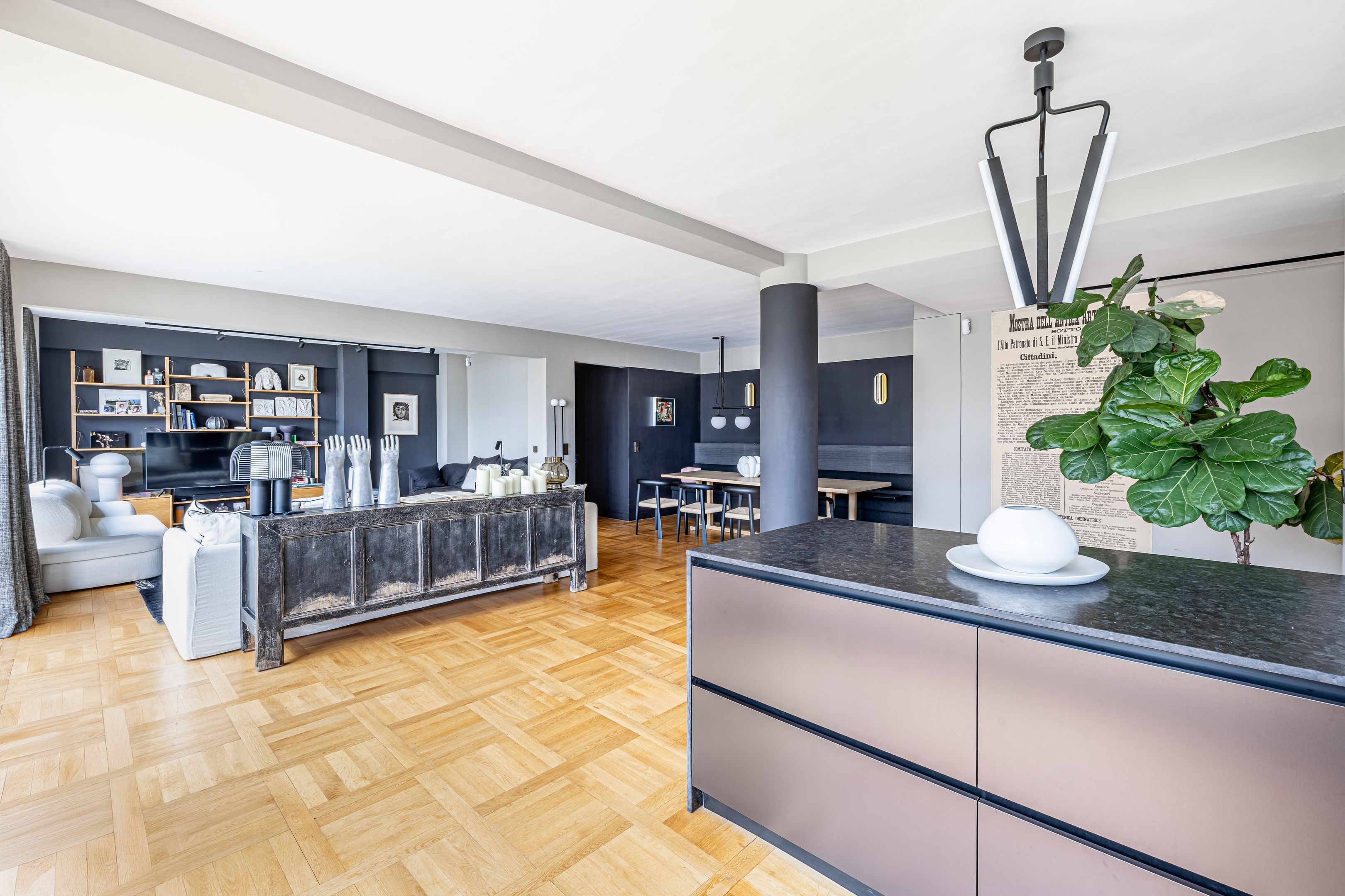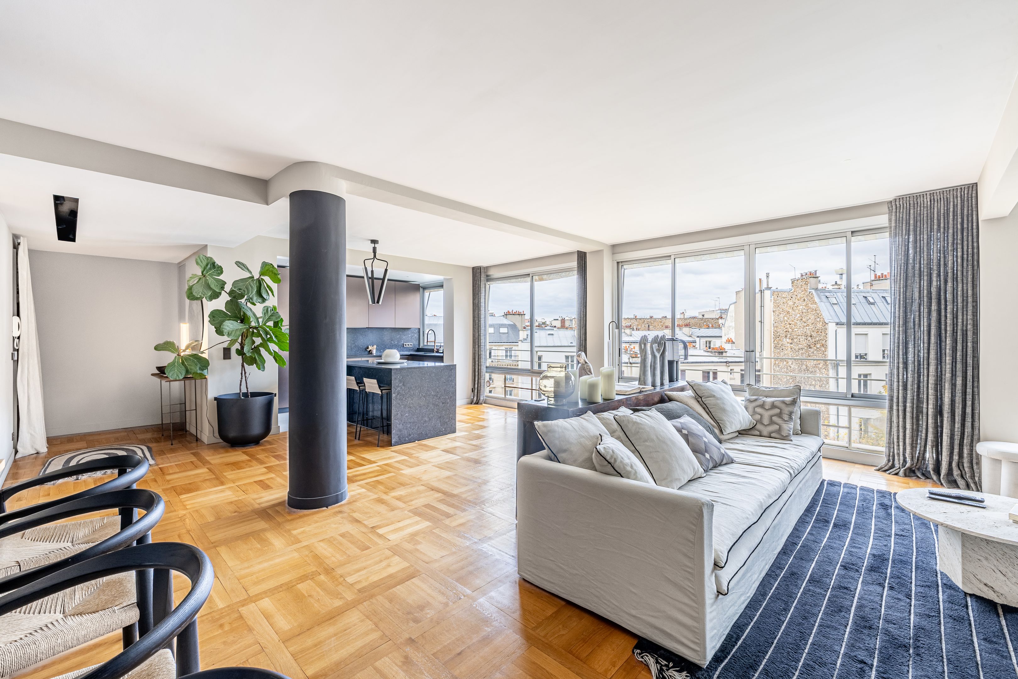 Ideally located in the heart of Passy's many shops, transport facilities and renowned schools. On the sixth floor, served by elevator, of a pleasant mid-twentieth century luxury residence, secure and planted with trees, superb air-conditioned family apartment with a surface area of 128.15m² loi Carrez, in absolute calm and unoverlooked, tastefully renovated and benefiting from an exemplary floor plan and sunshine thanks to its south-west orientation. Entrance hall, vast reception room, dining area, open-plan fitted and equipped kitchen, two large bedrooms (possibility of 3 as originally), including a master suite with en-suite shower room and toilet, bathroom, guest toilet, dressing room and plenty of storage space. Original three-bedroom configuration. Cellar.