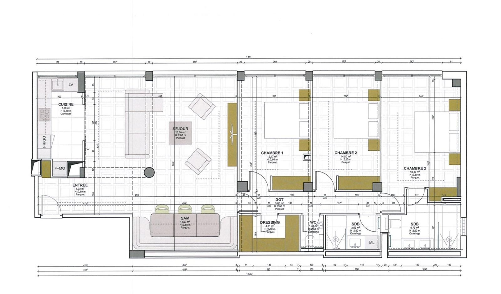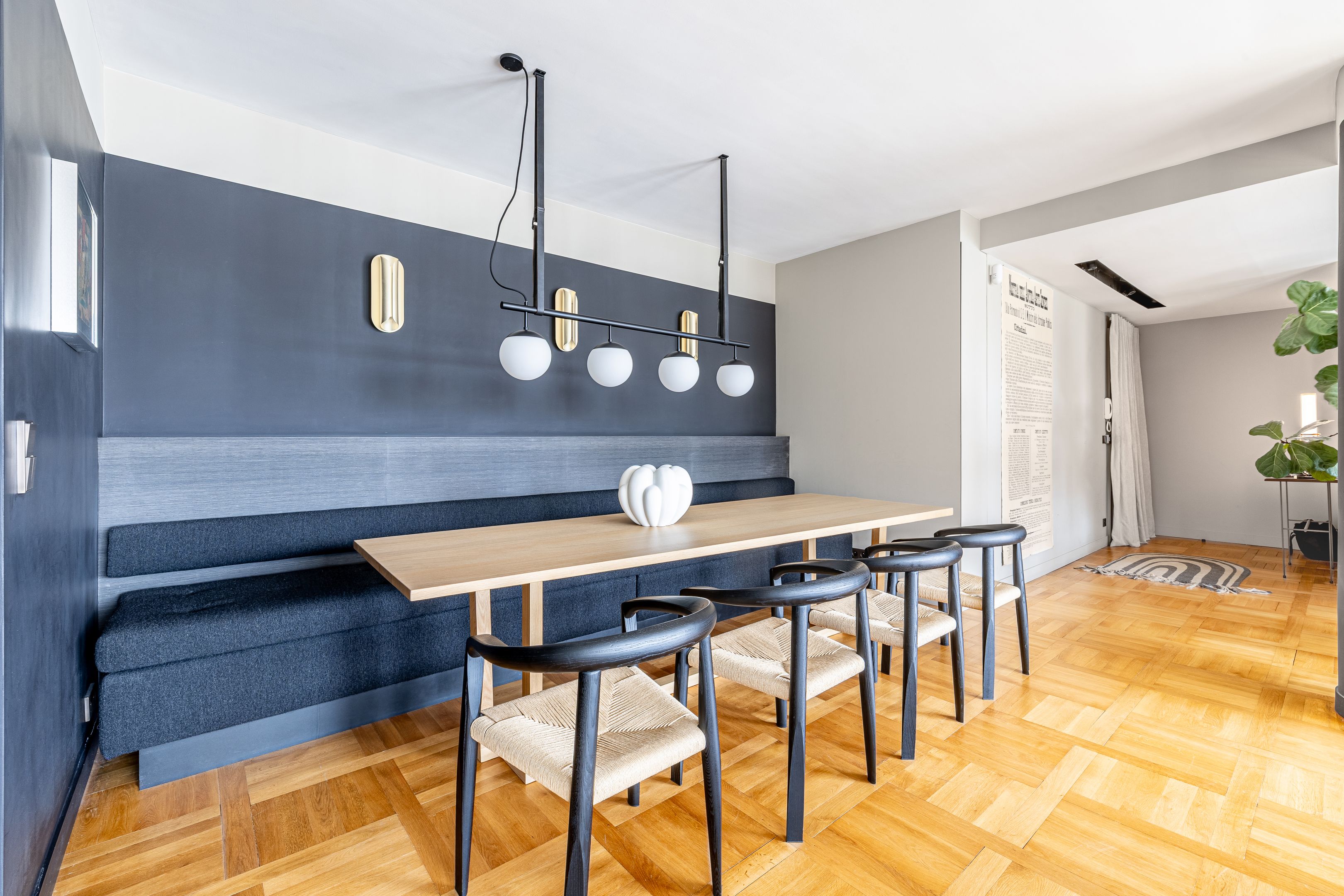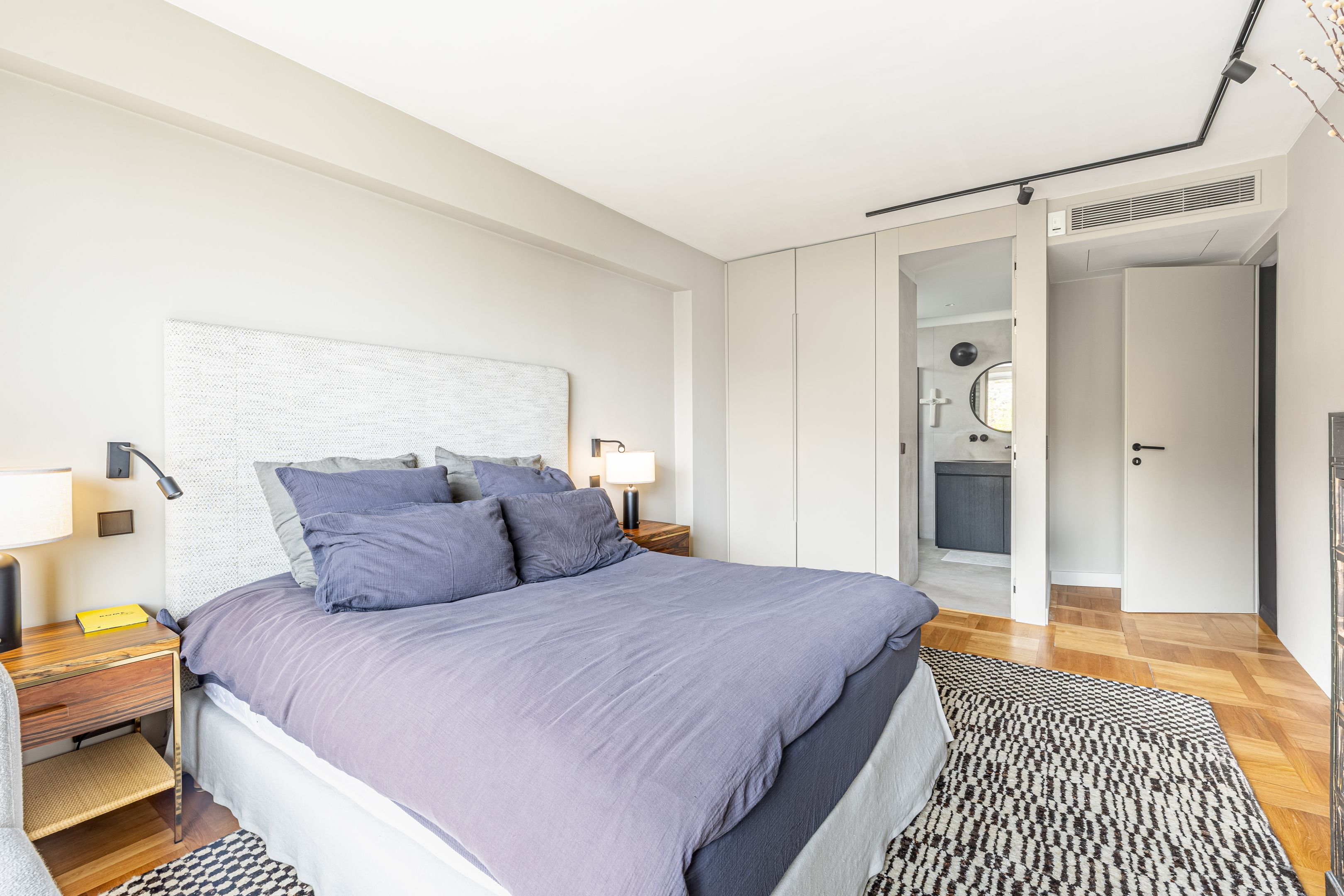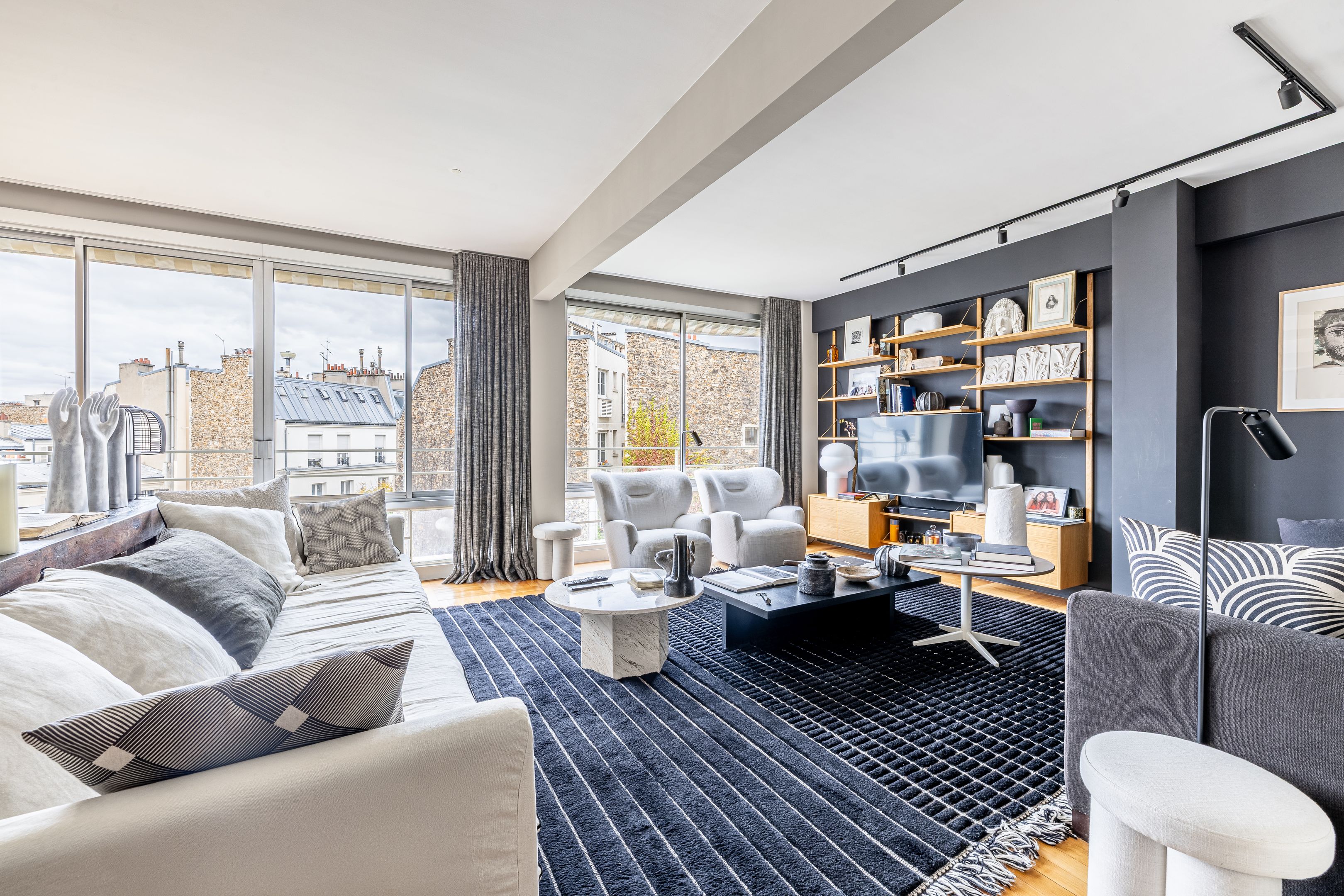 Ideally located in the heart of Passy's many shops, transport facilities and renowned schools. On the sixth floor, served by elevator, of a pleasant mid-twentieth century luxury residence, secure and planted with trees, superb air-conditioned family apartment with a surface area of 128.15m² loi Carrez, in absolute calm and unoverlooked, tastefully renovated and benefiting from an exemplary floor plan and sunshine thanks to its south-west orientation. Entrance hall, vast reception room, dining area, open-plan fitted and equipped kitchen, two large bedrooms (possibility of 3 as originally), including a master suite with en-suite shower room and toilet, bathroom, guest toilet, dressing room and plenty of storage space. Original three-bedroom configuration. Cellar.