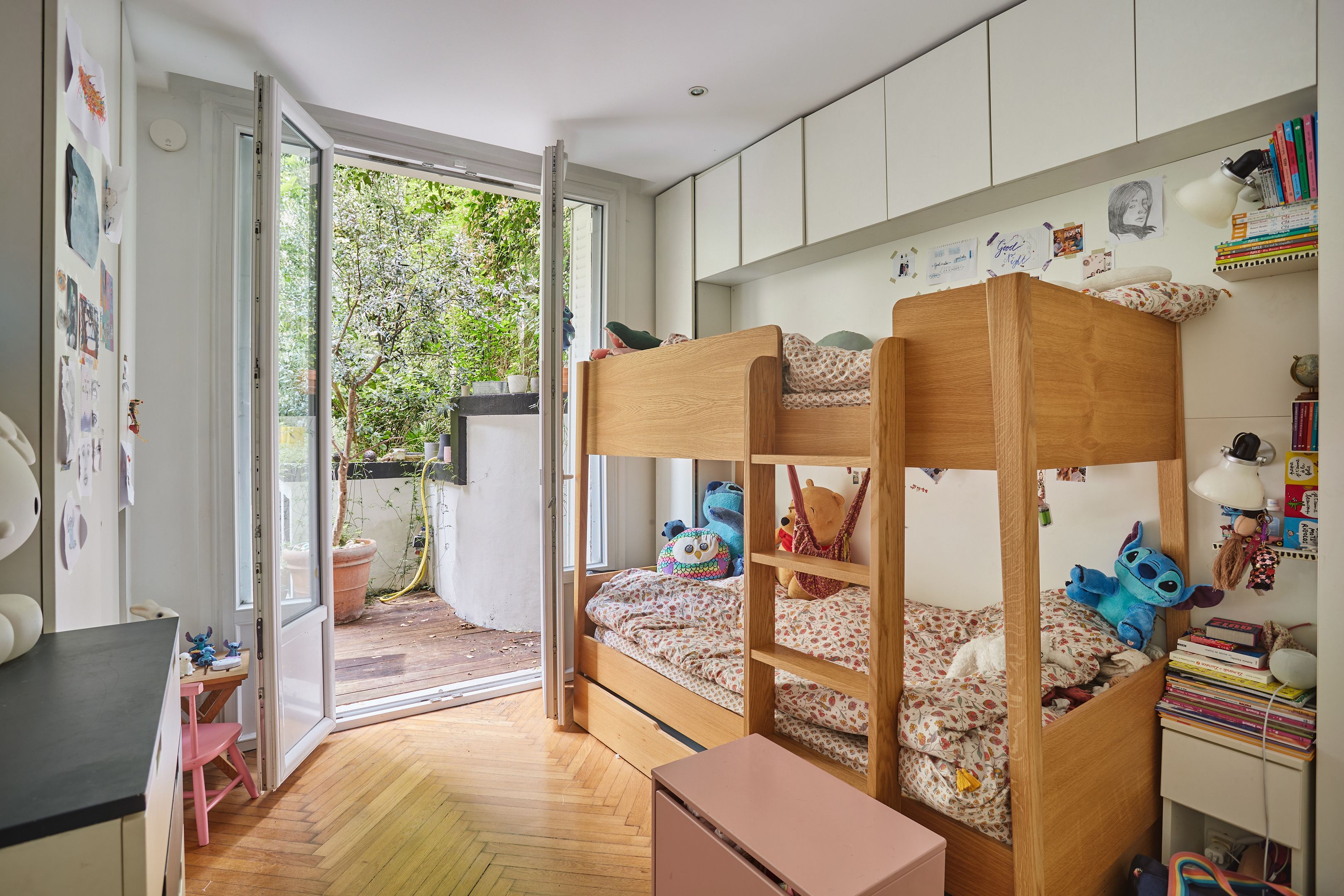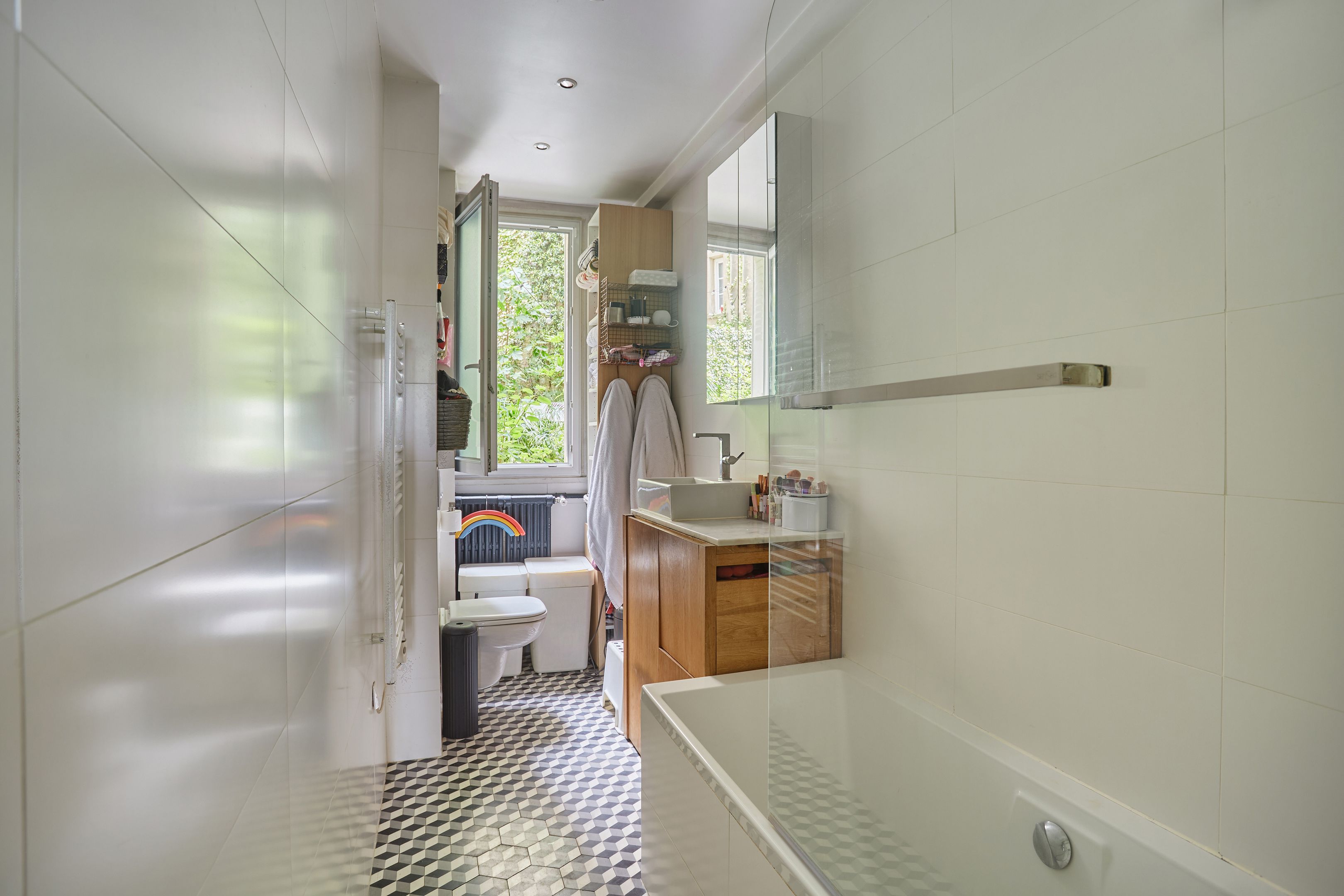 85m² Carrez apartment located on the ground floor of building C on a large courtyard overlooking the Seine, with exclusive access to an 80m² terrace. Courtyard side: entrance, living-dining room with fitted kitchen. Terrace side: master suite with dressing room, shower room with toilet, two bedrooms, bathroom with toilet, dressing room. Cellar.