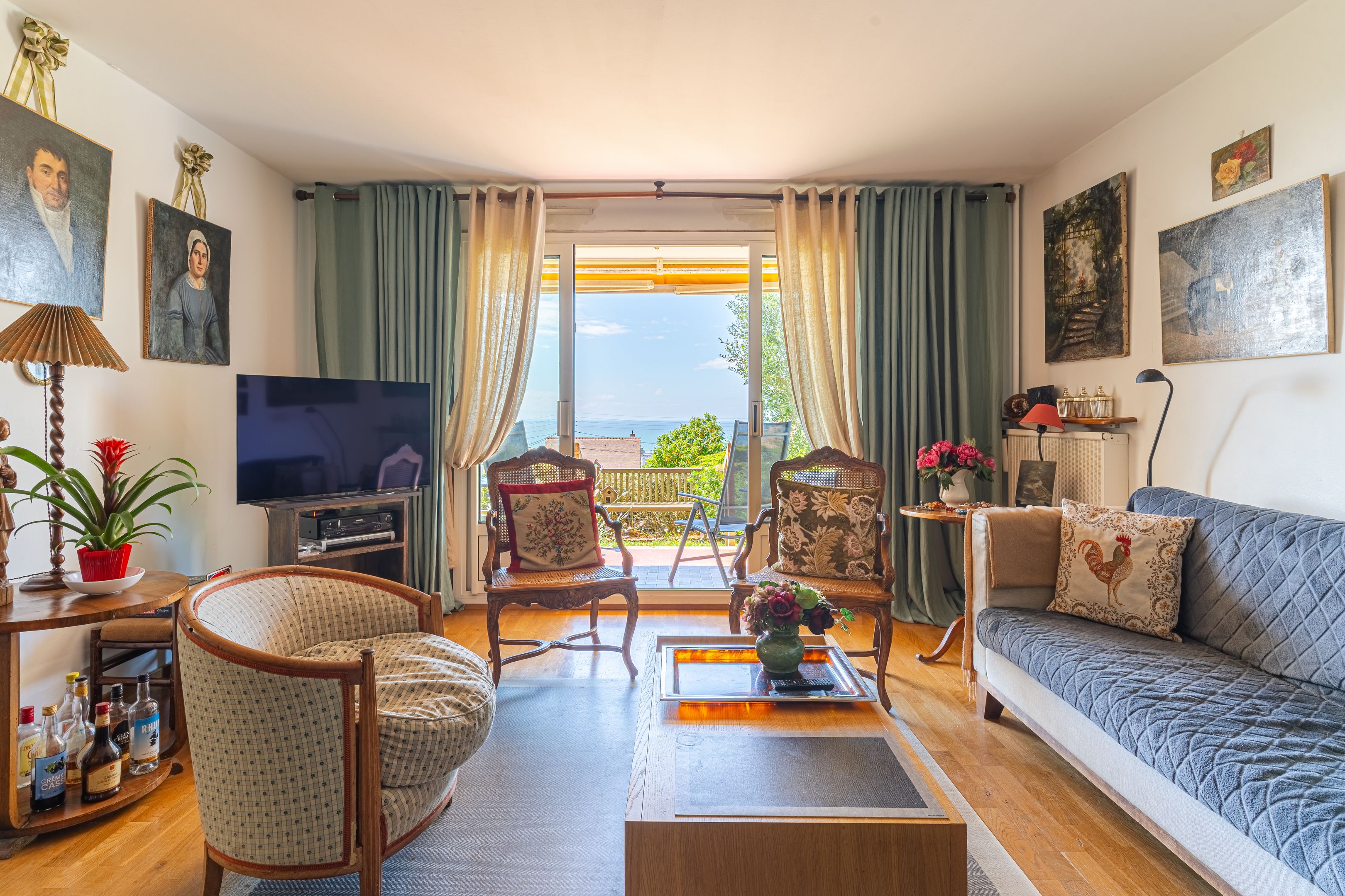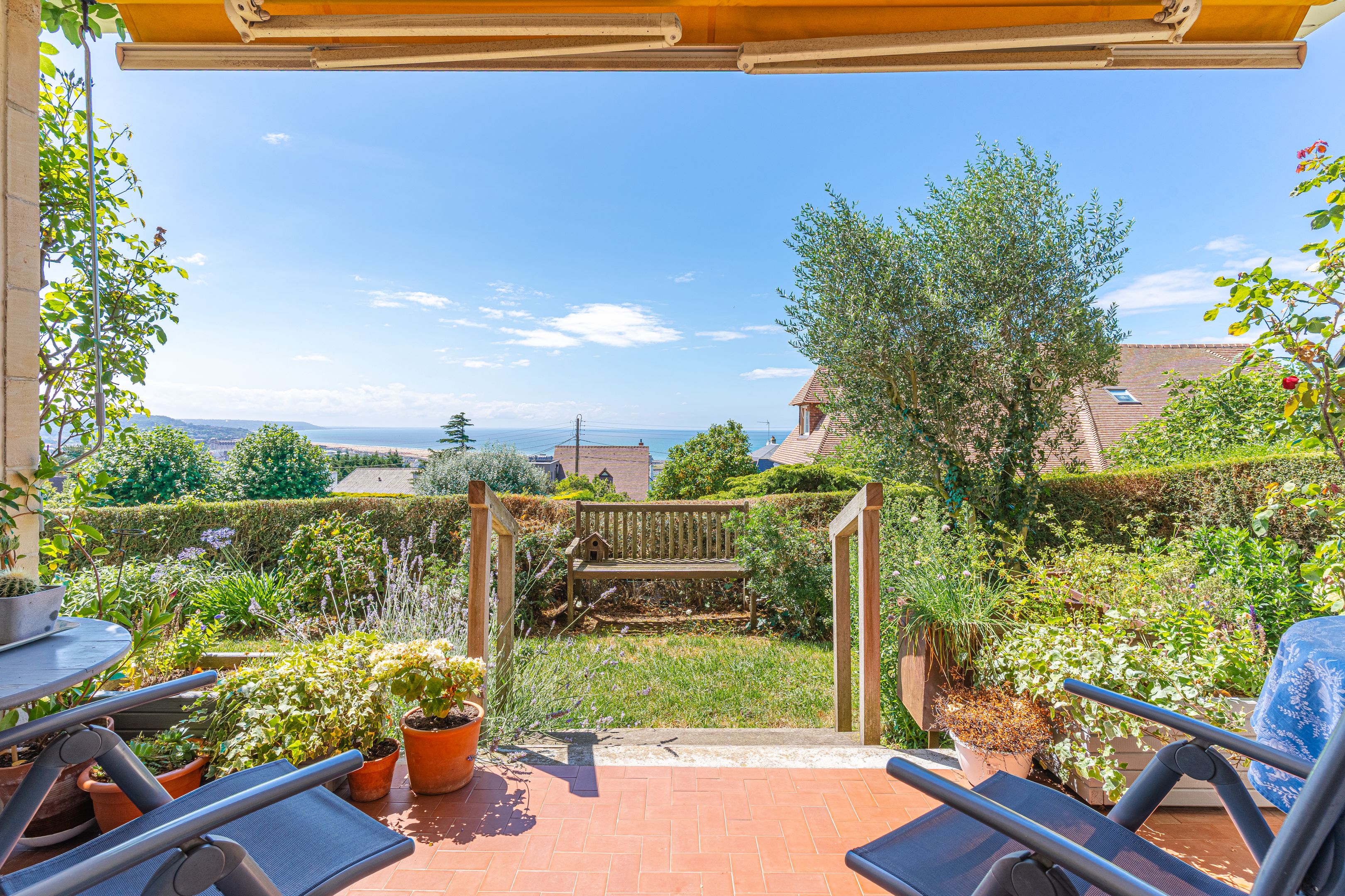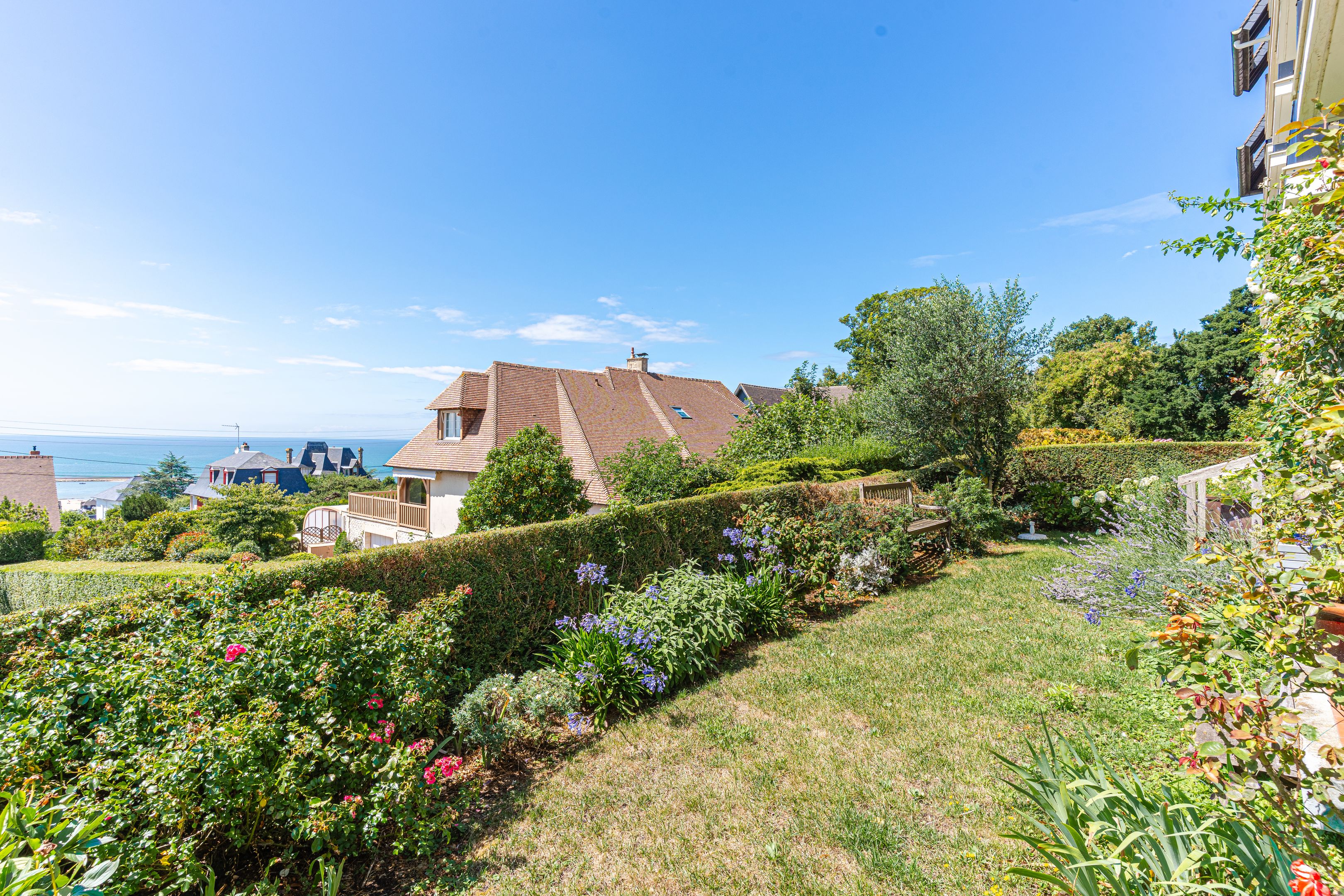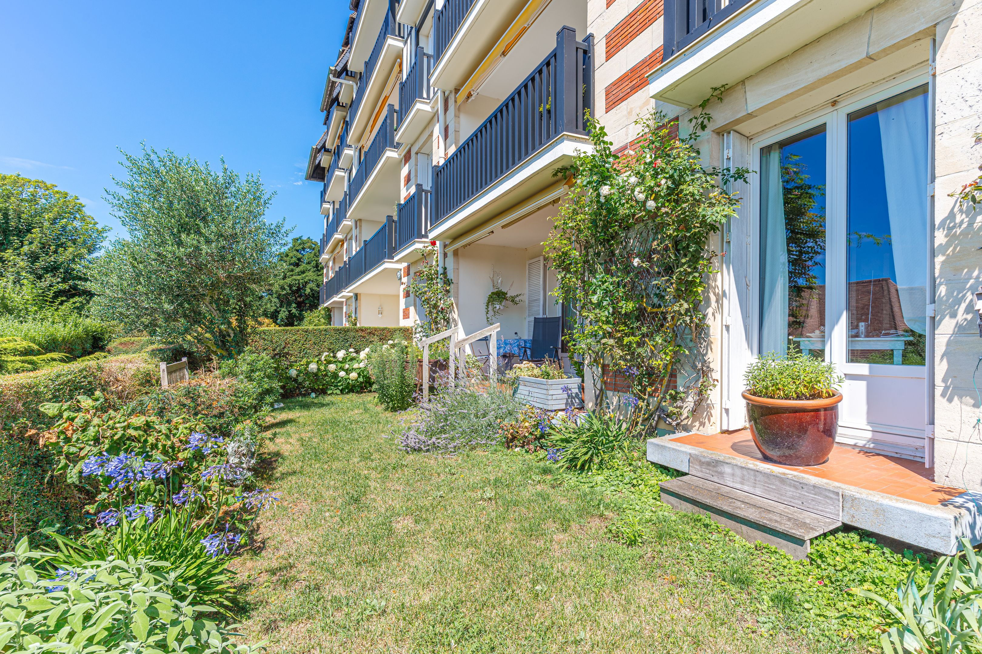 On the mid-hills of Trouville, in a luxury residence, spacious garden-level apartment of approx. 104m2. Entrance hall, west-facing living room opening onto a 70m2 garden with magnificent sea views, separate kitchen, guest toilet, three bedrooms (two with sea views), bathroom, shower room, separate toilet. Basement cellar and outdoor parking space. Hot water and heating included in utilities.