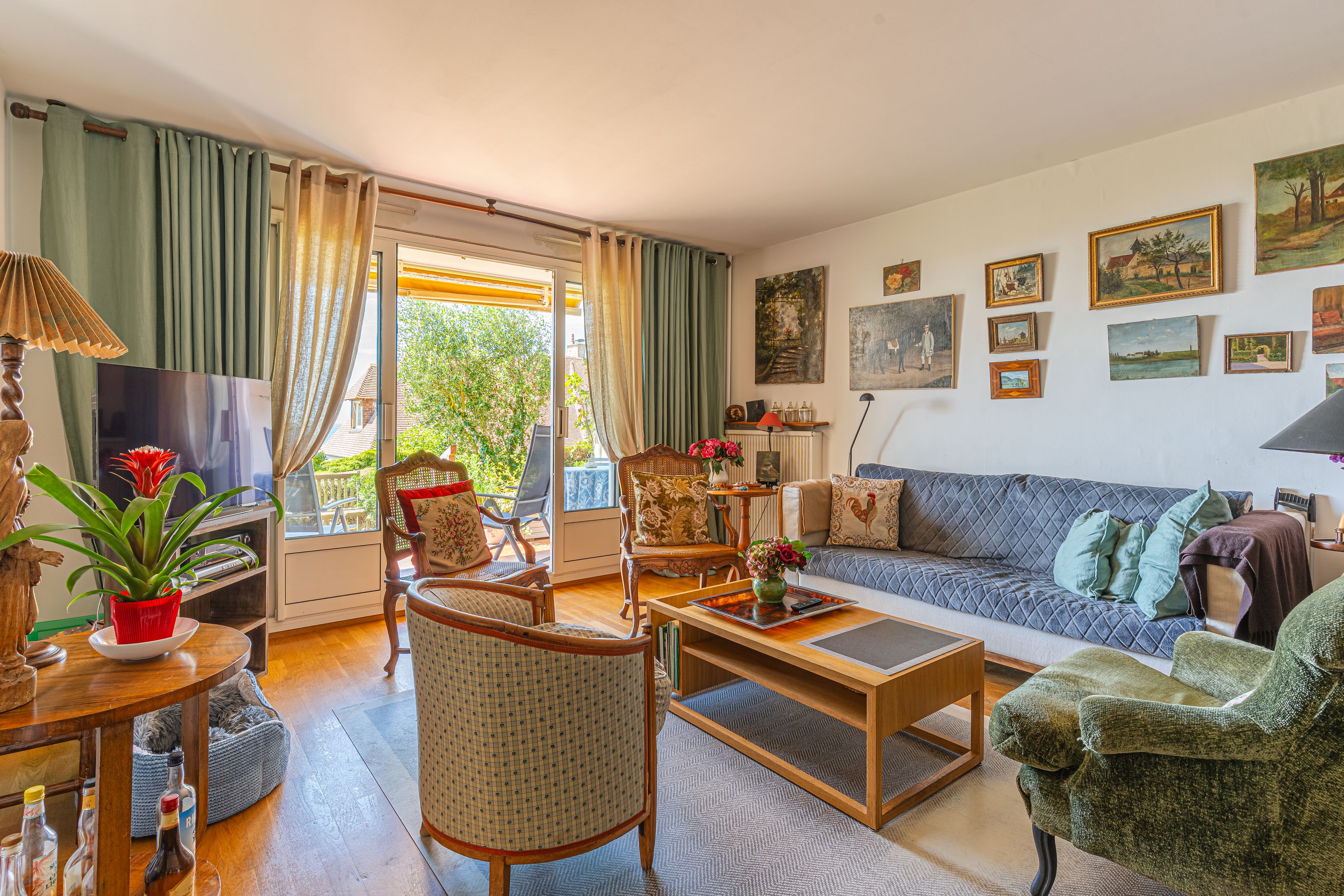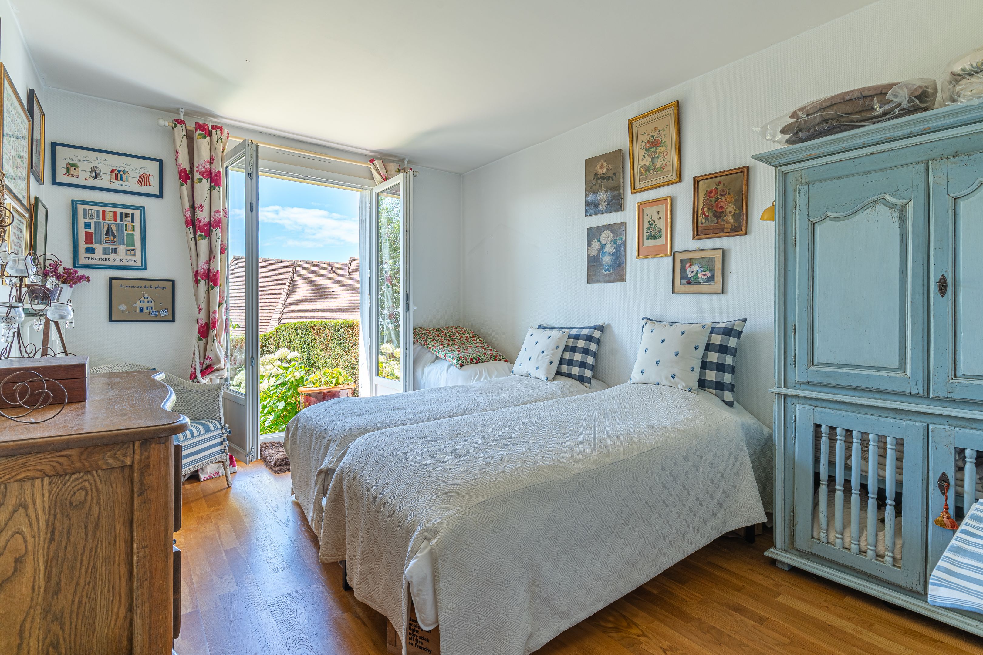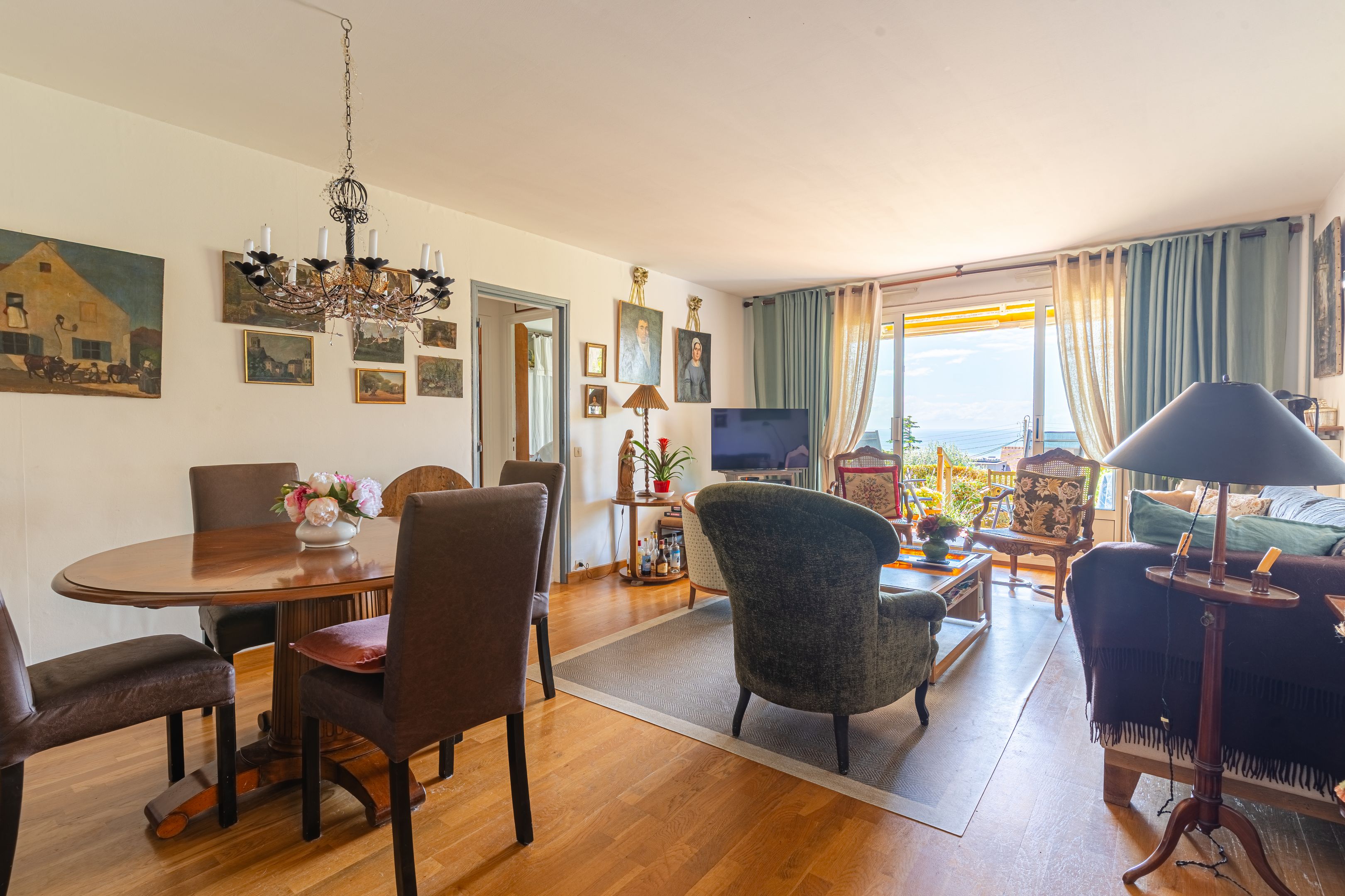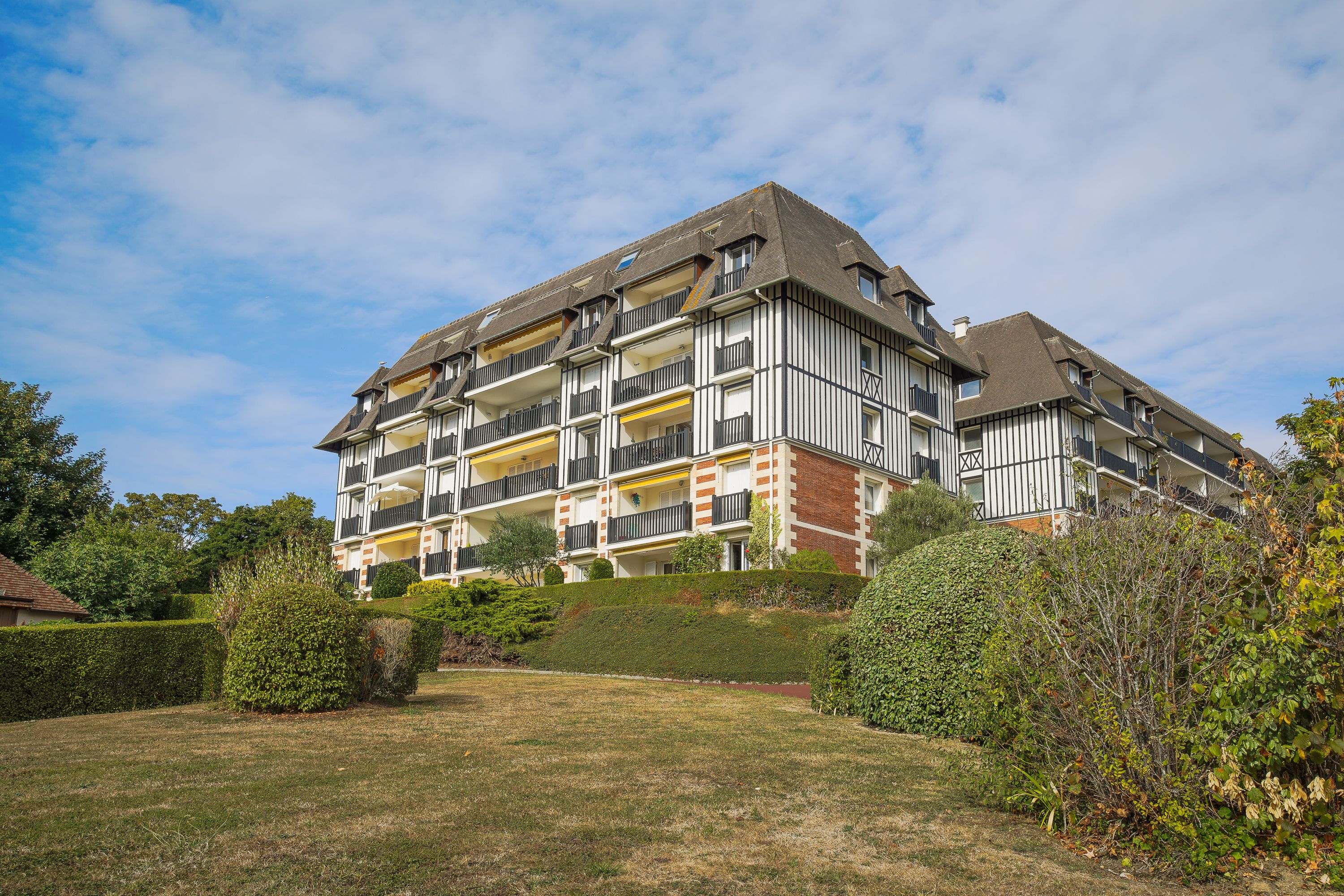 On the mid-hills of Trouville, in a luxury residence, spacious garden-level apartment of approx. 104m2. Entrance hall, west-facing living room opening onto a 70m2 garden with magnificent sea views, separate kitchen, guest toilet, three bedrooms (two with sea views), bathroom, shower room, separate toilet. Basement cellar and outdoor parking space. Hot water and heating included in utilities.