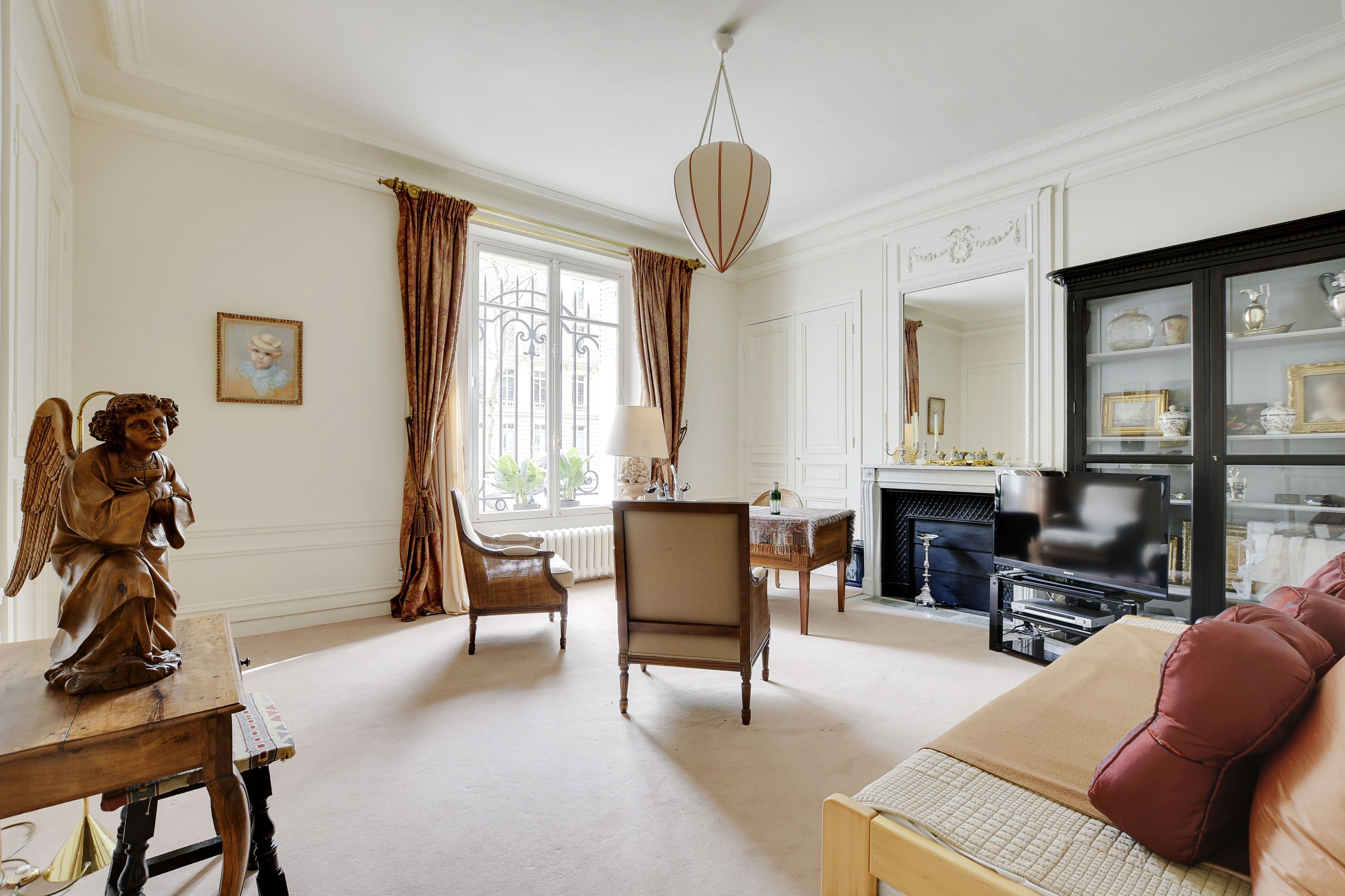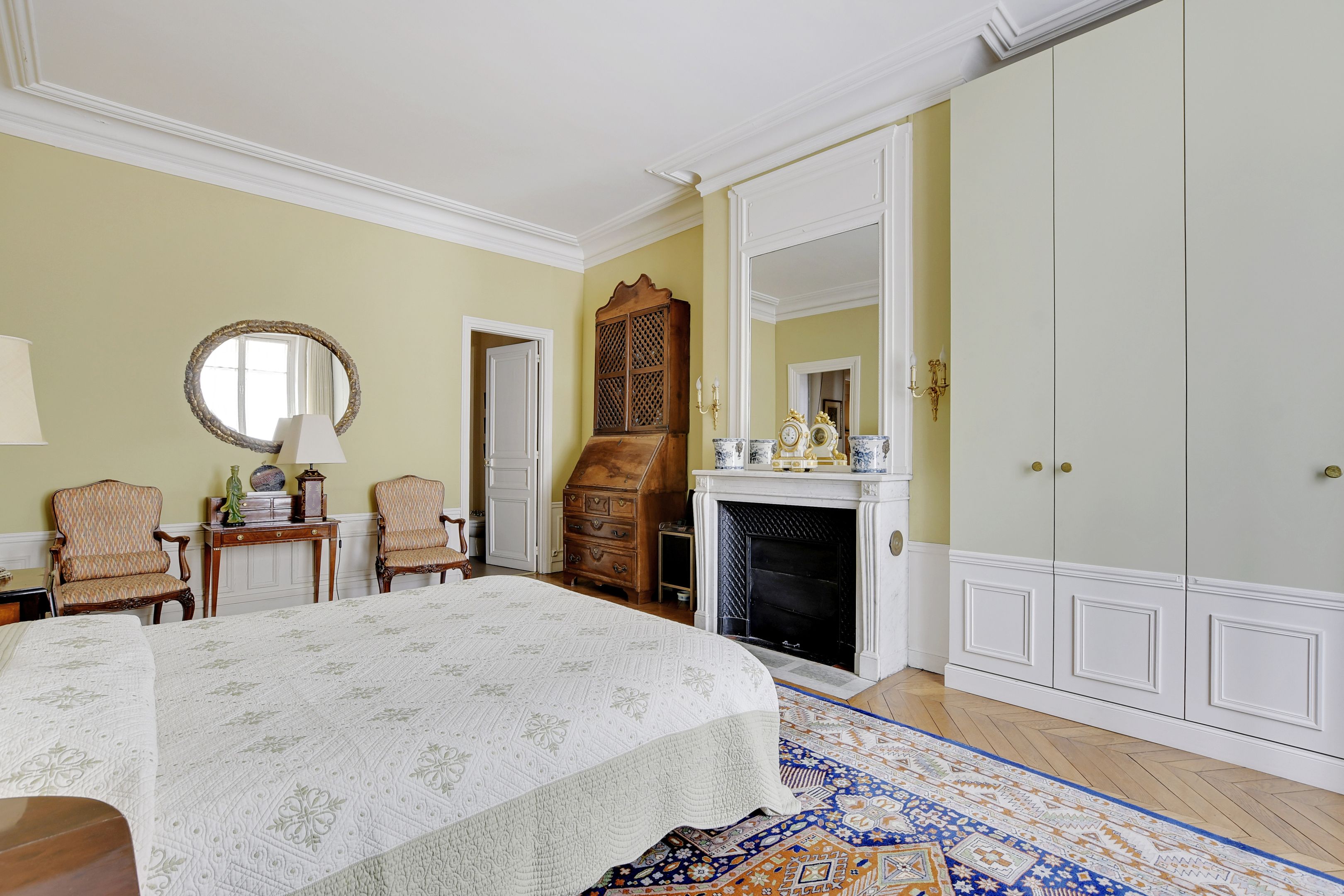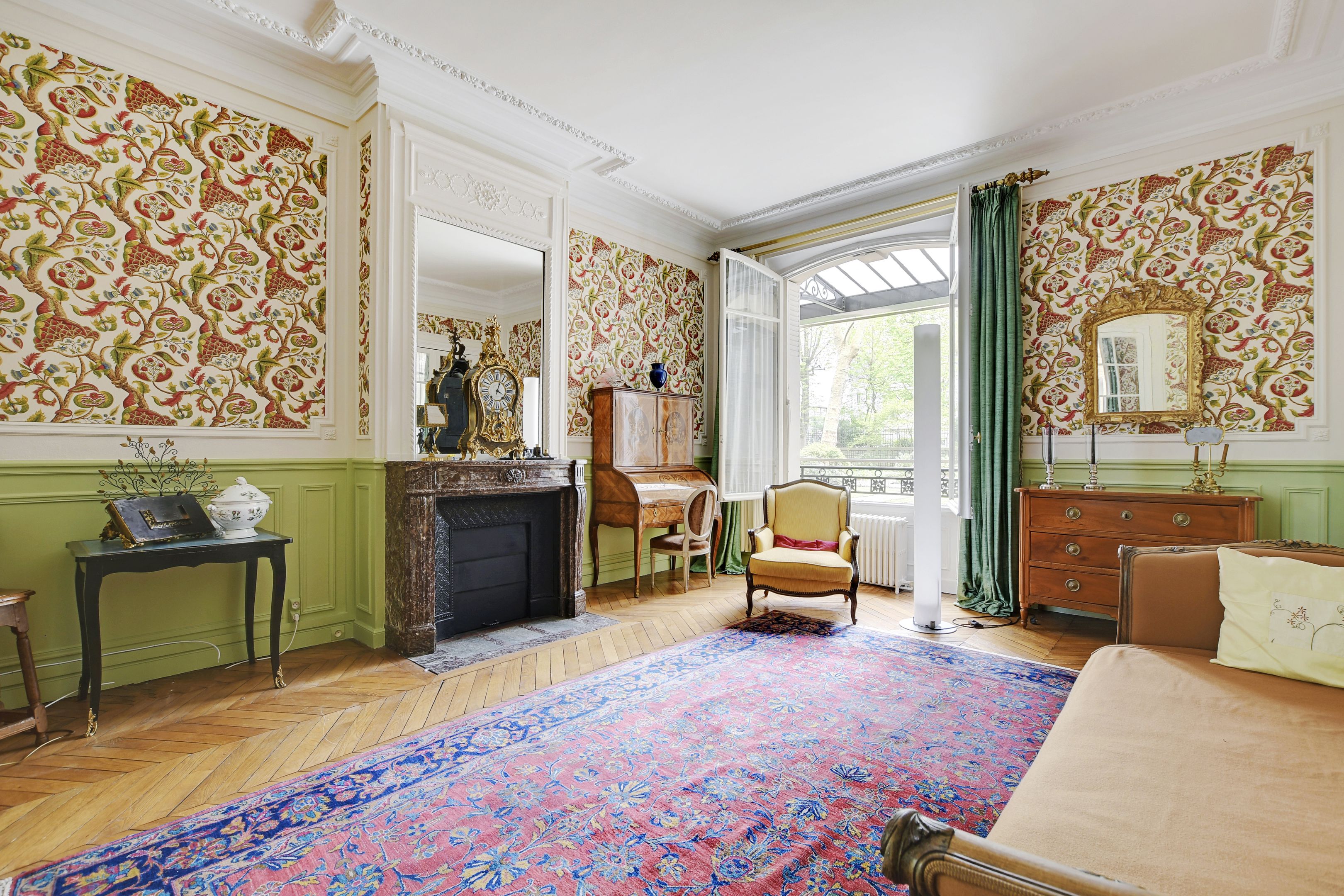 In a highly luxurious old building with secure access (caretaker), dual-aspect apartment ideal for family or guest entertaining, on the ground floor, offering gorgeous period features (parquet flooring, mouldings and superb fireplaces), high ceilings, a layout maximising the space, and lovely views of a street and a beautiful garden. Entrance hall, spacious living room, dining room, separate kitchen, 3 bedrooms with en-suite bathroom or shower room with toilet, separate toilet. Also included: 2 maid’s rooms and 2 large cellars.