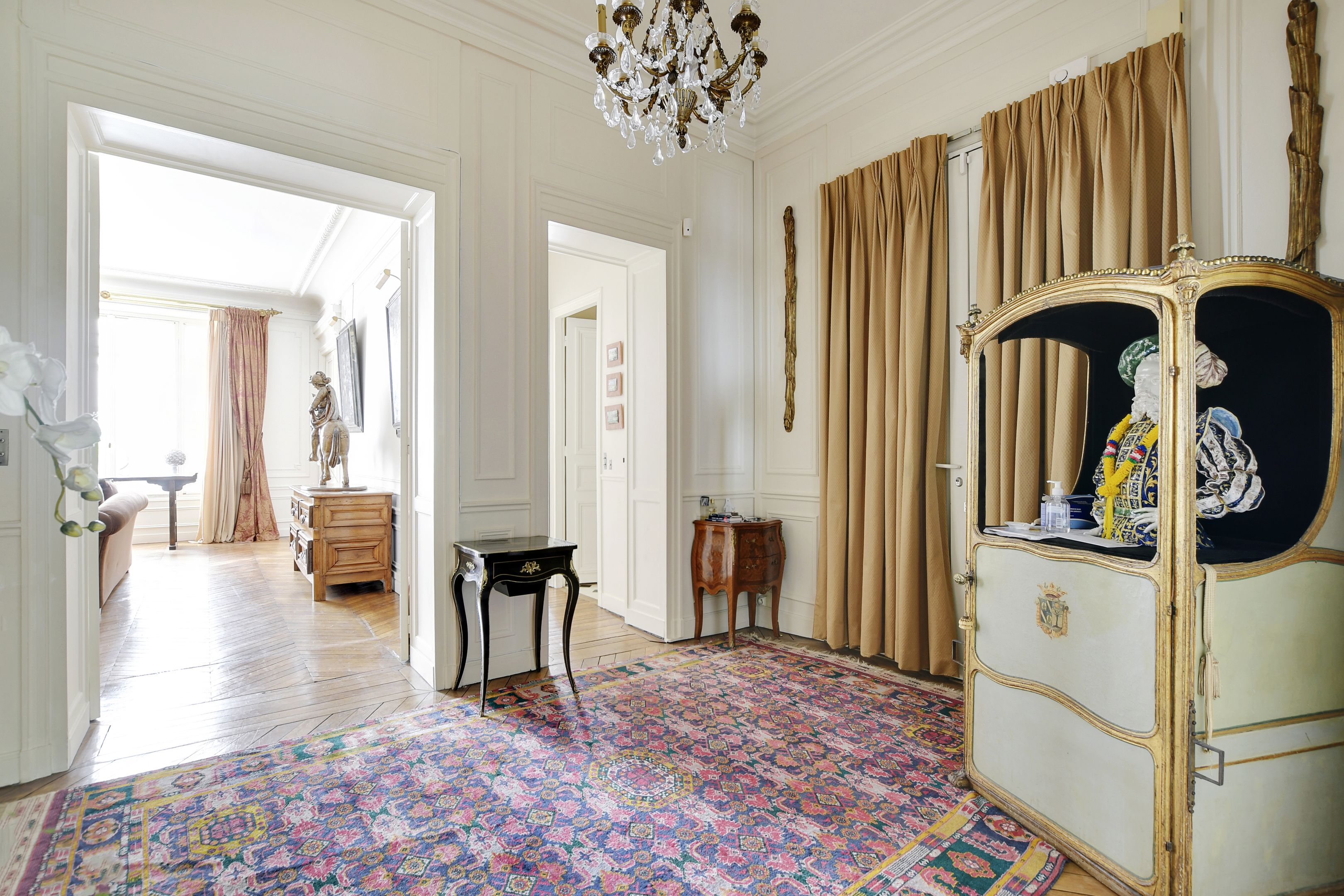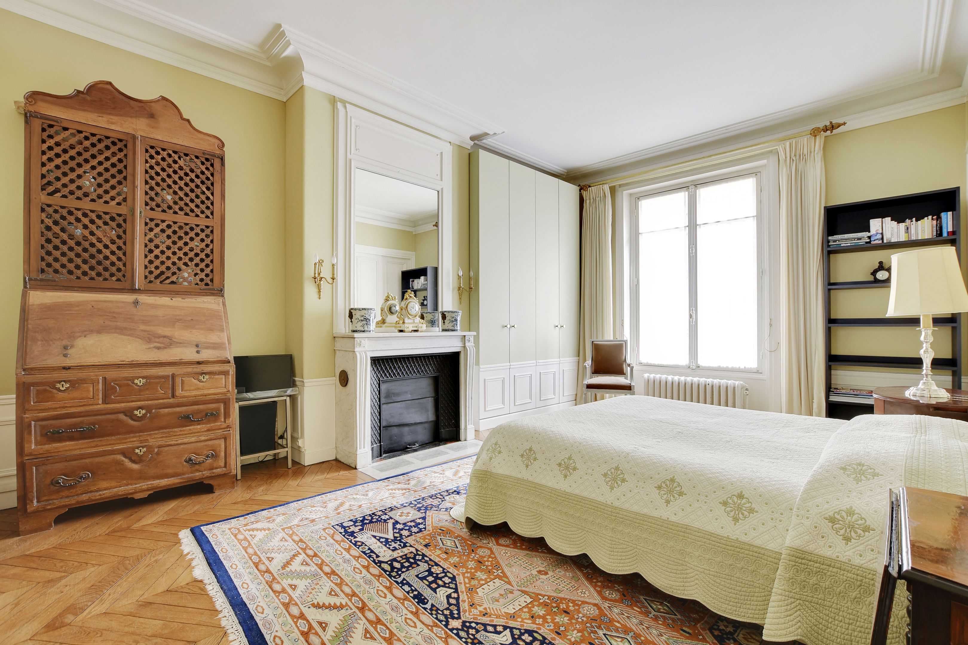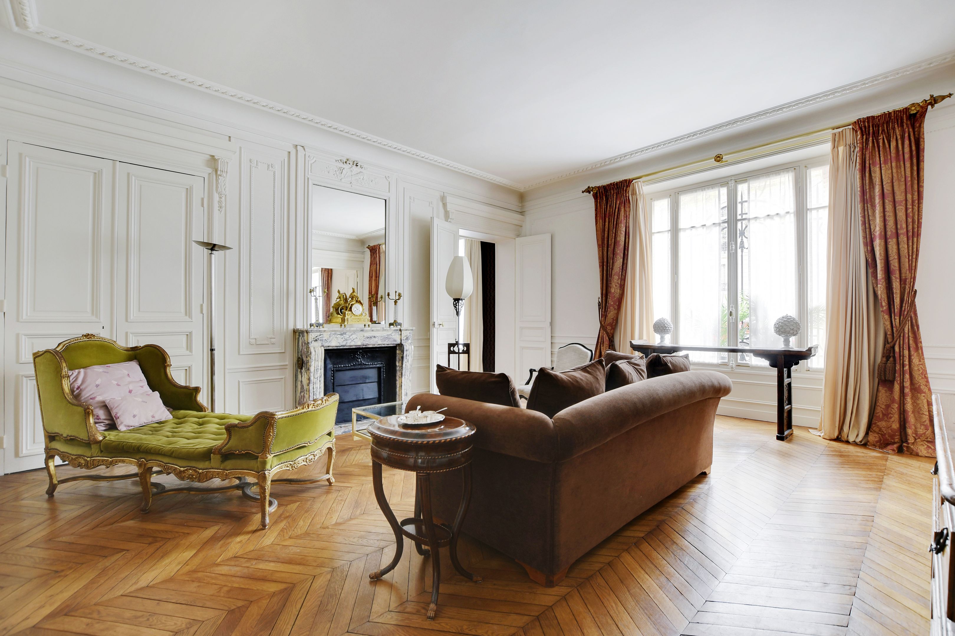 In a highly luxurious old building with secure access (caretaker), dual-aspect apartment ideal for family or guest entertaining, on the ground floor, offering gorgeous period features (parquet flooring, mouldings and superb fireplaces), high ceilings, a layout maximising the space, and lovely views of a street and a beautiful garden. Entrance hall, spacious living room, dining room, separate kitchen, 3 bedrooms with en-suite bathroom or shower room with toilet, separate toilet. Also included: 2 maid’s rooms and 2 large cellars.