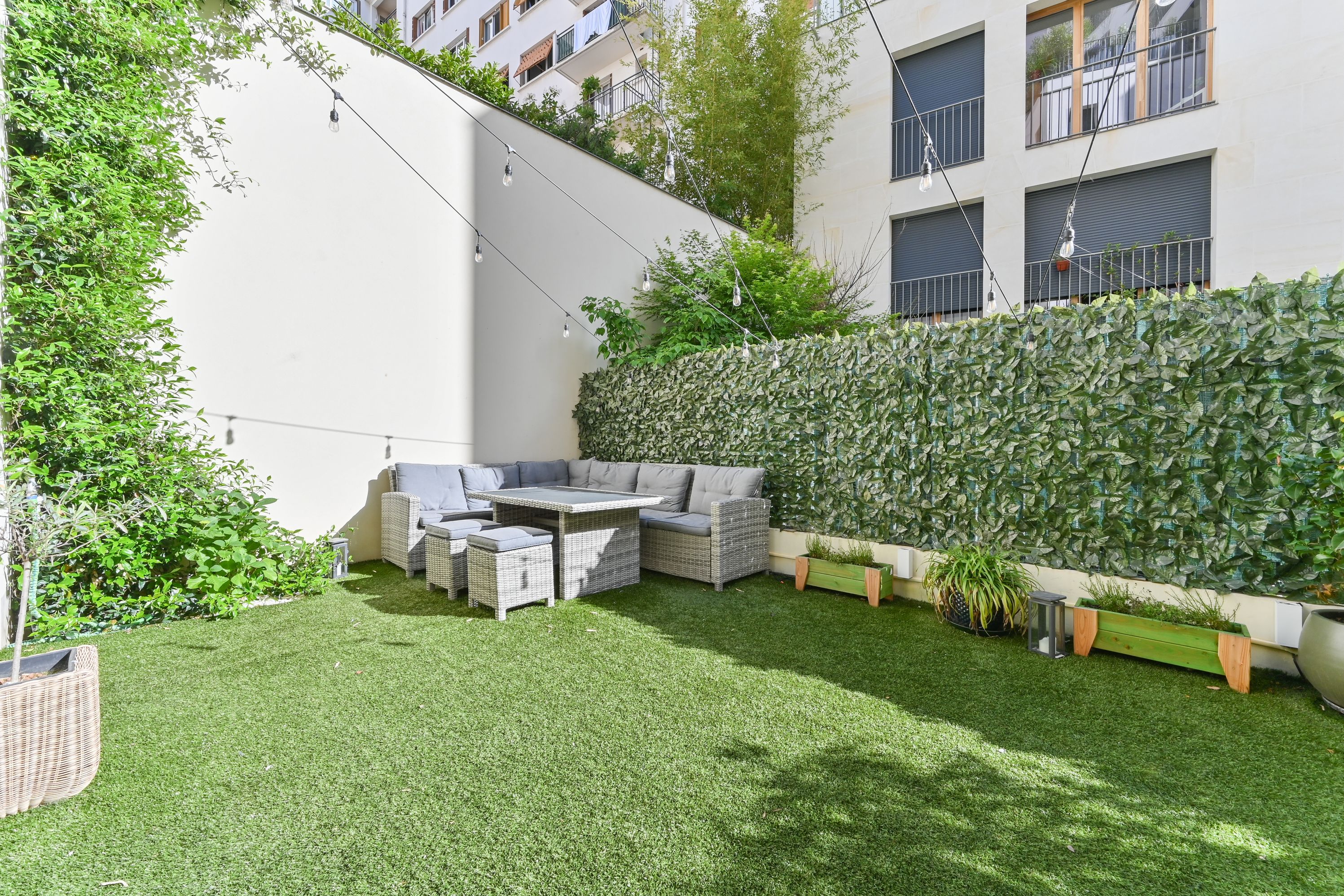 First floor: entrance, large living room opening onto a 28m² private garden, beautiful open-plan fully-equipped kitchen, laundry area, separate toilet.