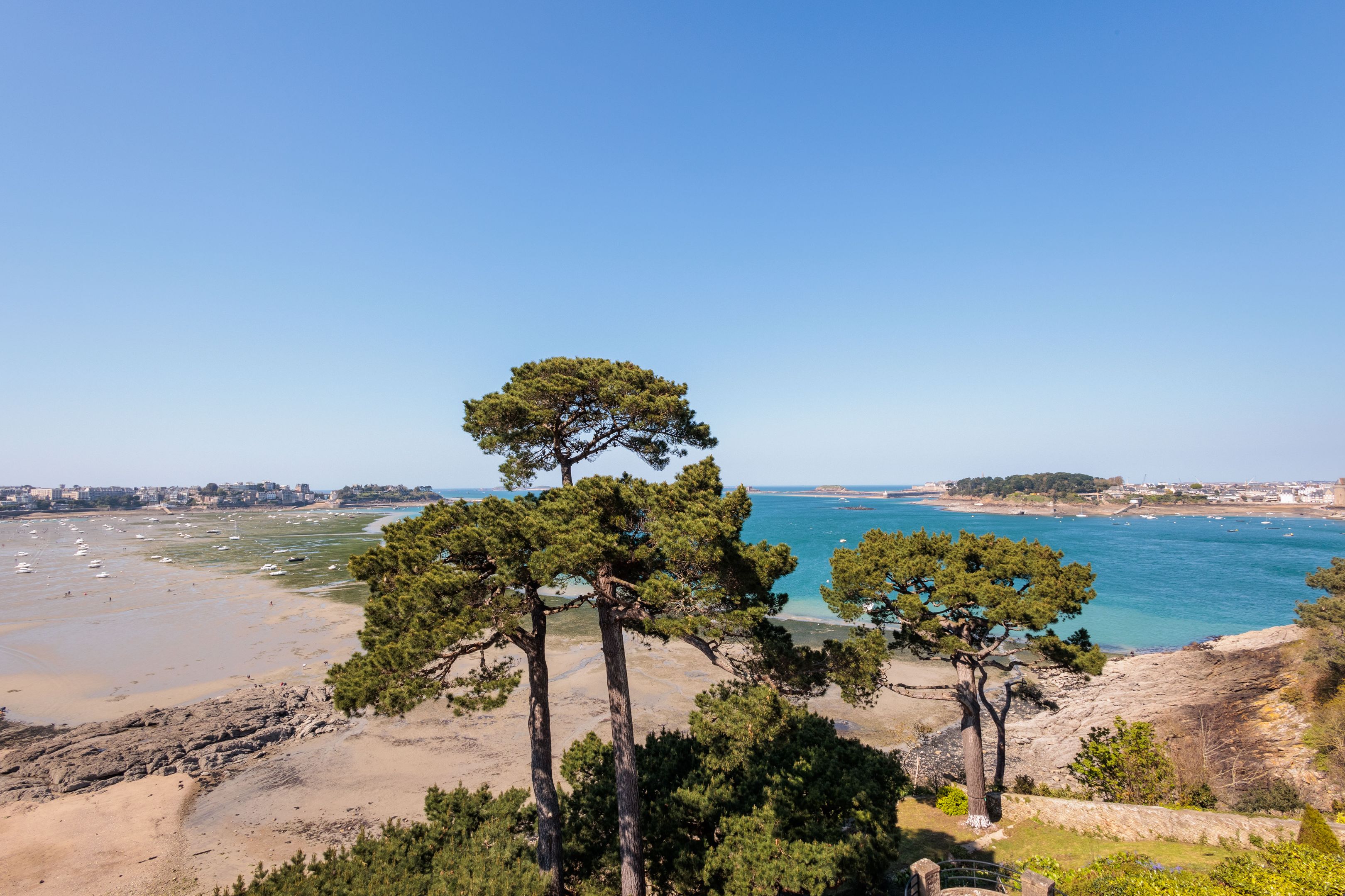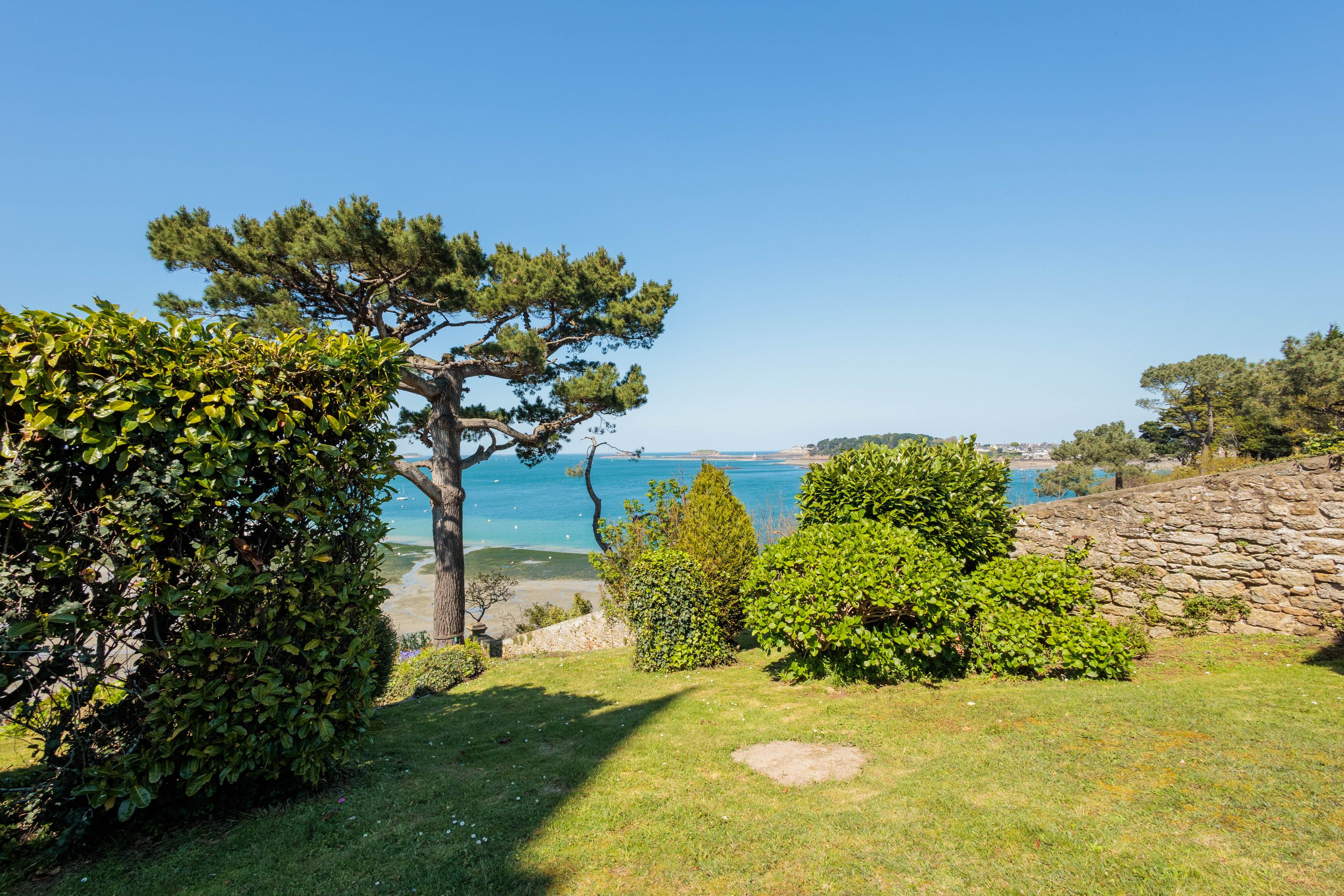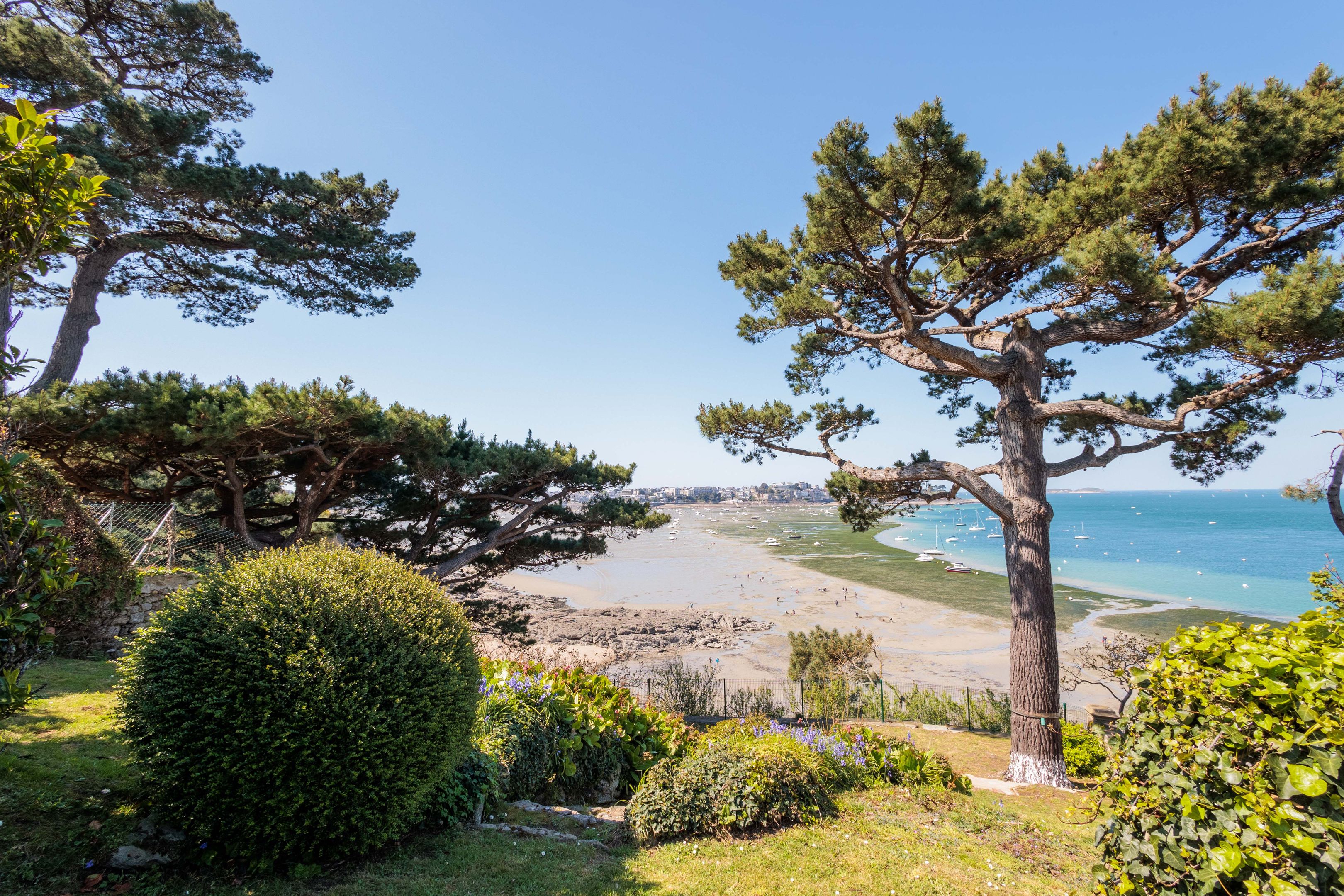SUB OFFER In a privileged residential environment with lots of trees and extremely peaceful. On the top floor of a prestigious dinardaise villa overlooking the Prieuré bay, 151m² luxury apartment with fabulous sea views, spacious and peaceful. Entrance gallery directly accessible by elevator, living room with parquet floor, mouldings and fireplace, dining room, kitchen/dining room, 3 good-sized bedrooms, 2 bathrooms with shower, bath and toilet, separate toilet. Laundry room and plenty of storage space. Cellar, garage, 2 outdoor parking spaces. Shared garden with direct access to the Chemin des douaniers and the beach.
