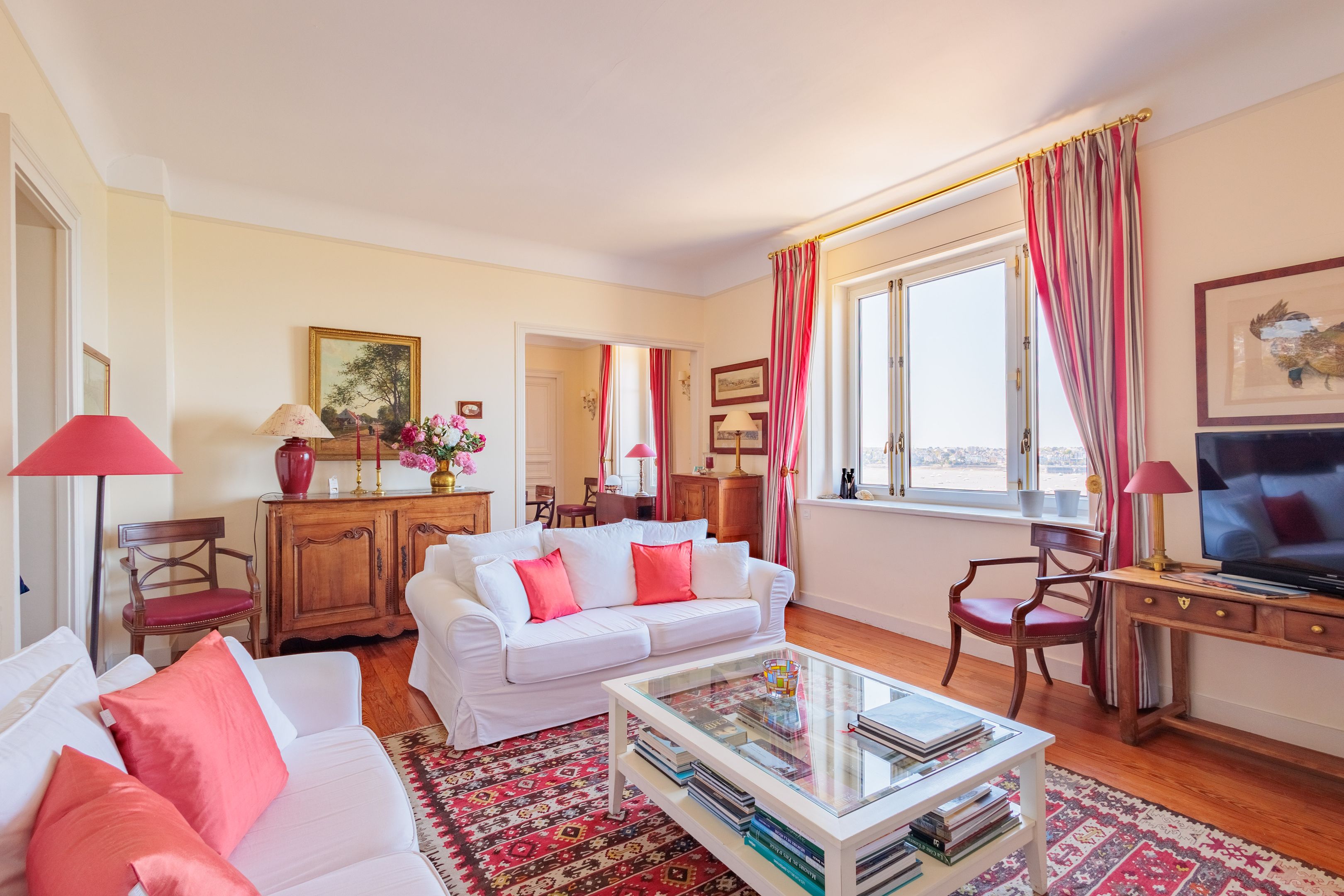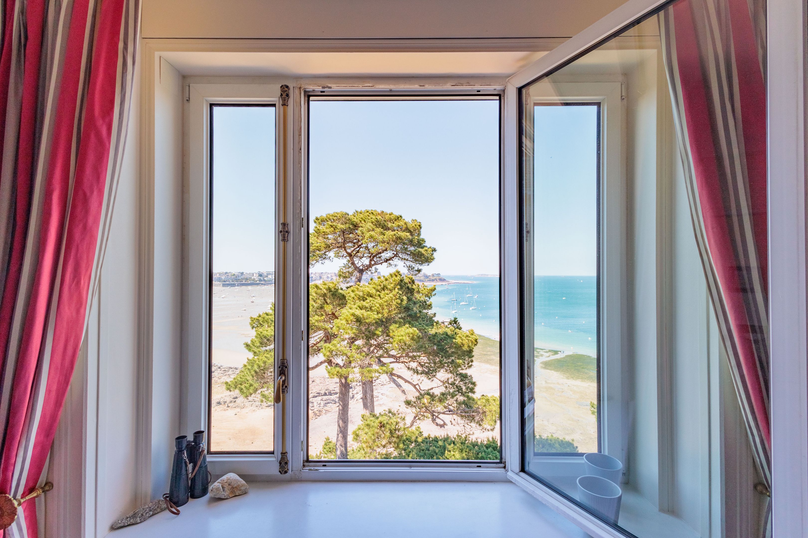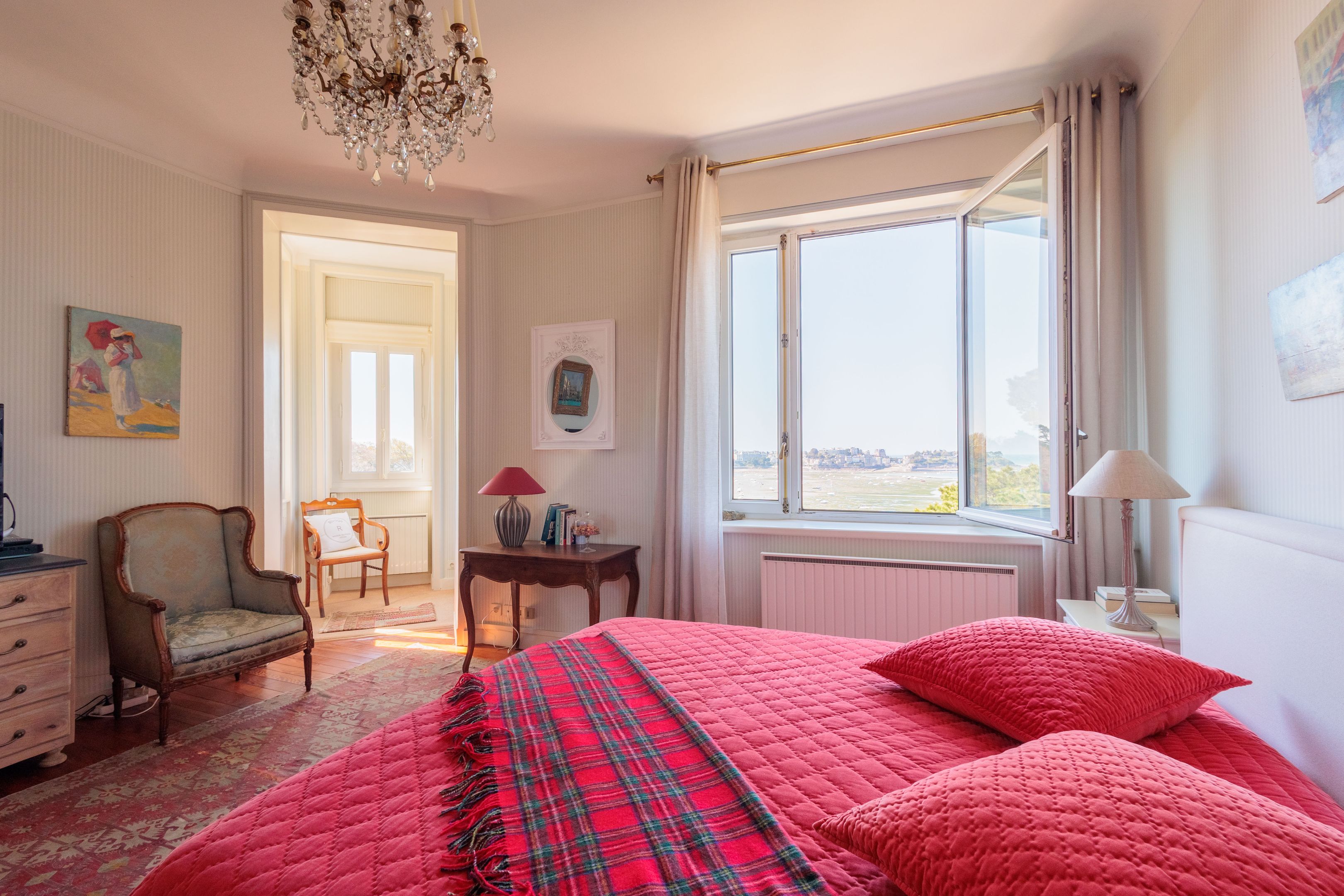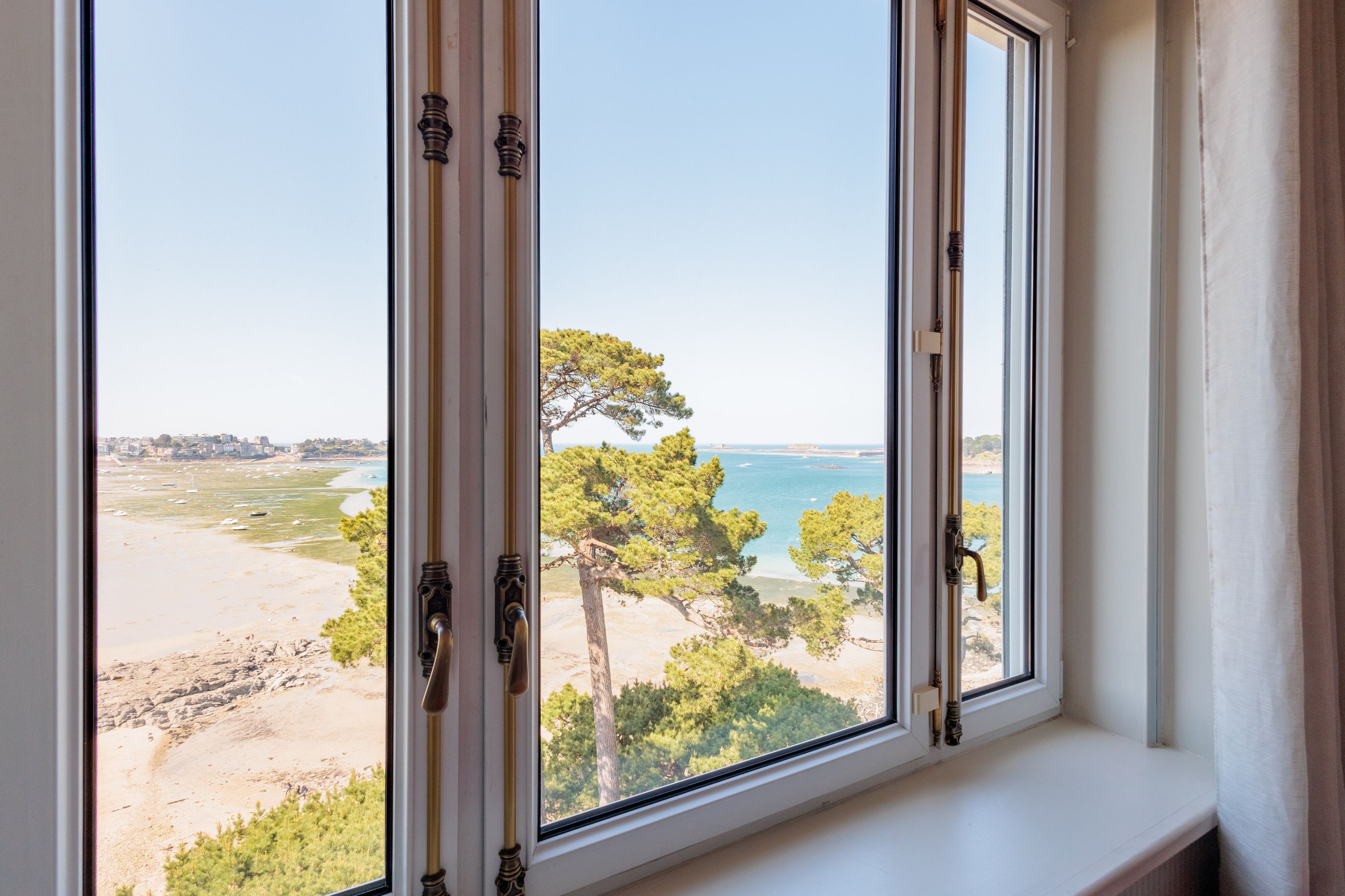 SUB OFFER In a privileged residential environment with lots of trees and extremely peaceful. On the top floor of a prestigious dinardaise villa overlooking the Prieuré bay, 151m² luxury apartment with fabulous sea views, spacious and peaceful. Entrance gallery directly accessible by elevator, living room with parquet floor, mouldings and fireplace, dining room, kitchen/dining room, 3 good-sized bedrooms, 2 bathrooms with shower, bath and toilet, separate toilet. Laundry room and plenty of storage space. Cellar, garage, 2 outdoor parking spaces. Shared garden with direct access to the Chemin des douaniers and the beach.