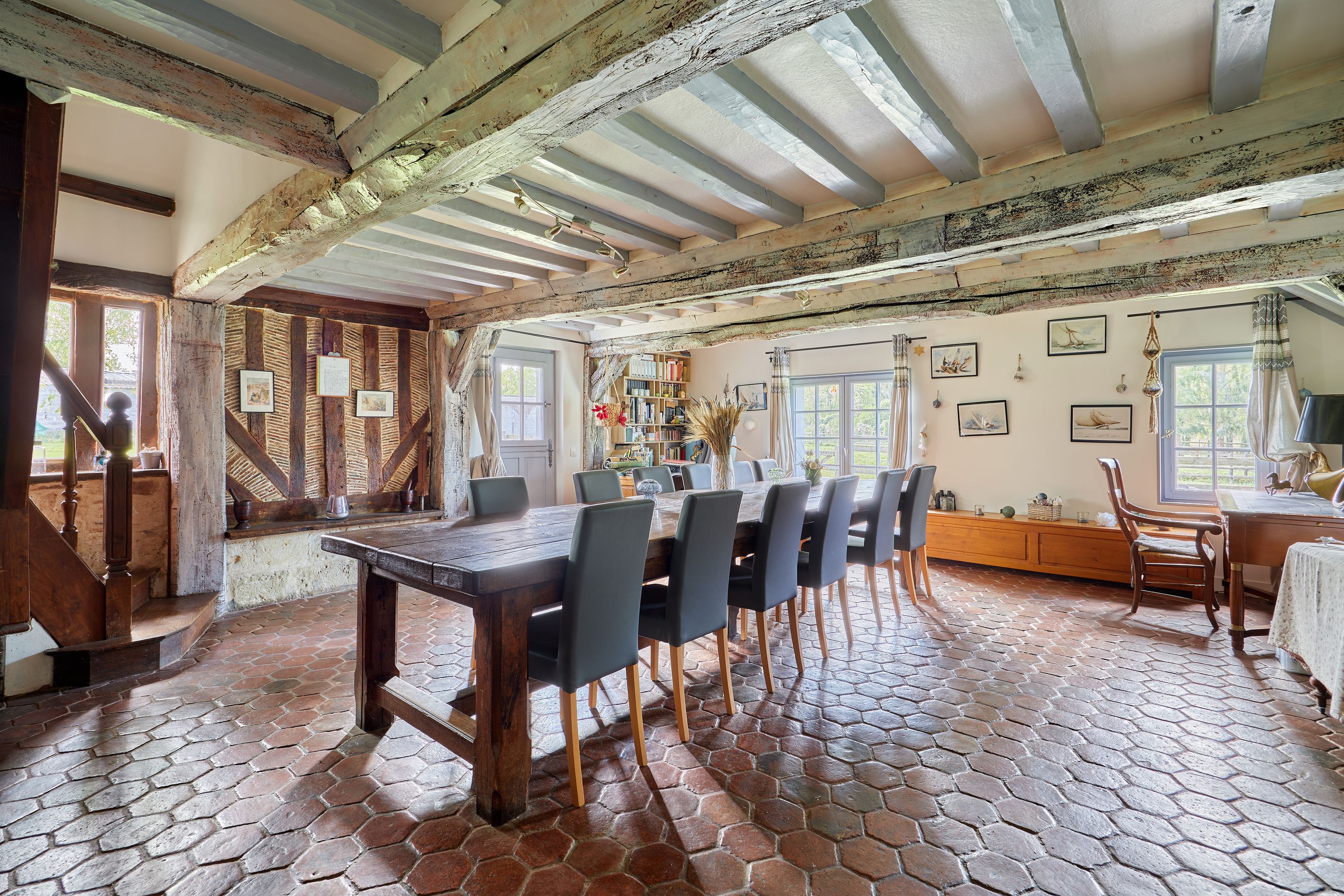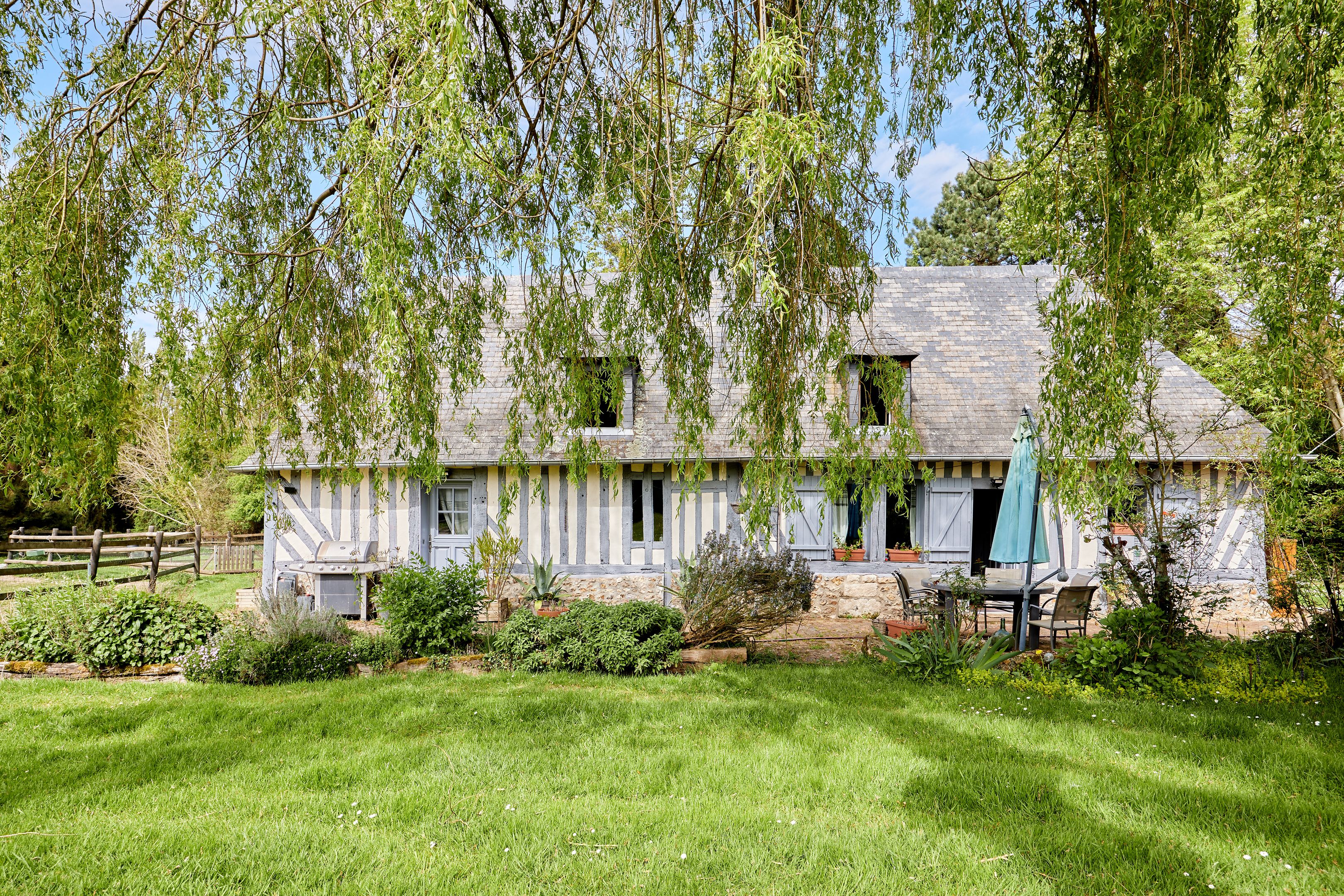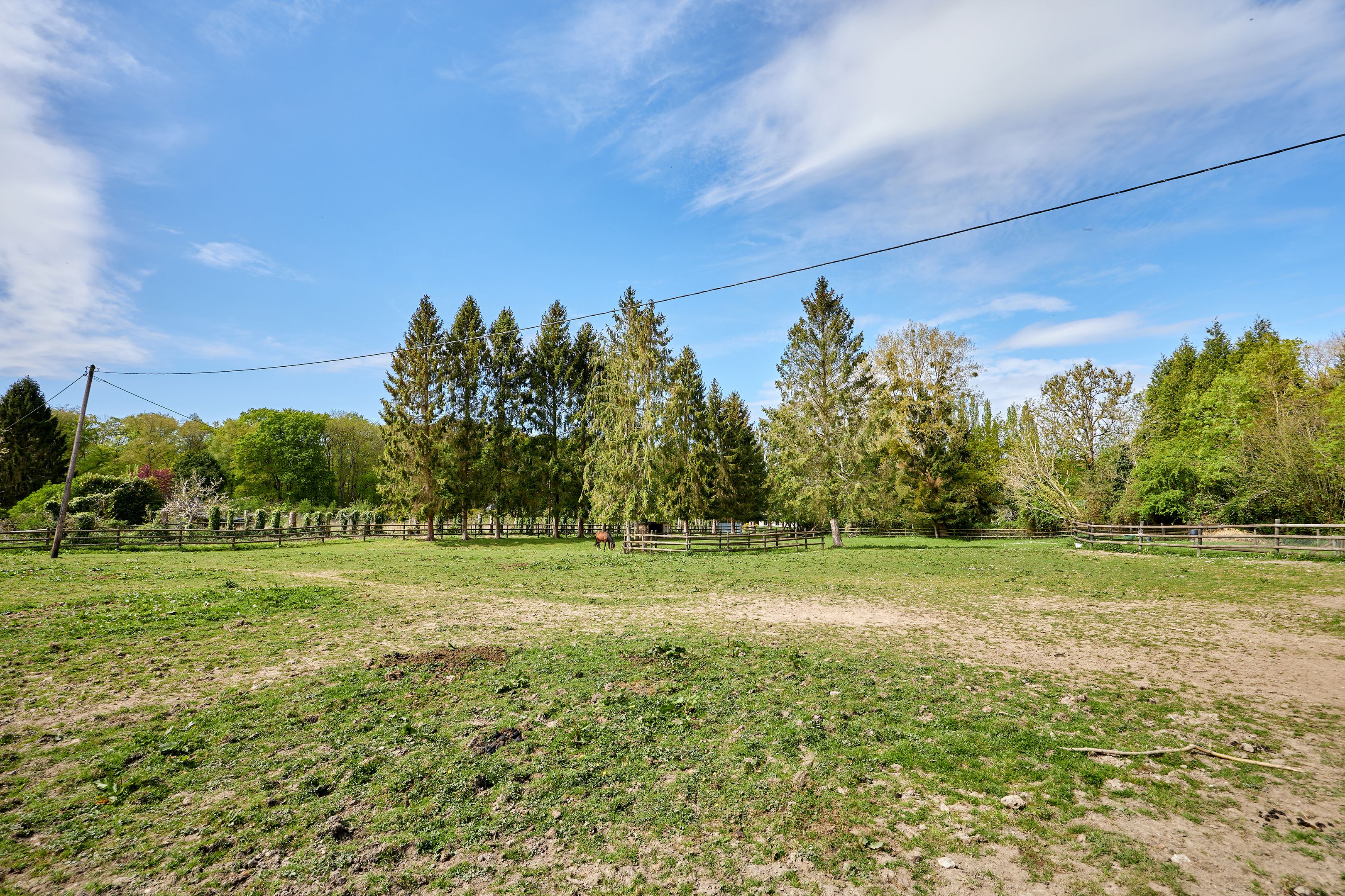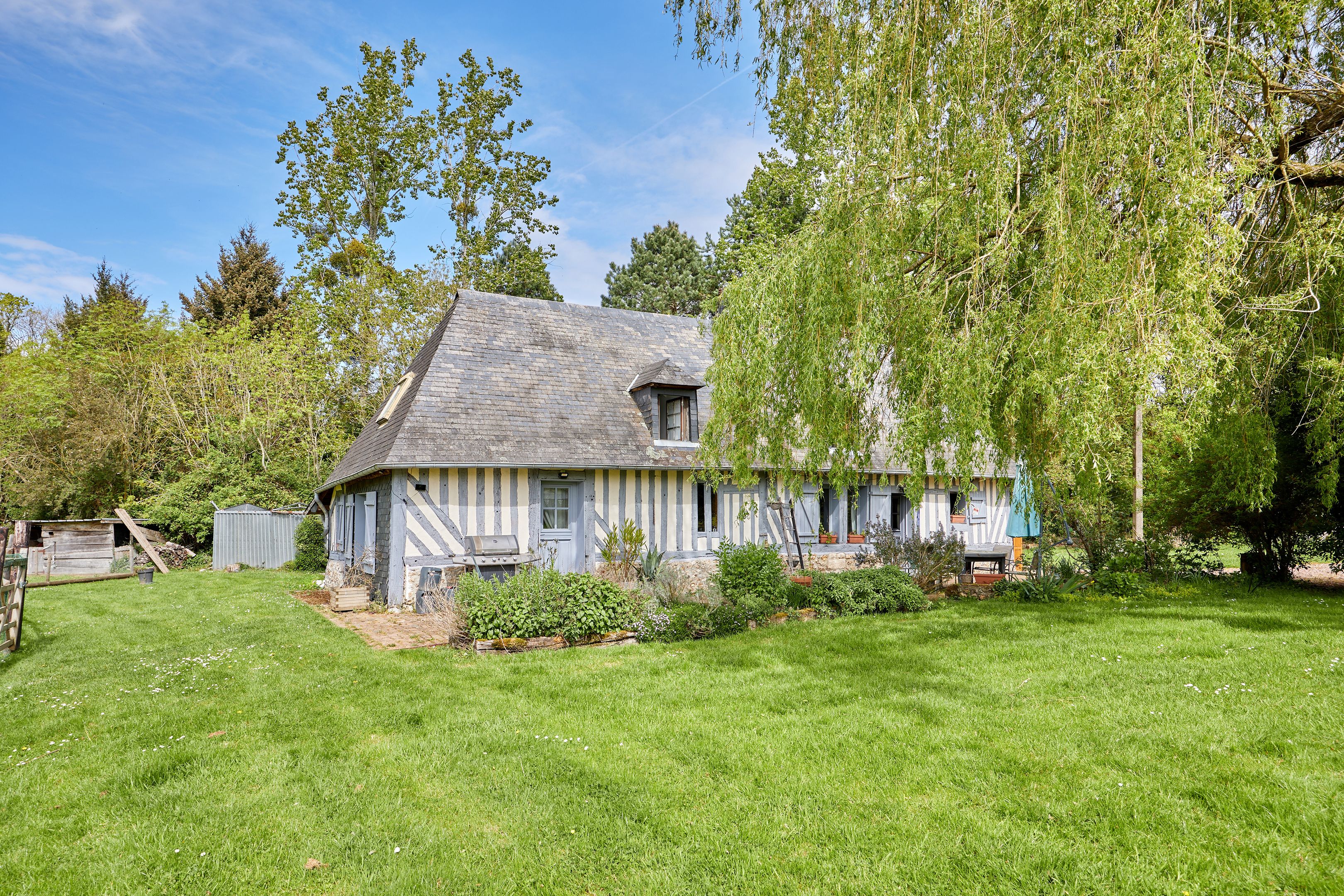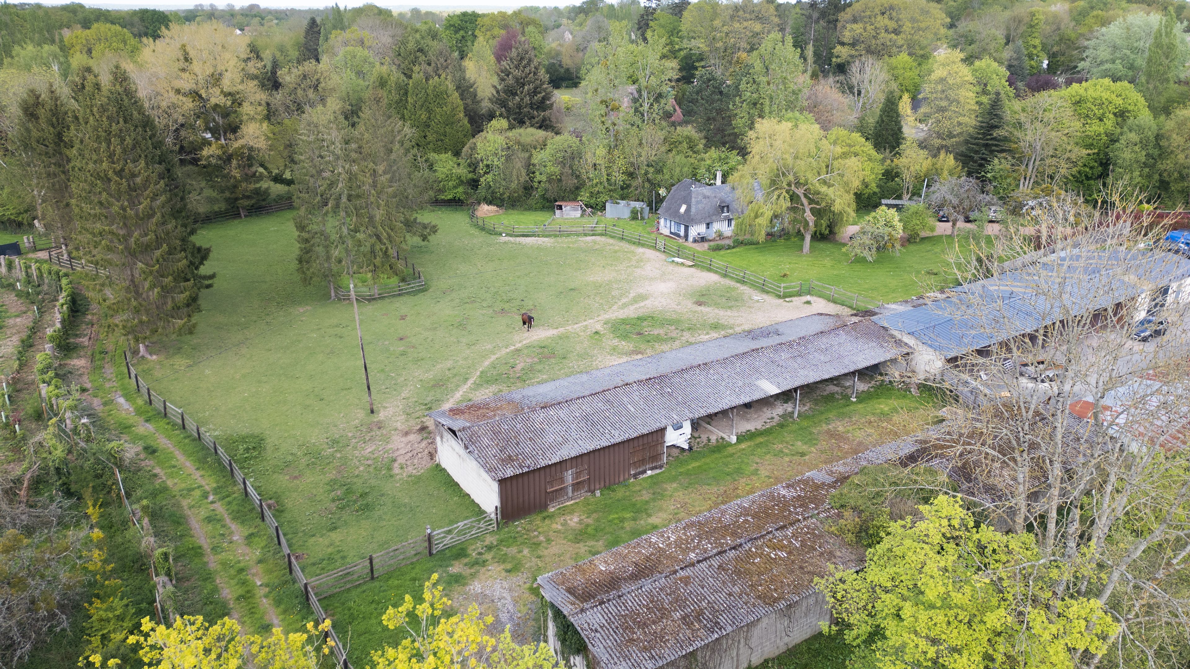 10 min from Pont-l'Évêque and 25 min from beaches, in quiet surroundings, charming 132 m² Normandy house set in 7402 m² of flat, enclosed grounds. First floor: living room with pellet stove, independent fitted kitchen, spacious living room with wood-burning stove, storeroom, shower room. First floor: three bedrooms and bathroom. Part of the land is fenced in for pasture. Outbuildings of approx. 300 m².