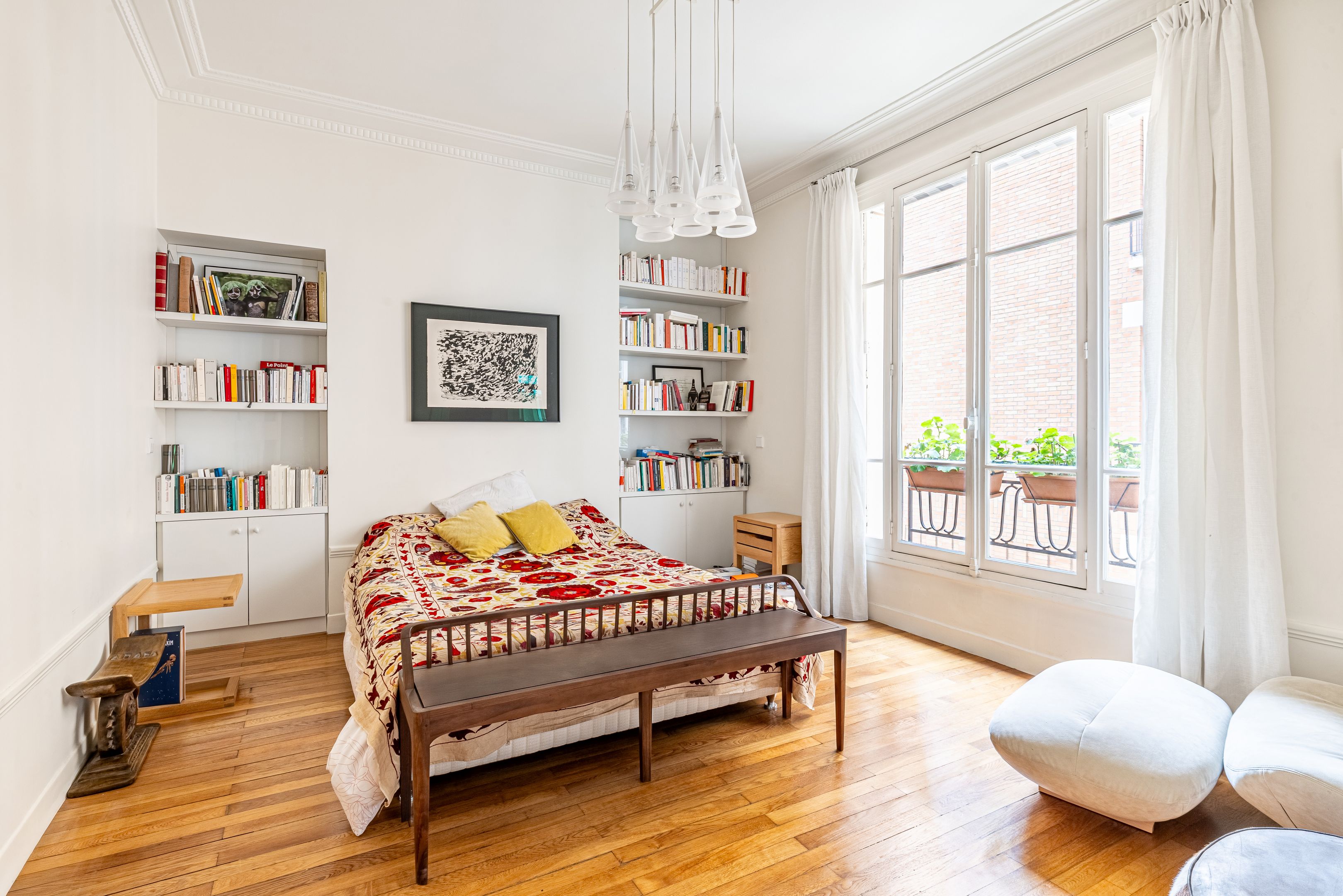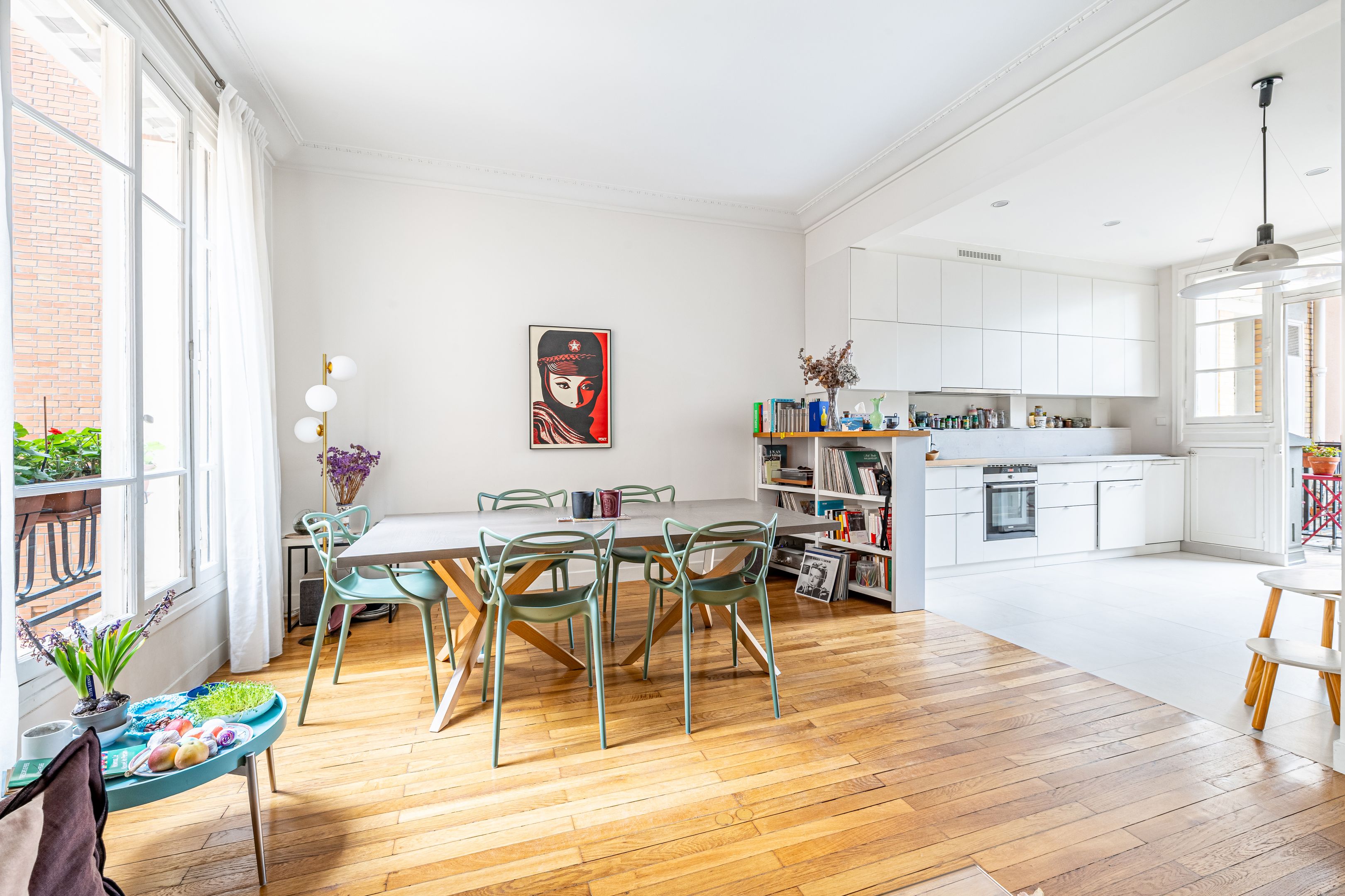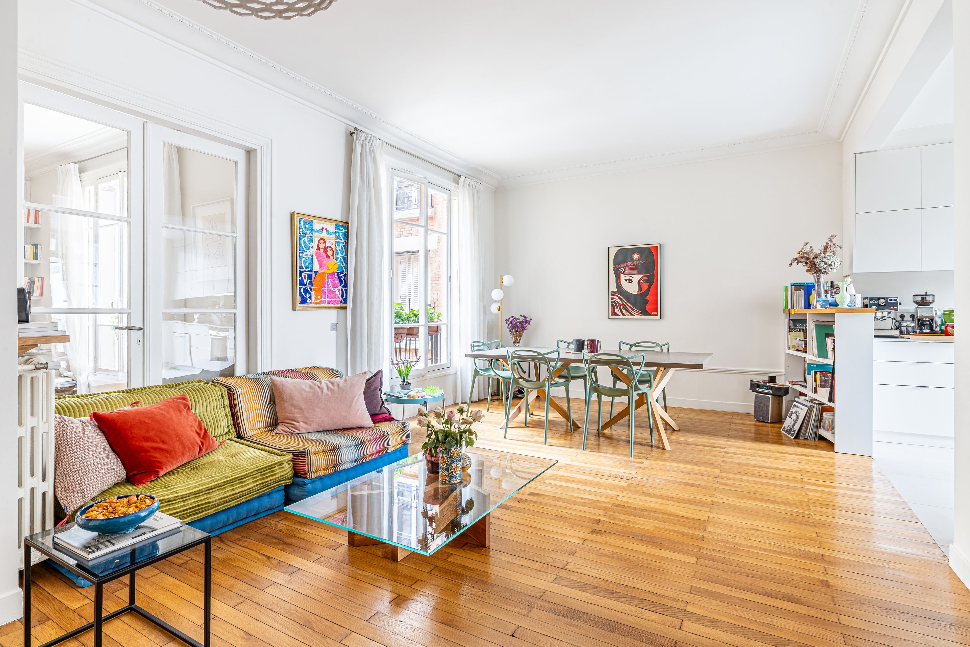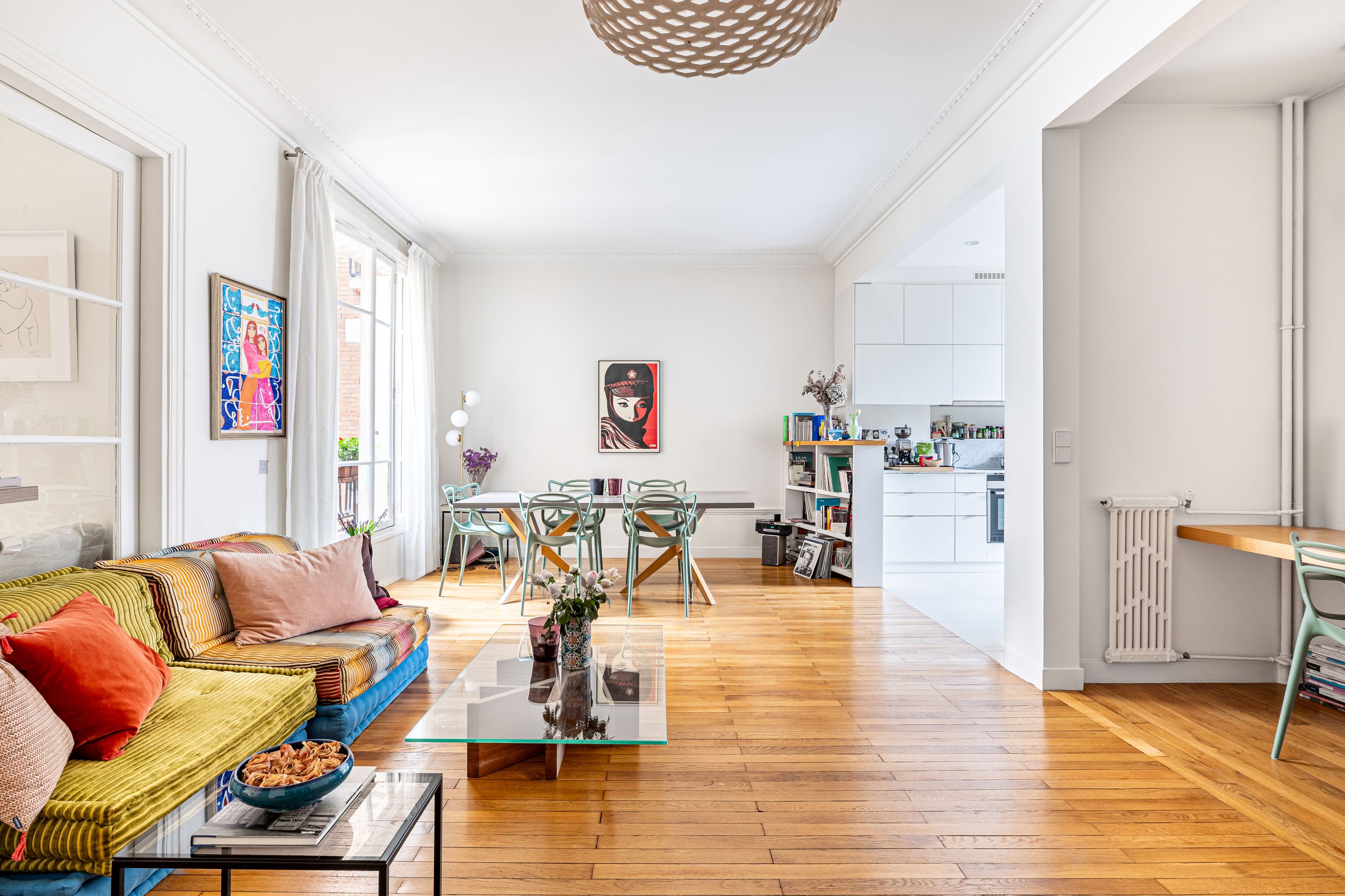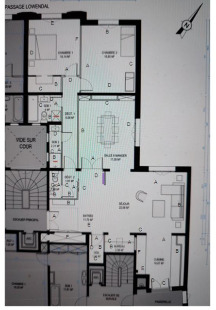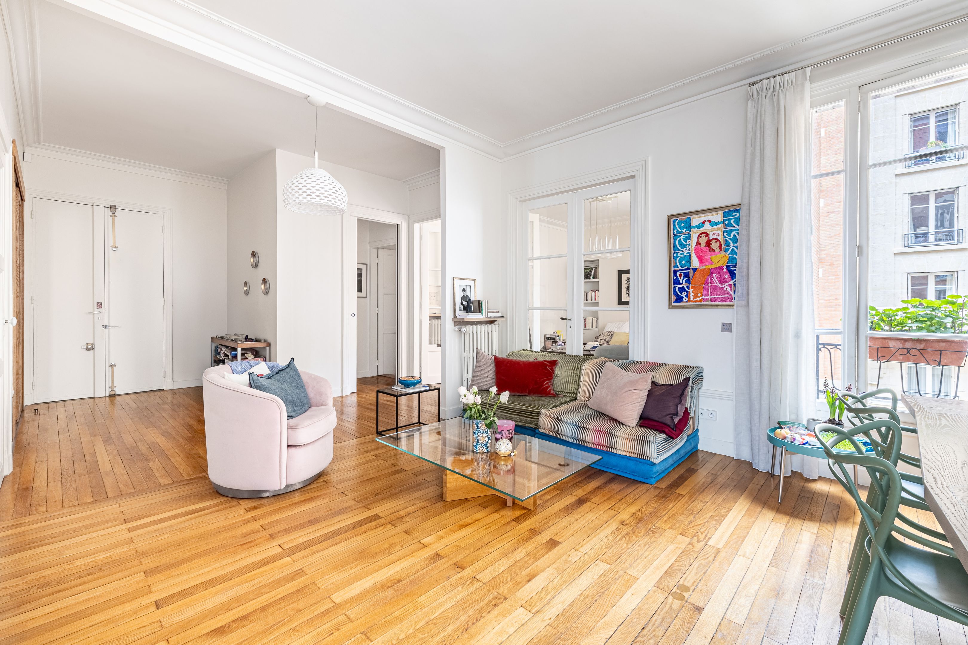 Art Deco building with janitor service. Cross-floor apartment of 113.06 m² (Loi Carrez), on the 2nd floor served by elevator, entirely renovated by an architect, benefiting from quality materials, spaciousness and pleasant luminosity. Spacious entrance hall with storage space, double living room, semi-open kitchen/dining room opening onto the living room, three good-sized bedrooms, one with dressing room, shower room, bathroom with toilet, guest toilet with washbasin, laundry room. Cellar. Parking space, extra charge (€20,000).