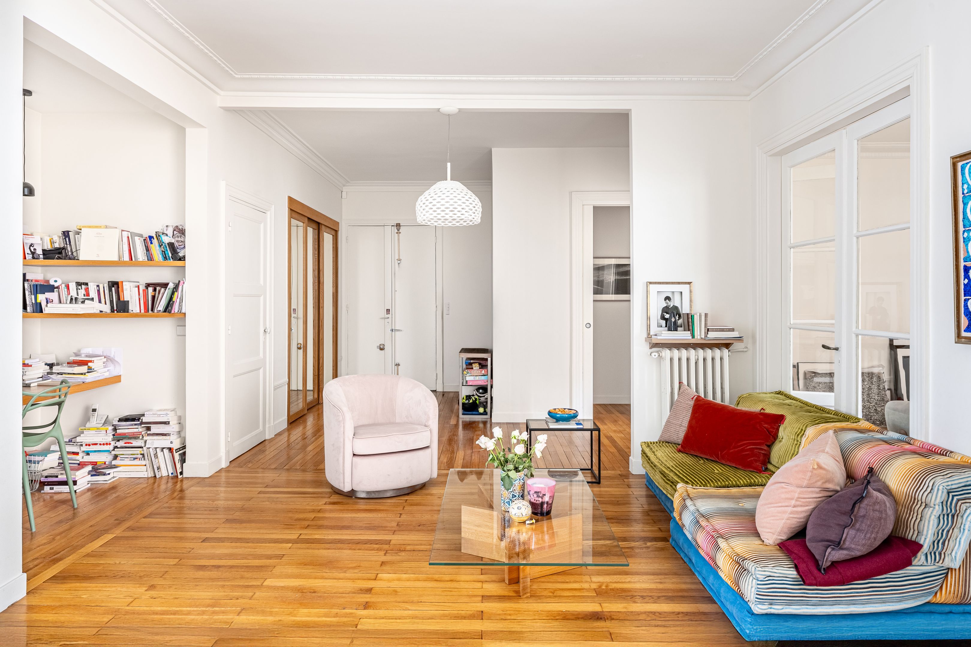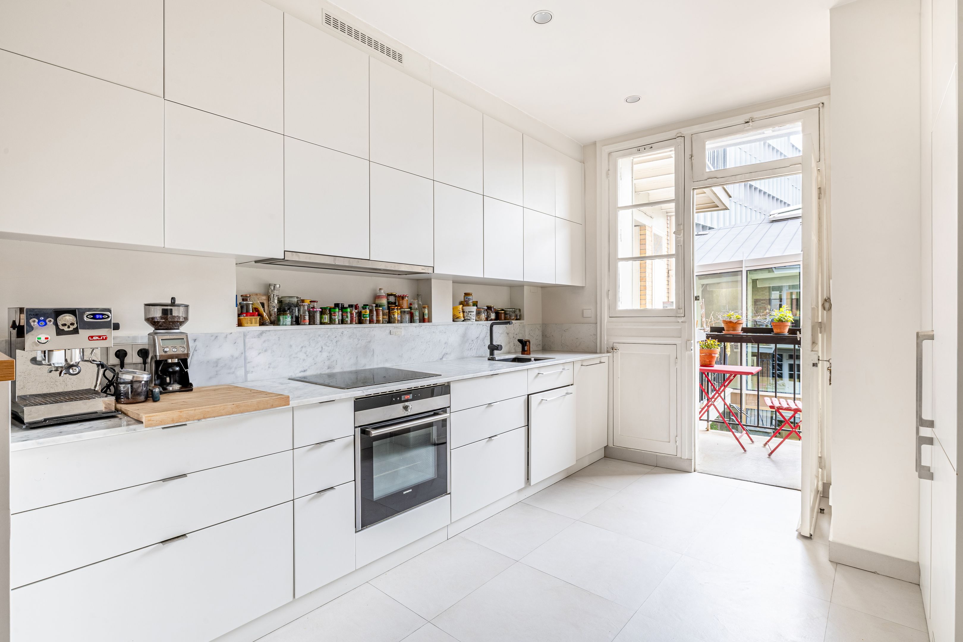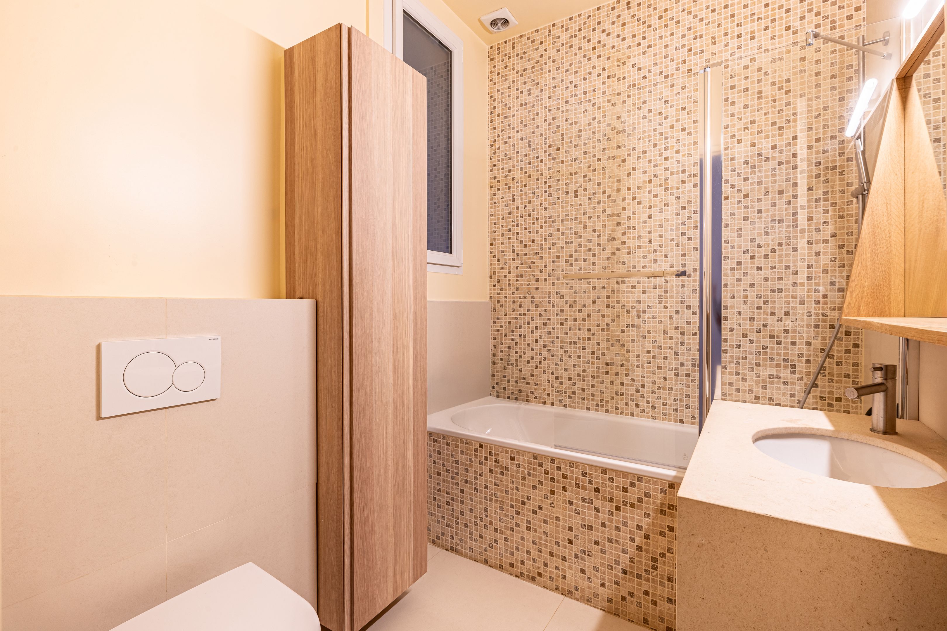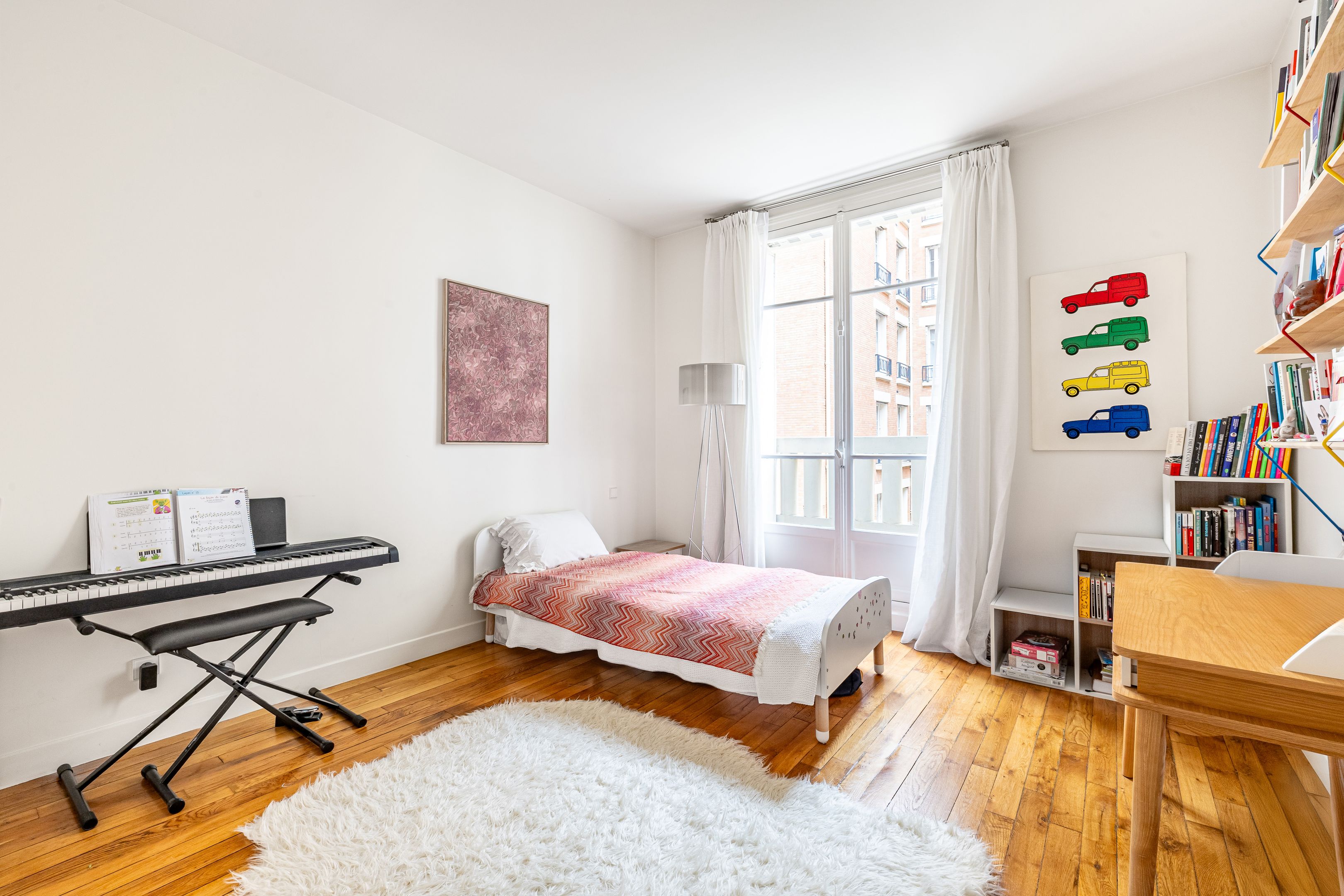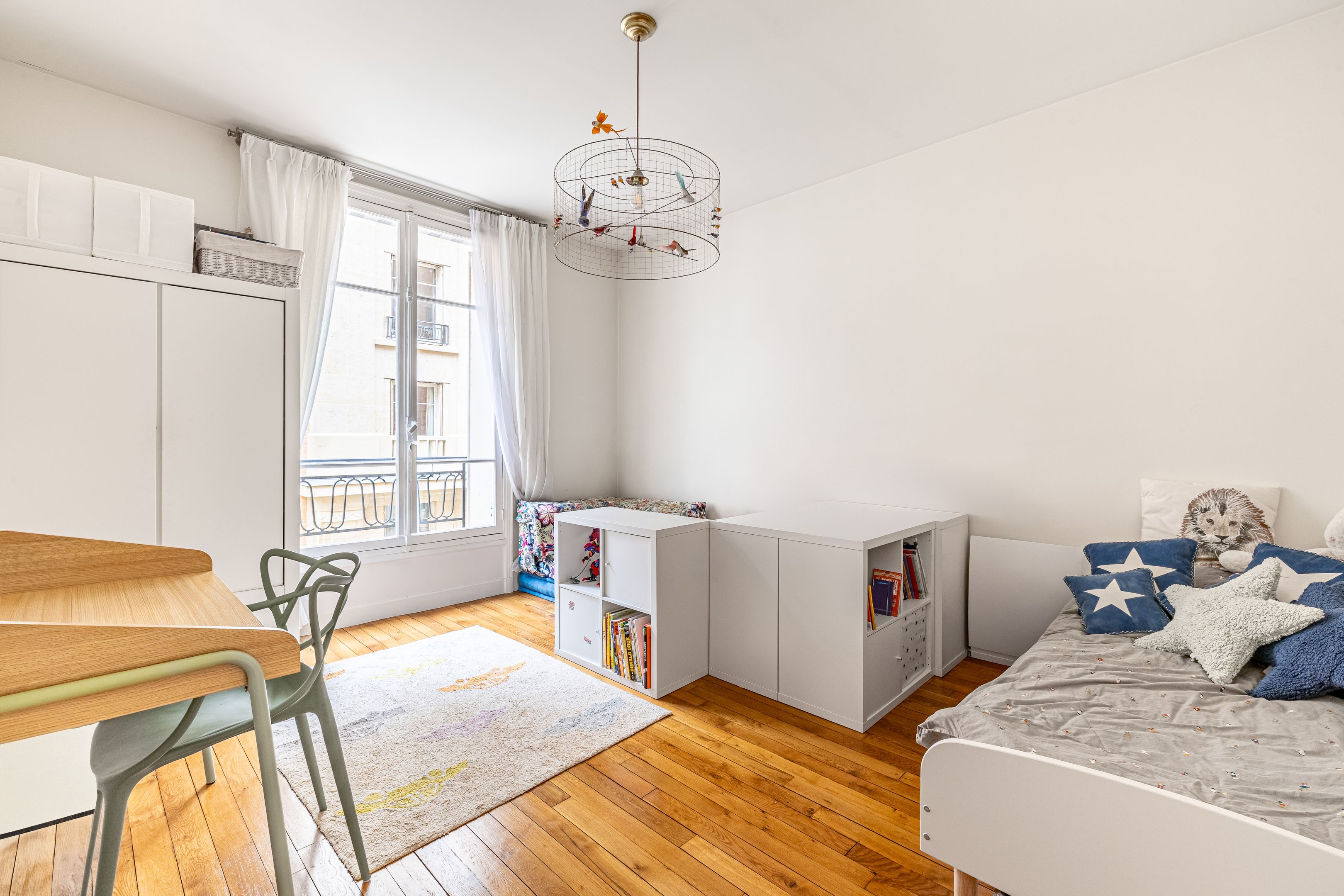 Art Deco building with janitor service. Cross-floor apartment of 113.06 m² (Loi Carrez), on the 2nd floor served by elevator, entirely renovated by an architect, benefiting from quality materials, spaciousness and pleasant luminosity. Spacious entrance hall with storage space, double living room, semi-open kitchen/dining room opening onto the living room, three good-sized bedrooms, one with dressing room, shower room, bathroom with toilet, guest toilet with washbasin, laundry room. Cellar. Parking space, extra charge (€20,000).