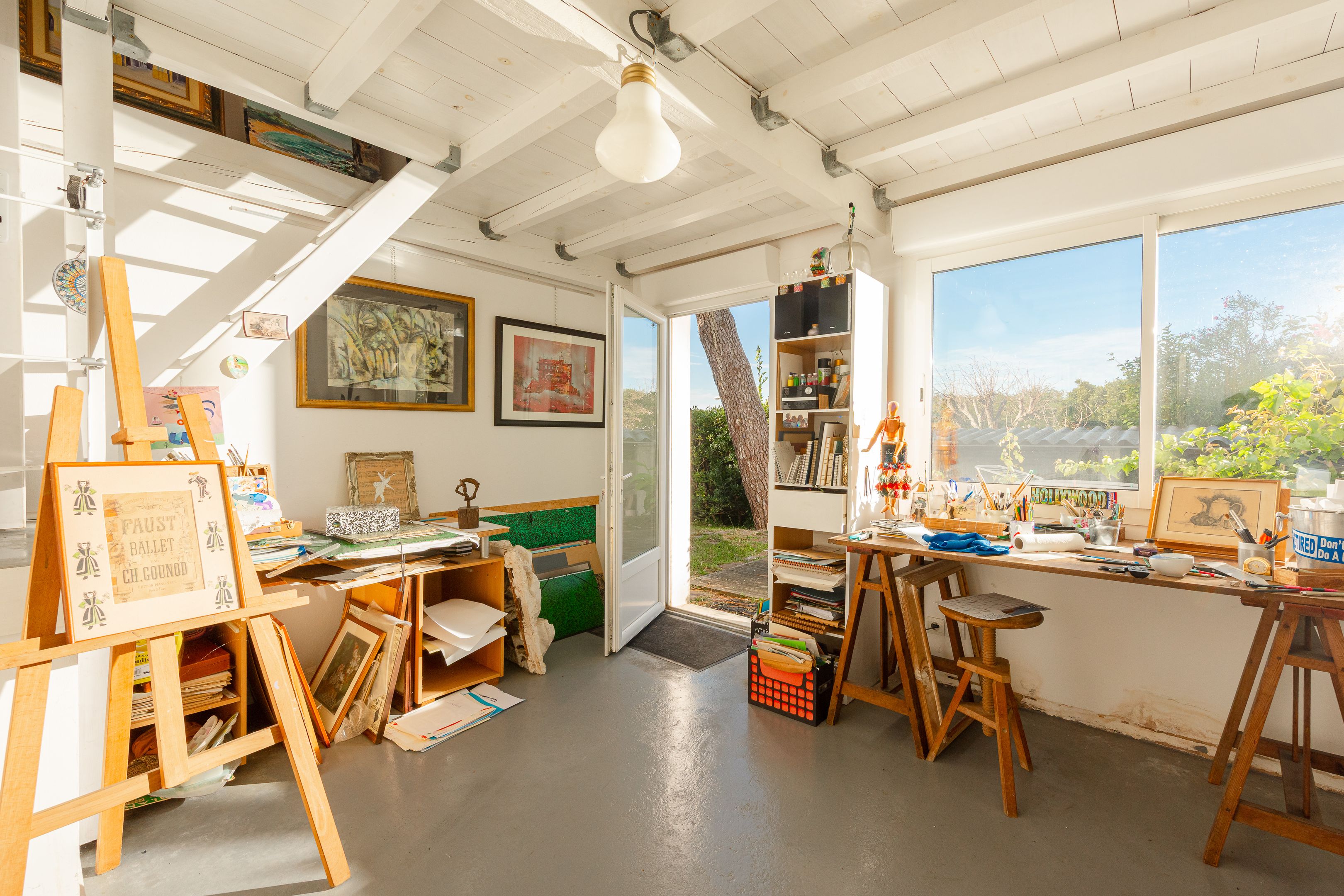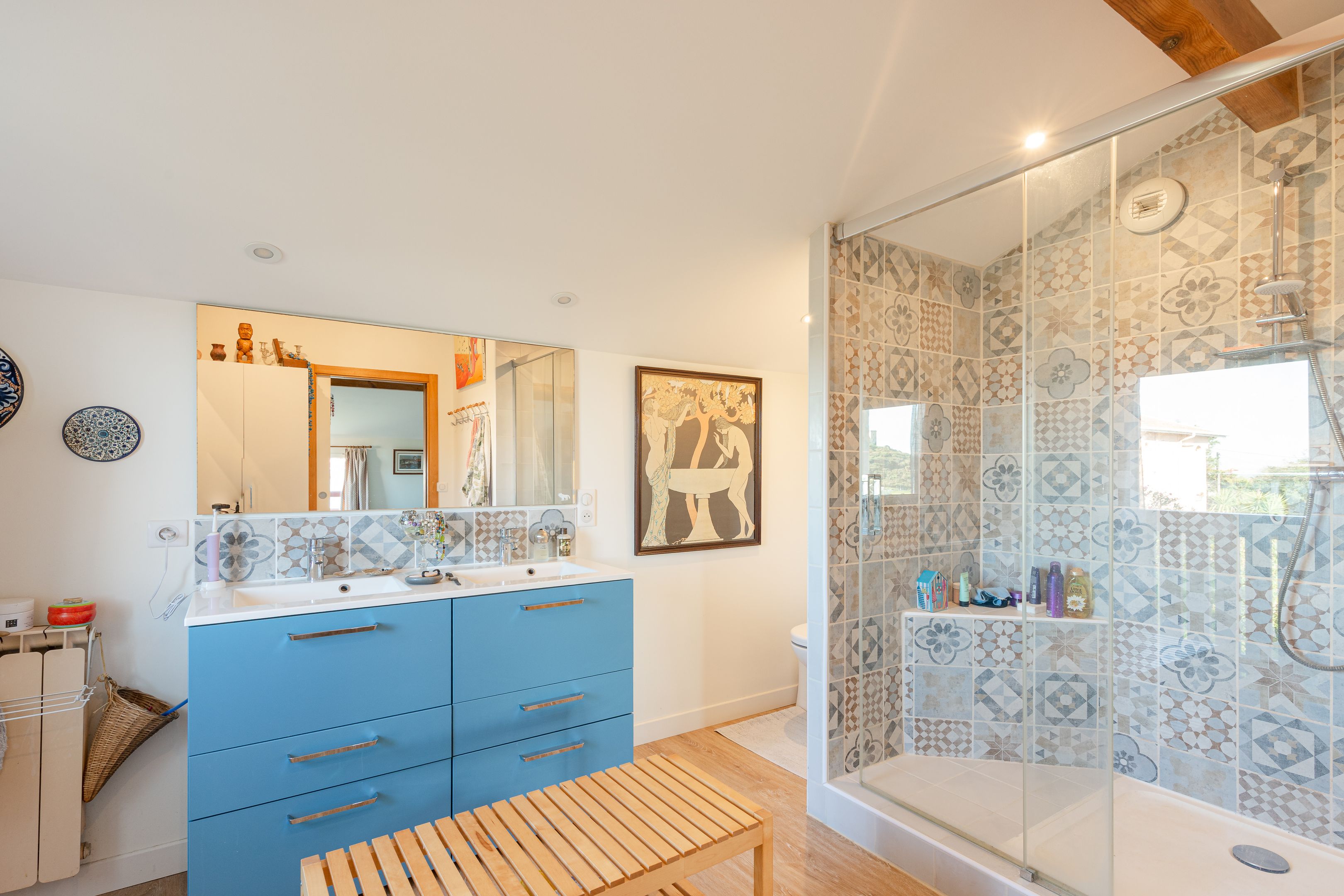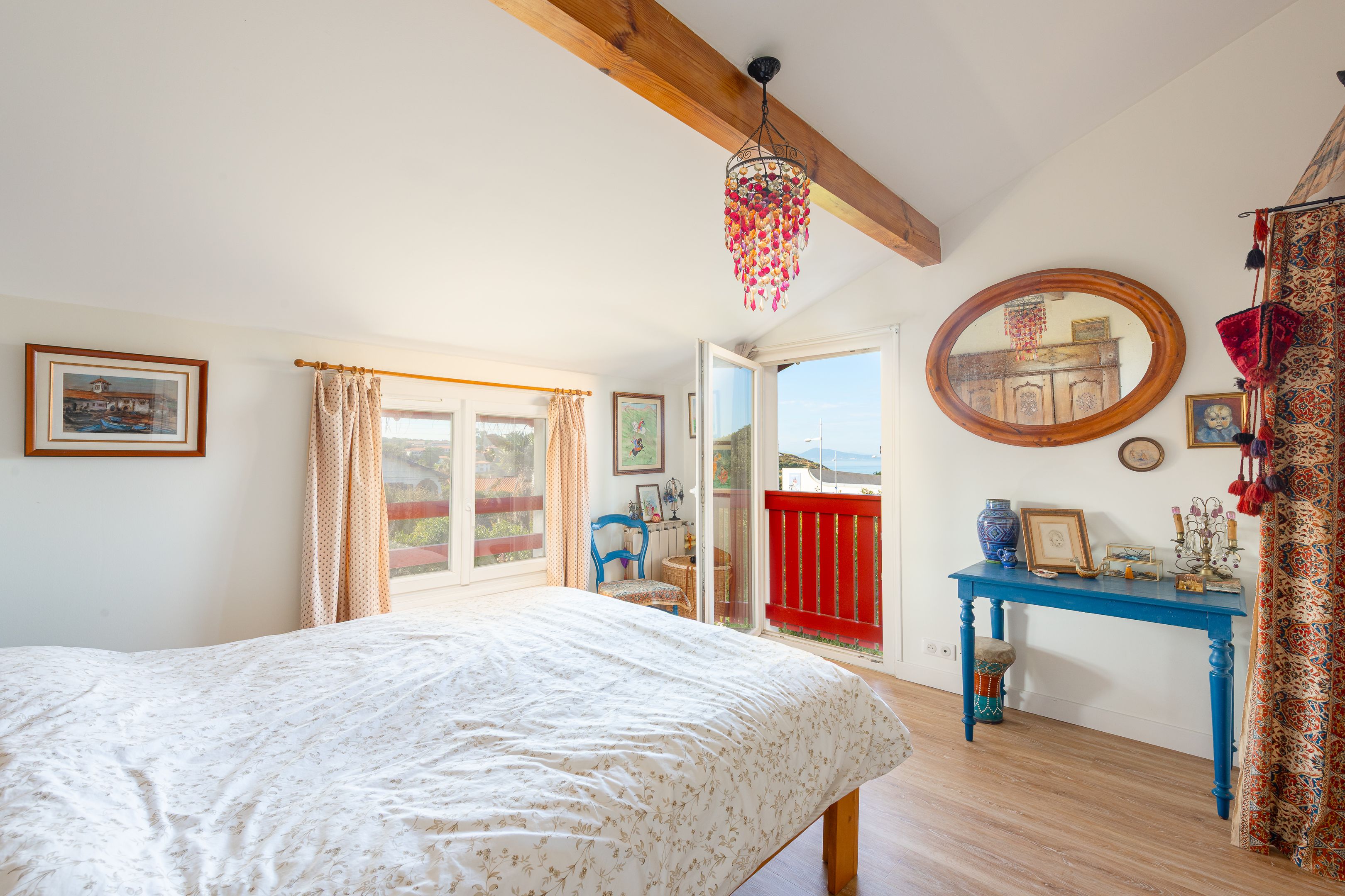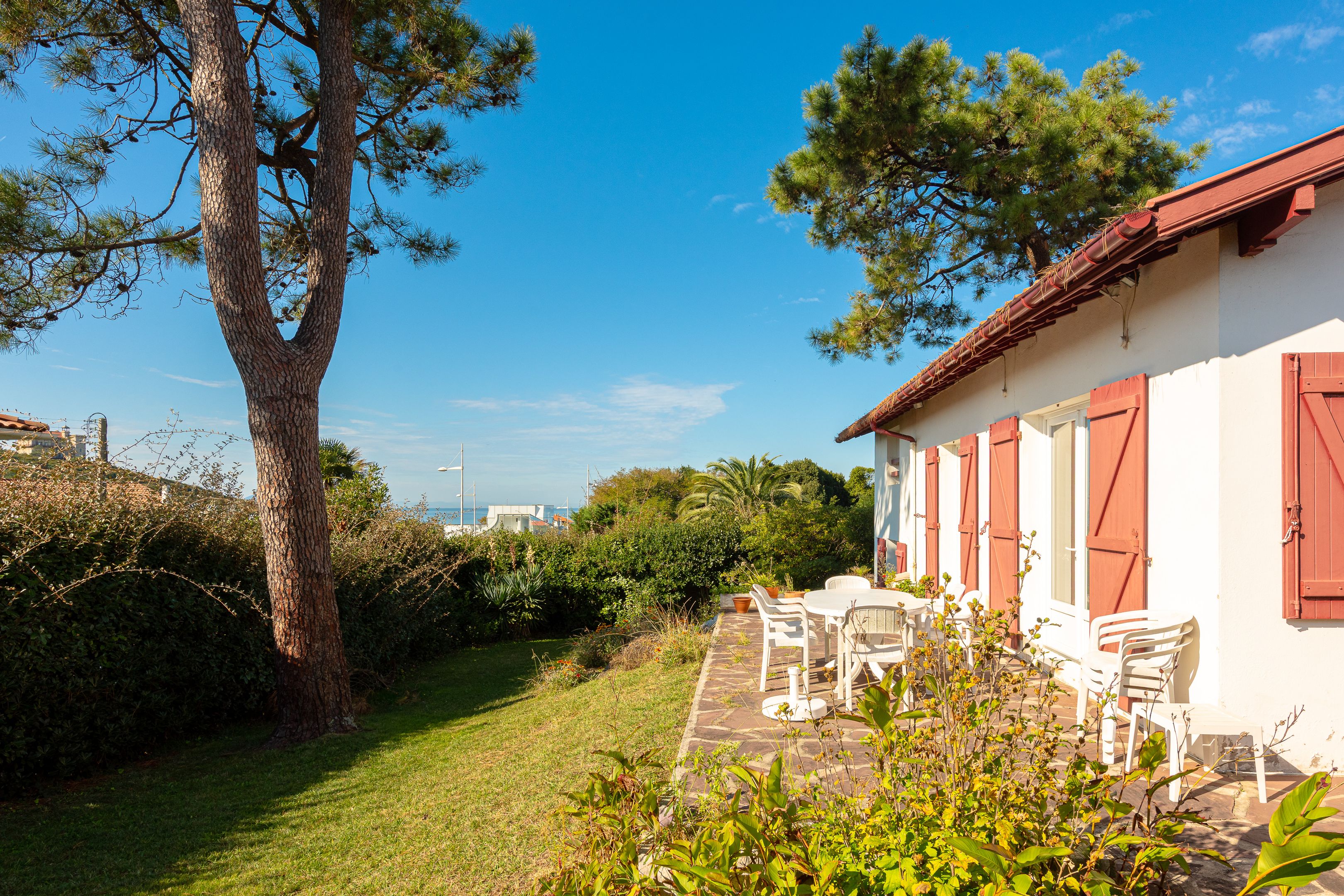 Less than 5 minutes' walk from La Milady beach, in a cul-de-sac, 140 m² house with 60's neo-Basque architecture and 560 m² garden, offering ocean views from the terrace. Entrance into a large living room, dining room, office area, semi-open kitchen and bathroom with toilet complete this first level. On the upper half-level, a master suite and en-suite shower room with toilet. On the lower half-level, two bedrooms on the garden level. Several outbuildings, including a workshop that can be converted into a bedroom, a laundry room, a second workshop and a storage room for bikes and surfboards. Possibility of building an additional 119 m² of floor space and/or raising the height of the house, as well as creating a swimming pool.