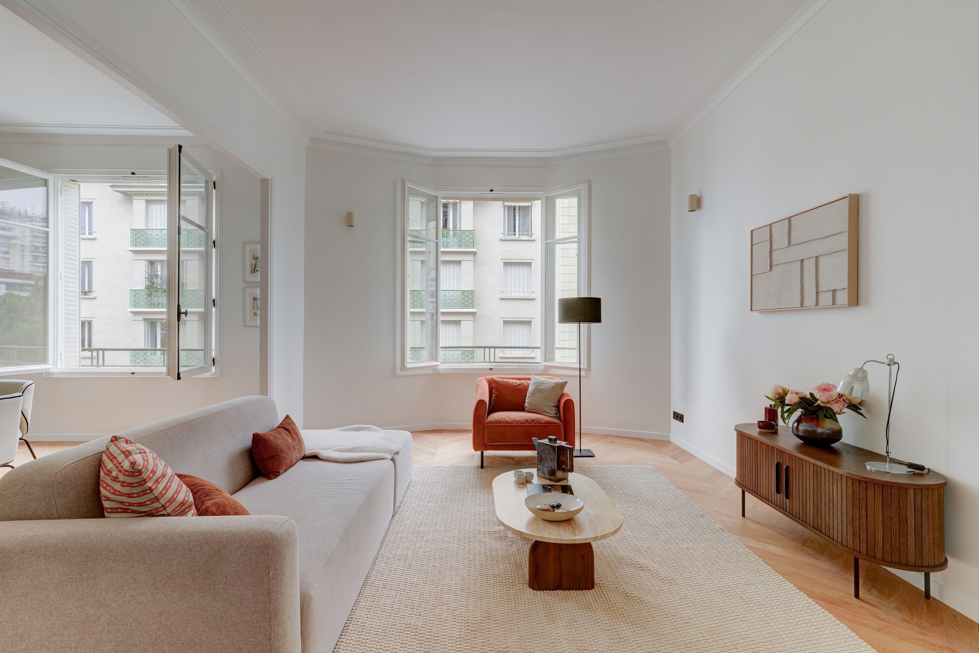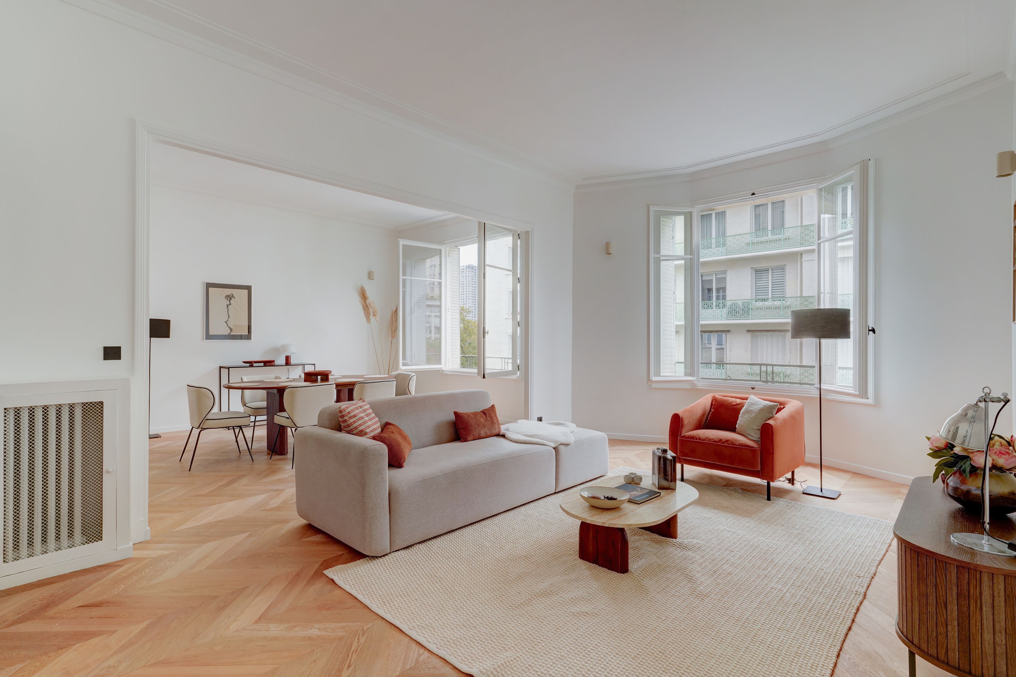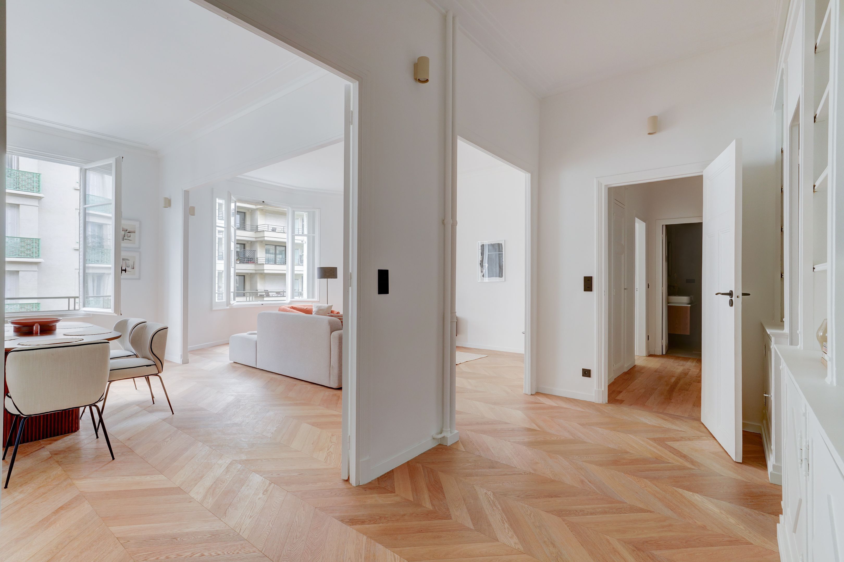 Parc de Passy, well-constructed 30's stone building, high-standard communal areas, 3rd floor, apartment entirely renovated with quality materials, spacious and sunny thanks to its southern exposure. Good layout. Entrance hall, double reception room, nearby separate kitchen, three bedrooms, two bathrooms, two toilets. Cellar.