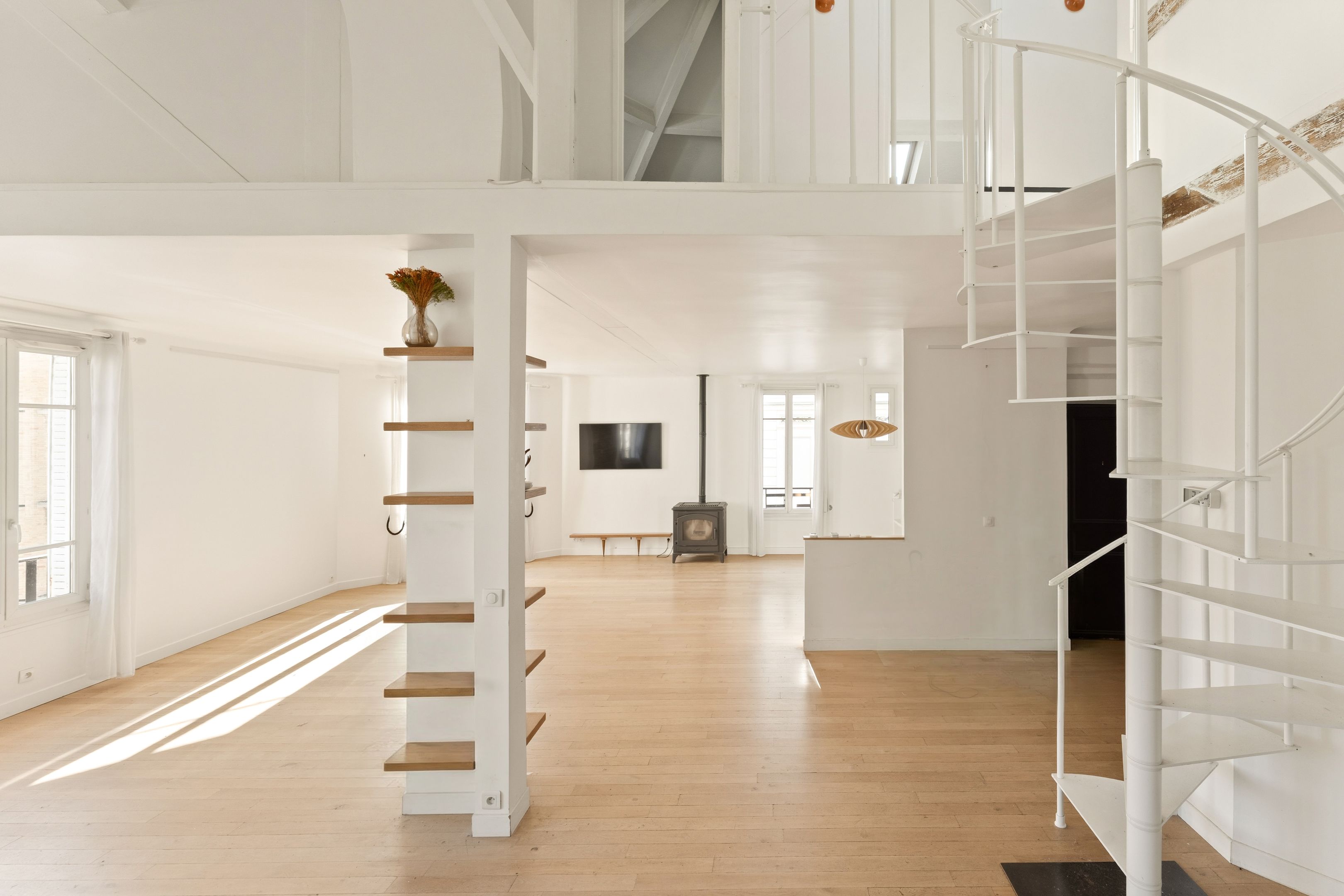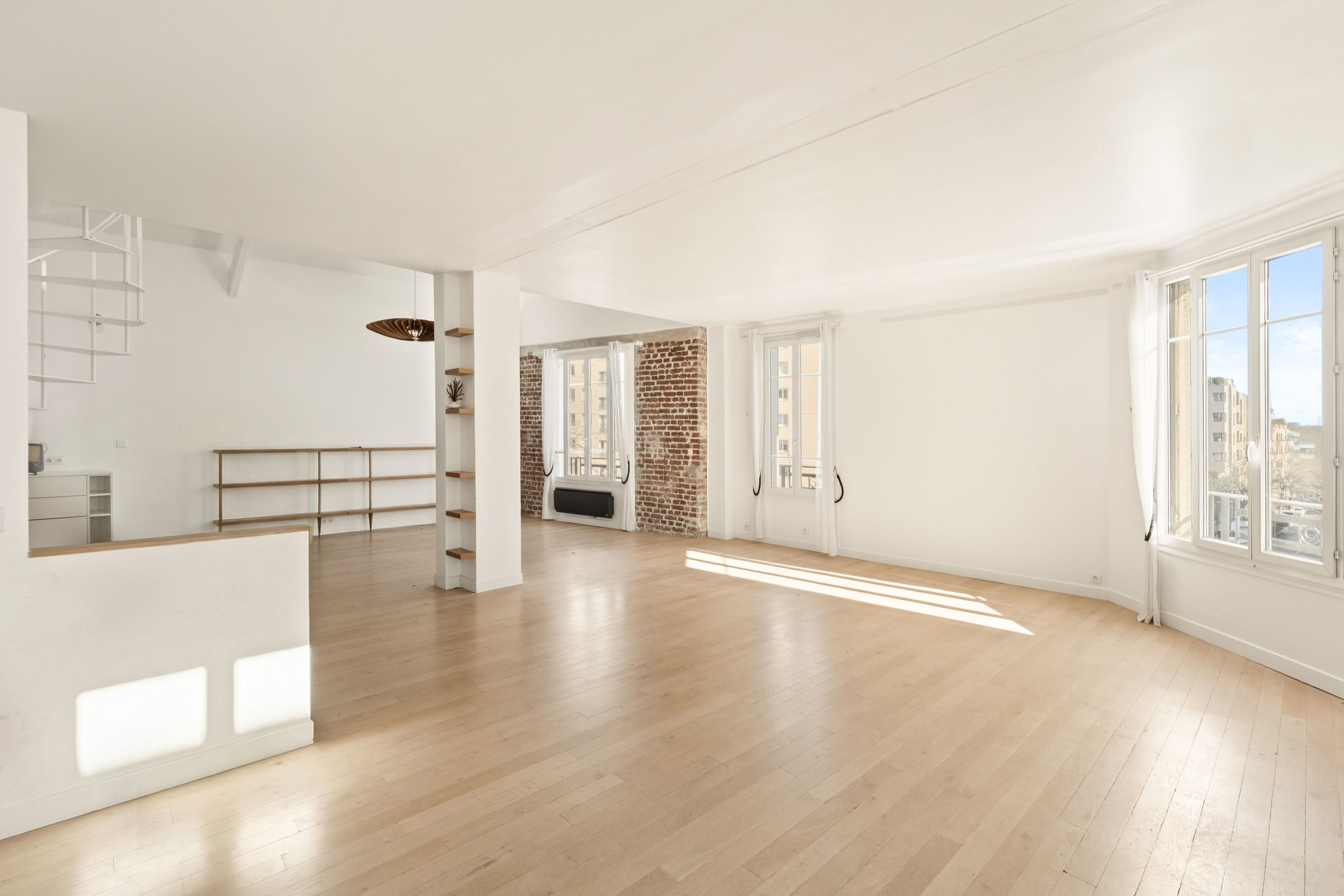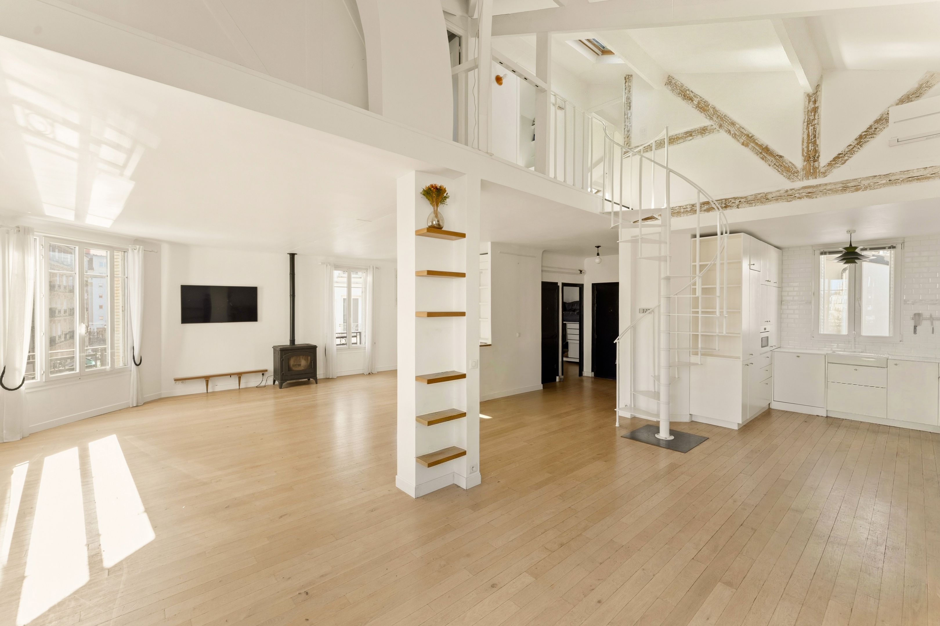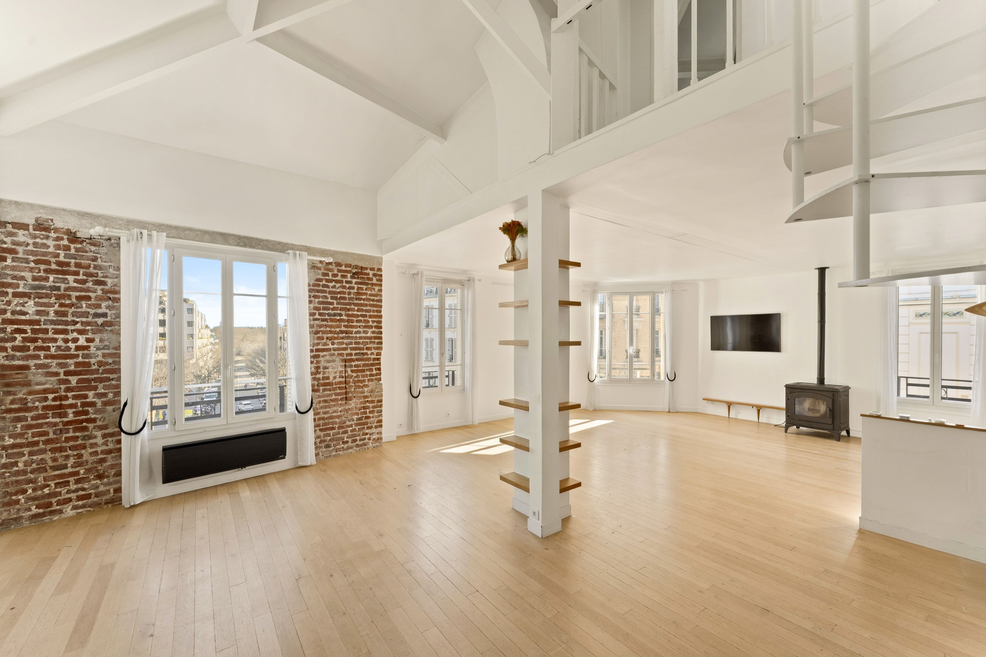 Entrance hall, vast double living-dining room with open-plan kitchen, 4 m high ceilings, exceptional luminosity and unobstructed view, study area, library, master suite with shower room, laundry room and separate toilet.