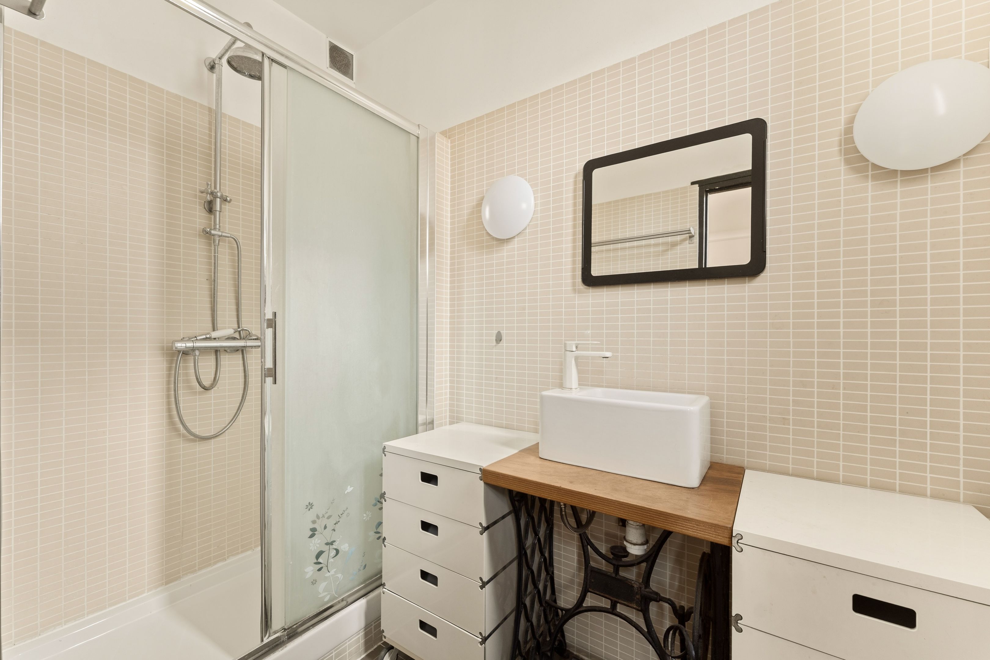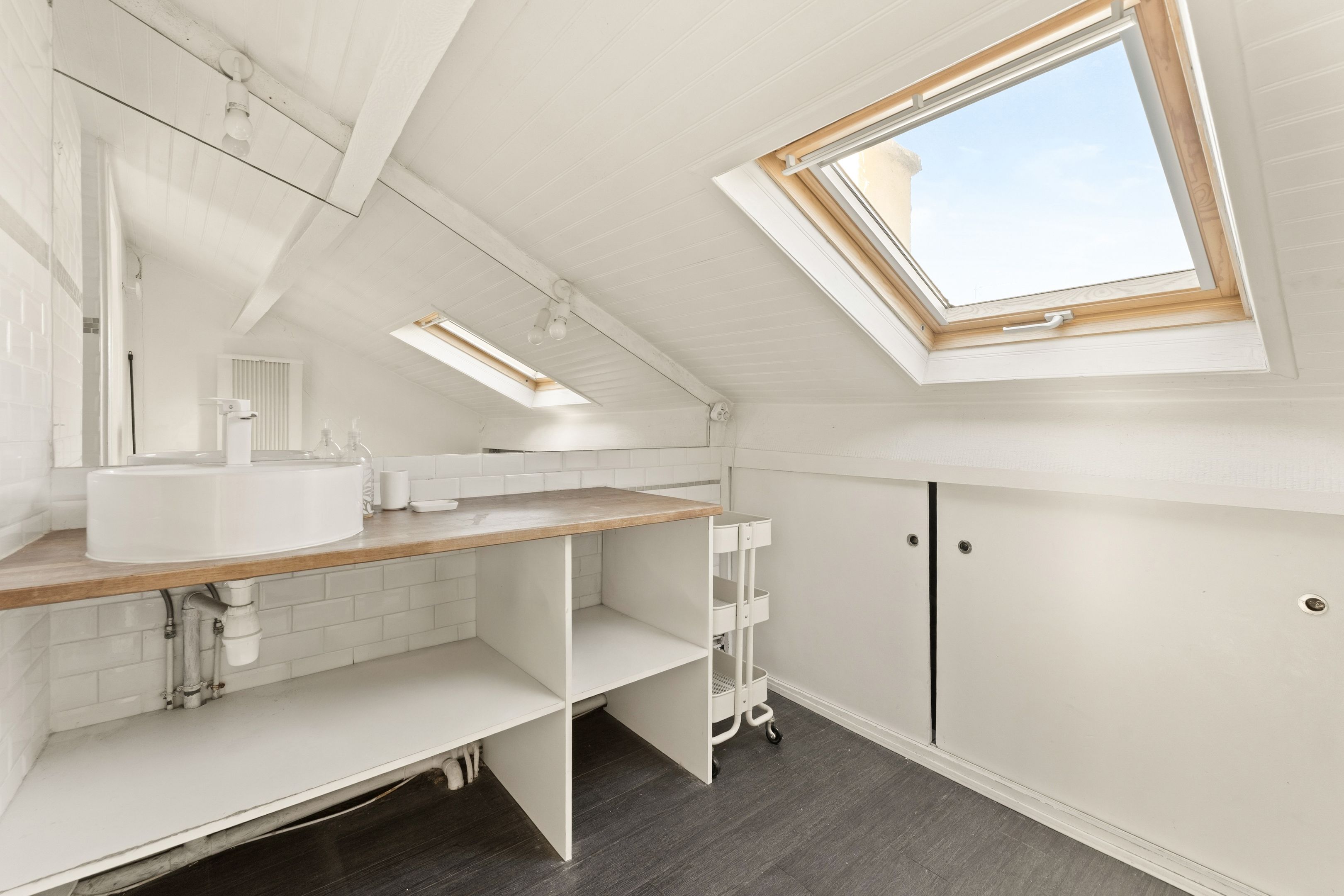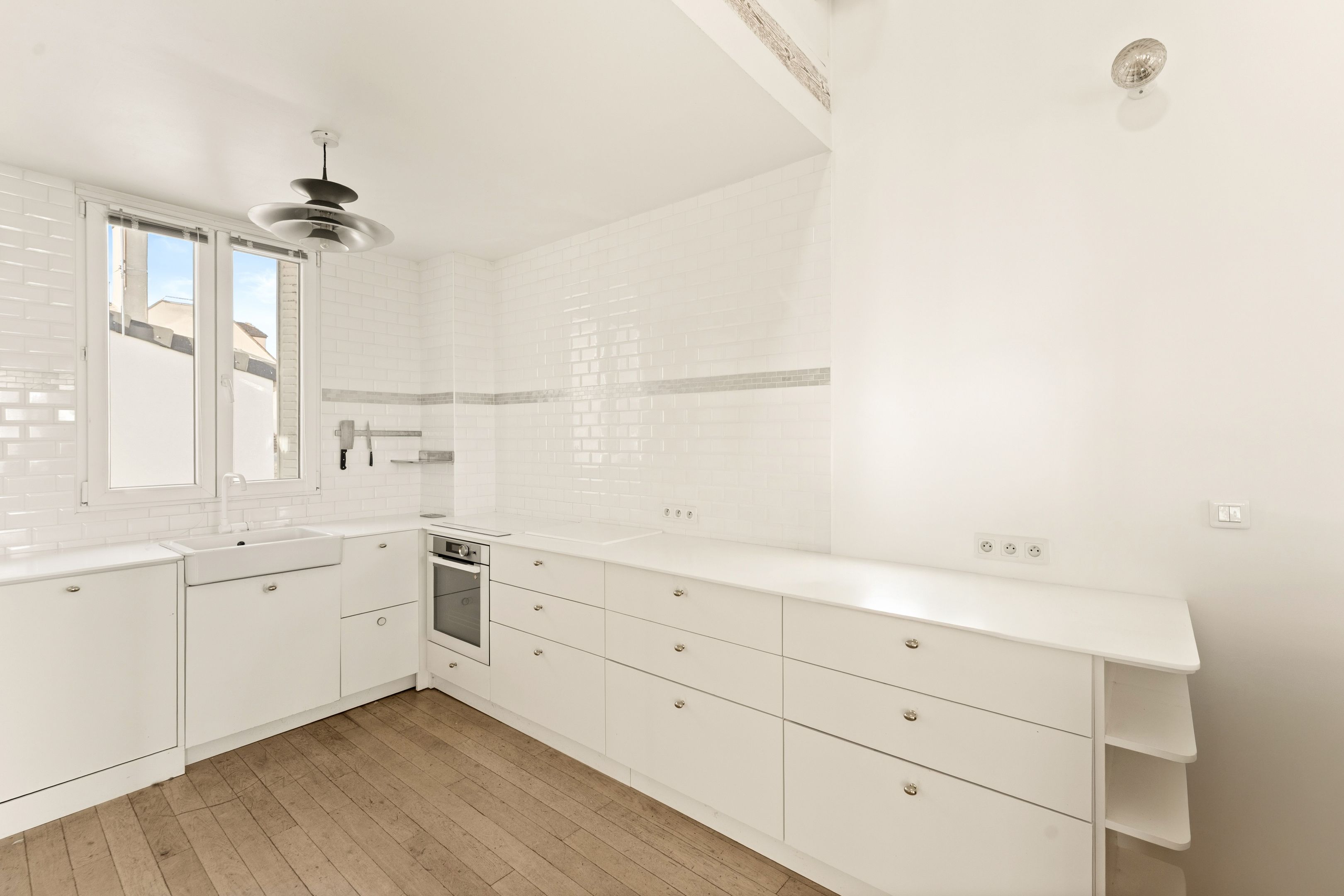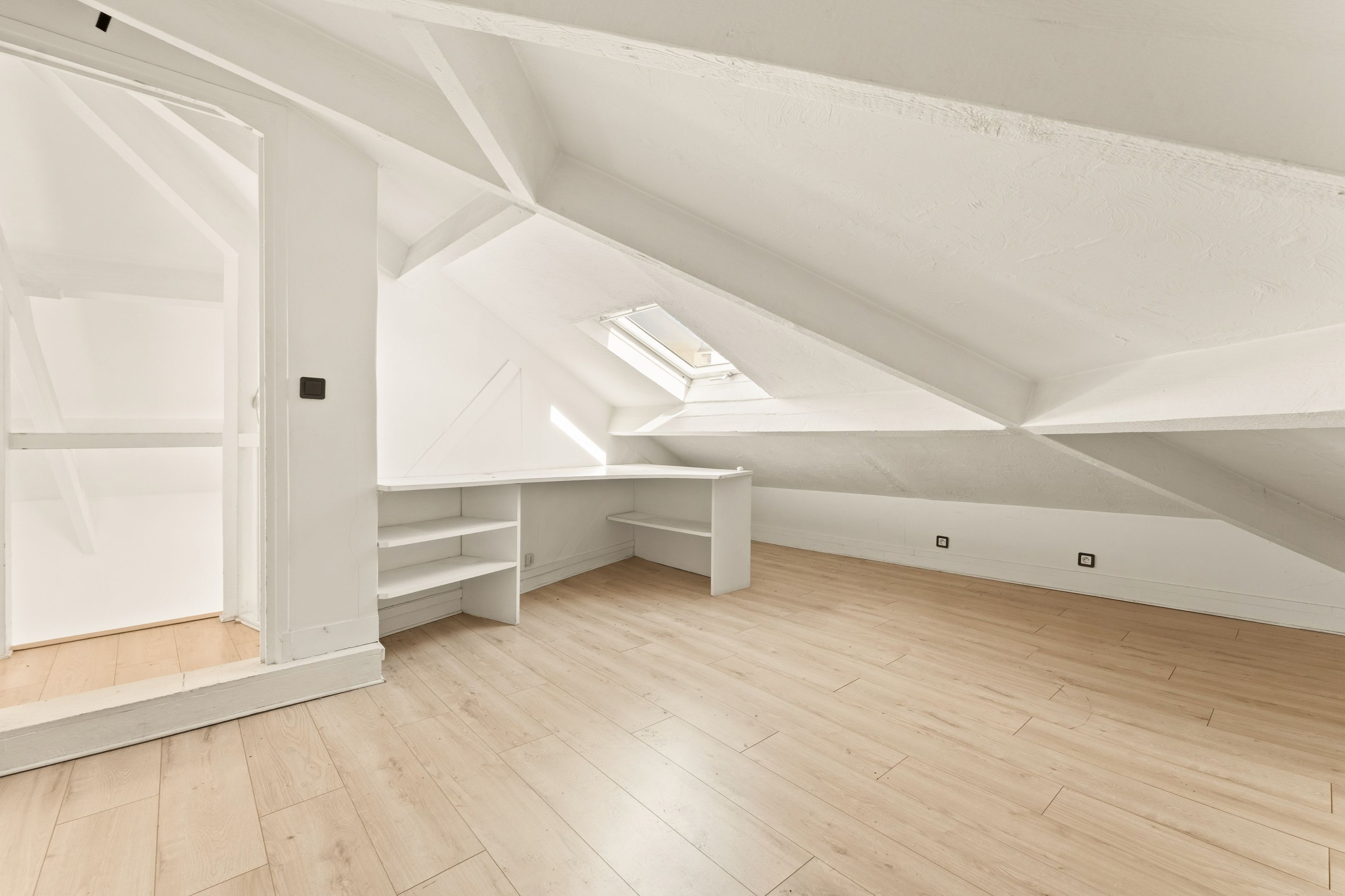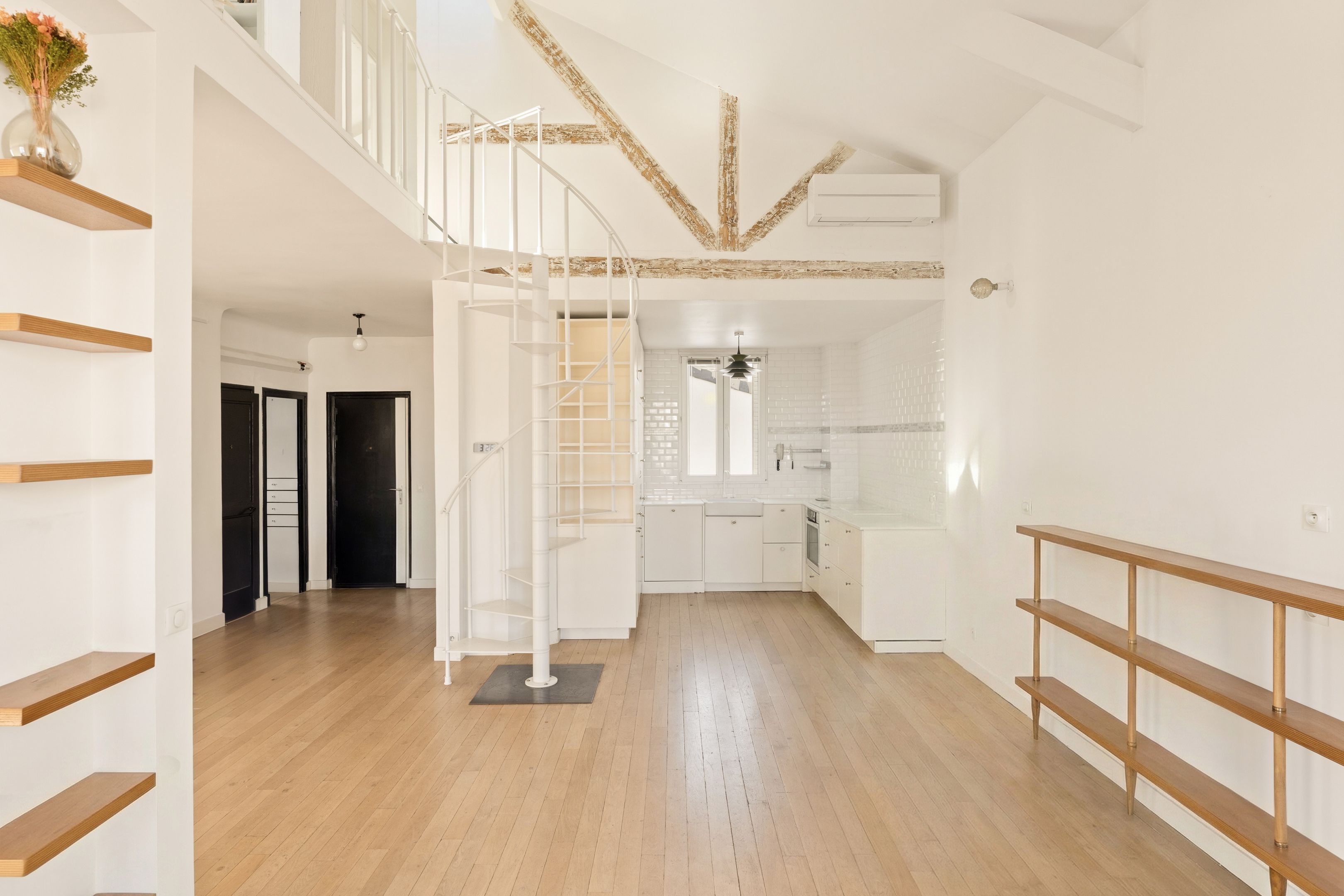 Entrance hall, vast double living-dining room with open-plan kitchen, 4 m high ceilings, exceptional luminosity and unobstructed view, study area, library, master suite with shower room, laundry room and separate toilet.