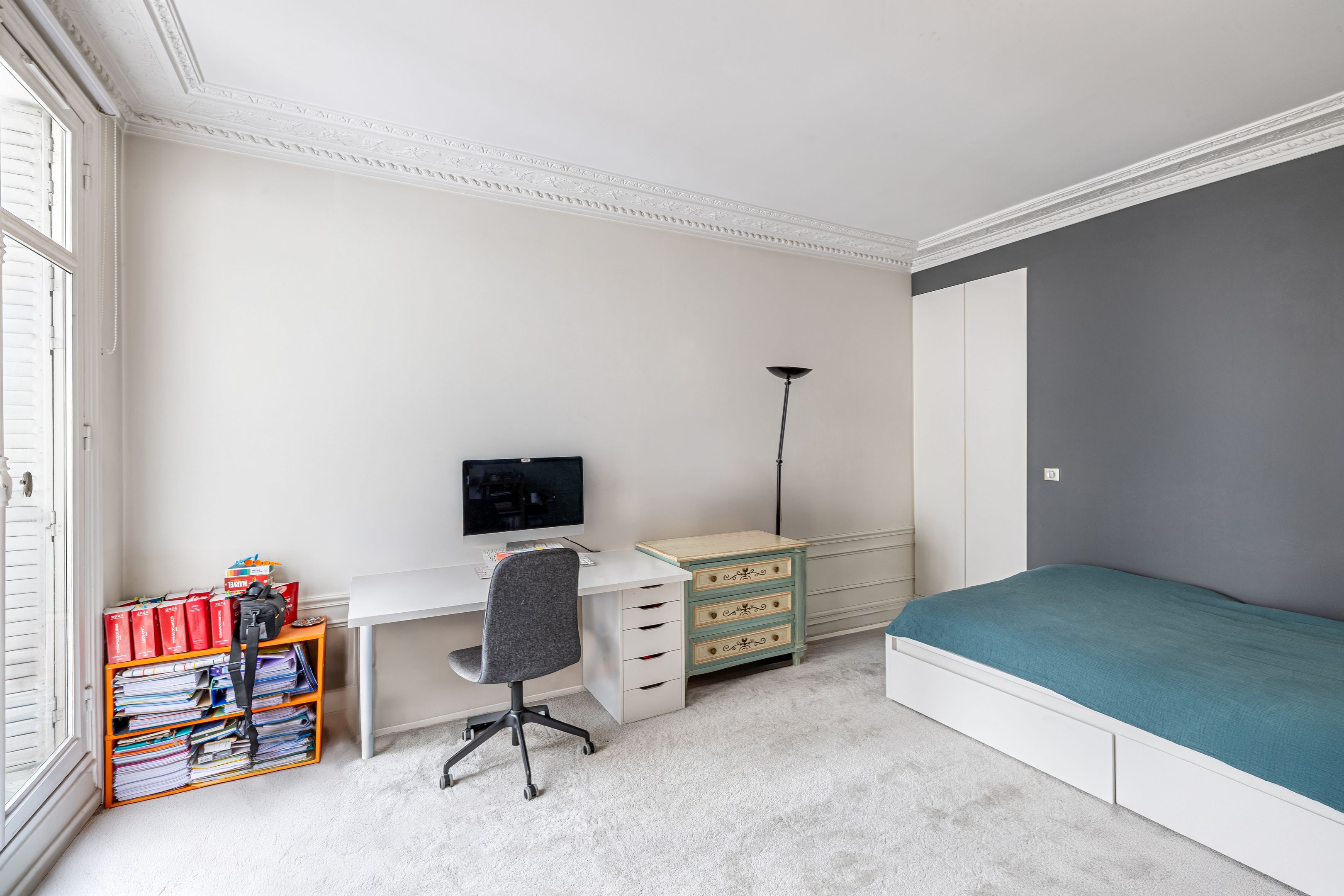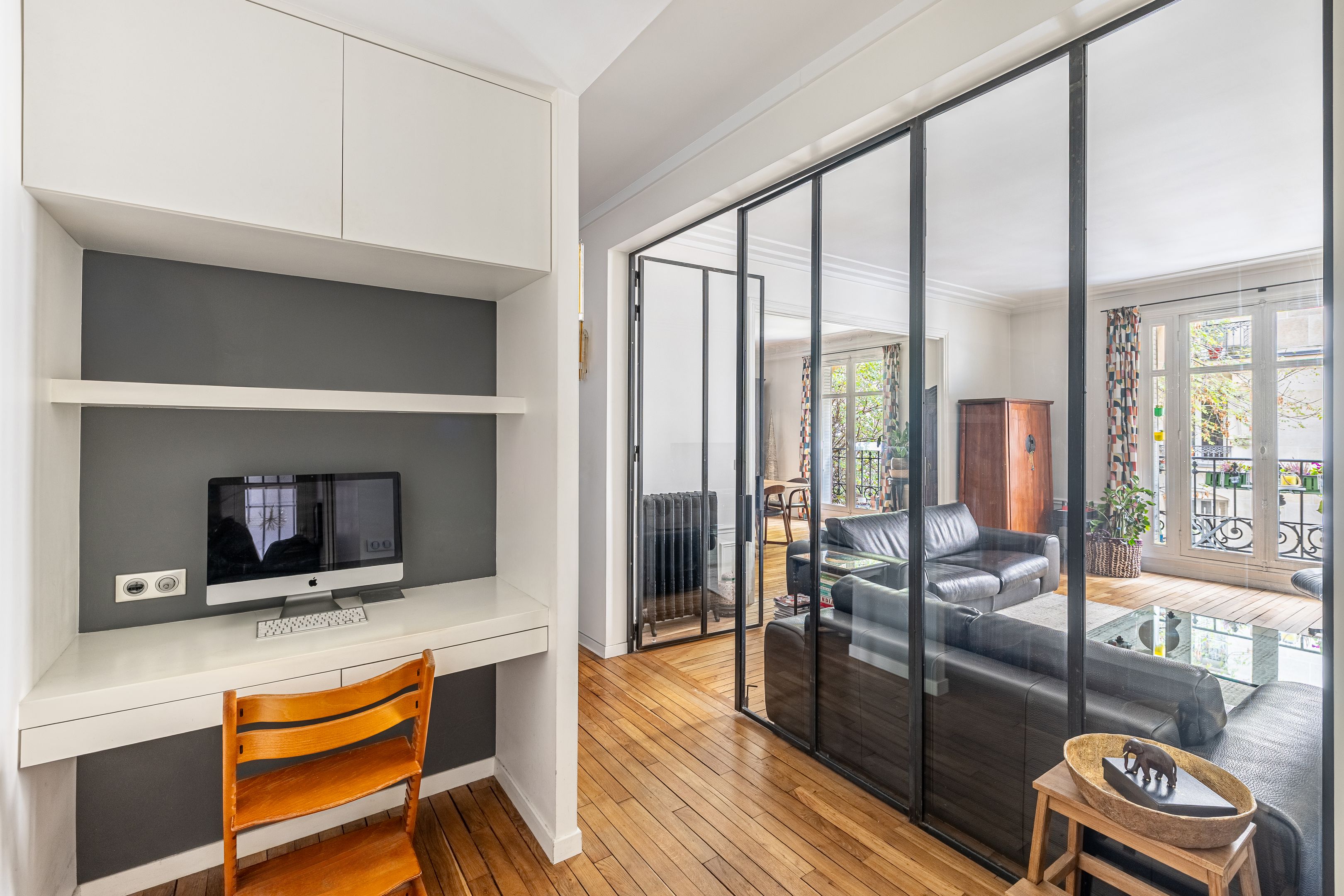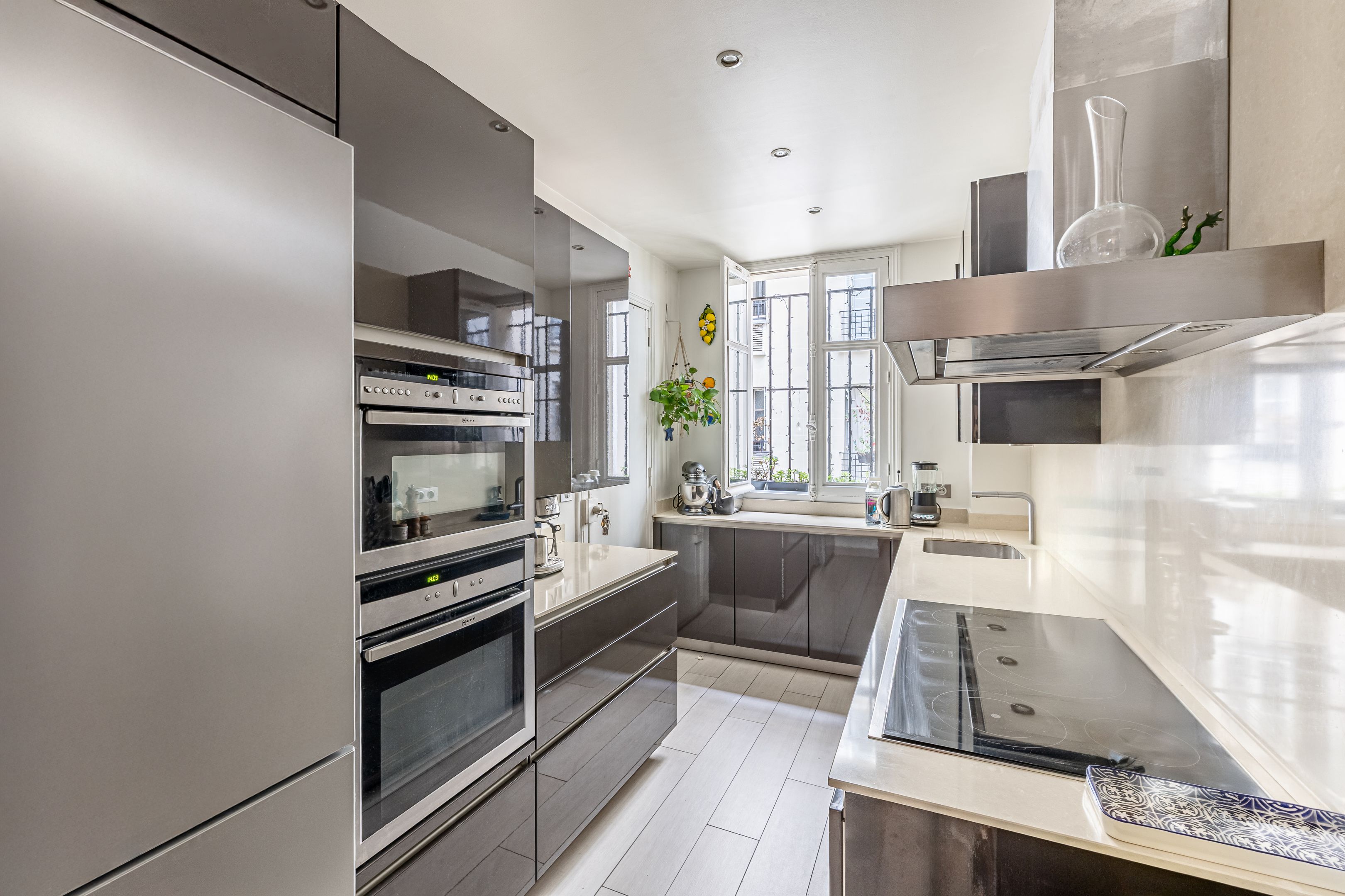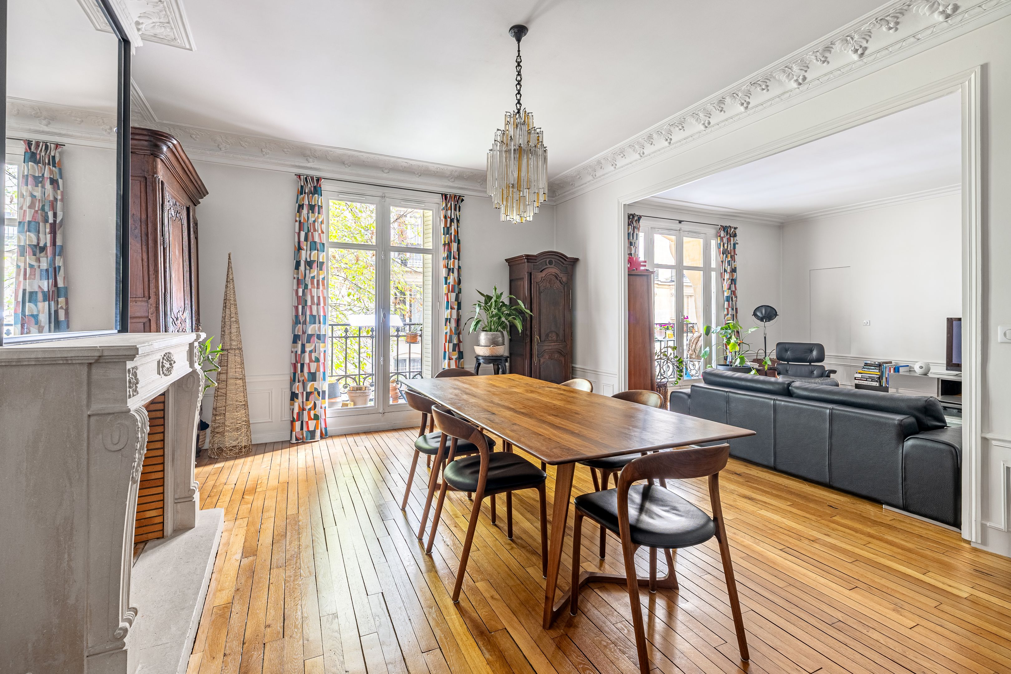 On the second floor, 145.41m² family apartment benefiting from high-quality contemporary renovation and spacious accommodation. Entrance gallery, double reception room, independent fitted and equipped kitchen with dining area, office space in the entrance hall, three bedrooms including a master suite with bathroom, shower and toilet, numerous custom-designed storage spaces, shower room, guest toilet. Storeroom/laundry room on the service landing in exclusive private use. Cellar. Possibility of acquiring a 9.14m² fitted service room on the seventh floor by staircase. Right to park on private driveway.
