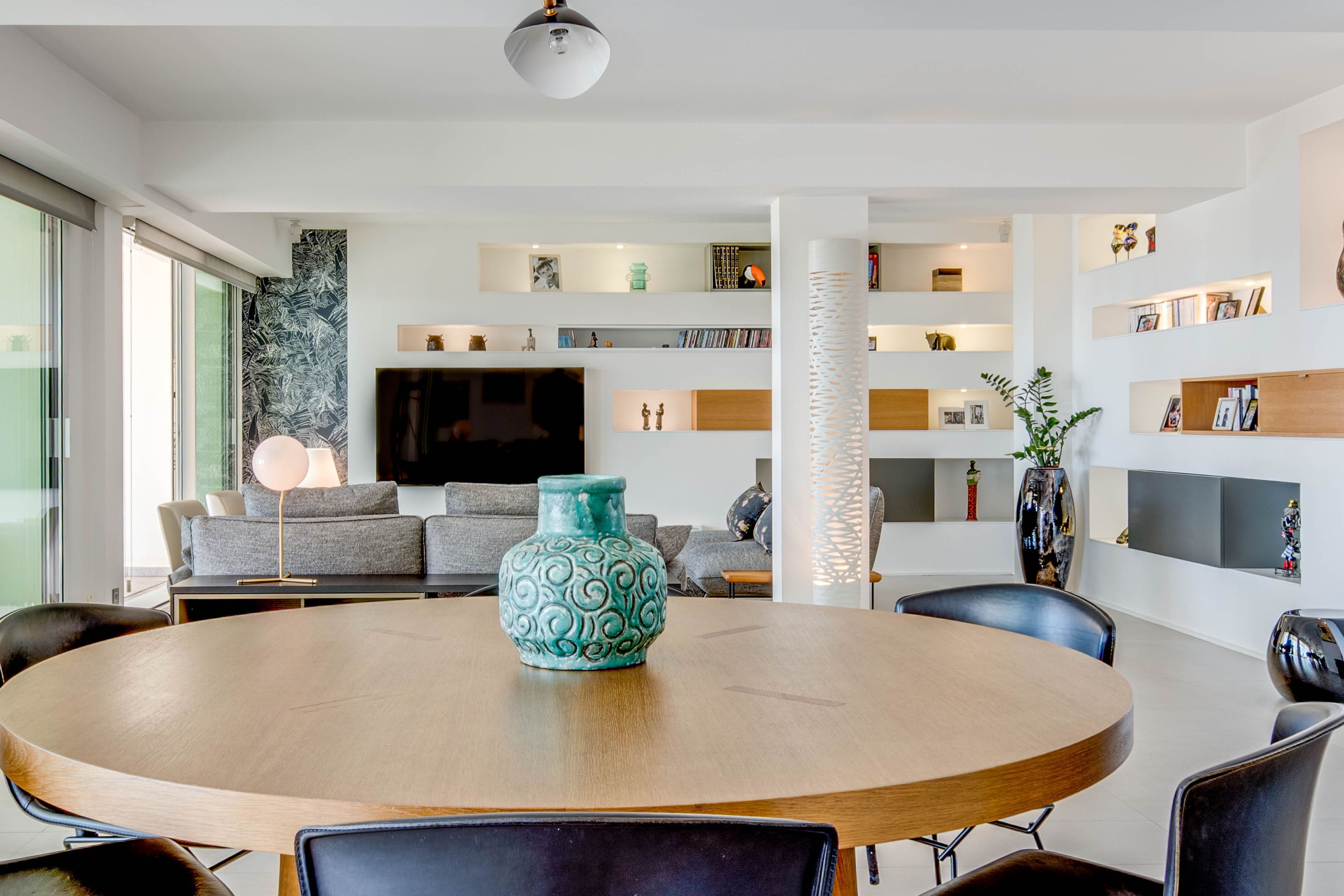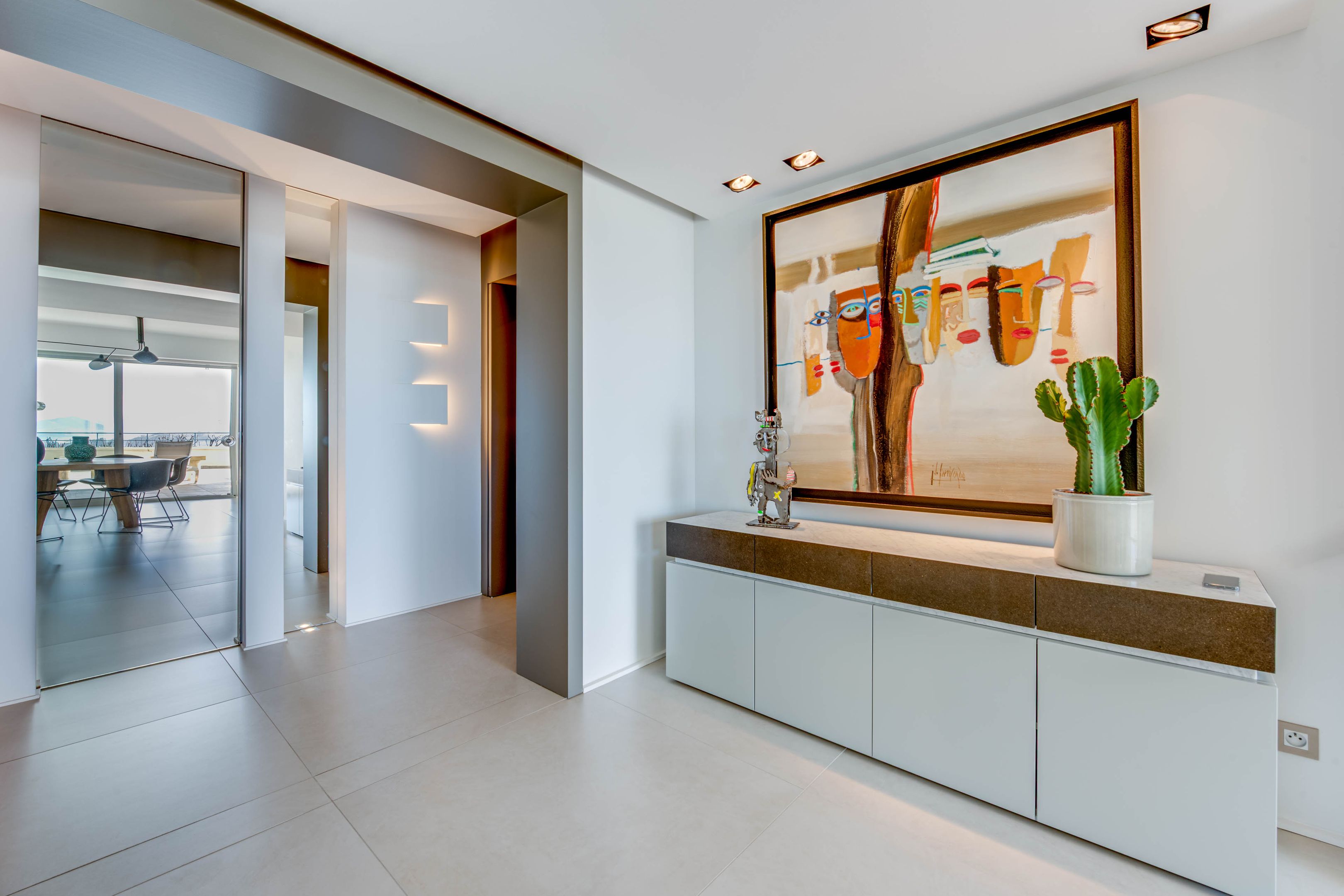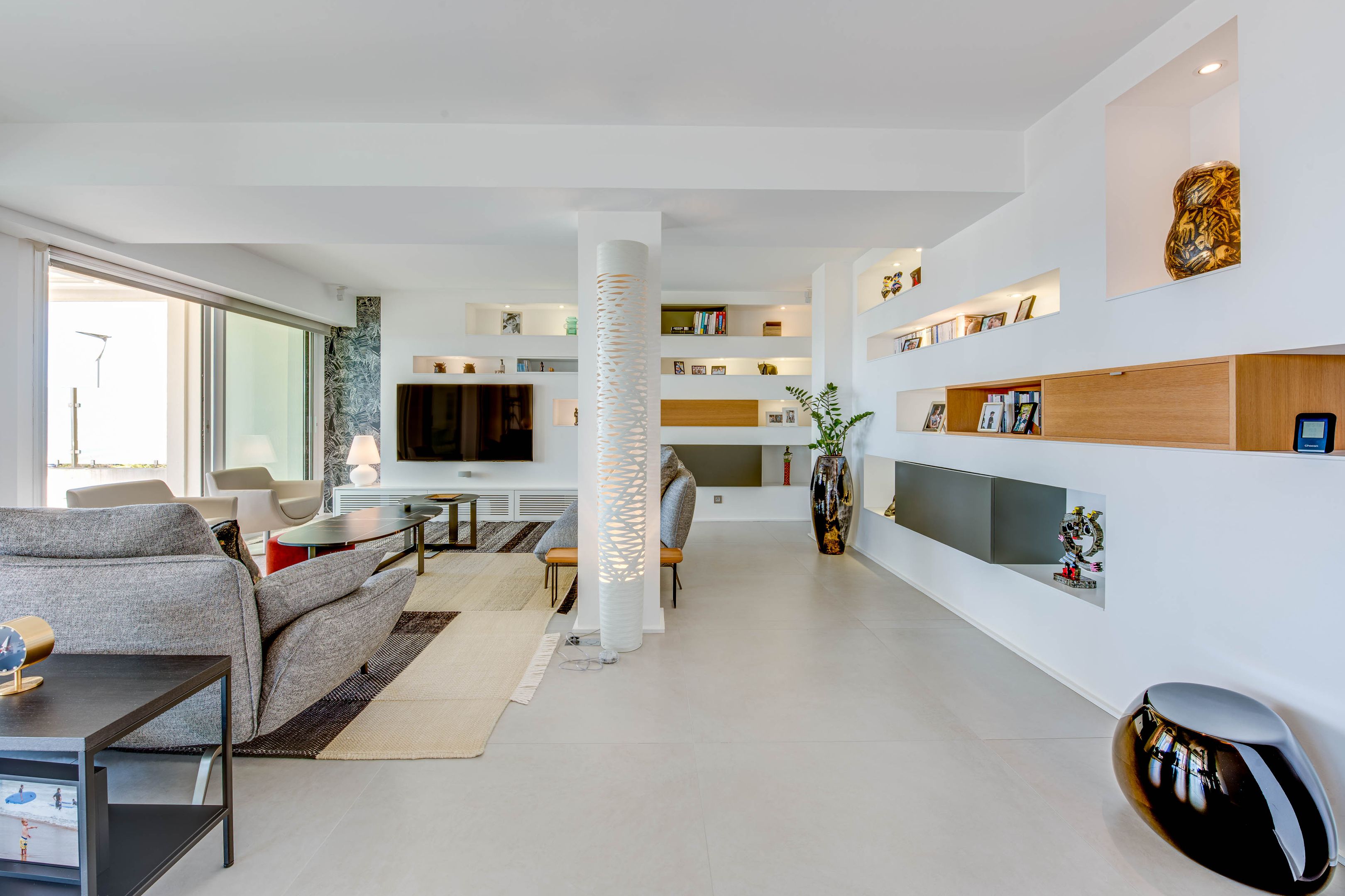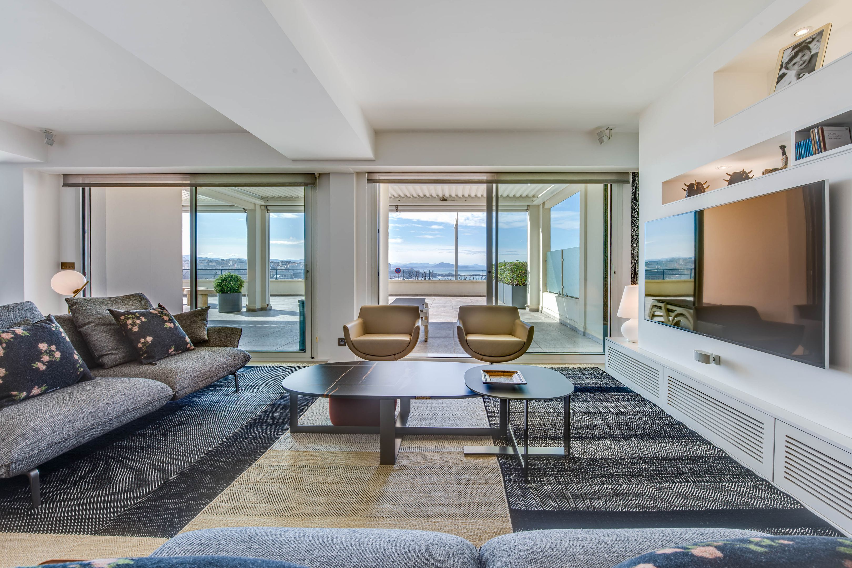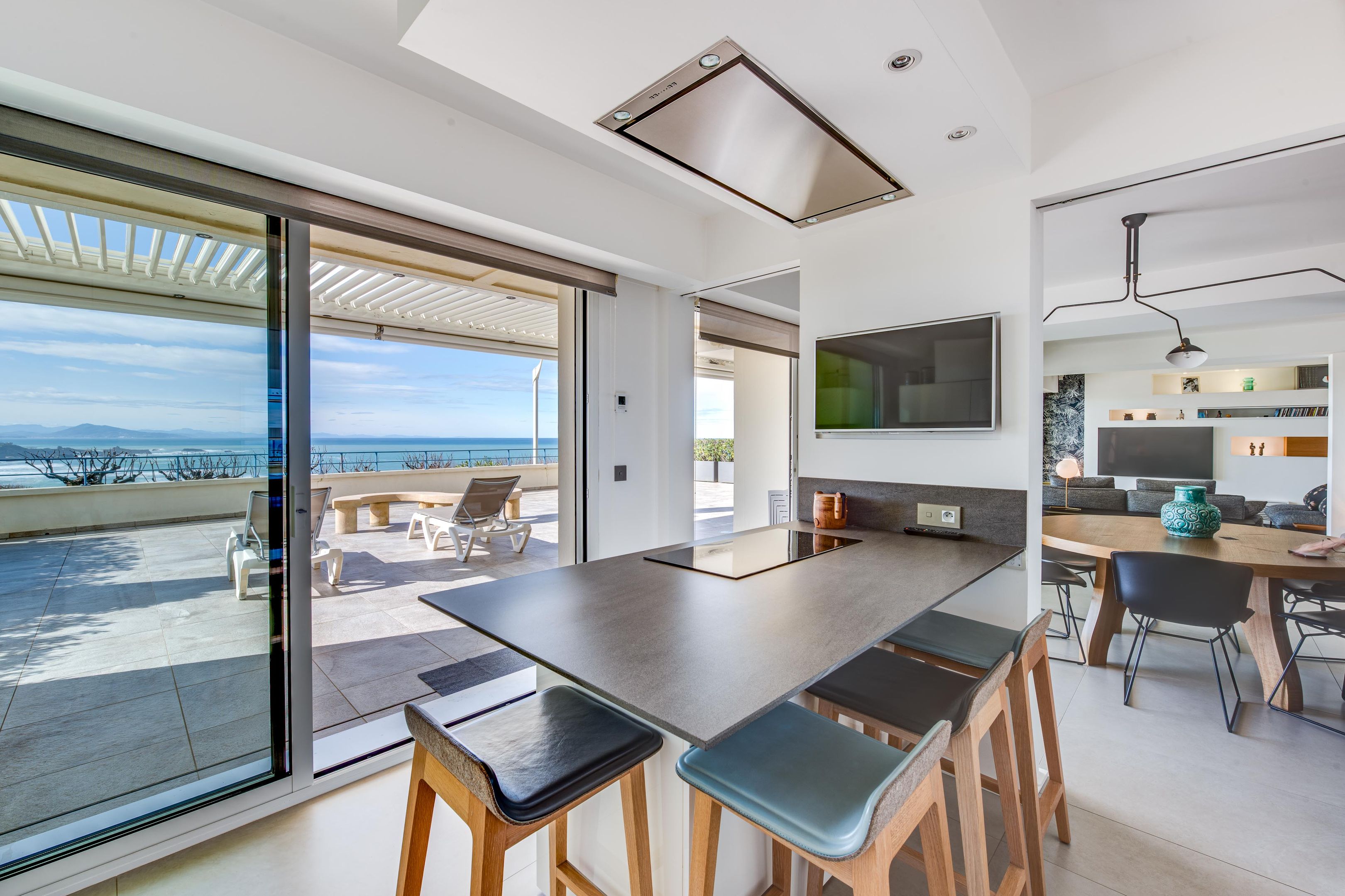 Ideally located at the foot of the Biarritz lighthouse, this magnificent 131 m² apartment, renovated by a renowned architect, offers one of the finest panoramic ocean views. It comprises a spacious entrance hall with dressing room and guest toilet, a double living room, a dining room opening onto a 123 m² west-facing terrace, and a semi-open fitted kitchen.