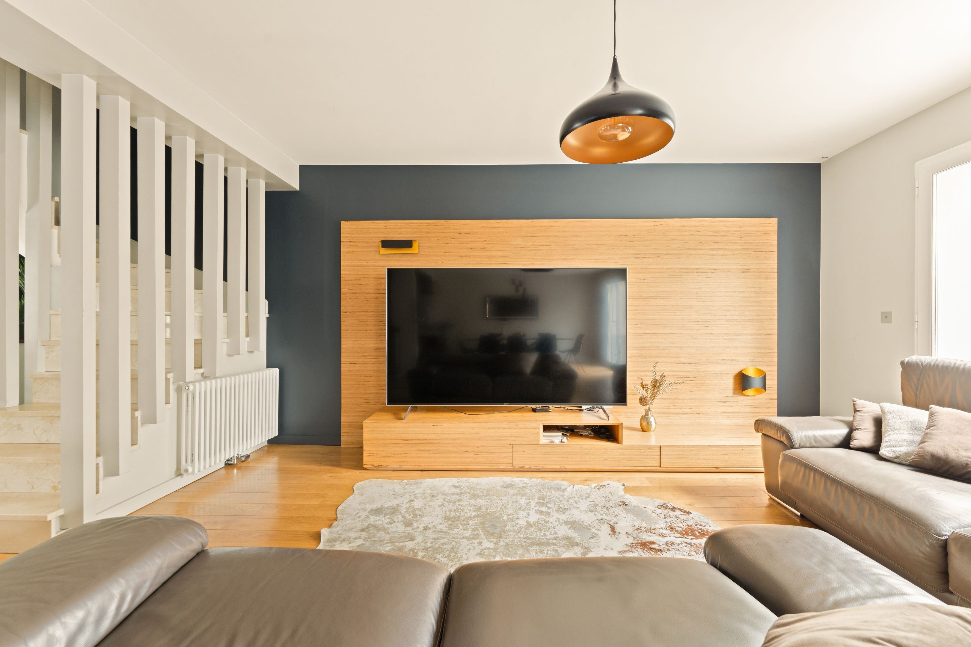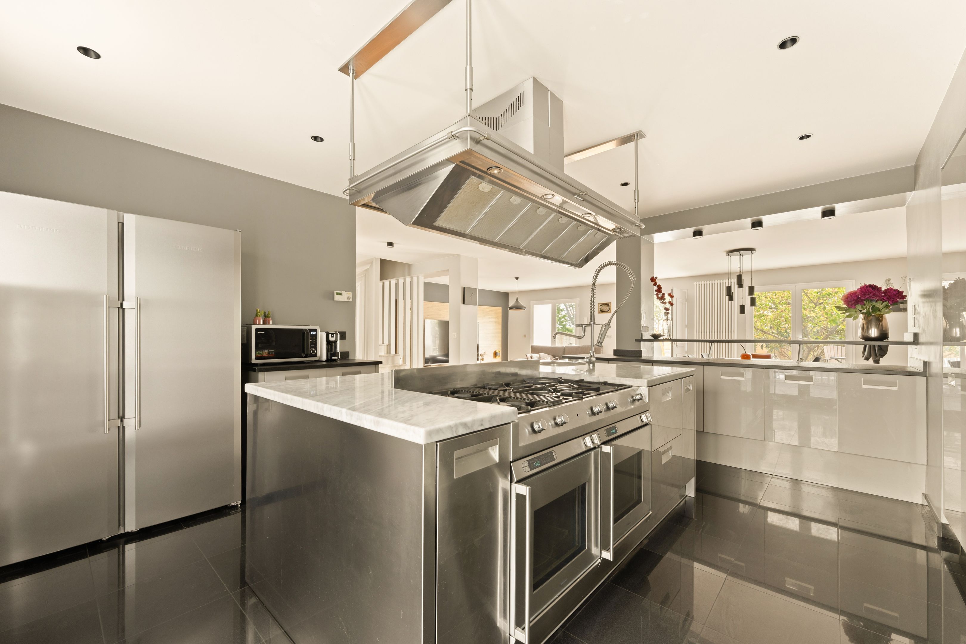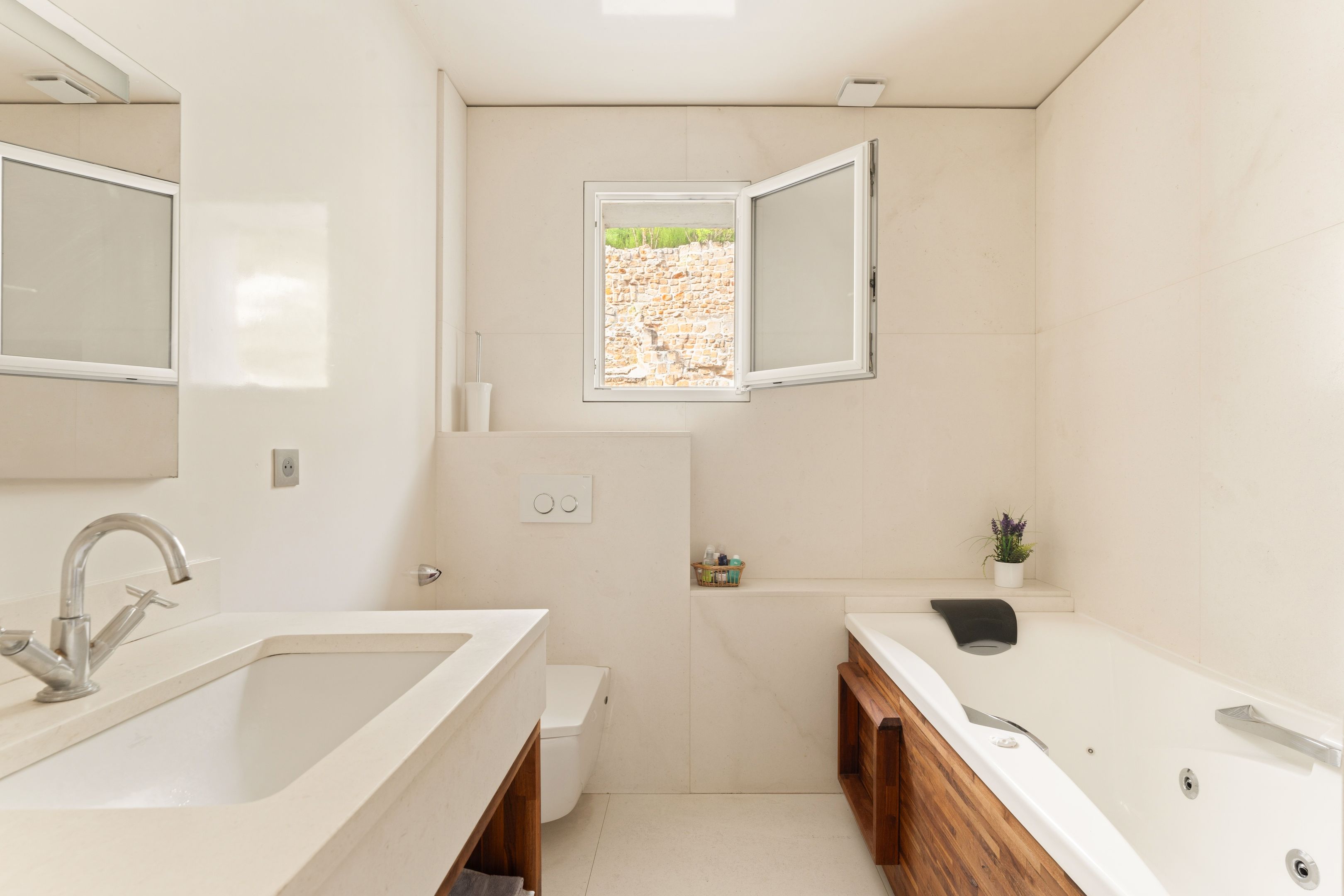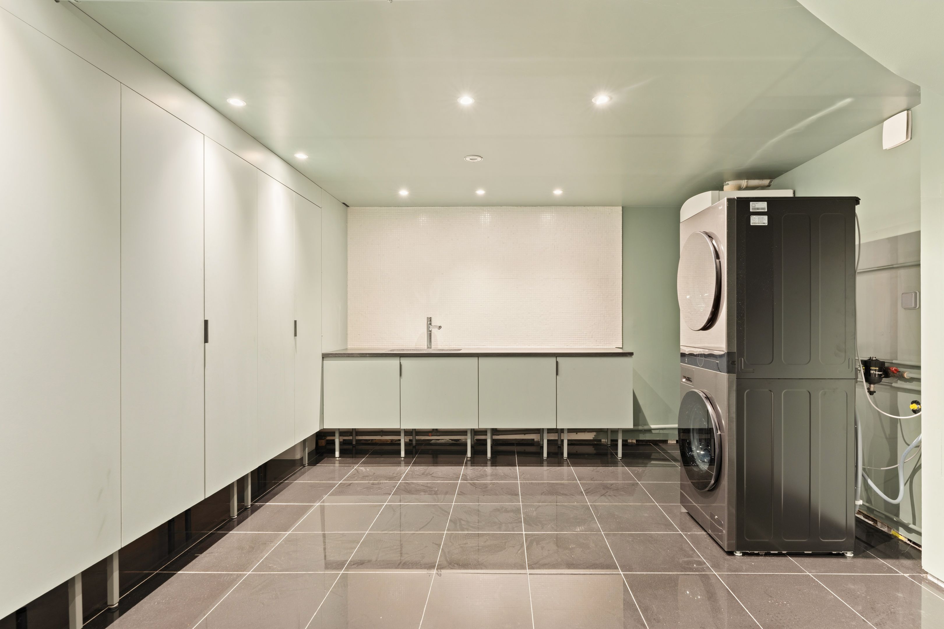 On 1st level: entrance hall, bright double living room, fully-equipped professional-level open kitchen, study with storage space, guest toilet with washbasin.