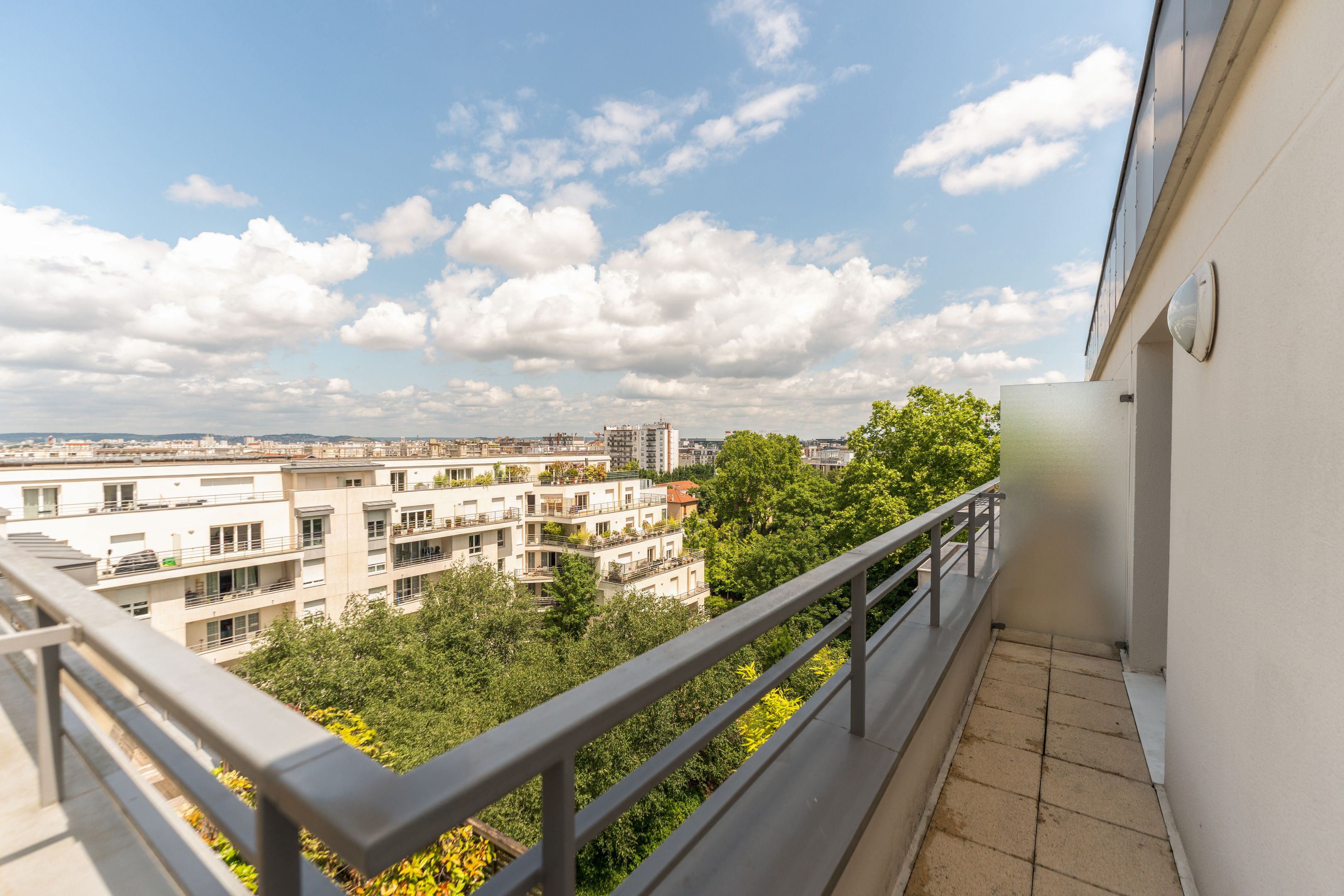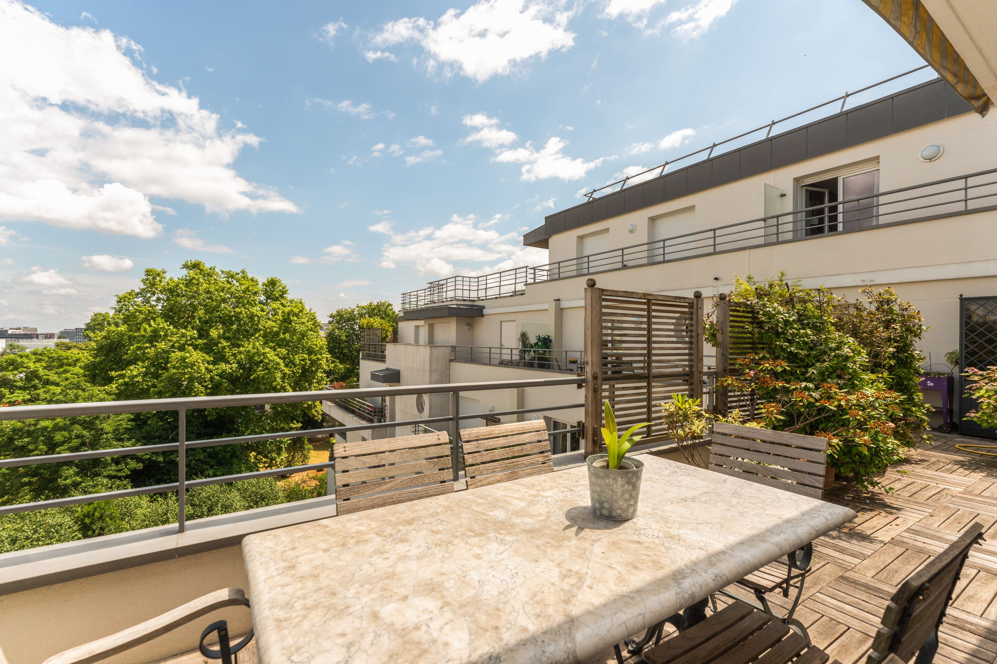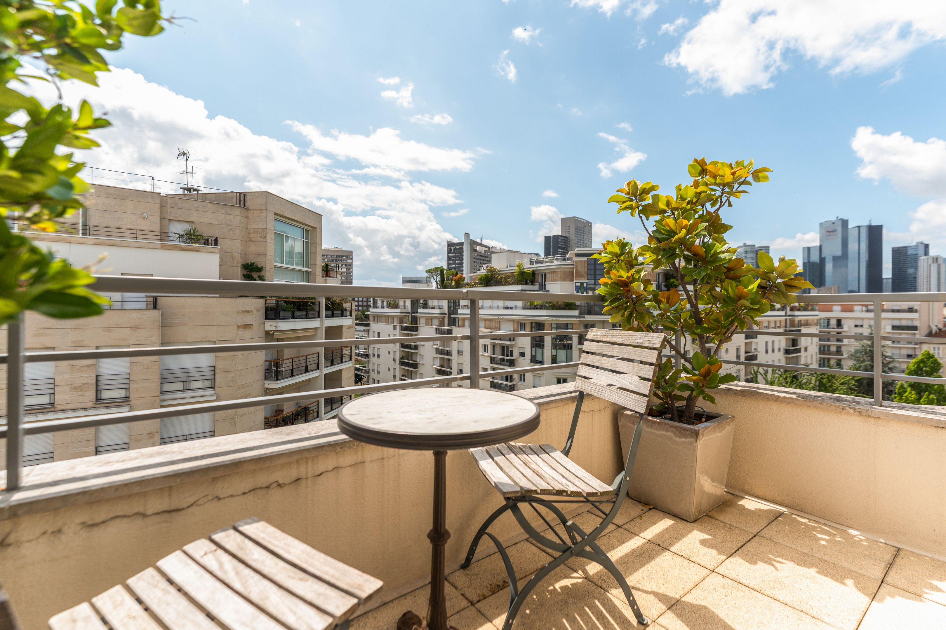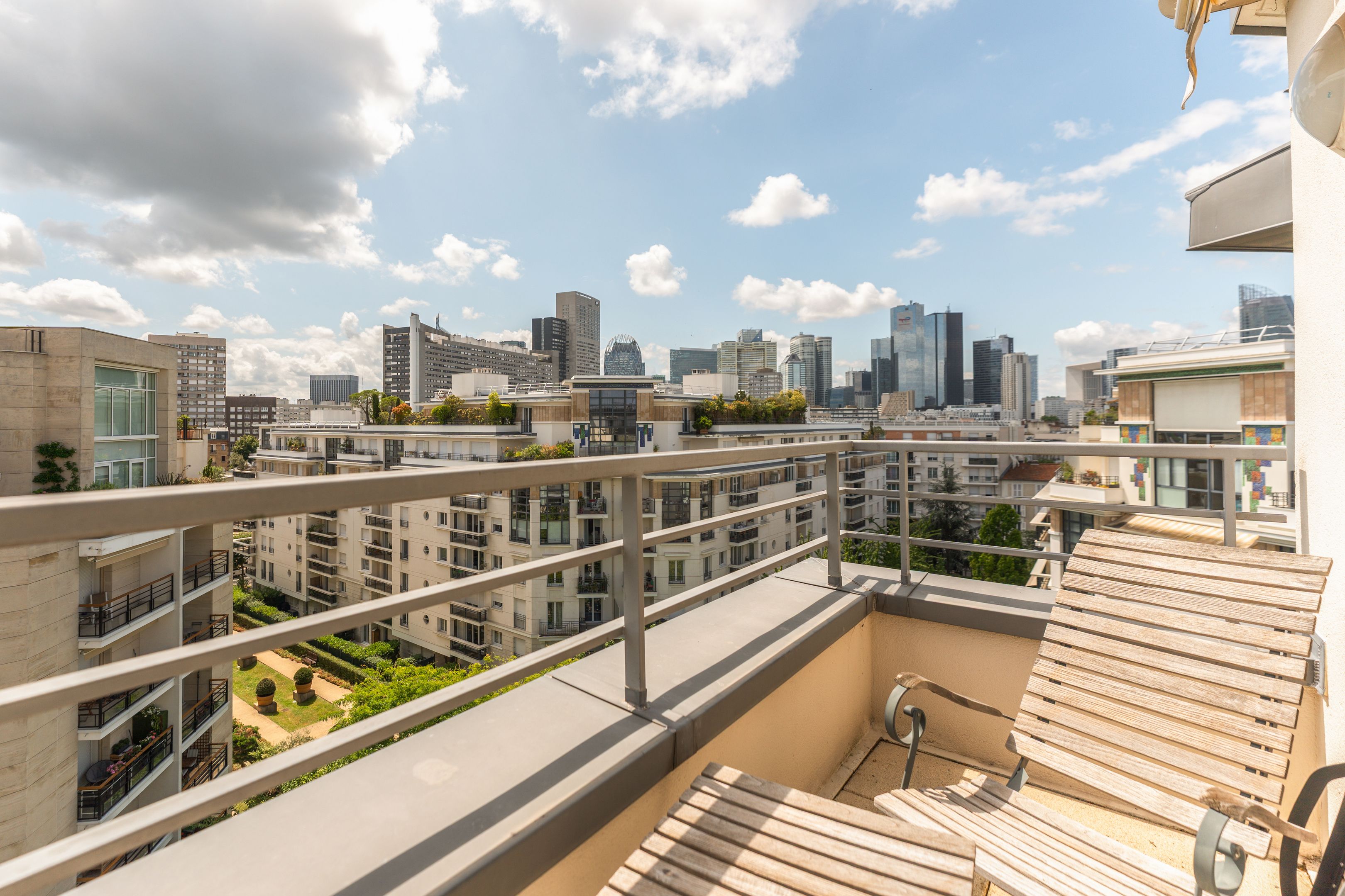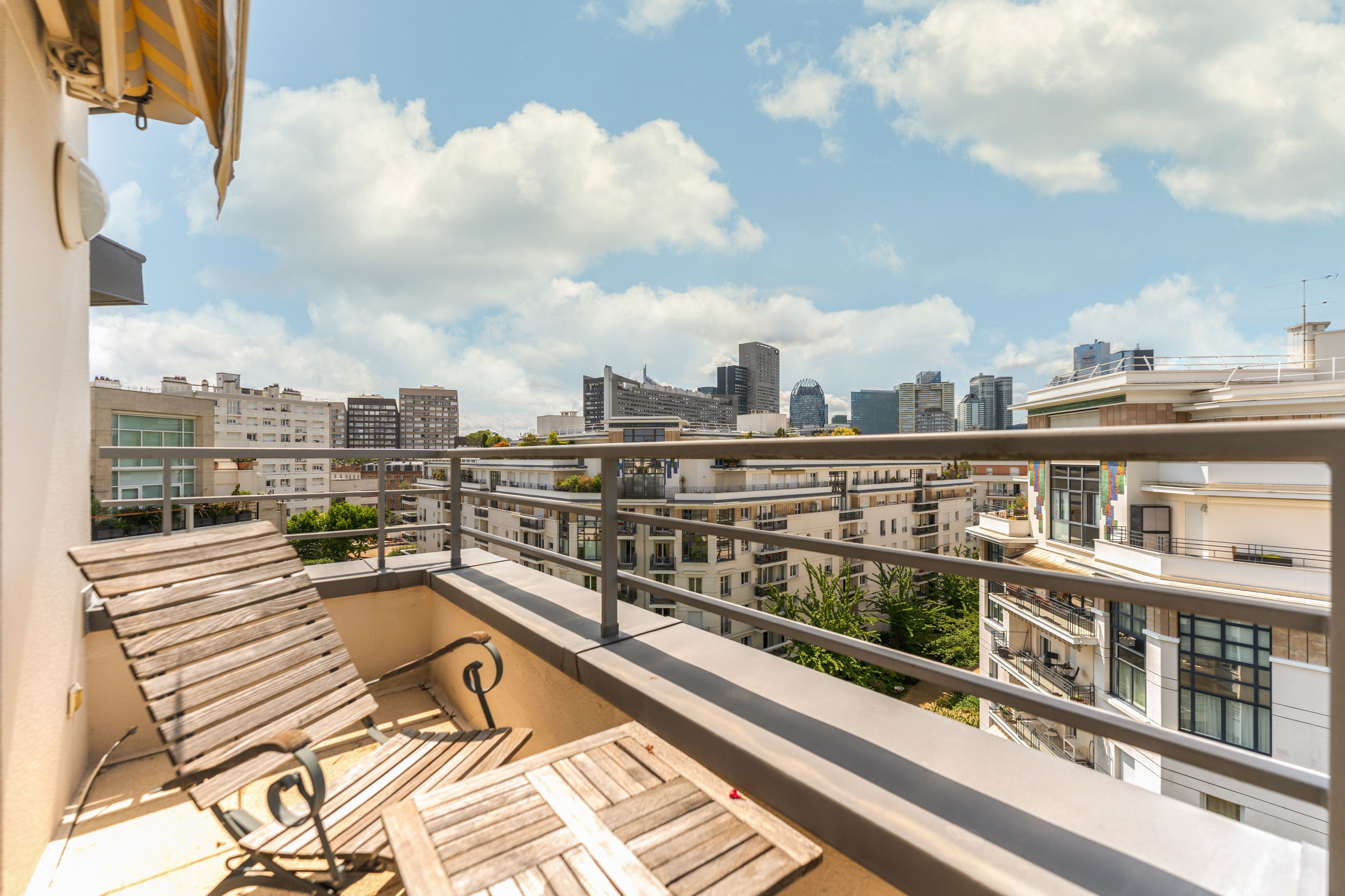 In a luxury building built in the 2000s, surrounded by greenery and with the services of a live-in janitor, renovated through duplex apartment with a surface area of 176 sq.m. located on the top floors (6th and 7th), surrounded by a 62.86 sq.m. terrace with an unobstructed view of La Défense: Entrance hall leading to a vast south-facing double living room with cathedral ceiling and terrace, bathed in light and with unobstructed views, fully fitted kitchen/dining room, master suite with bathroom and dressing room, separate toilet and plenty of storage space. First floor: 3 bedrooms, all with balcony, bathroom and shower room.