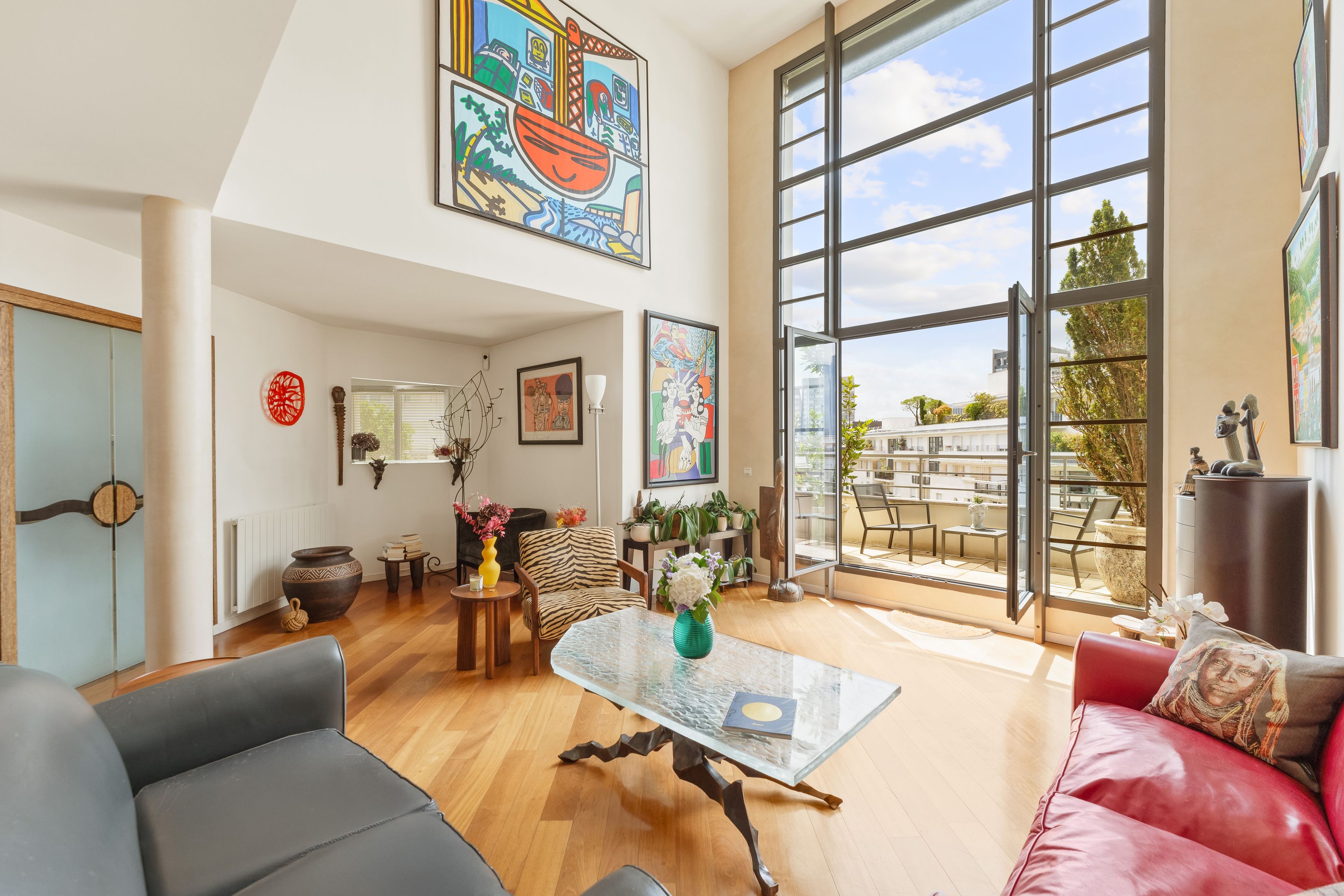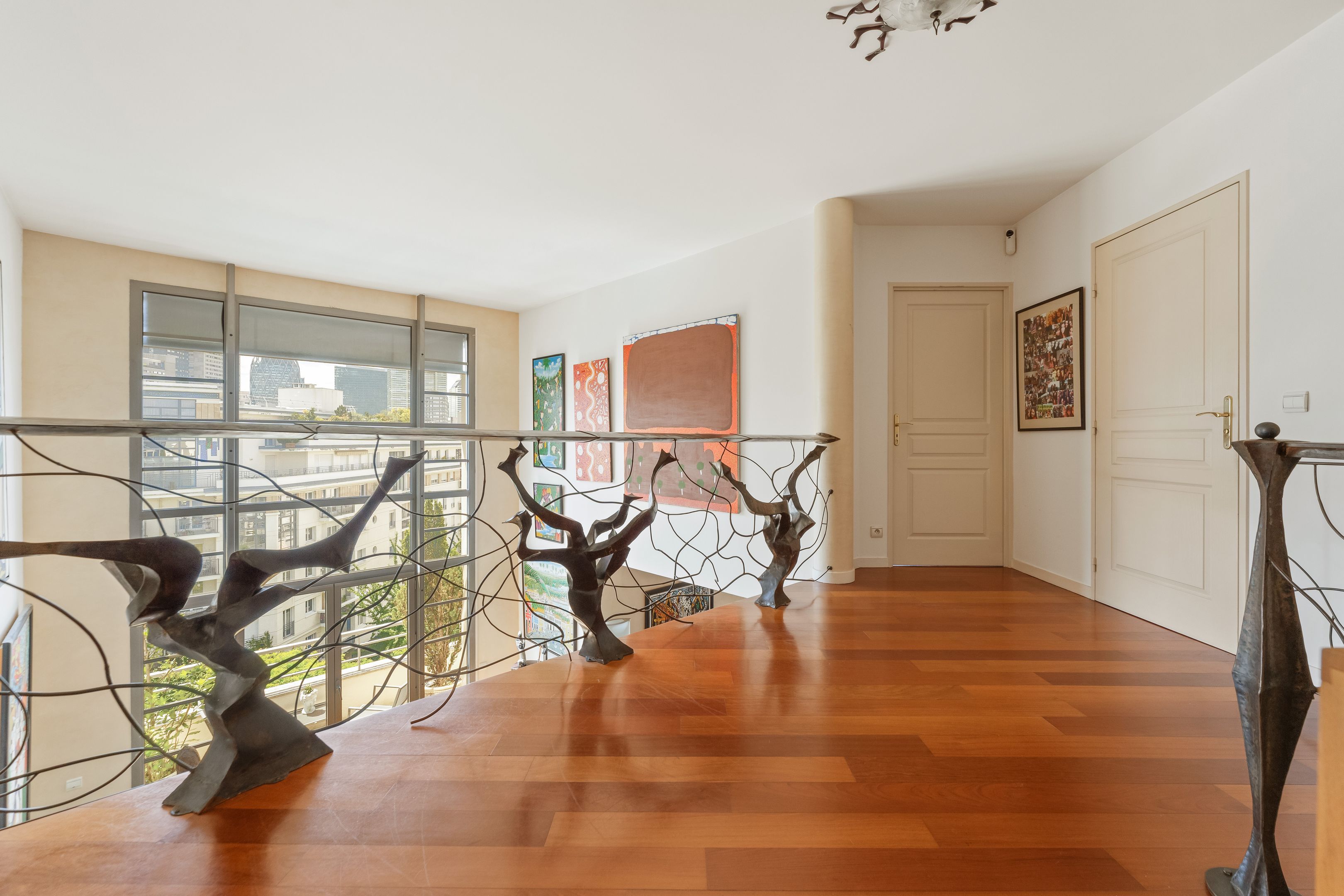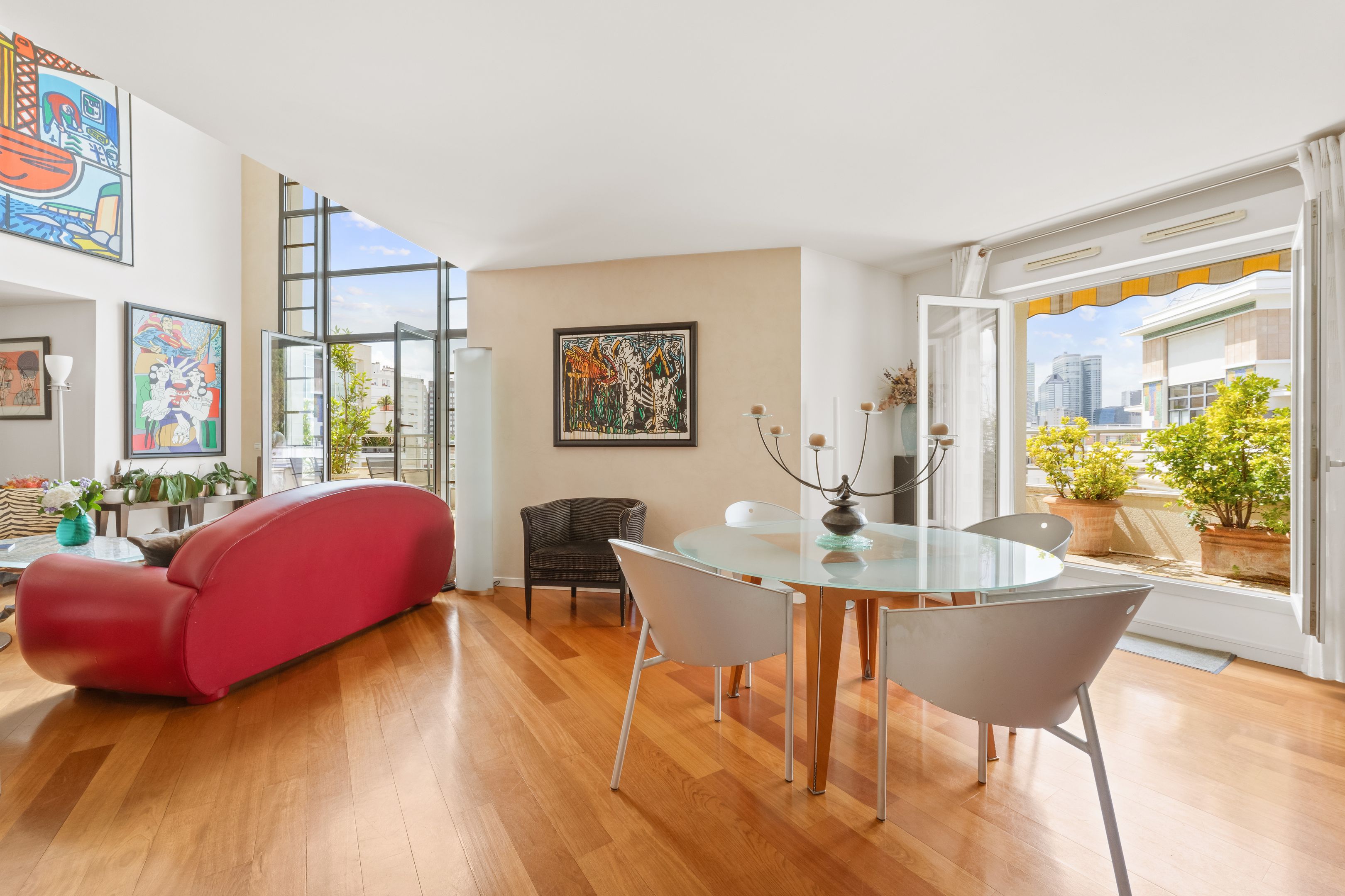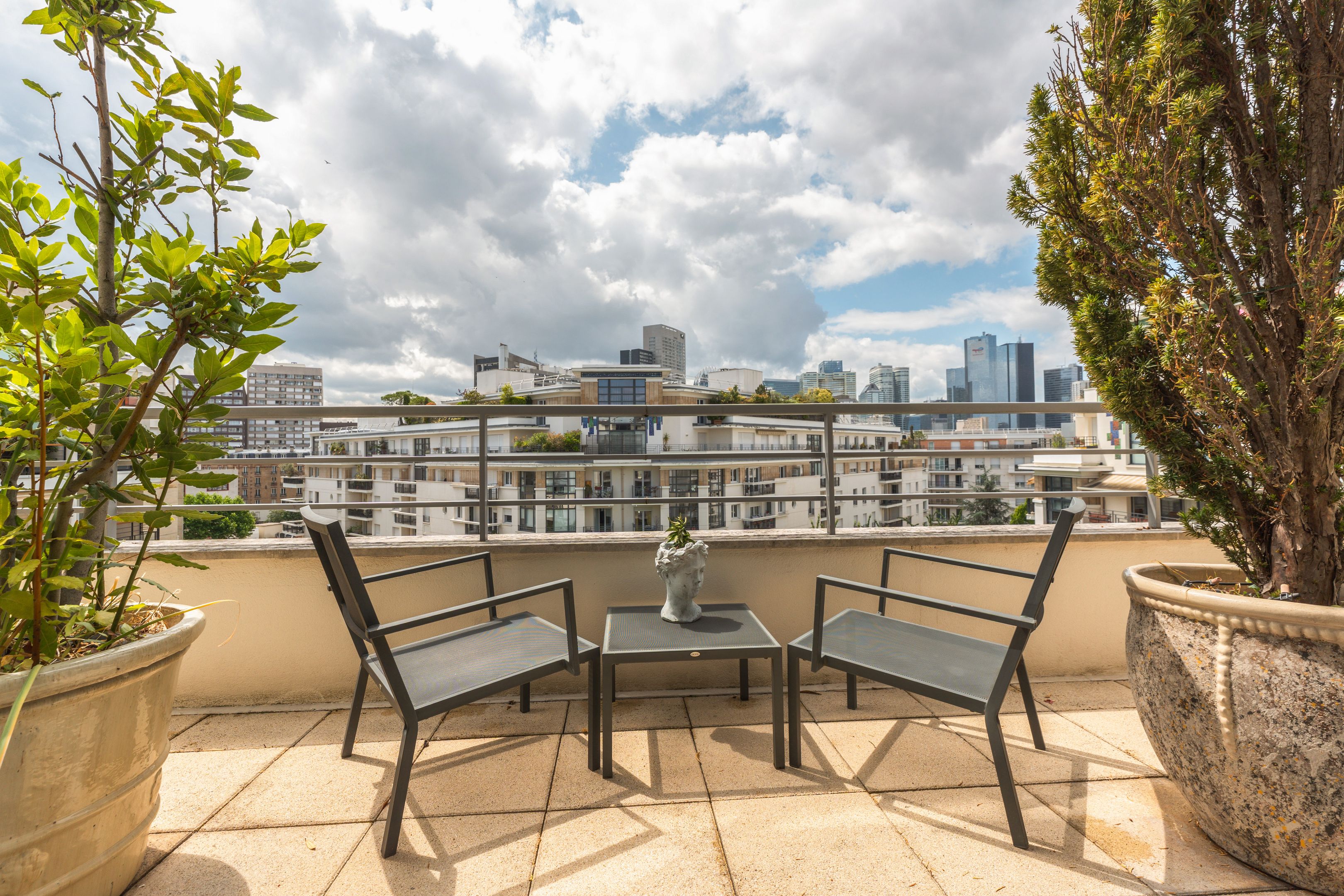 In a luxury building built in the 2000s, surrounded by greenery and with the services of a live-in janitor, renovated through duplex apartment with a surface area of 176 sq.m. located on the top floors (6th and 7th), surrounded by a 62.86 sq.m. terrace with an unobstructed view of La Défense: Entrance hall leading to a vast south-facing double living room with cathedral ceiling and terrace, bathed in light and with unobstructed views, fully fitted kitchen/dining room, master suite with bathroom and dressing room, separate toilet and plenty of storage space. First floor: 3 bedrooms, all with balcony, bathroom and shower room.