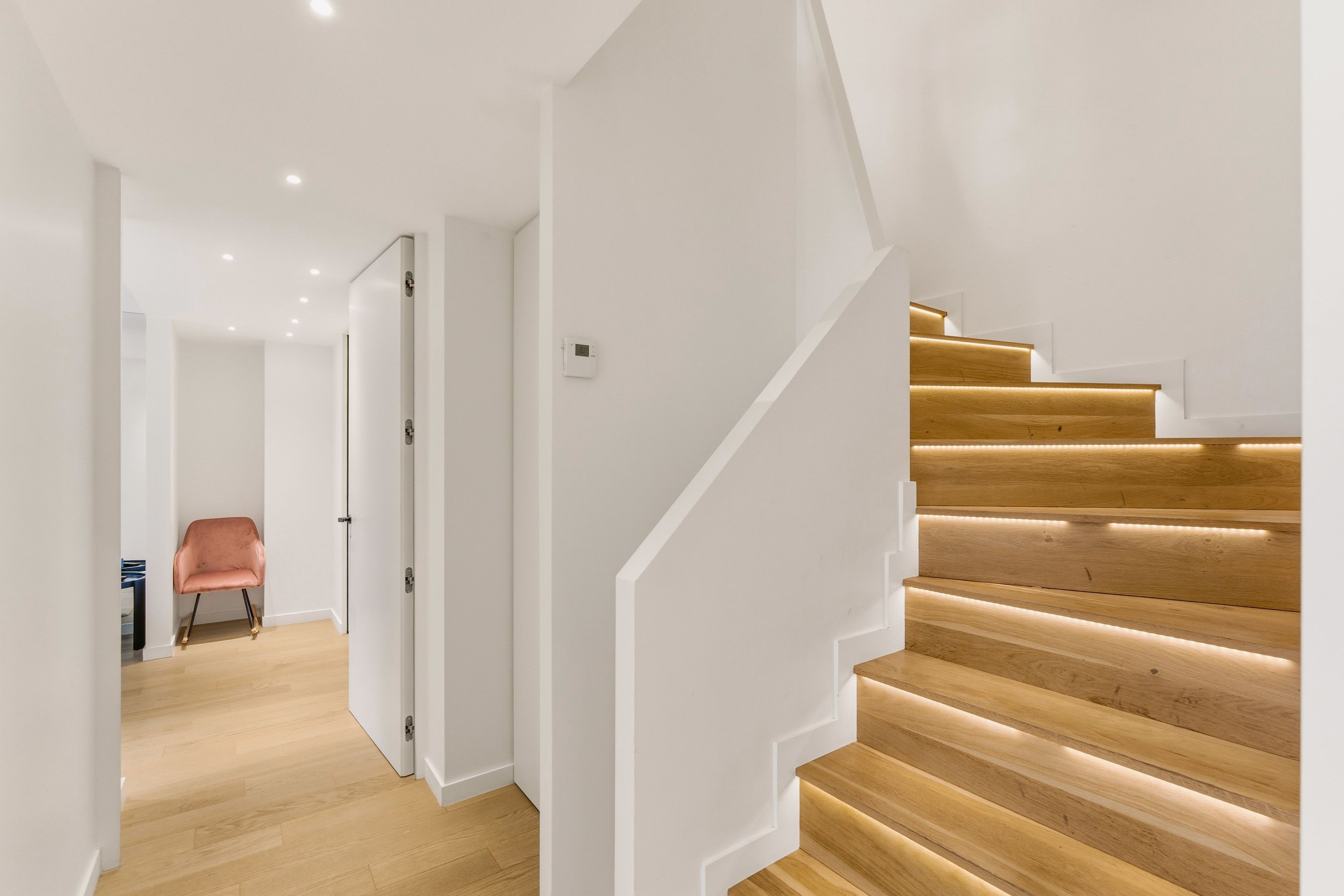 The lower floor houses the night space, with a master suite with dressing room, shower room and private toilet, three additional bedrooms with storage space and access to the balcony, a walk-in shower room, separate toilet and laundry room.