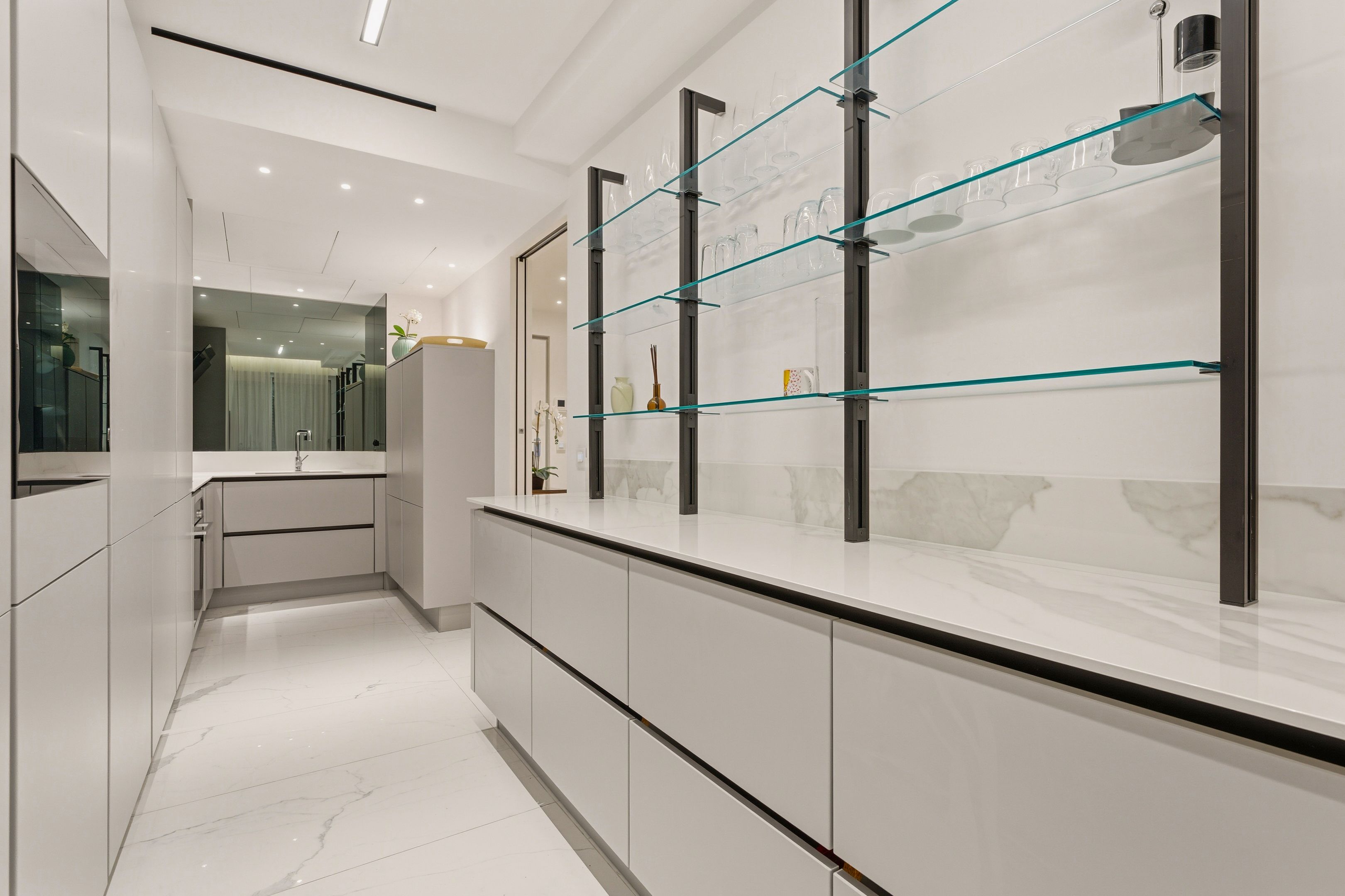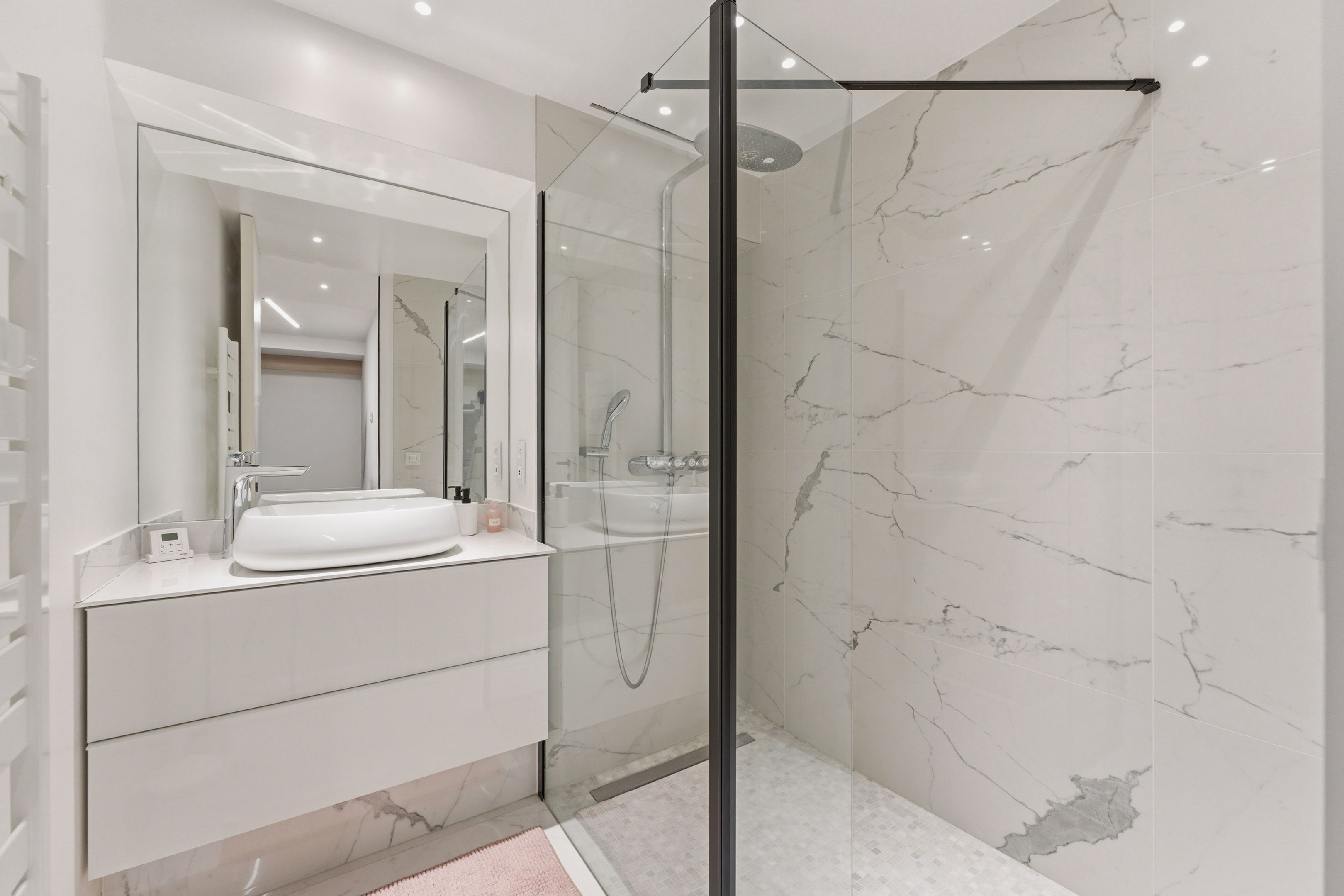 The apartment opens onto an entrance hall with checkroom and guest toilet, a fully-equipped independent kitchen, and a vast living-dining room bathed in light and extended by a large balcony. A TV lounge and office space complete this level, ideal for daily comfort or telecommuting.