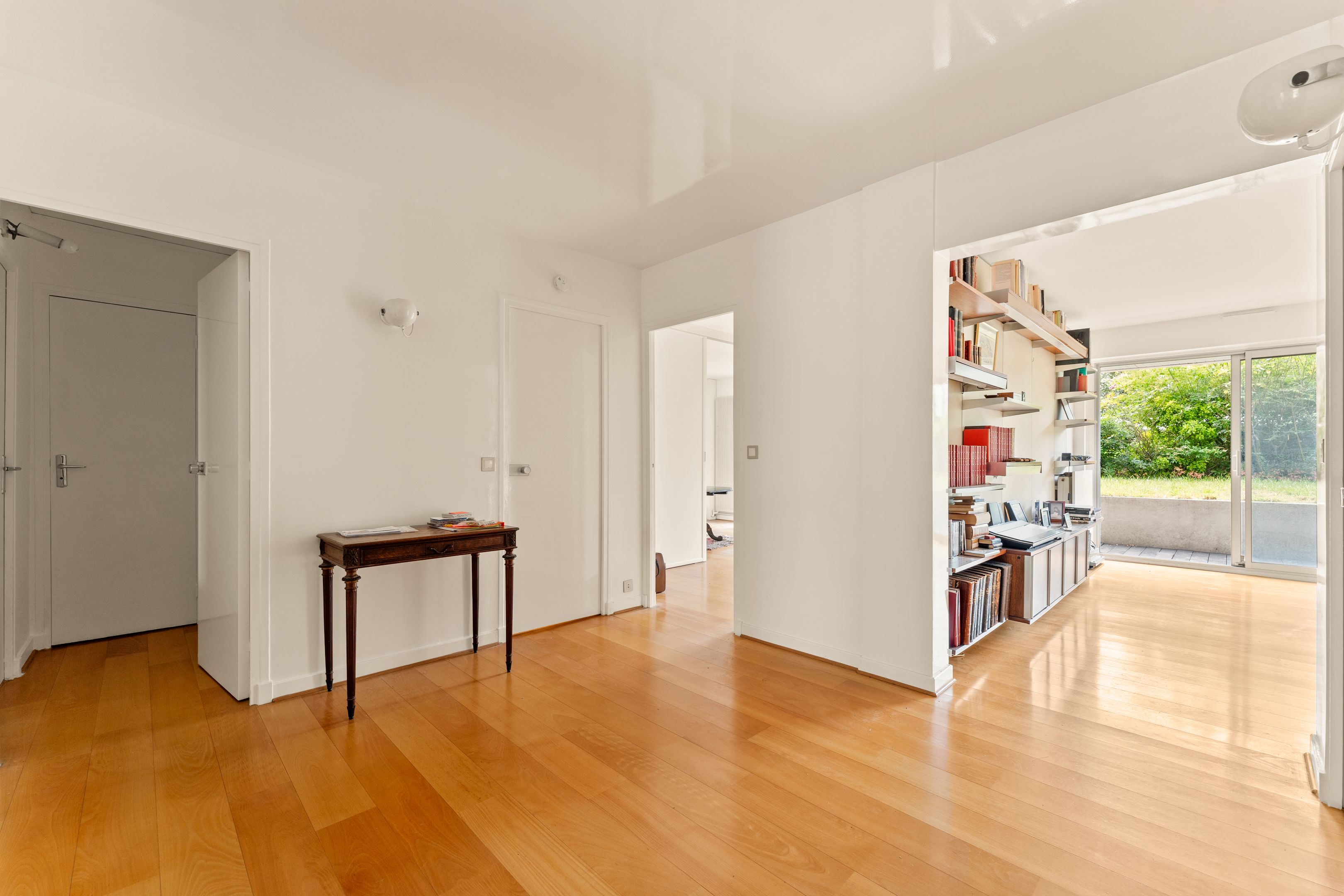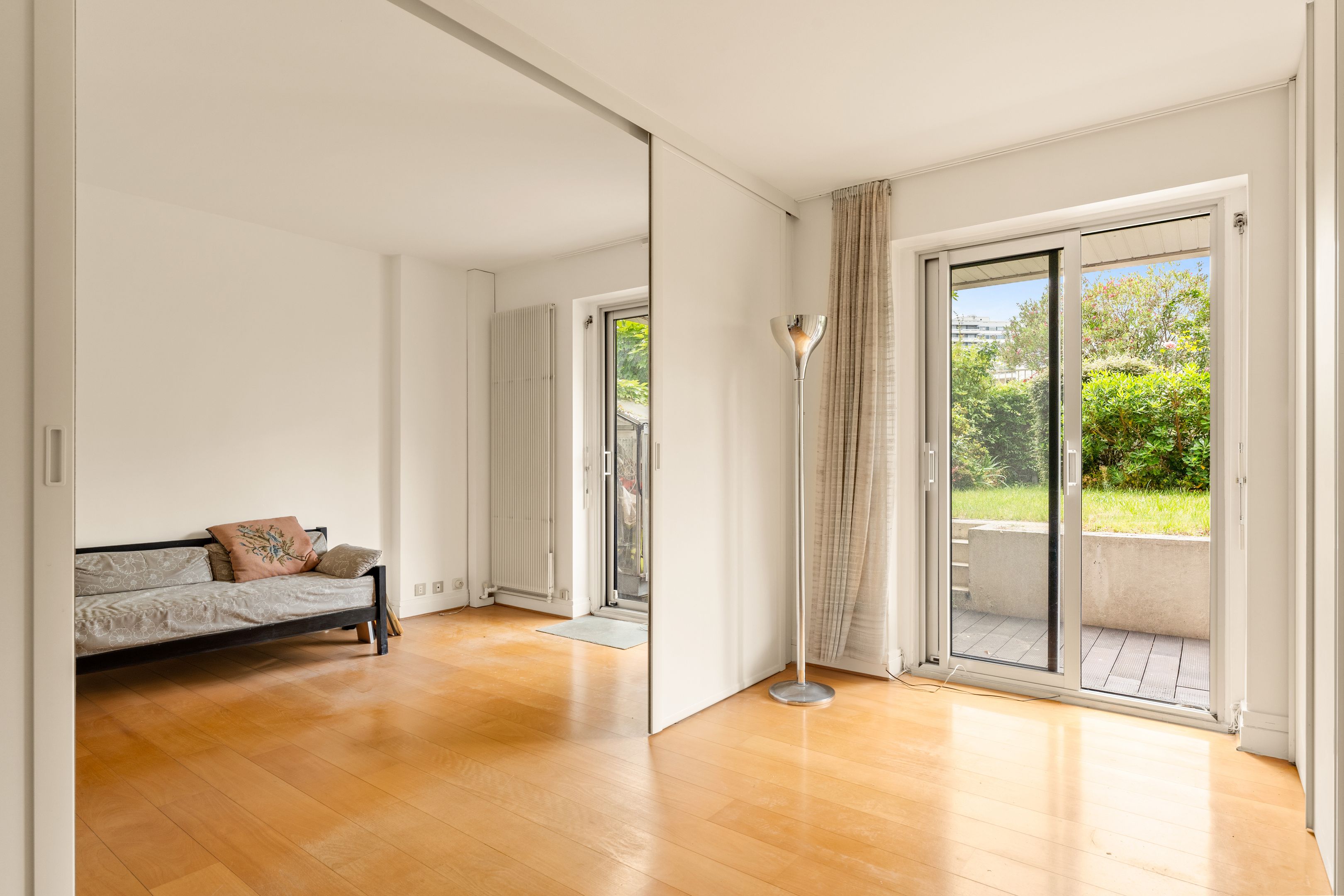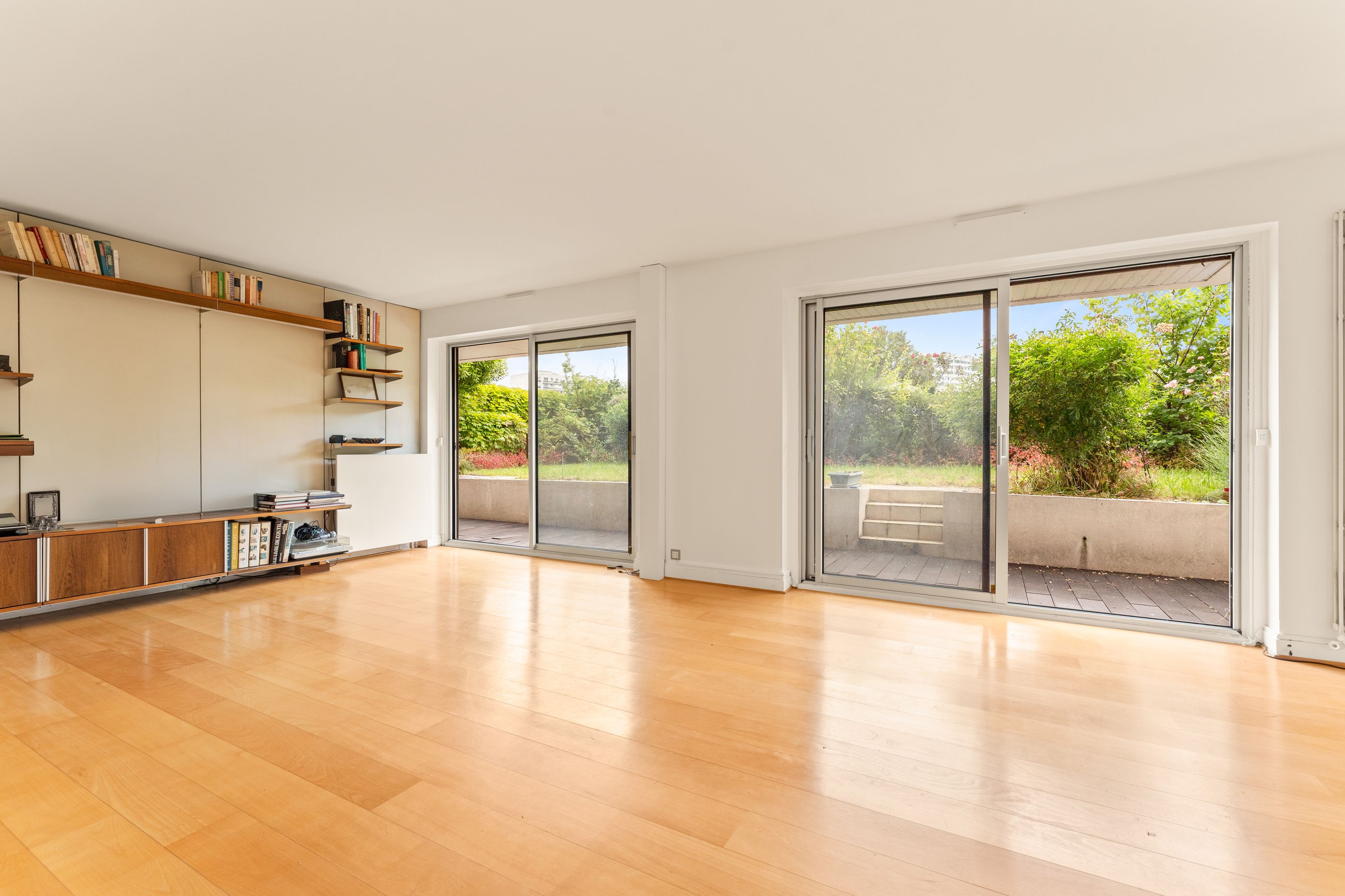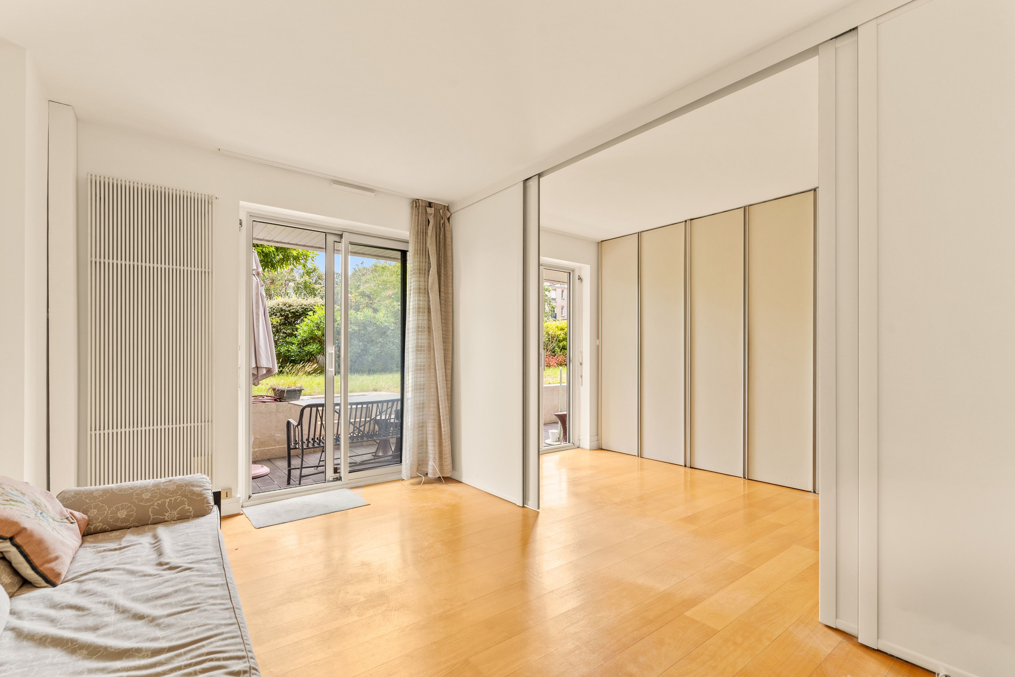 Well-maintained, recently-built family apartment on 1st floor with elevator access to 118m² private garden and 2 terraces of 24m² and 26m². Entrance hall, sizeable living room, 2 bedrooms and former kitchen (convertible into laundry room) opening onto the terrace and garden, kitchen/dining room and 3rd bedroom opening onto the 24m2 terrace on the street side, bathroom, shower room with toilet, separate toilet, plenty of storage space, 2 cellars. Possibility of acquiring 2 parking spaces in the building.