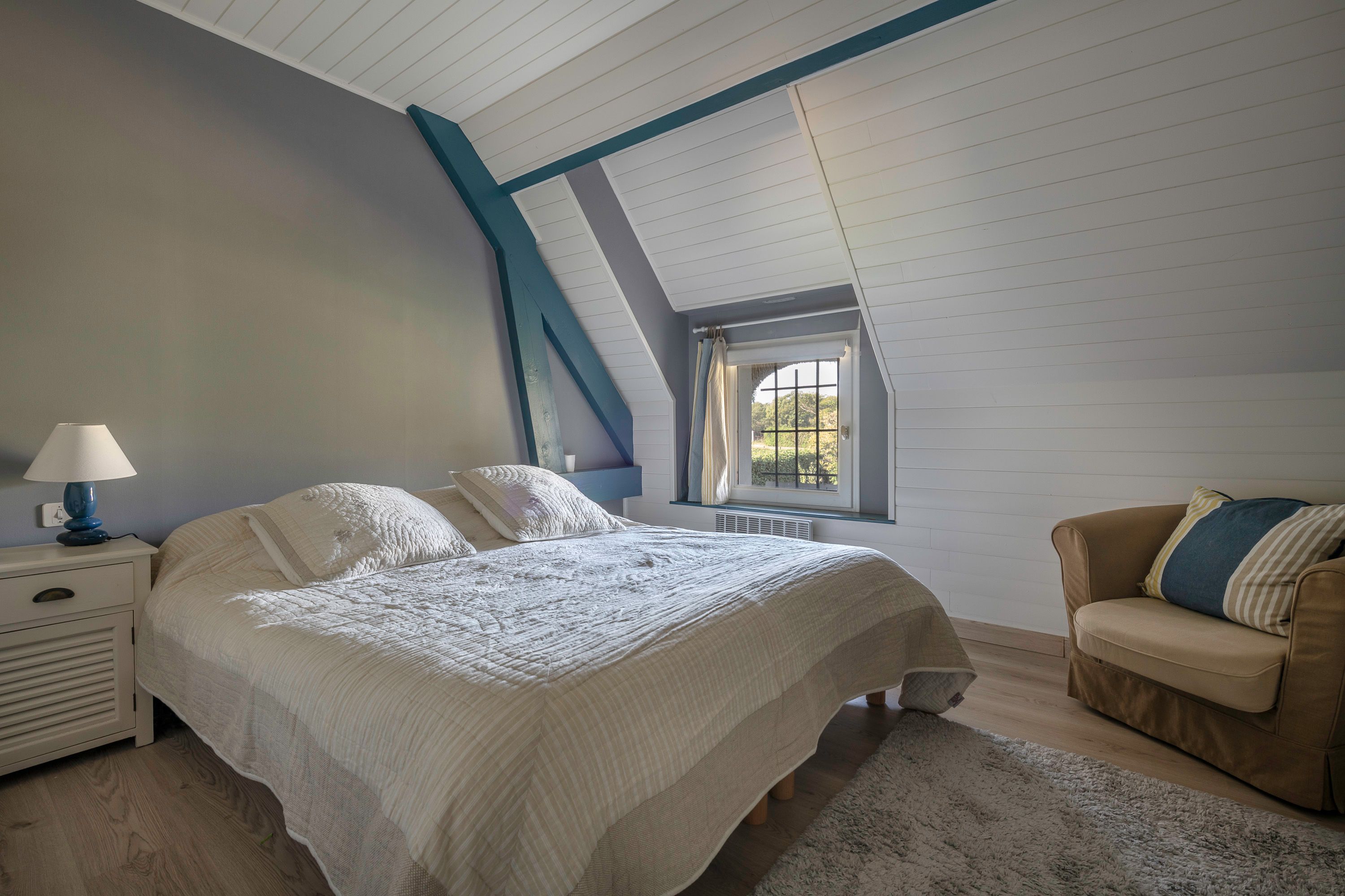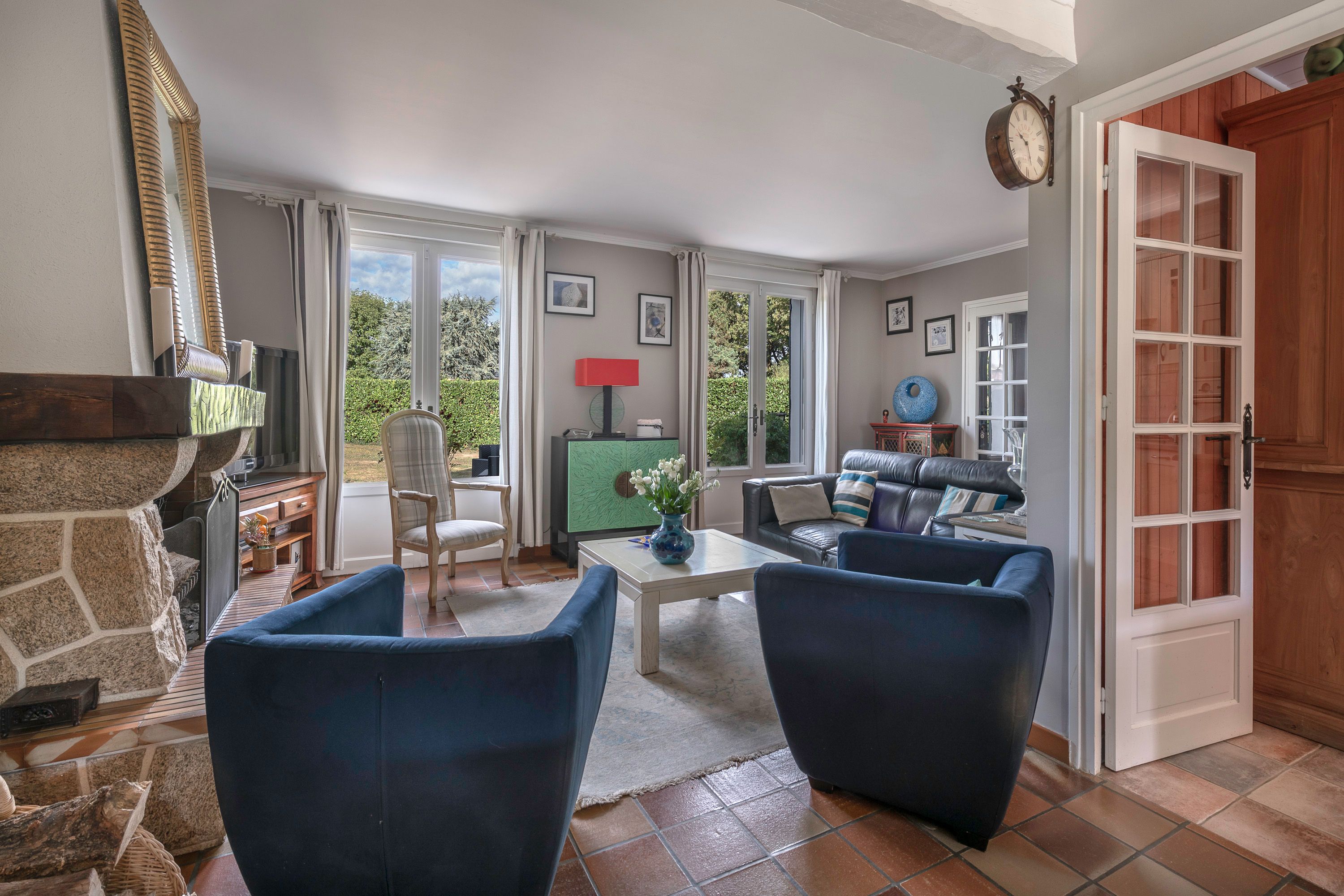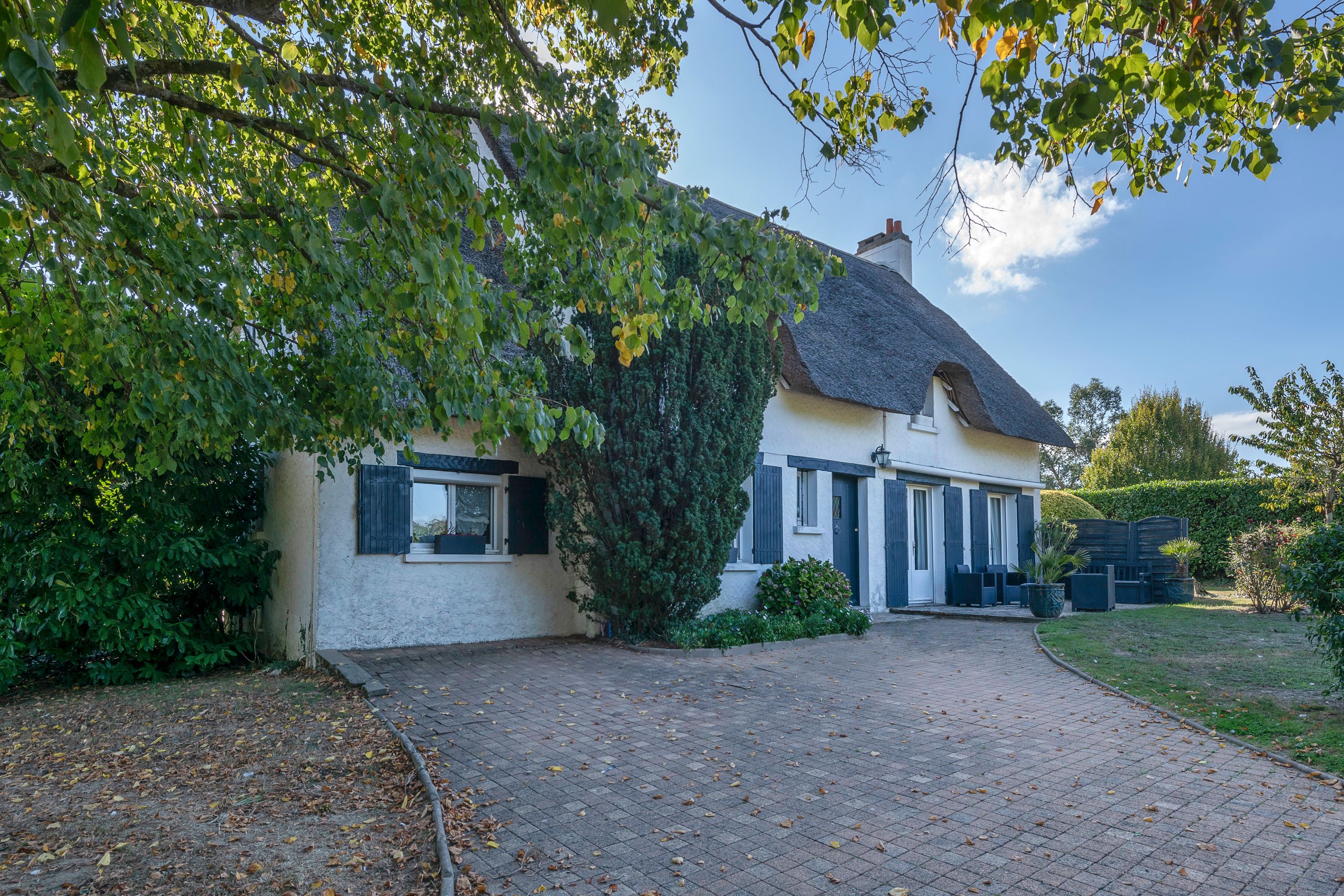 Situated 10 minutes from La Baule (near La Madeleine), charming thatched cottage of approx. 175m², in a peaceful setting, not overlooked, built on a wooded plot of approx. 1,300 m² with heated 9x4m swimming pool. Entrance hall, lovely bright living room (fireplace) opening onto a large west-facing covered terrace, independent fitted and equipped kitchen, master bedroom with en-suite bathroom (plus shower) and toilet, second bedroom (fitted closets), bathroom, separate toilet, laundry room. First floor: large mezzanine (office), 3 bedrooms, one with private shower room, dressing room, shower room and toilet. Small outbuilding adjoining the house.