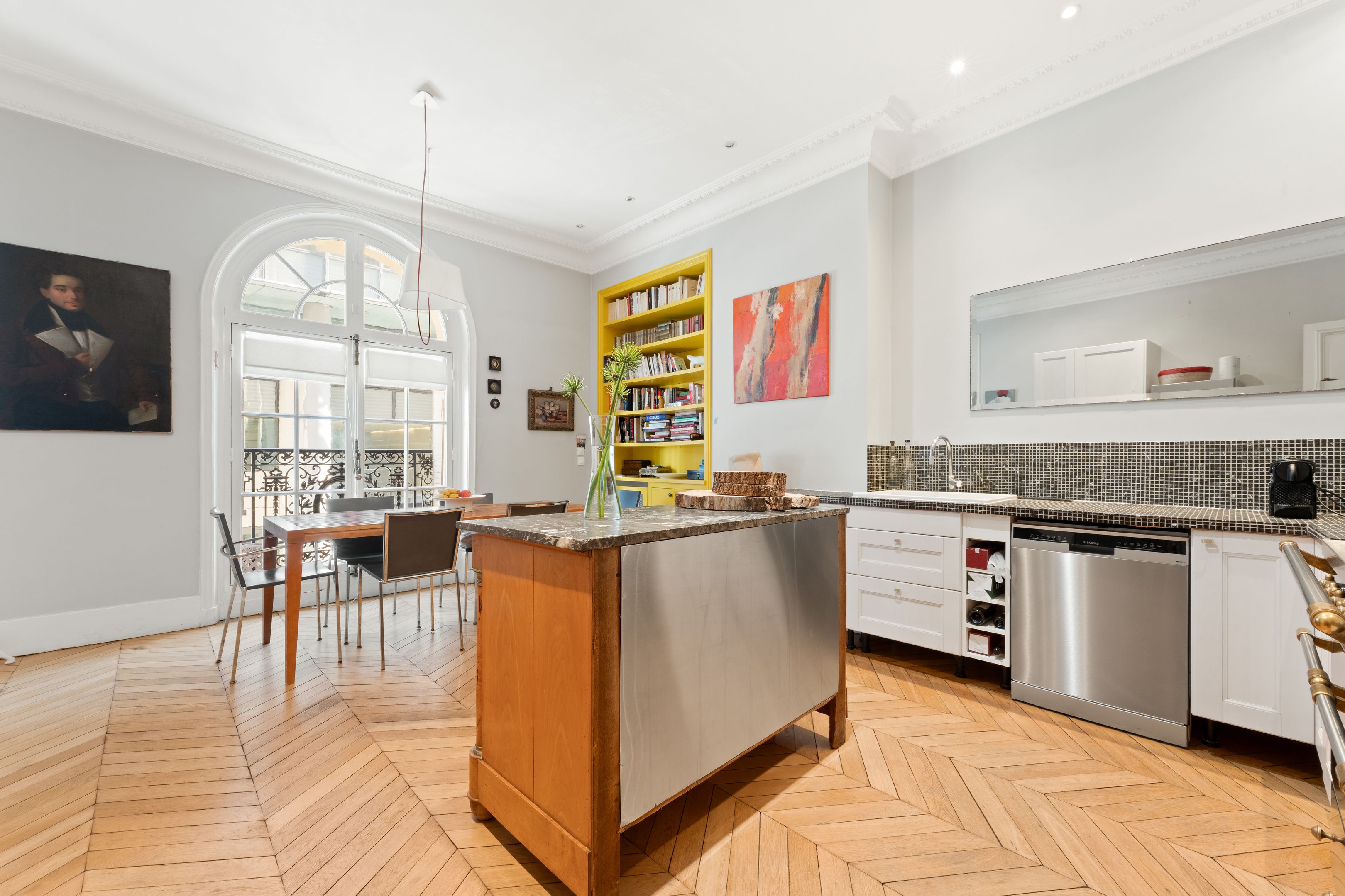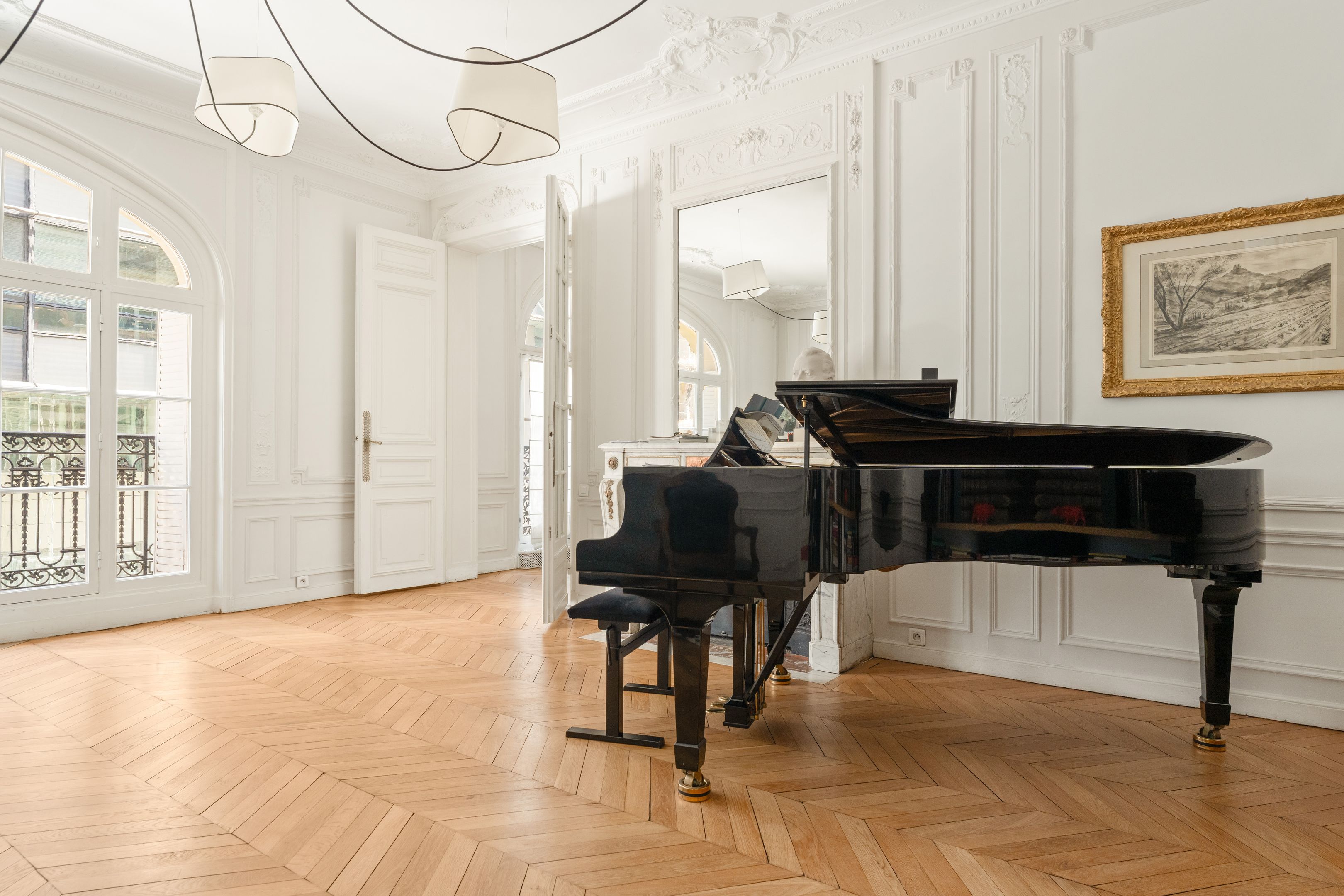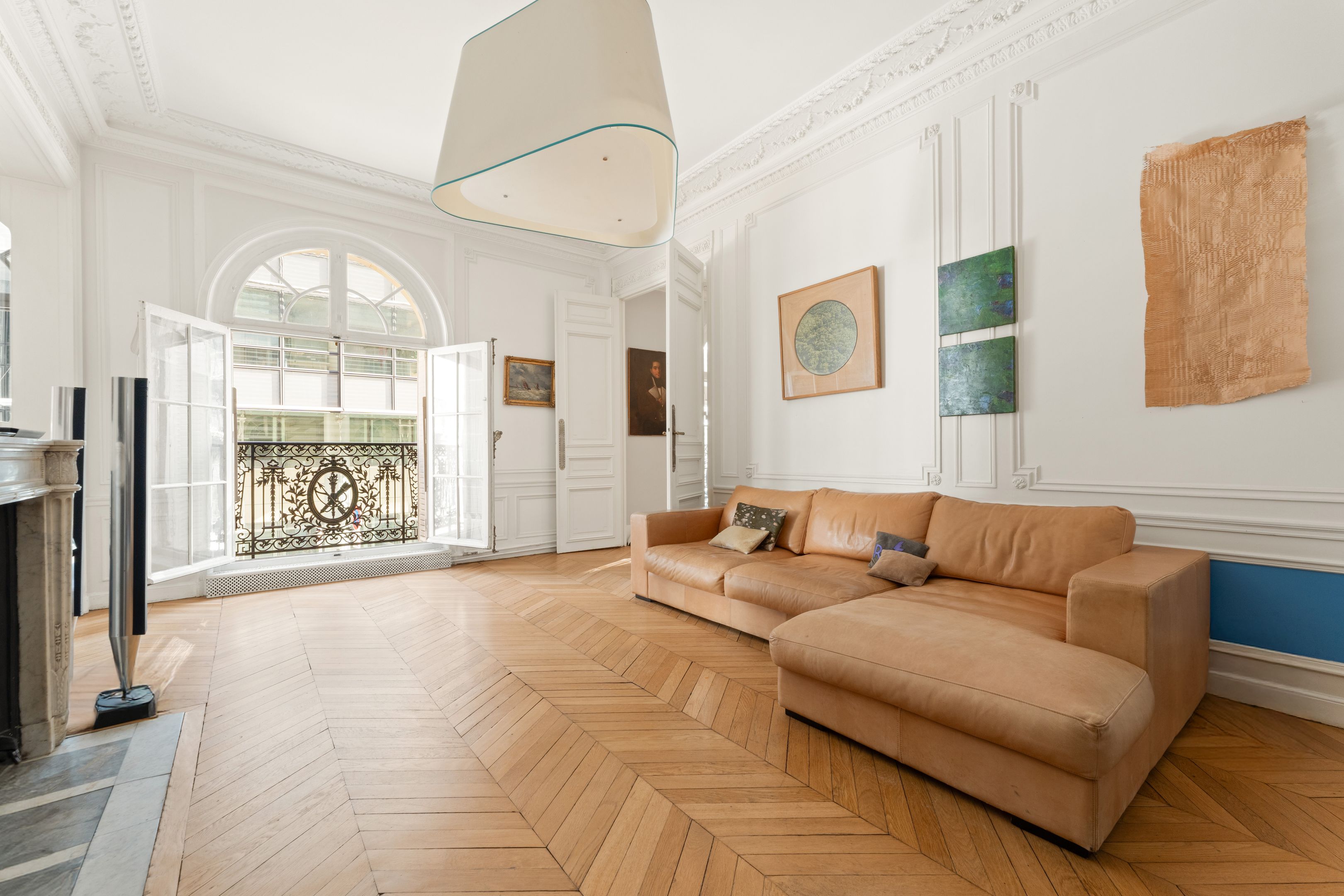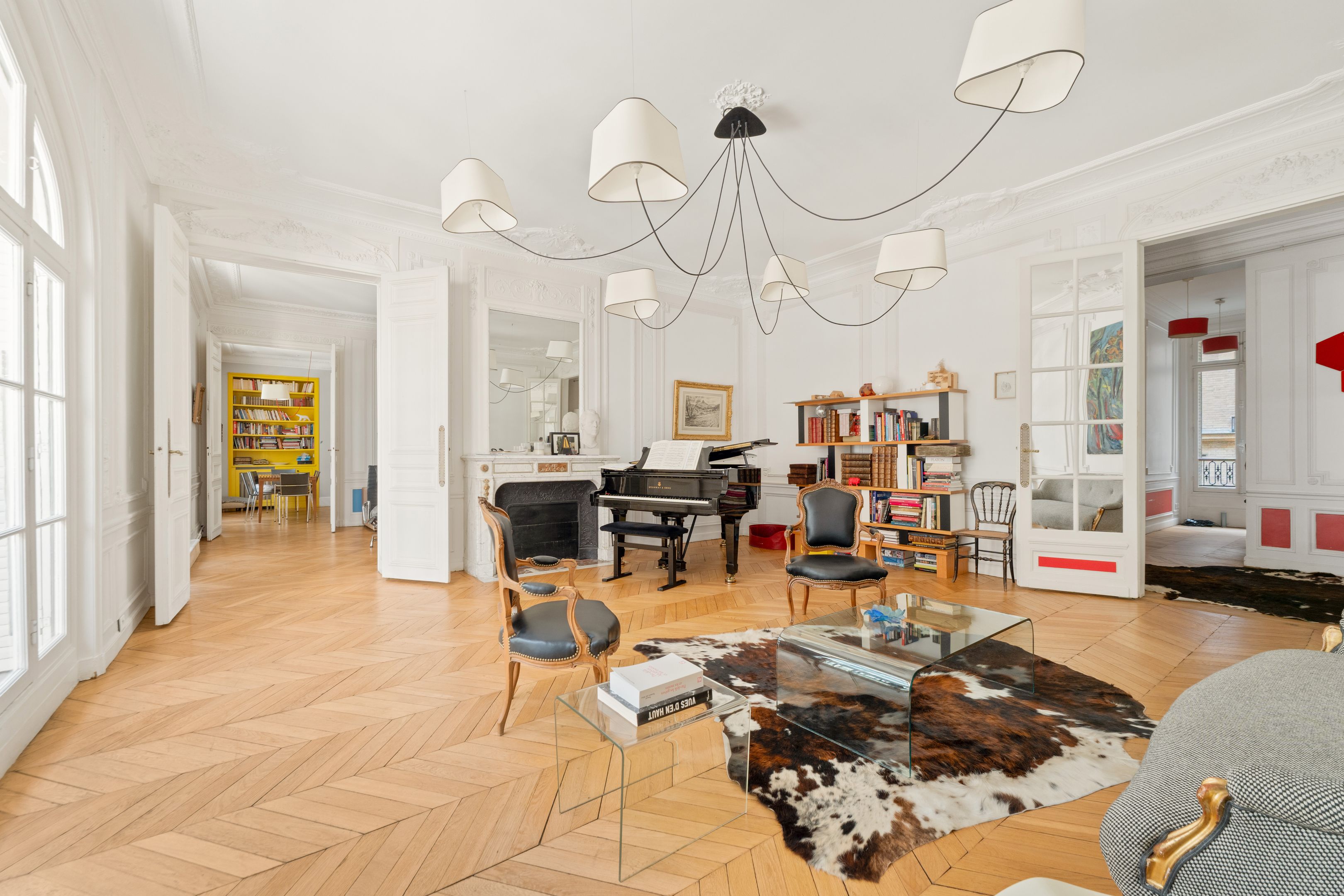190 m² (Loi Carrez) family and reception apartment, combining classic elegance and generous volumes, in a very attractive, prestigious freestone building. Entrance opens onto a triple 85 m² reception room bathed in light, comprising a vast living room, a second living room or "family room" and a convivial kitchen/dining area bordered by large arched windows offering a rare through-illumination. Three quiet bedrooms overlooking the courtyard (4th possible), study, bathroom with shower and toilet, second guest toilet. Old world charm, herringbone parquet flooring, refined moldings, period fireplaces and majestic 3.25 m high ceilings. Plenty of storage space. Liberal profession possible. Two cellars.