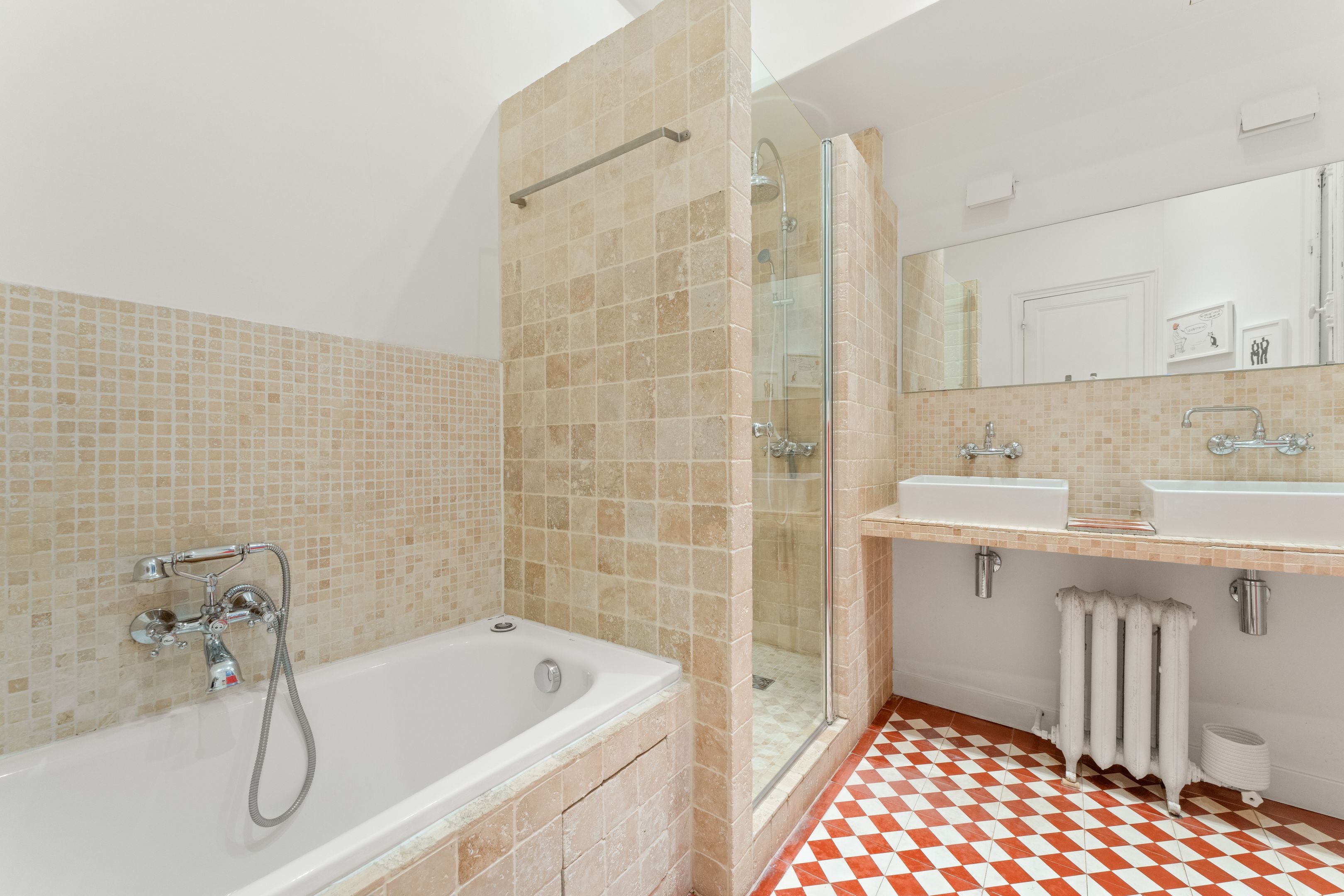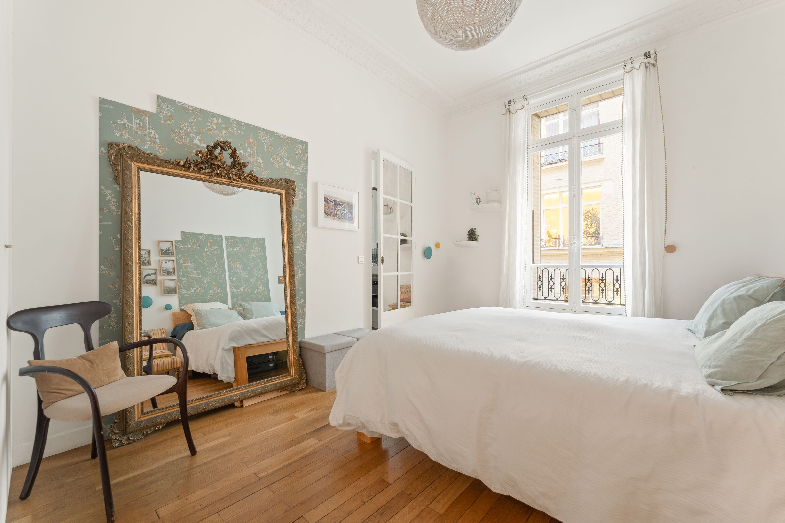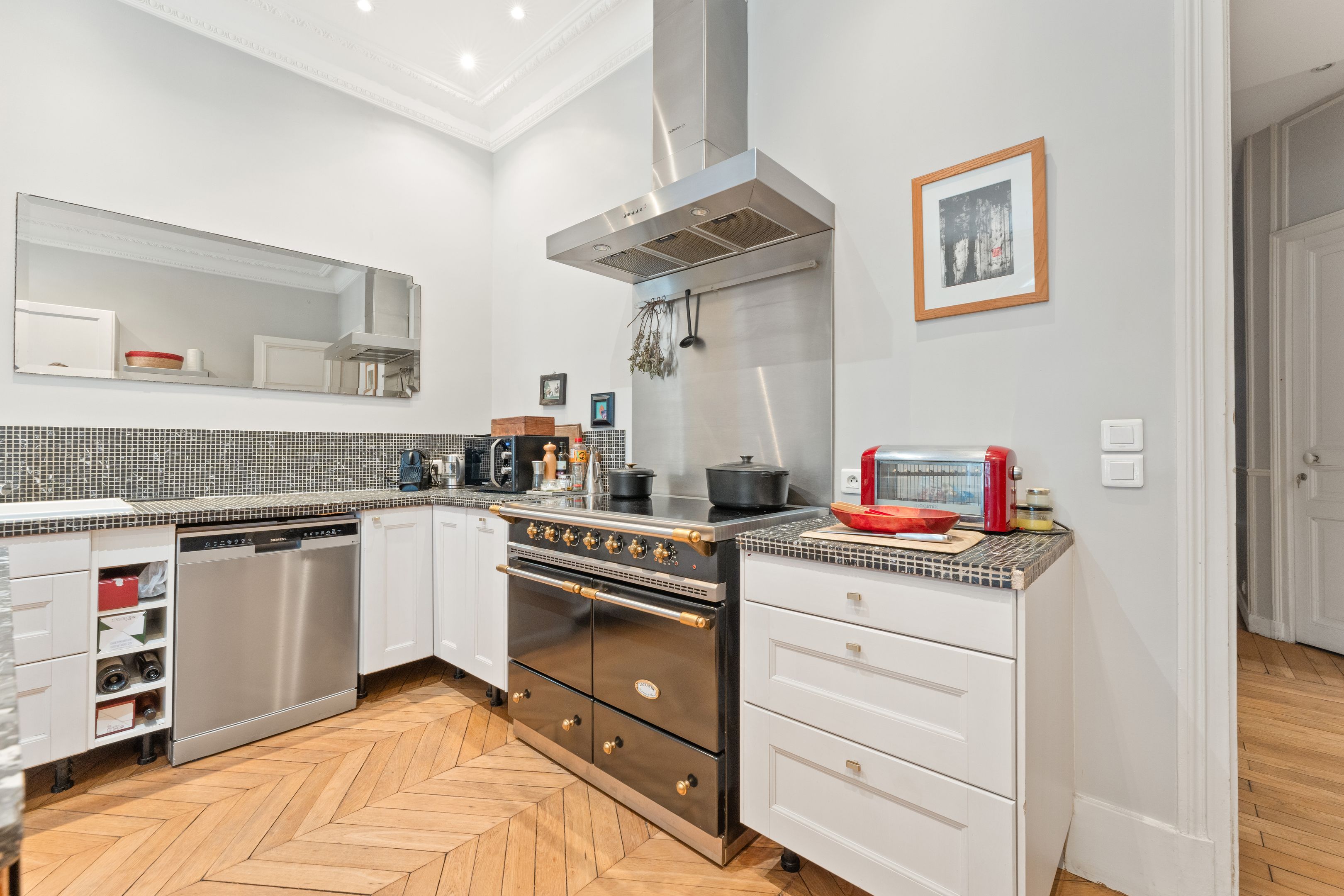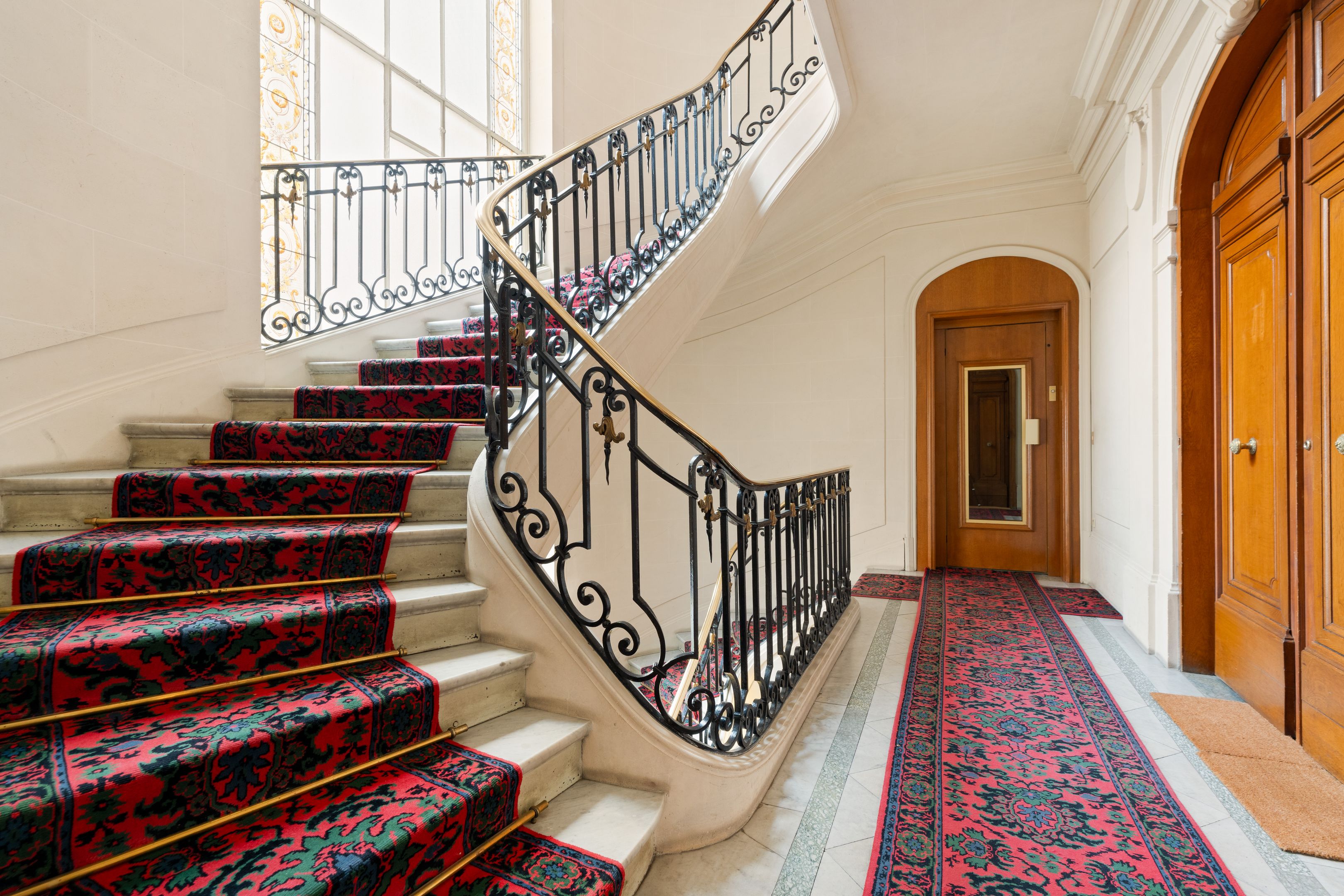 190 m² (Loi Carrez) family and reception apartment, combining classic elegance and generous volumes, in a very attractive, prestigious freestone building. Entrance opens onto a triple 85 m² reception room bathed in light, comprising a vast living room, a second living room or "family room" and a convivial kitchen/dining area bordered by large arched windows offering a rare through-illumination. Three quiet bedrooms overlooking the courtyard (4th possible), study, bathroom with shower and toilet, second guest toilet. Old world charm, herringbone parquet flooring, refined moldings, period fireplaces and majestic 3.25 m high ceilings. Plenty of storage space. Liberal profession possible. Two cellars.