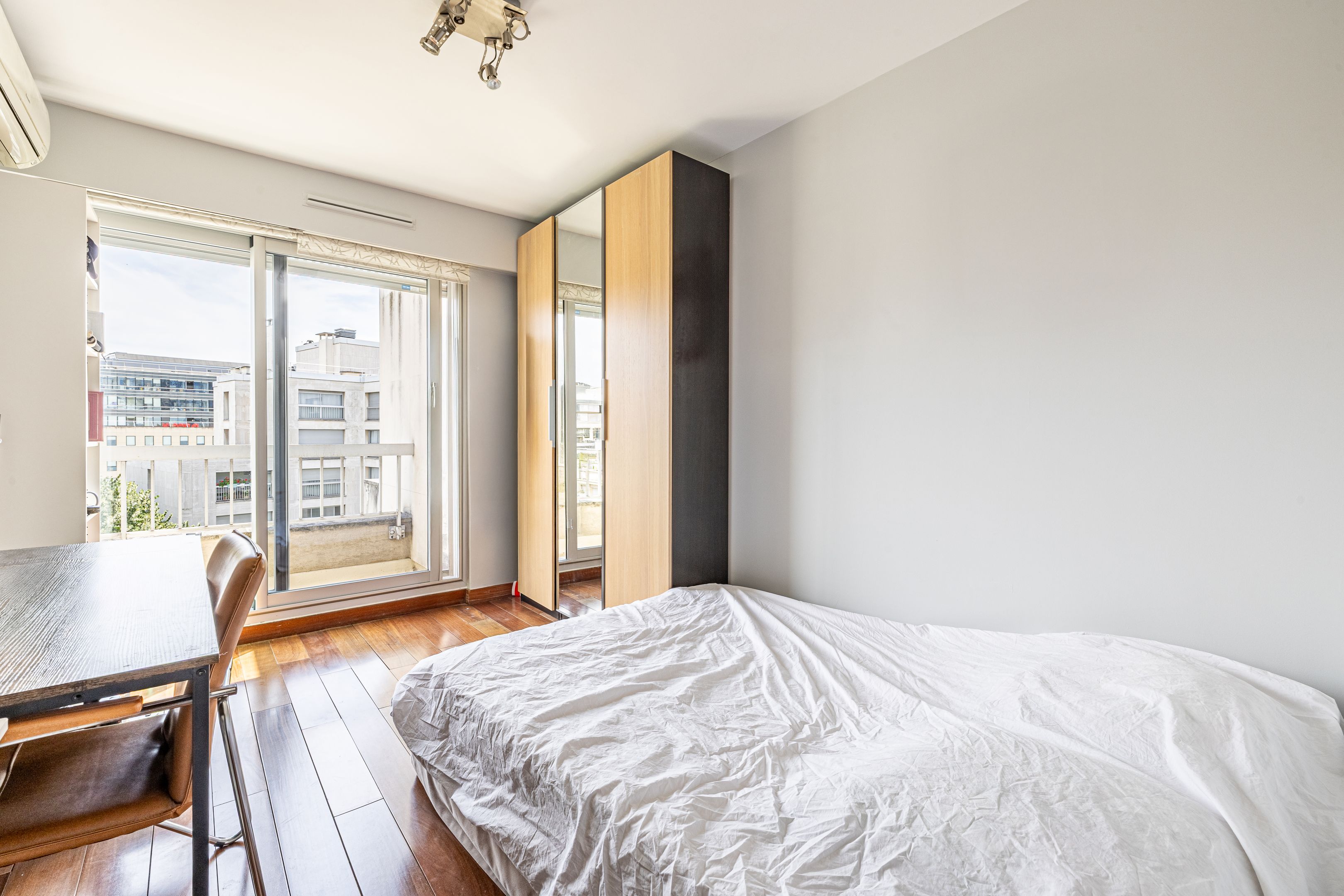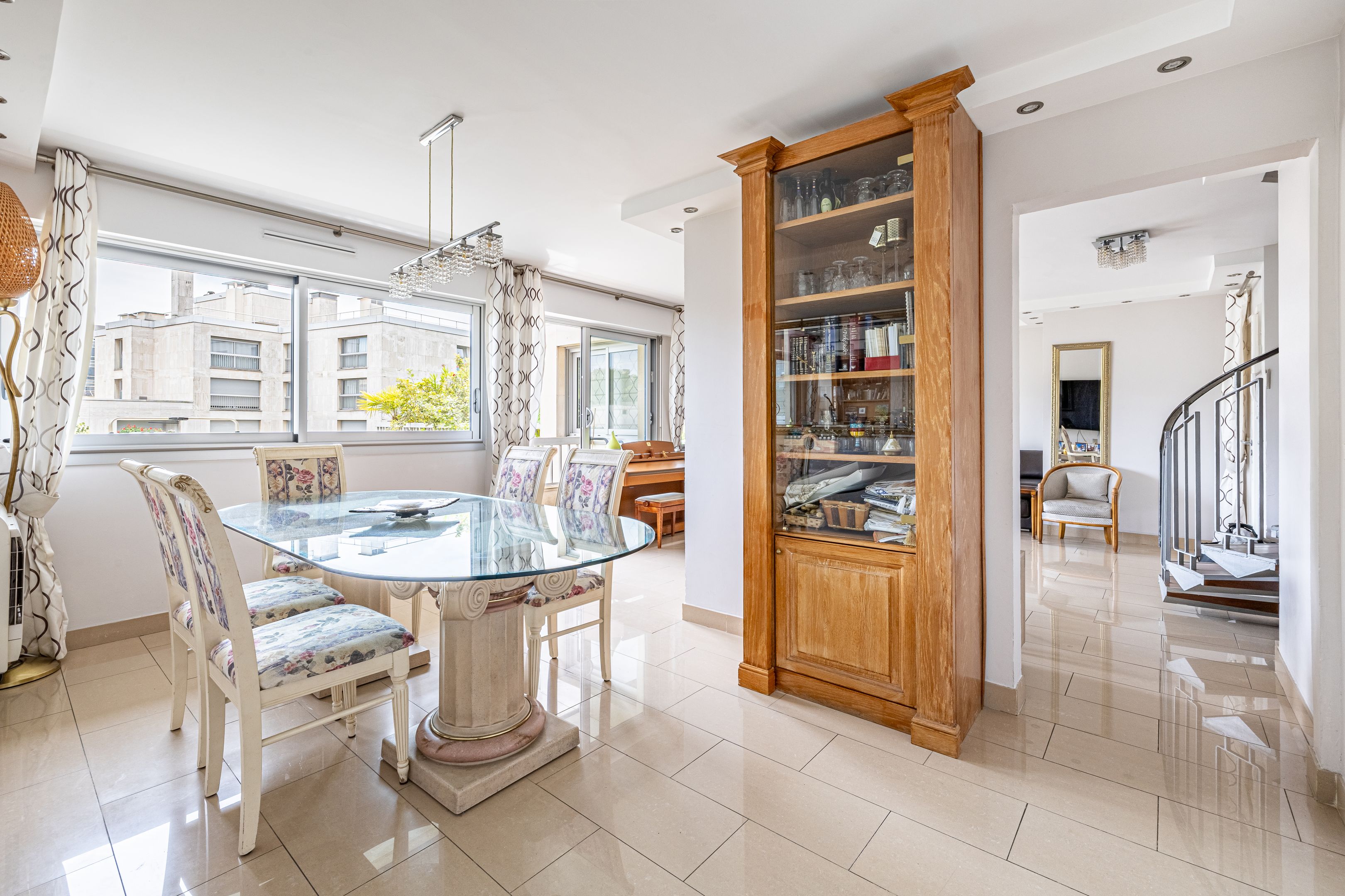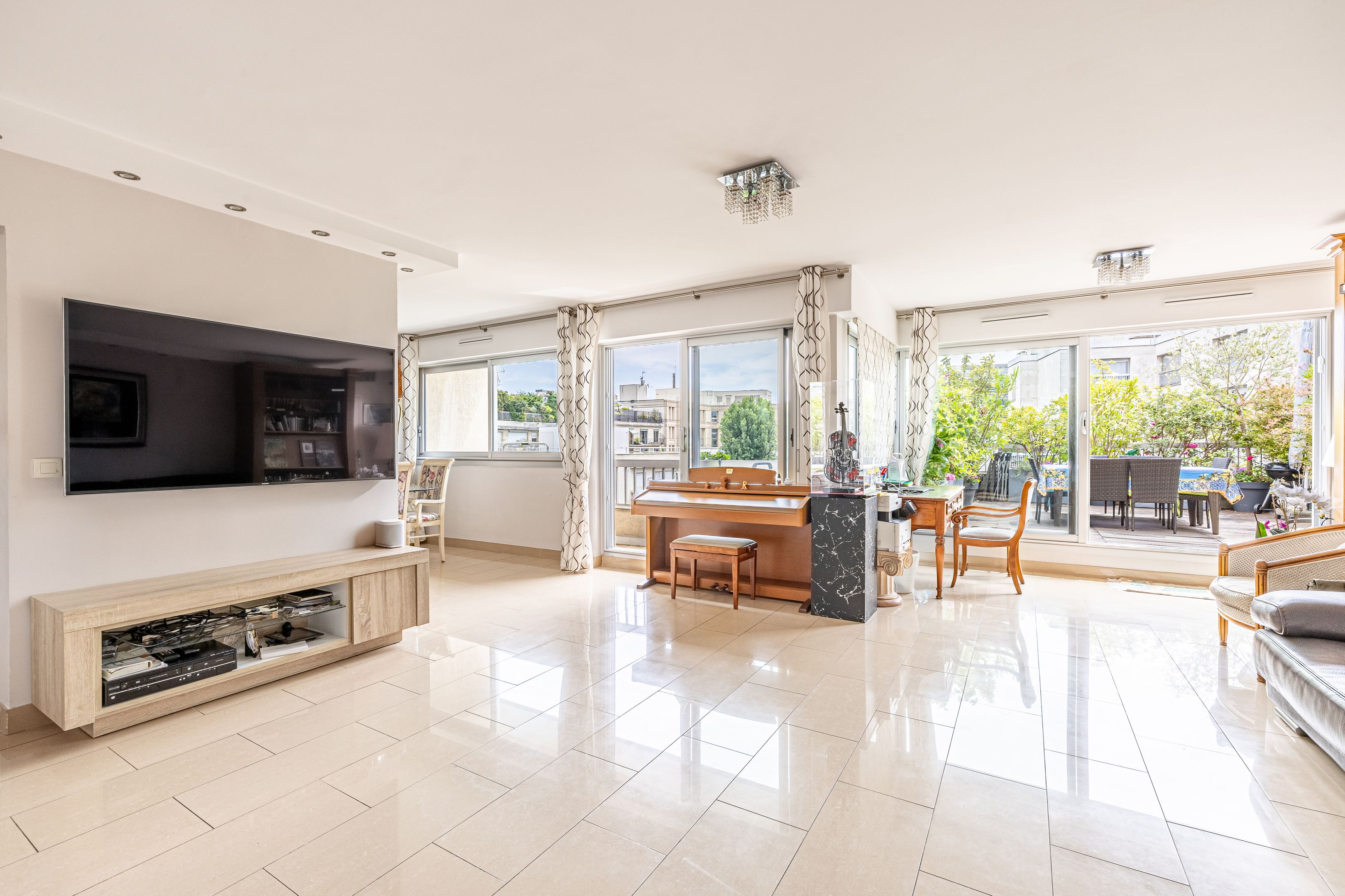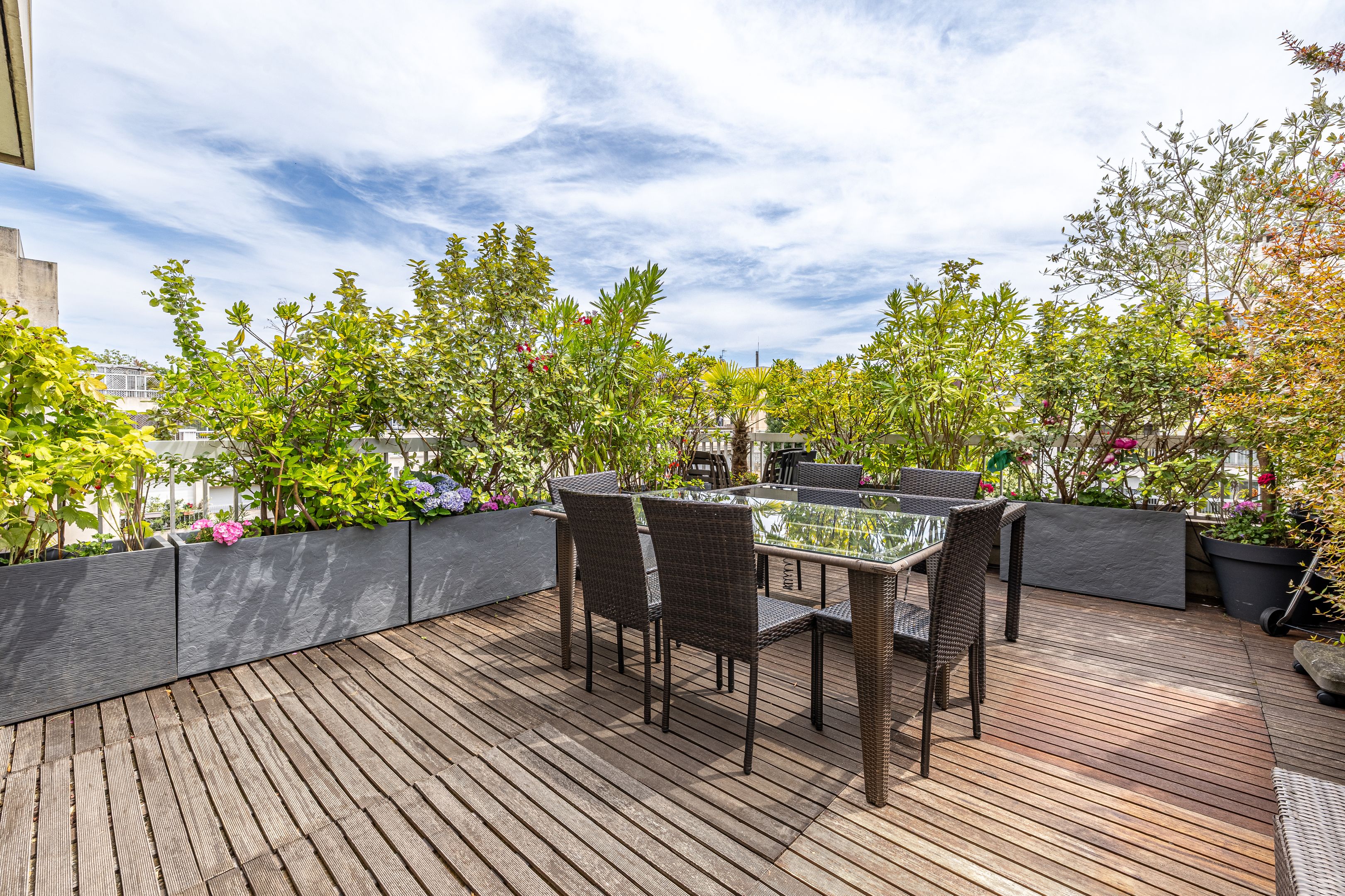 Pont de Neuilly - Close to shops and transport links, in a recent building of very high standing maintained by a janitor, 147 m² apartment, both family and reception, on the fifth and sixth floors served by elevator. Entrance hall, large living room opening onto balcony and 29 m² terrace overlooking garden, large kitchen/dining room, laundry room, guest toilet, storage space. First floor: four bedrooms, bathroom, shower room, dressing room, separate toilet and storage space. Cellar. Two additional parking spaces.