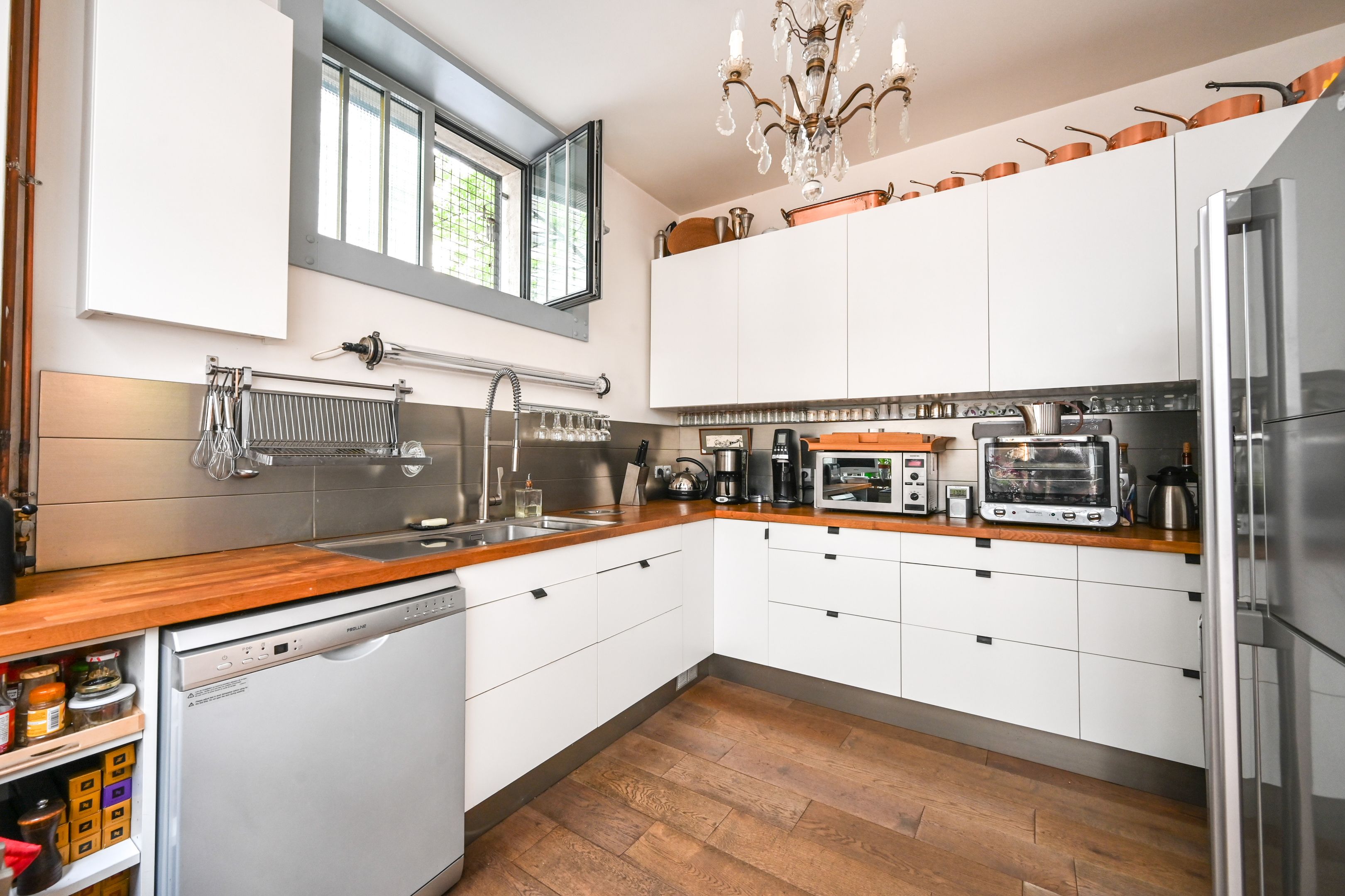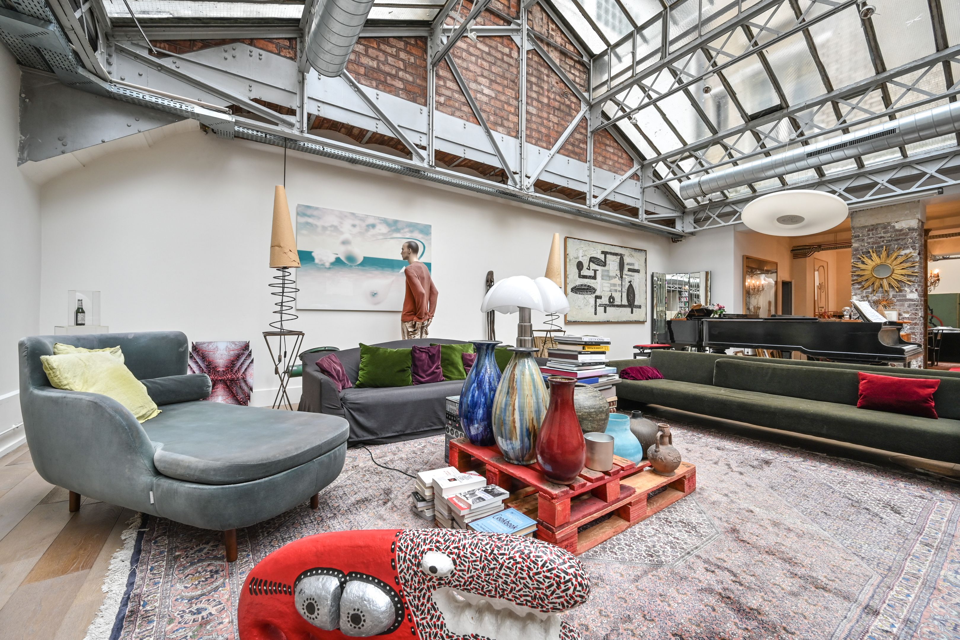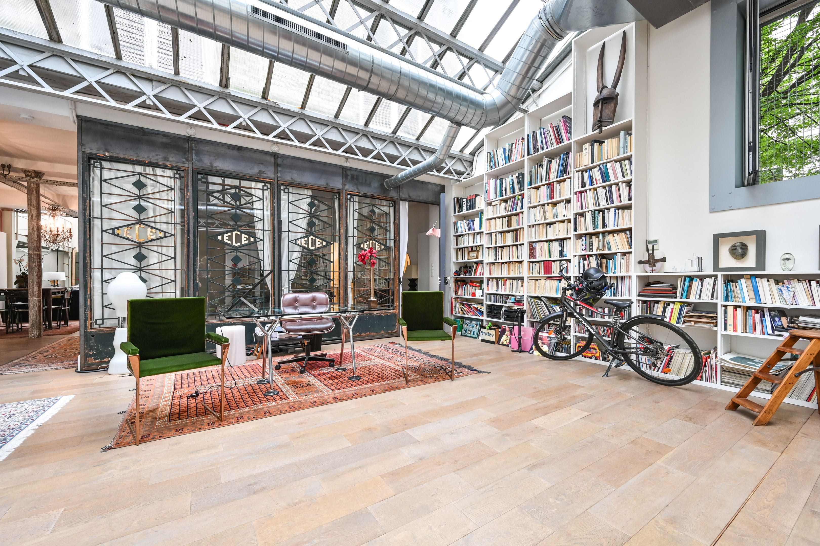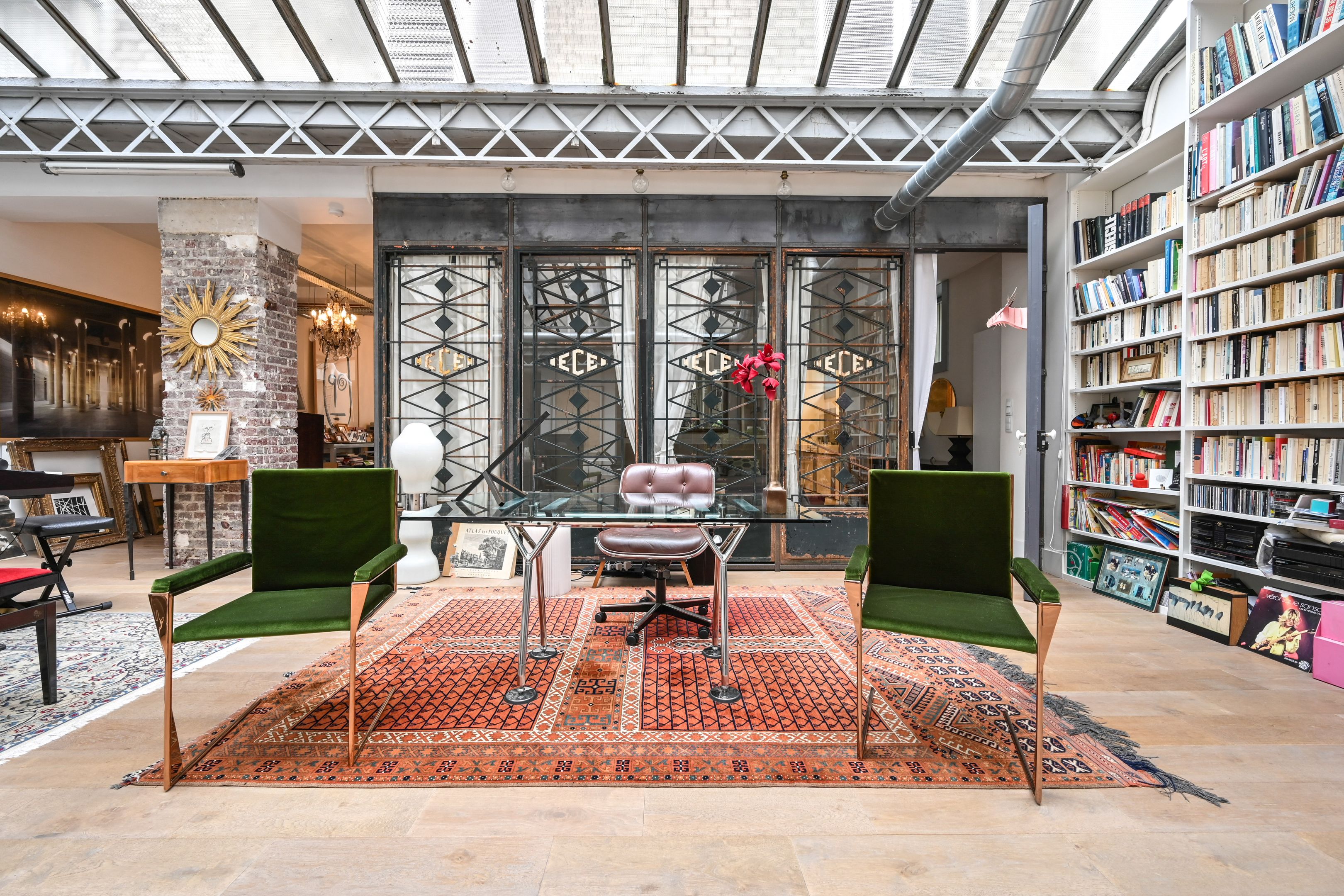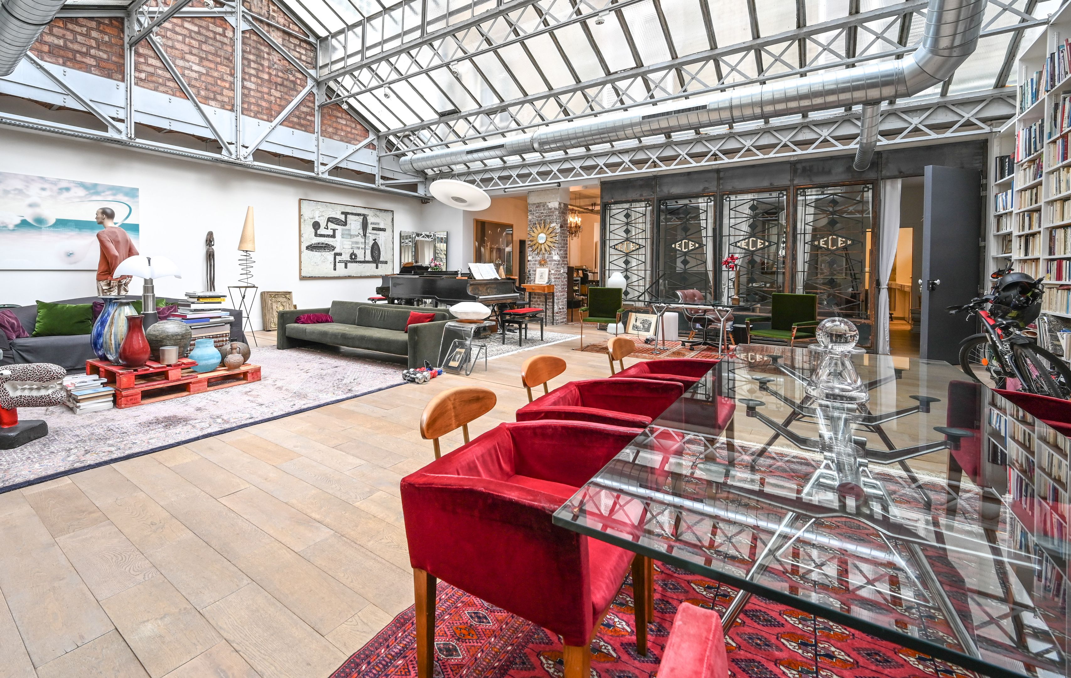 Exceptional loft-style apartment (236m²/2540ft²), entirely redesigned by an architect, benefitting from the natural light of an immense glass roof (7m/22.9ft high). Entrance hall, superb open-plan reception area (110m²/1184ft²) comprising a living room, a dining room and a semi open-plan fully equipped kitchen. In the sleeping area: 2 bedrooms, 2 bathrooms, spacious office space and 30m²/322ft² lounge with a glass roof and a mezzanine (2 additional bedrooms possible). A reversible heat pump (for air conditioning and heating) ensures perfect comfort all year round. Large cellar.
