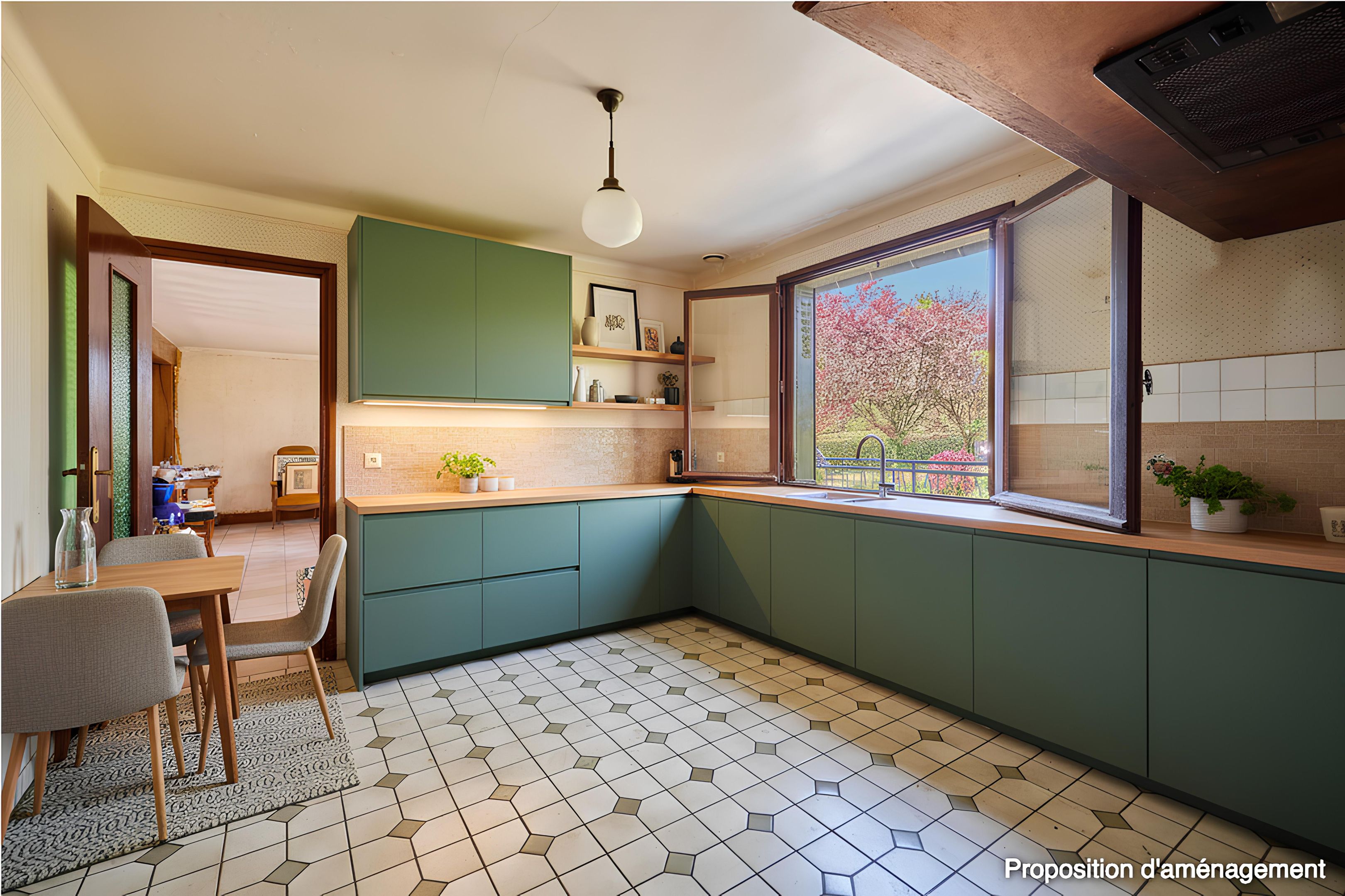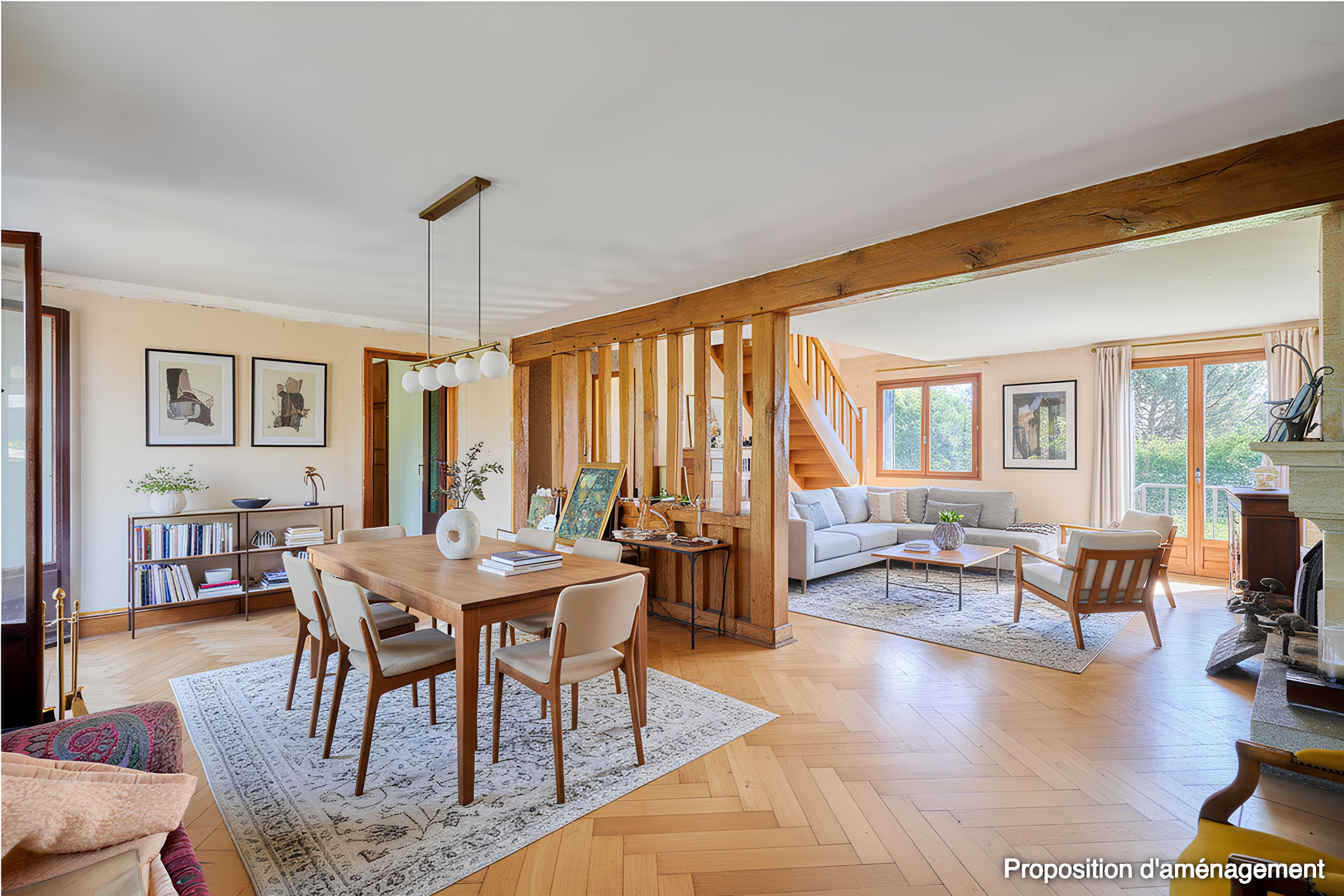 Between Pont-l'Évêque and Deauville, traditional 176 m² house for renovation, set in 1773 m² of flat, enclosed grounds. Elevated first floor: entrance, spacious through living room with fireplace, benefiting from a terrace to the front and rear of the house, independent kitchen (possibility of opening), bedroom, bathroom, independent toilet. First floor: three bedrooms, dressing room, bathroom with toilet. Full basement with access from inside, including a large garage and several rooms for storage.