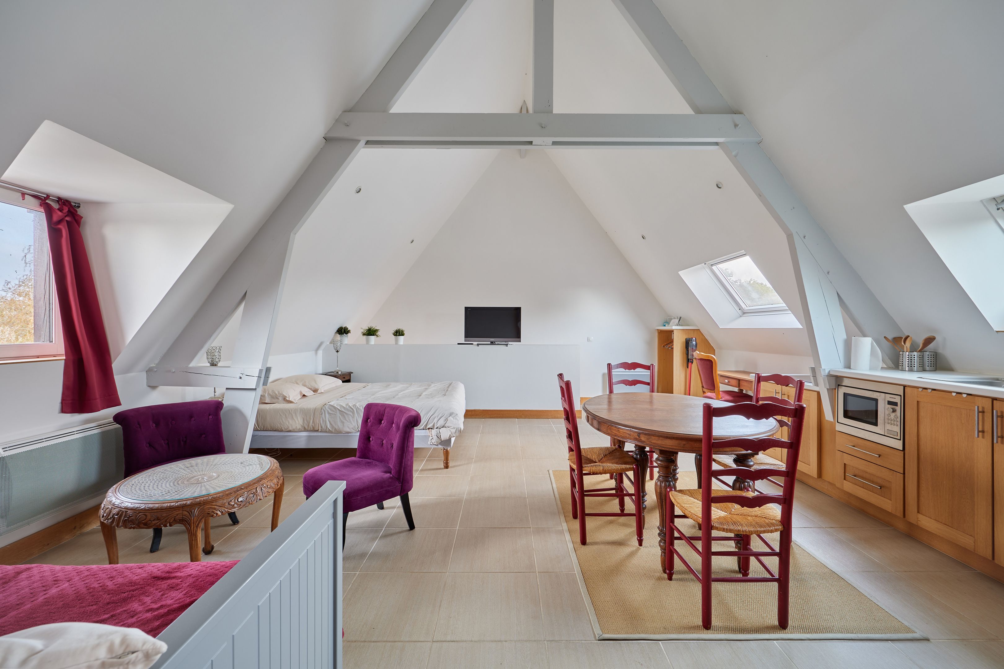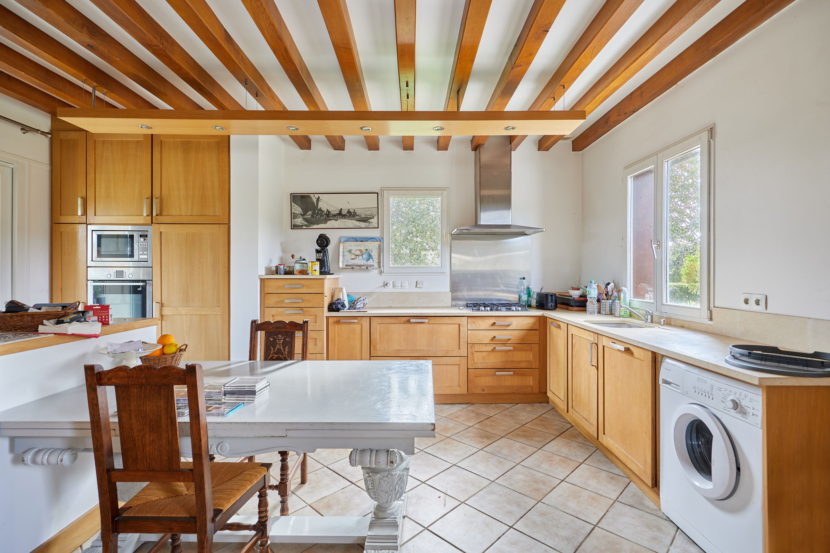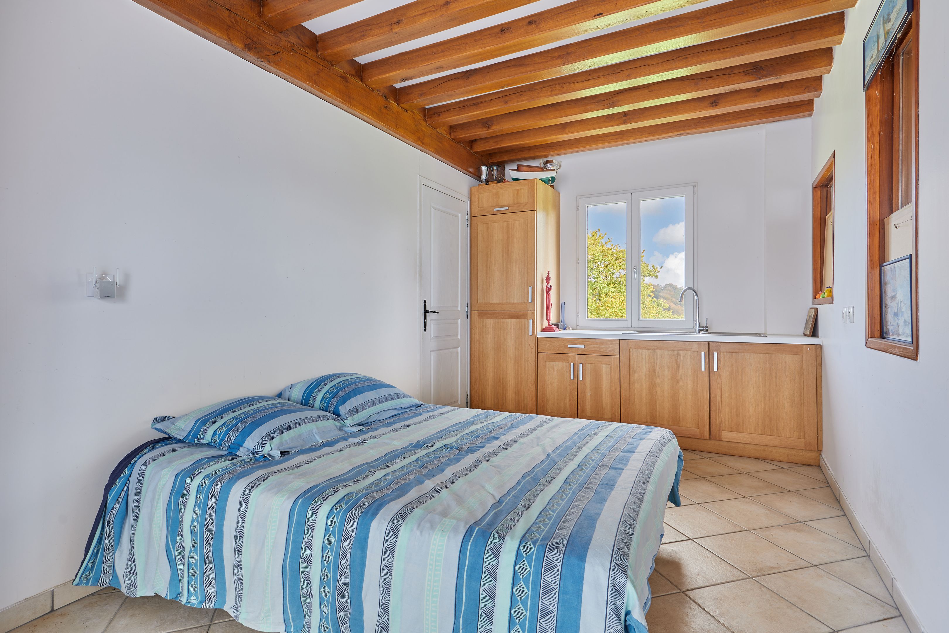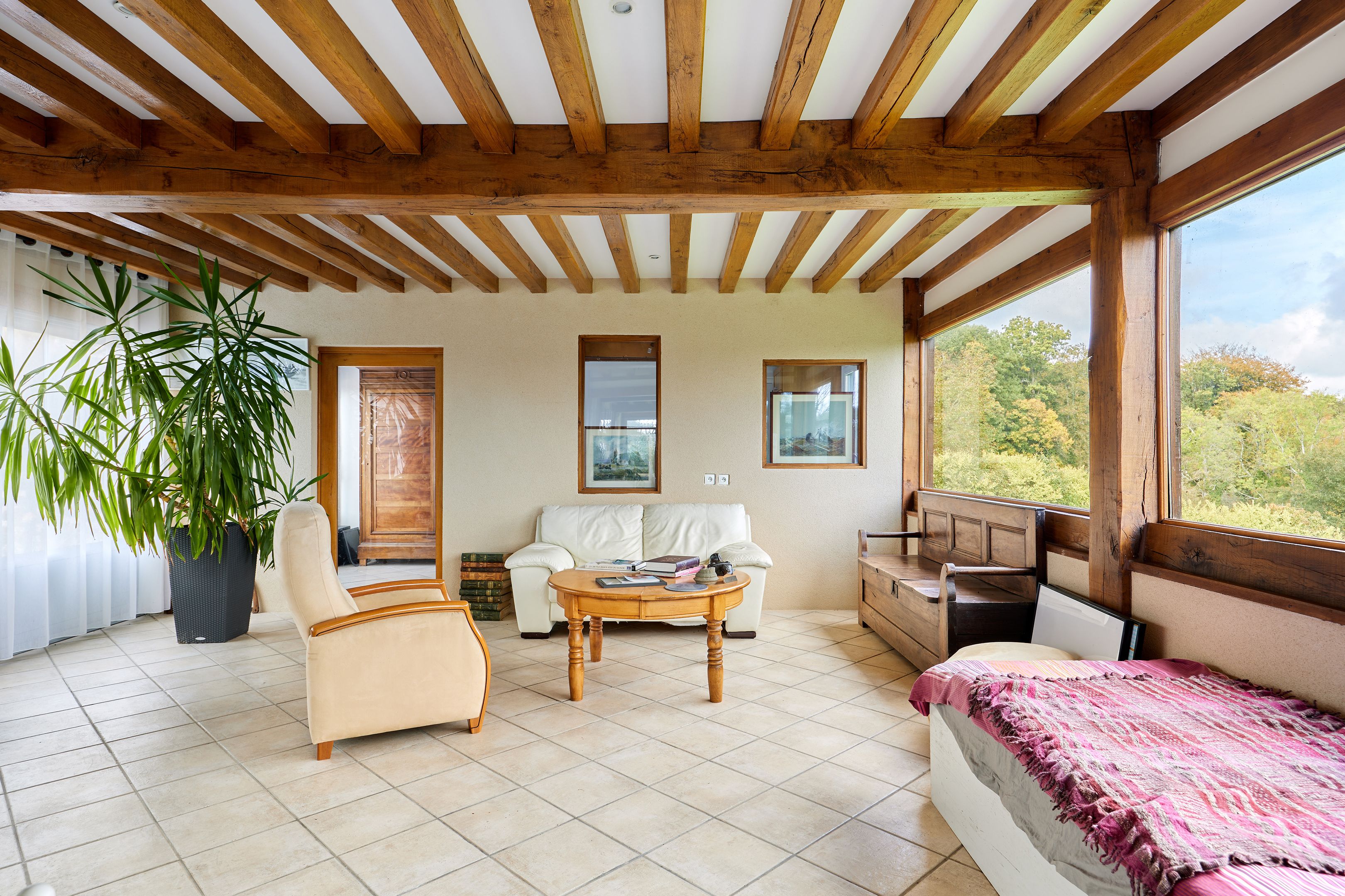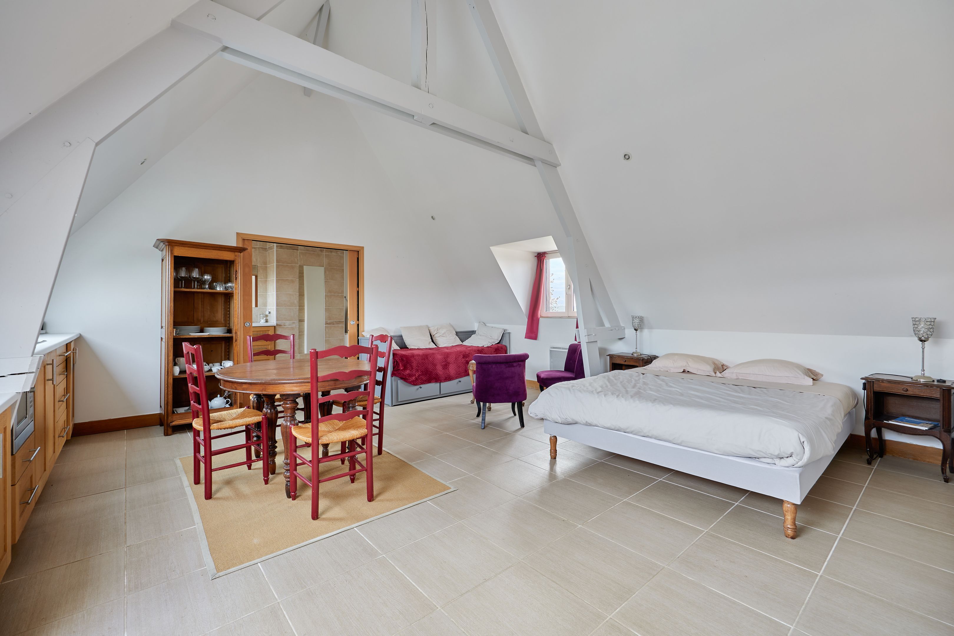 5min from Pont-l'Évêque, Normandy house built on almost 3500m2 of land. First floor: small living room with wood-burning stove opening onto south-facing terrace, open kitchen, large living room opening onto the valley, bedroom. First floor: two bedrooms, bathroom, dressing room. Accessible from outside: independent studio with kitchenette, shower room and toilet. Outbuildings: small 50m2 building on 2 levels, suitable for conversion. Two garden sheds.