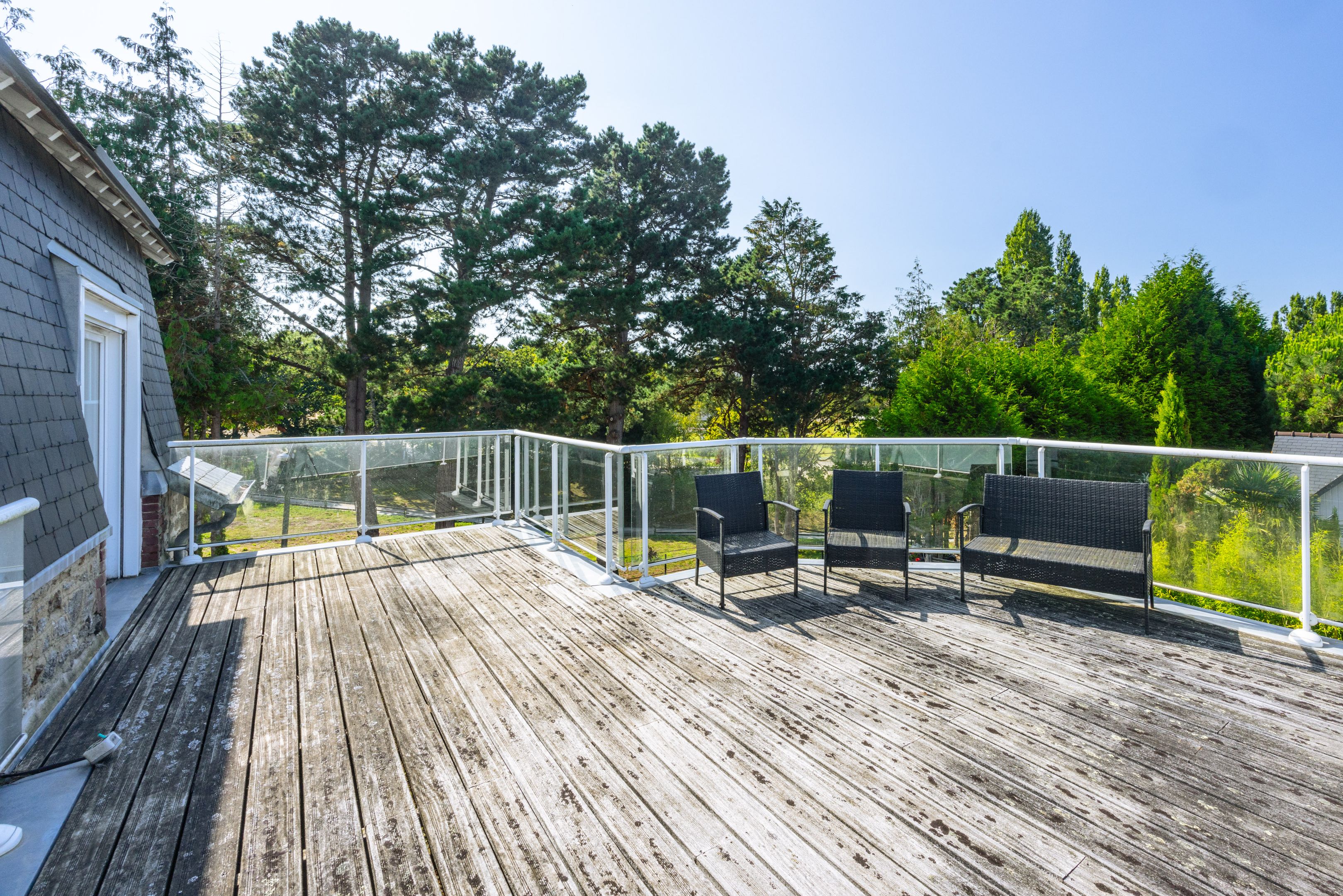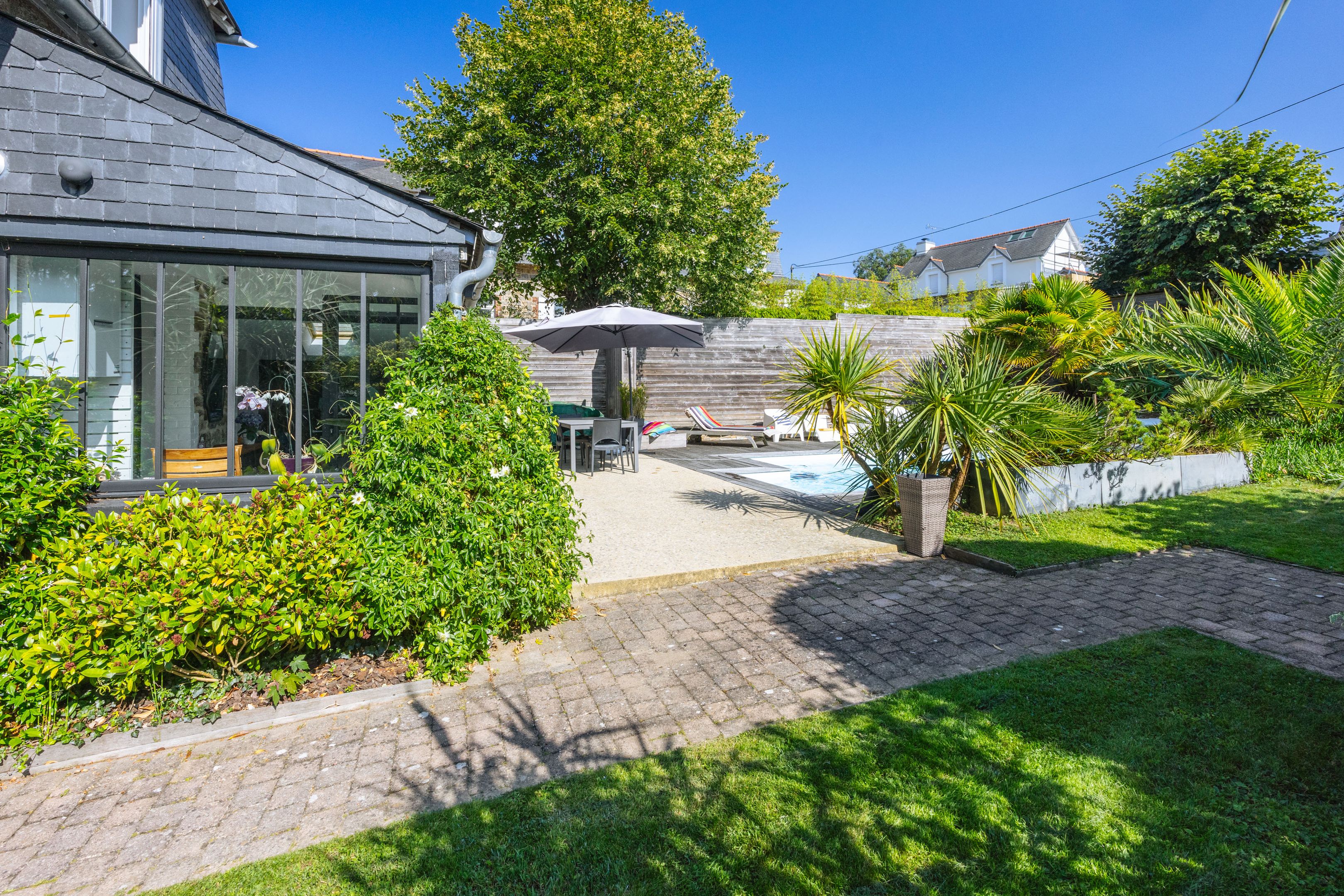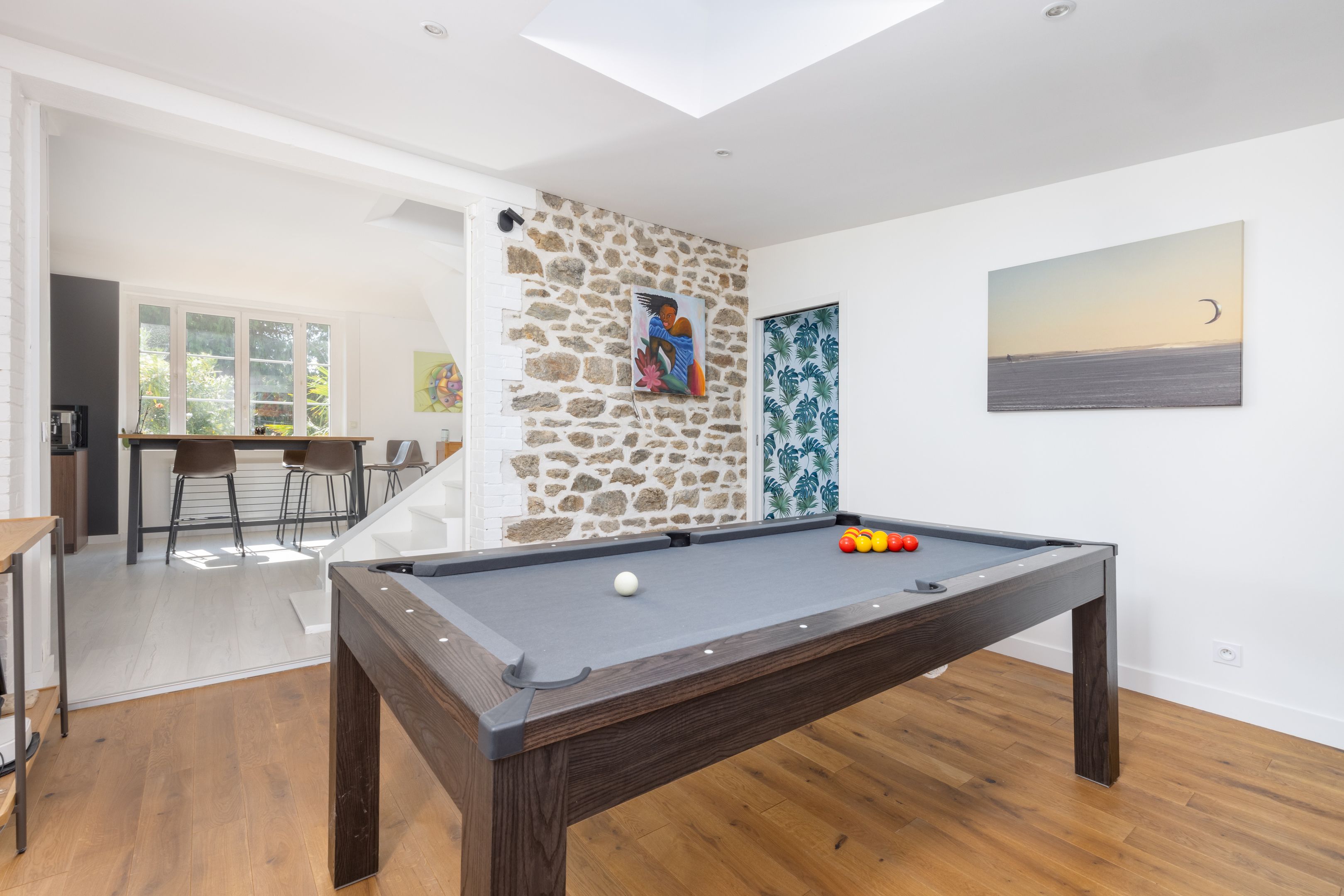600m from Prieuré beach, opposite the equestrian center and Port Breton park. Beautiful 173m² stone house benefiting from plenty of natural light, a good layout and a quiet, wooded setting. Fully renovated first floor: living room with fireplace, vast, light-filled, west-facing space with fully-equipped kitchen and dining room, billiard room, south-facing veranda, shower room. First floor: 4 bedrooms, one of which is generous in size with a large terrace, shower room. Very pleasant, sunny exterior with swimming pool, lawn area and attractive plant diversity. Exterior parking and double garage.