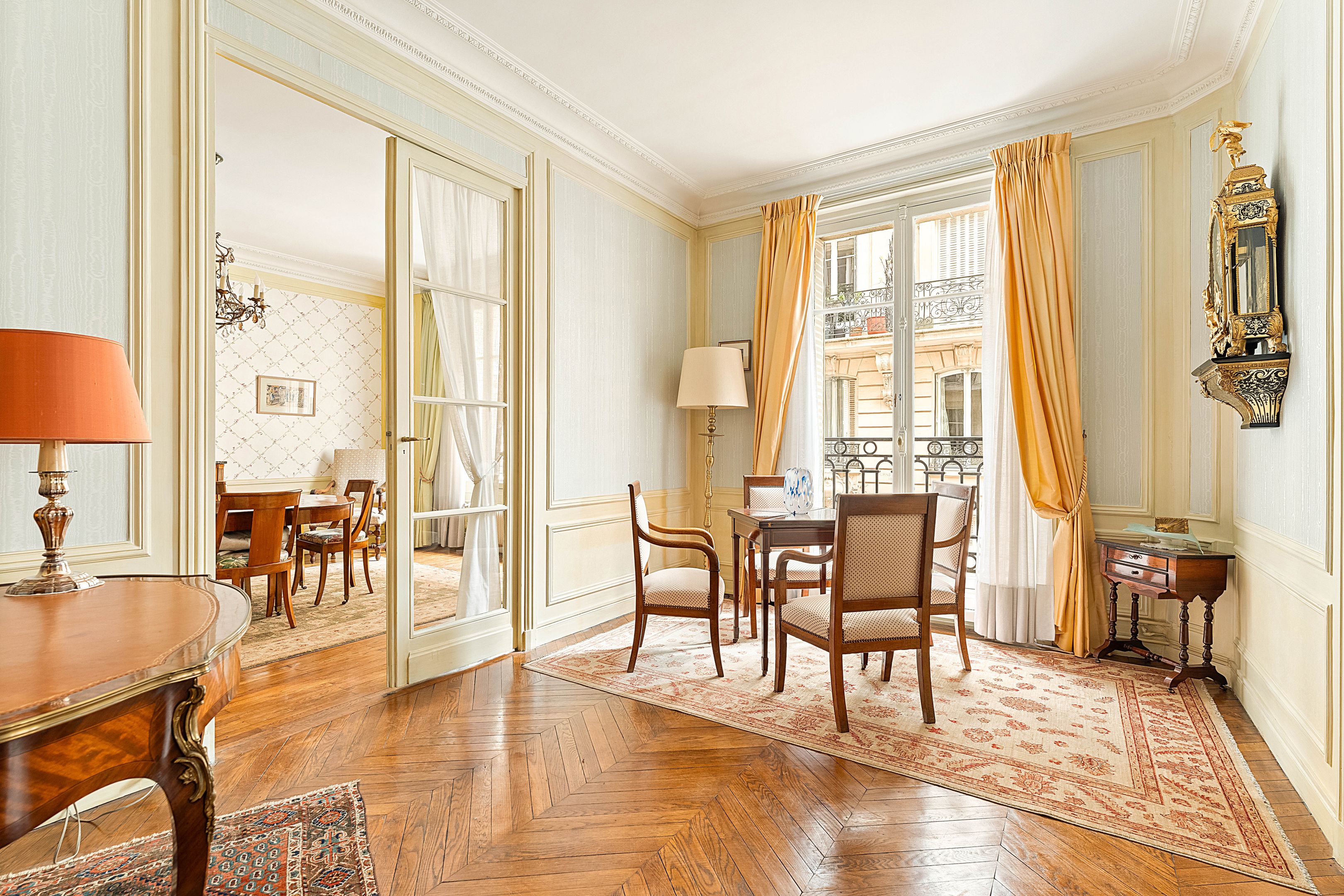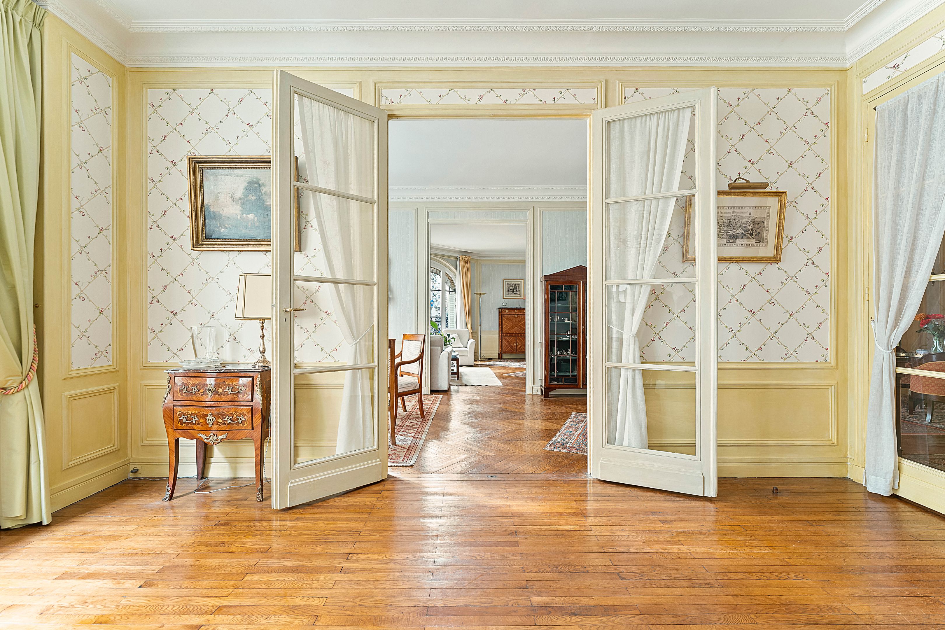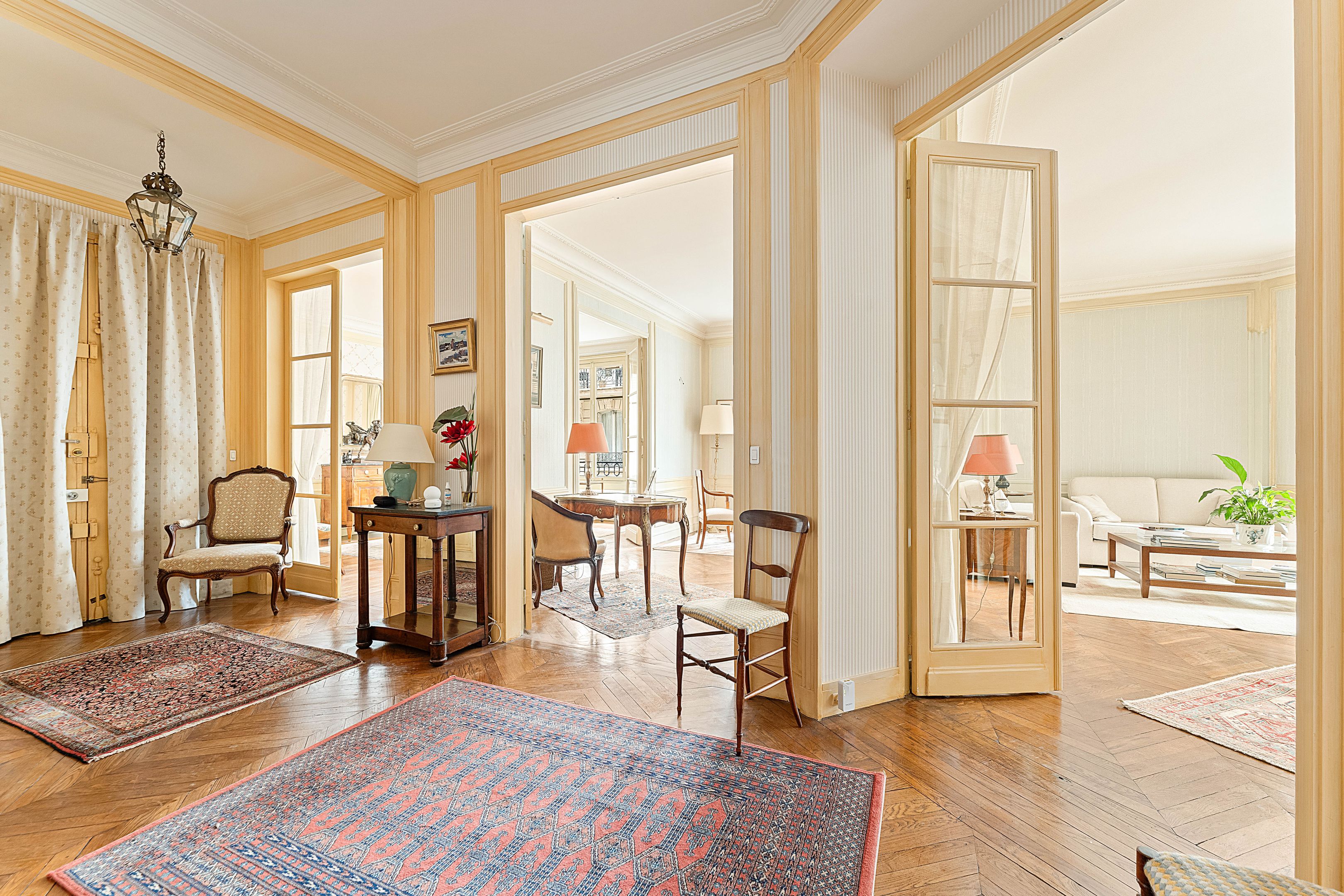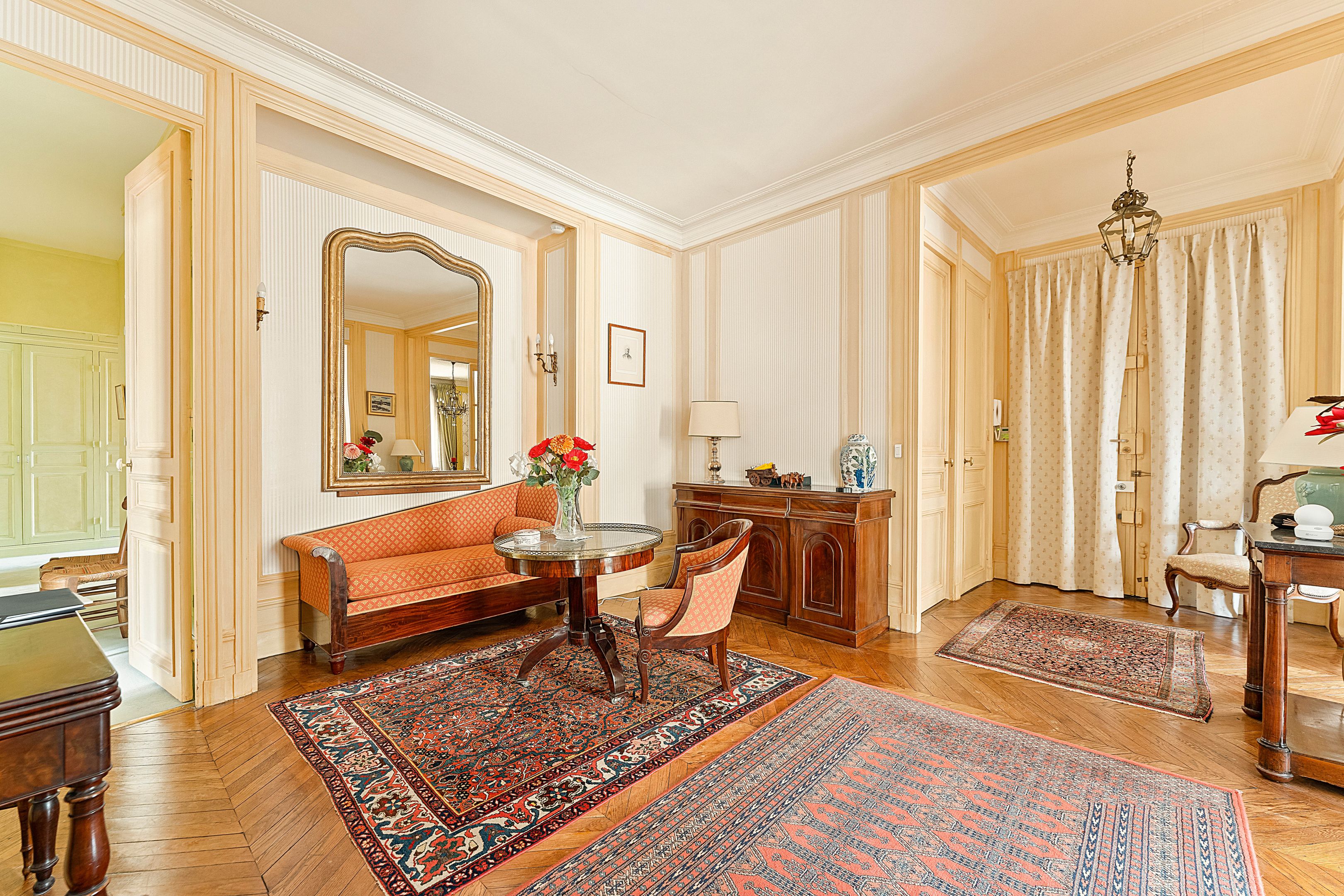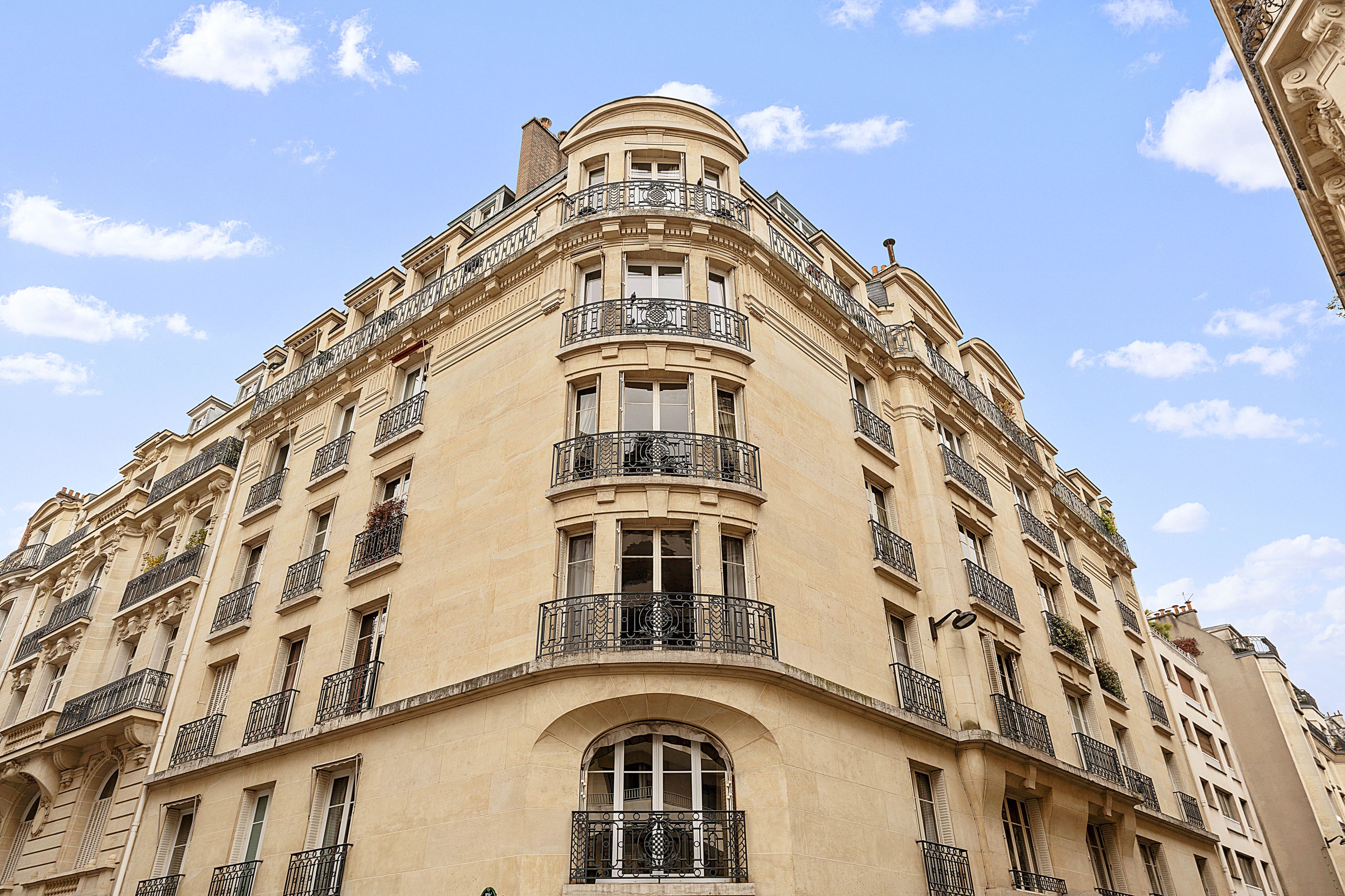 High-quality Haussmann-style building with well-kept communal areas, ideally located a stone's throw from the schools and amenities of Rue de la Pompe, 171 m² corner apartment with parquet flooring, moldings and fireplaces, on the 1st floor, featuring an excellent floor plan. Entrance gallery, triple living room, large eat-in kitchen, three bedrooms, bathroom, shower room, dressing room, toilet. Possibility of creating a 4th bedroom. Double cellar and storage room. Additional parking in front of the building.