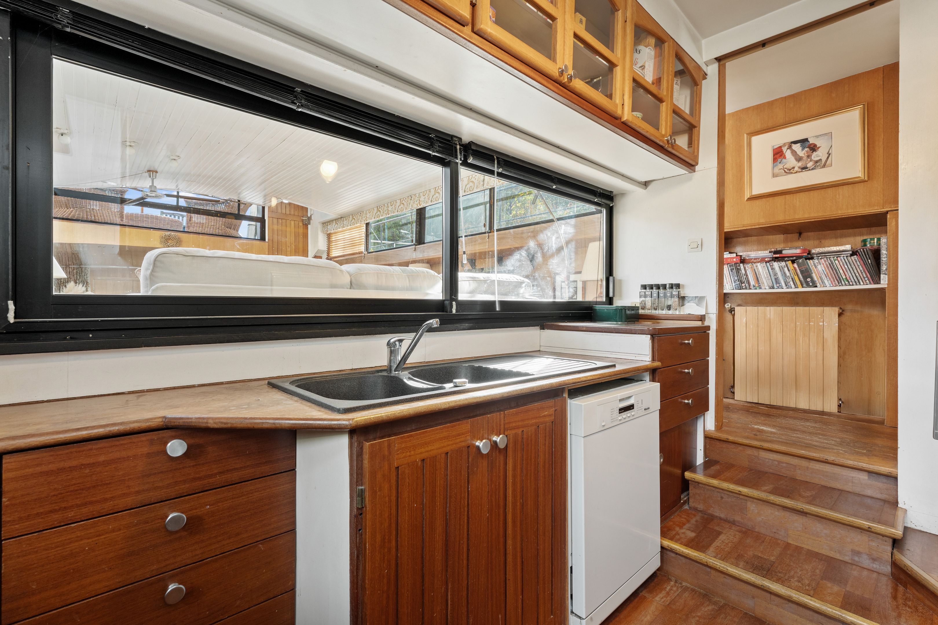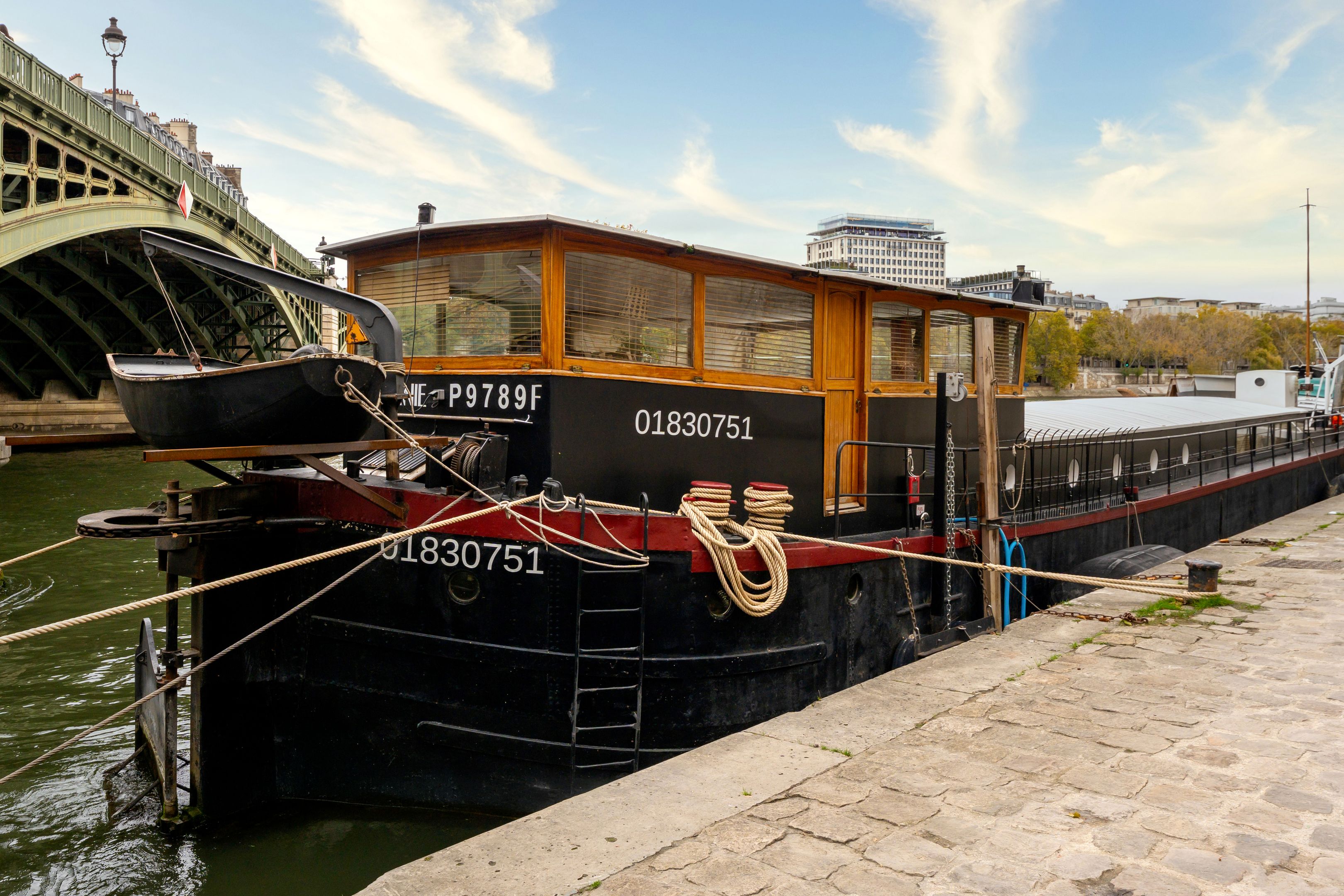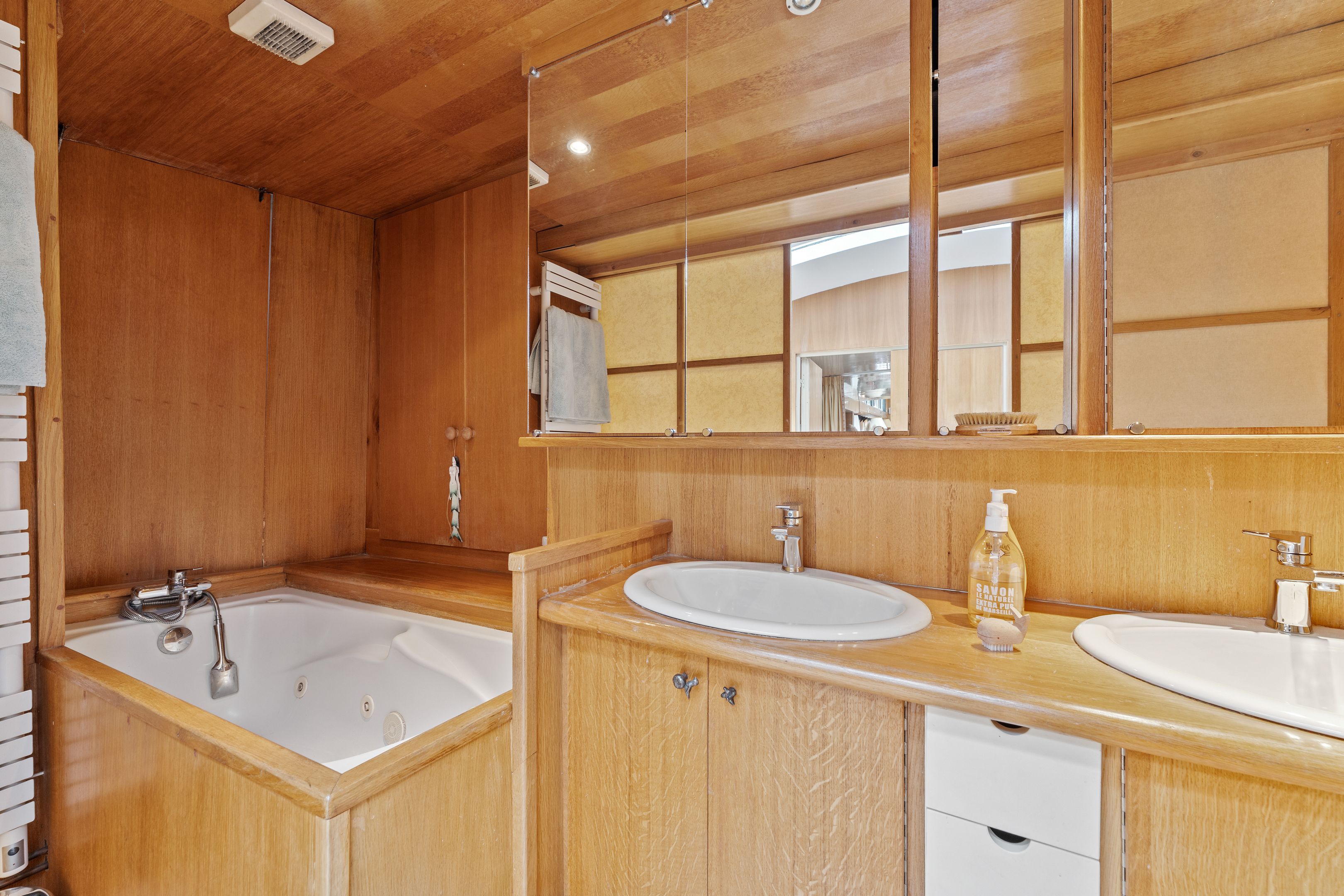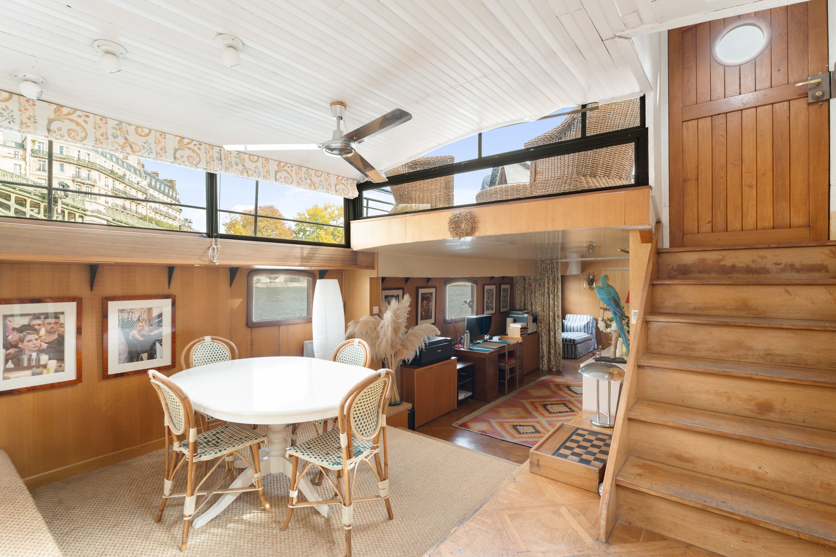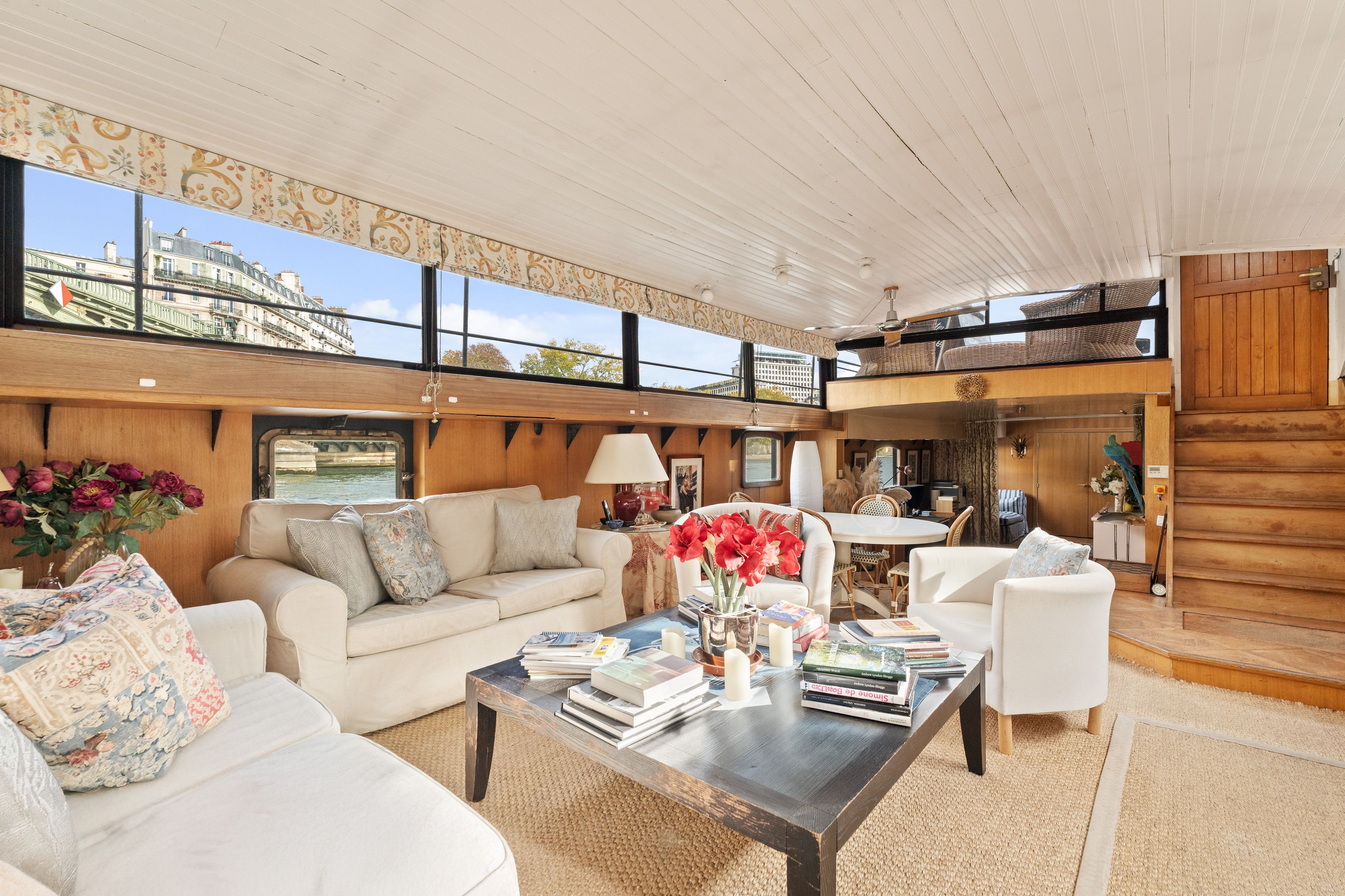 Magnificent barge (Freycinet) with a surface area of 210m2, a 40m2 terrace, open onto the Seine with views of the Ile de la Cité and Ile Saint Louis: large, spacious living room, with a lounge area, dining room, office area, fully fitted kitchen, master suite with bathroom and dressing room, 2 bedrooms, each with its own bathroom and toilet, sauna, 4th bedroom, pilothouse that can be converted into a totally independent studio (on 2 levels).