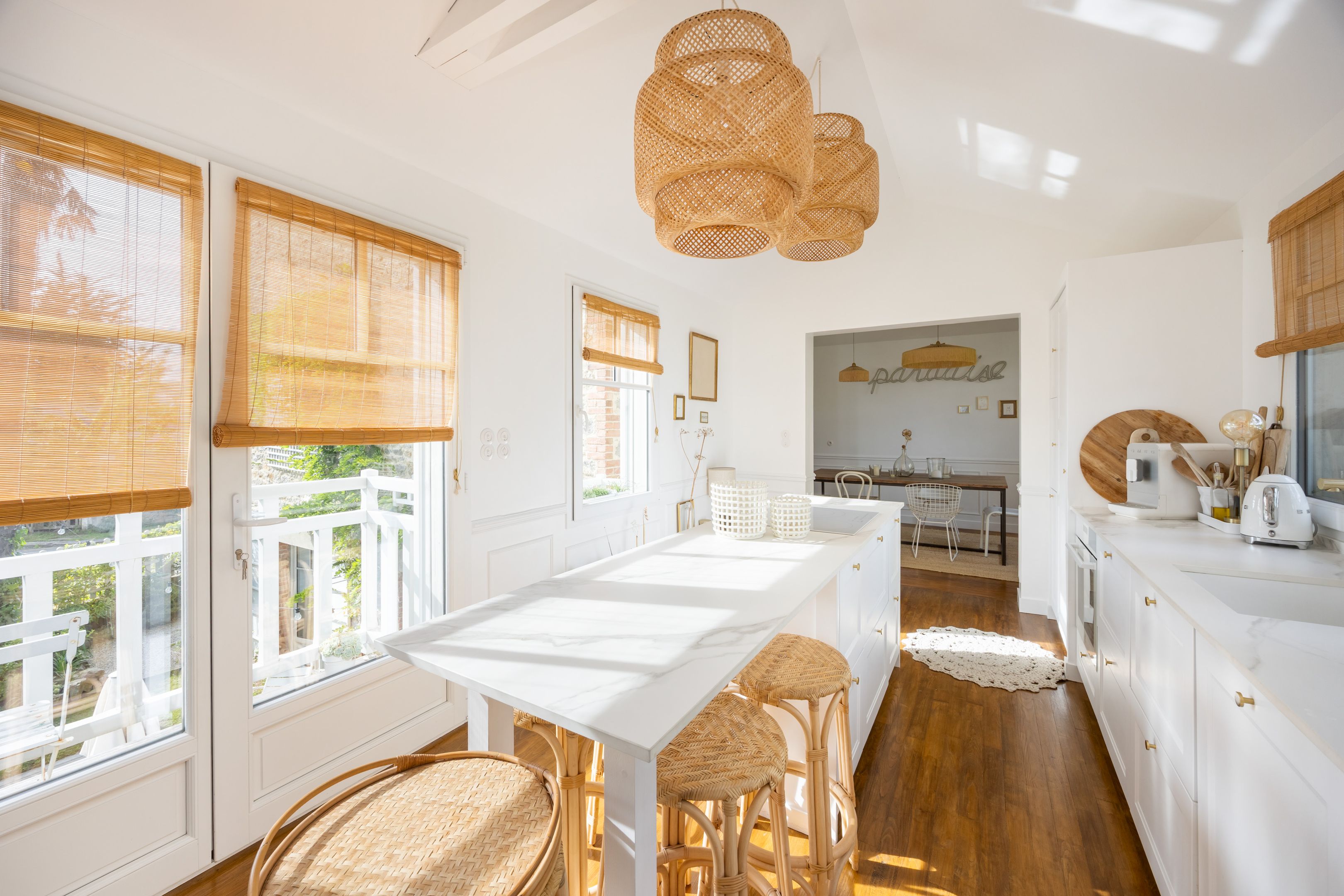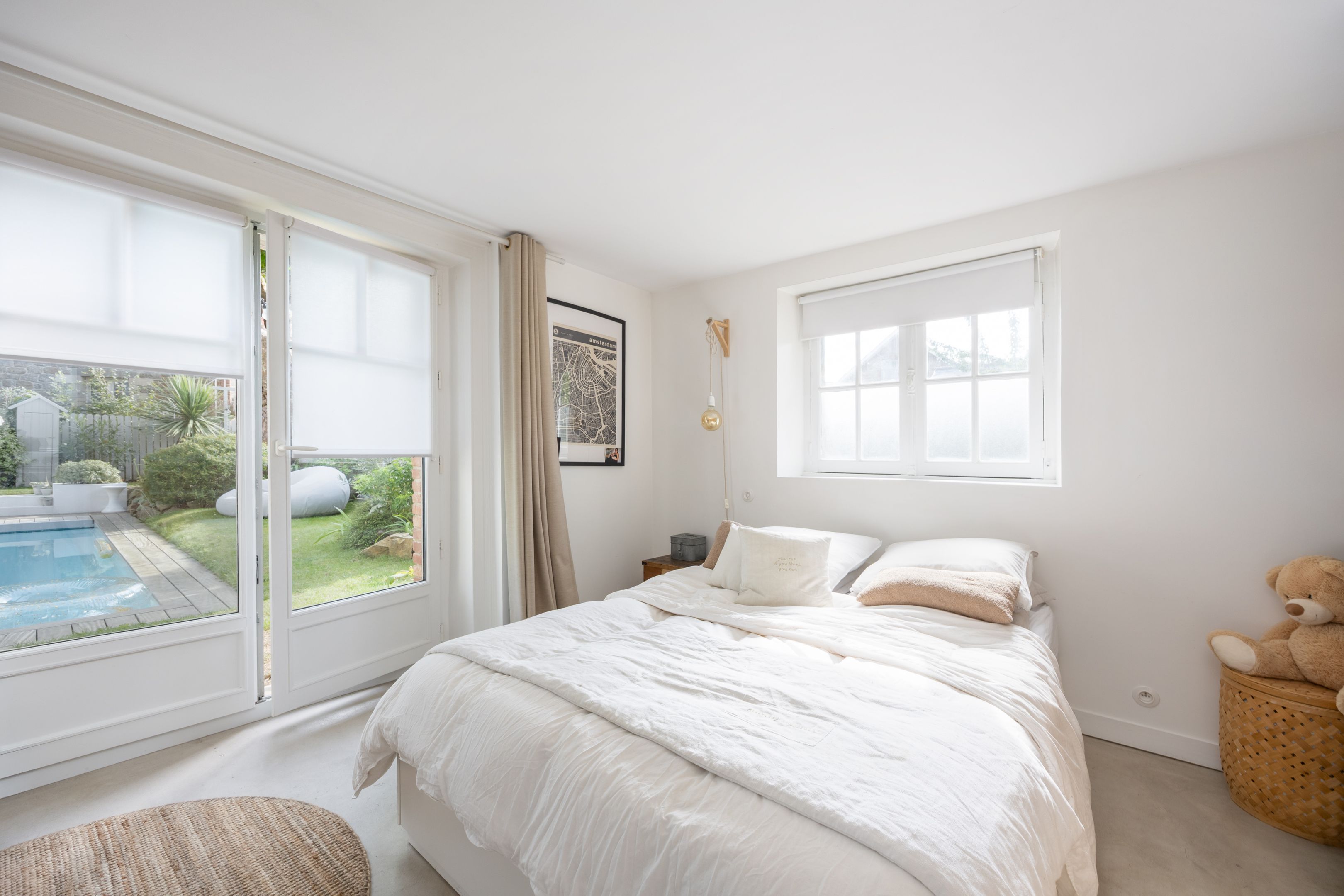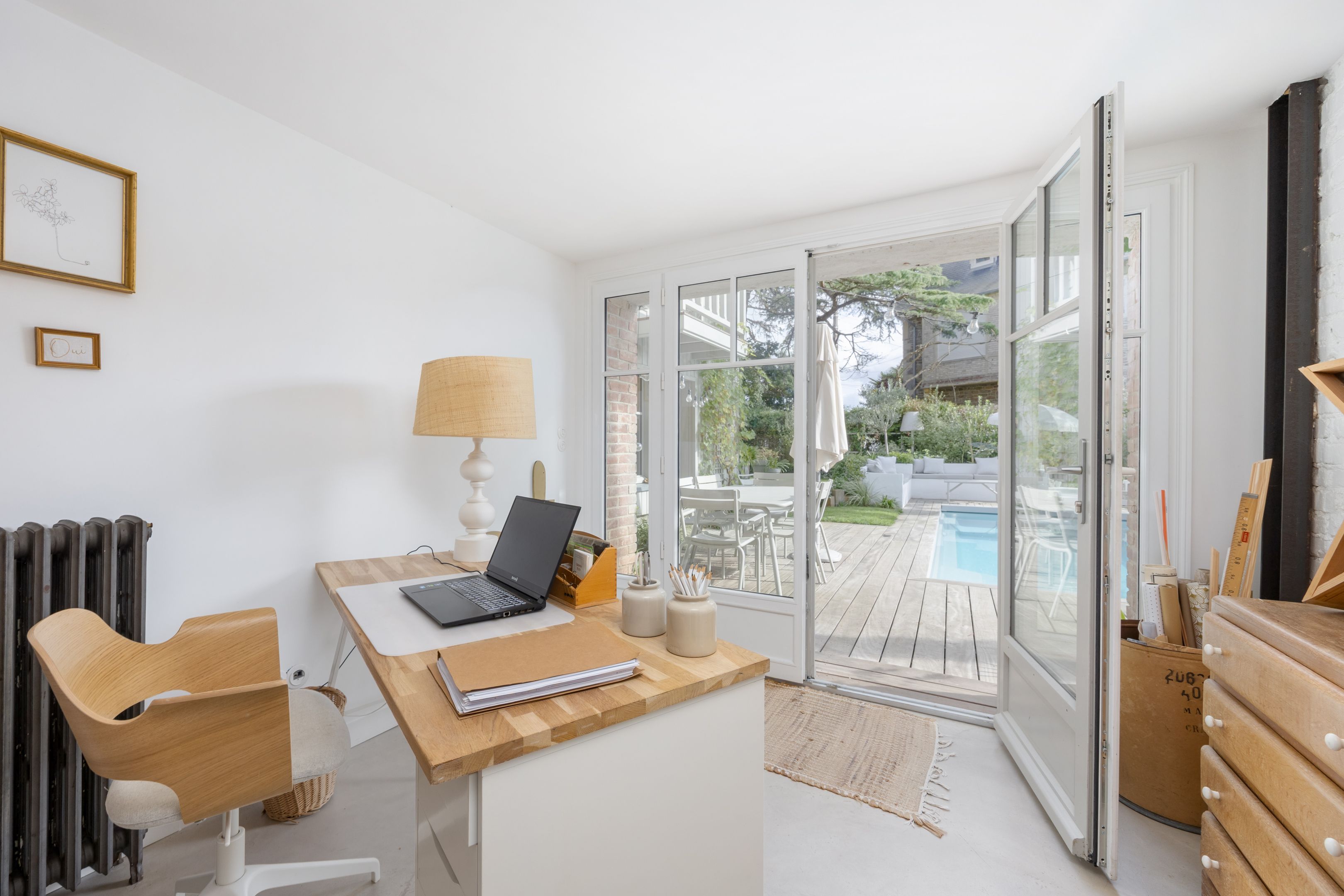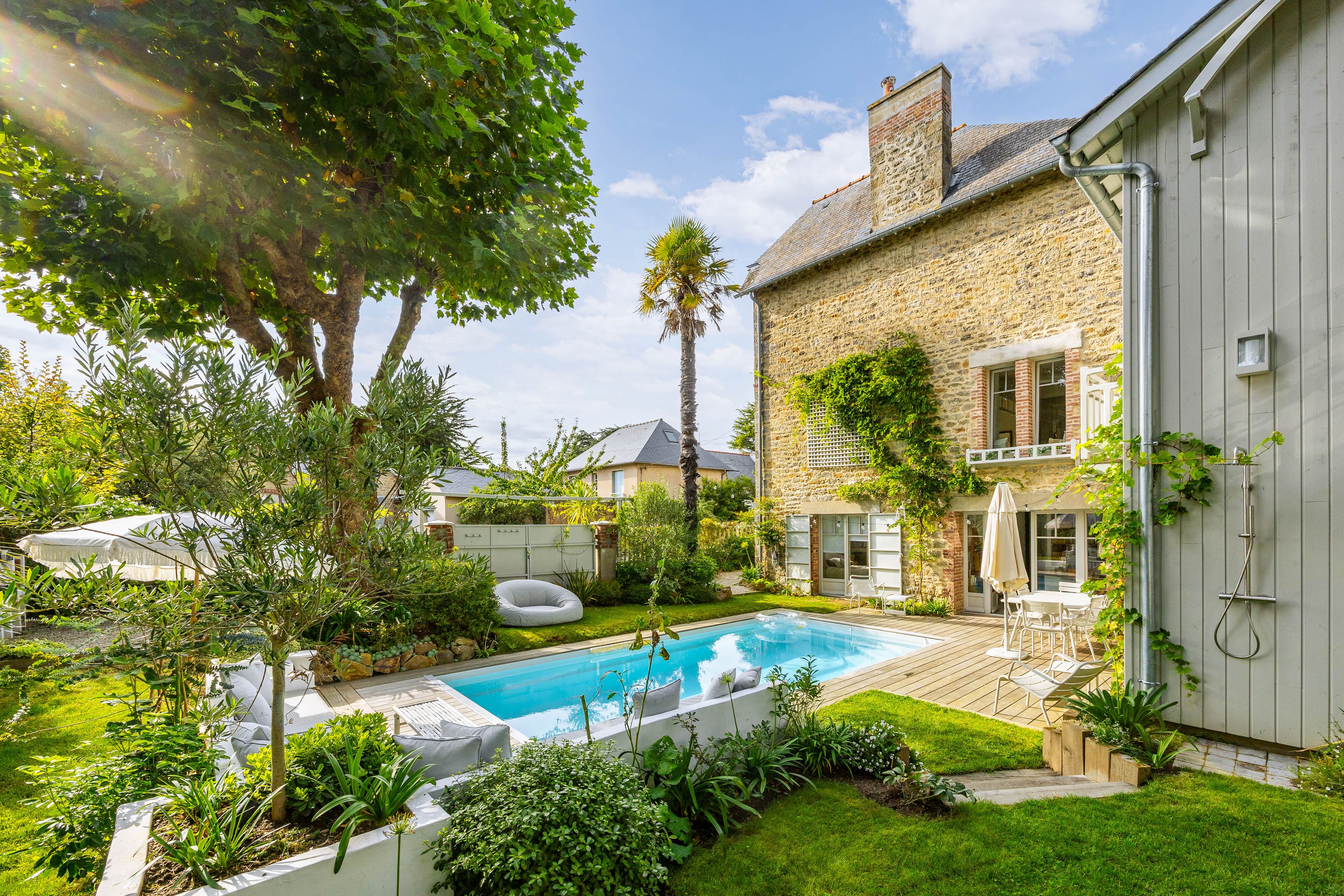 SOLD BY BRETEUIL - Triangle St-Énogat - Malouine - Downtown, only 300m from the beach. Beautiful Dinard-style house in a quiet, sought-after location, renovated to a high standard and ideally exposed. Entrance hall, bright south-west-facing living room with parquet floor, mouldings and fireplace, dining room and fully-equipped kitchen. Upstairs, two comfortable en suite bedrooms. On garden level, with good height, second living room or additional bedroom, summer kitchen, study, two bedrooms, shower room, laundry room and cellar. Magnificent 825m² landscaped garden with swimming pool, flower beds and remarkable trees.