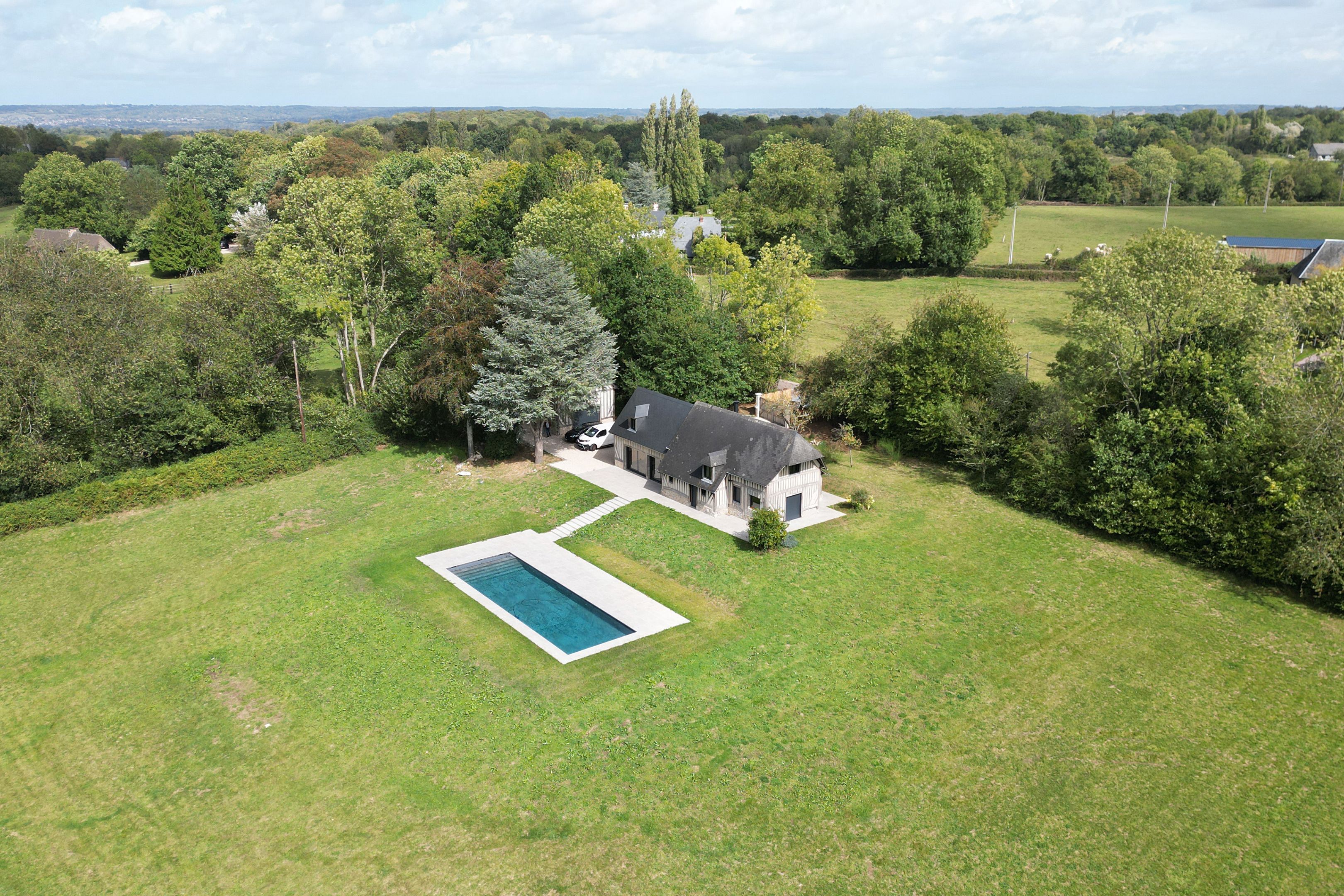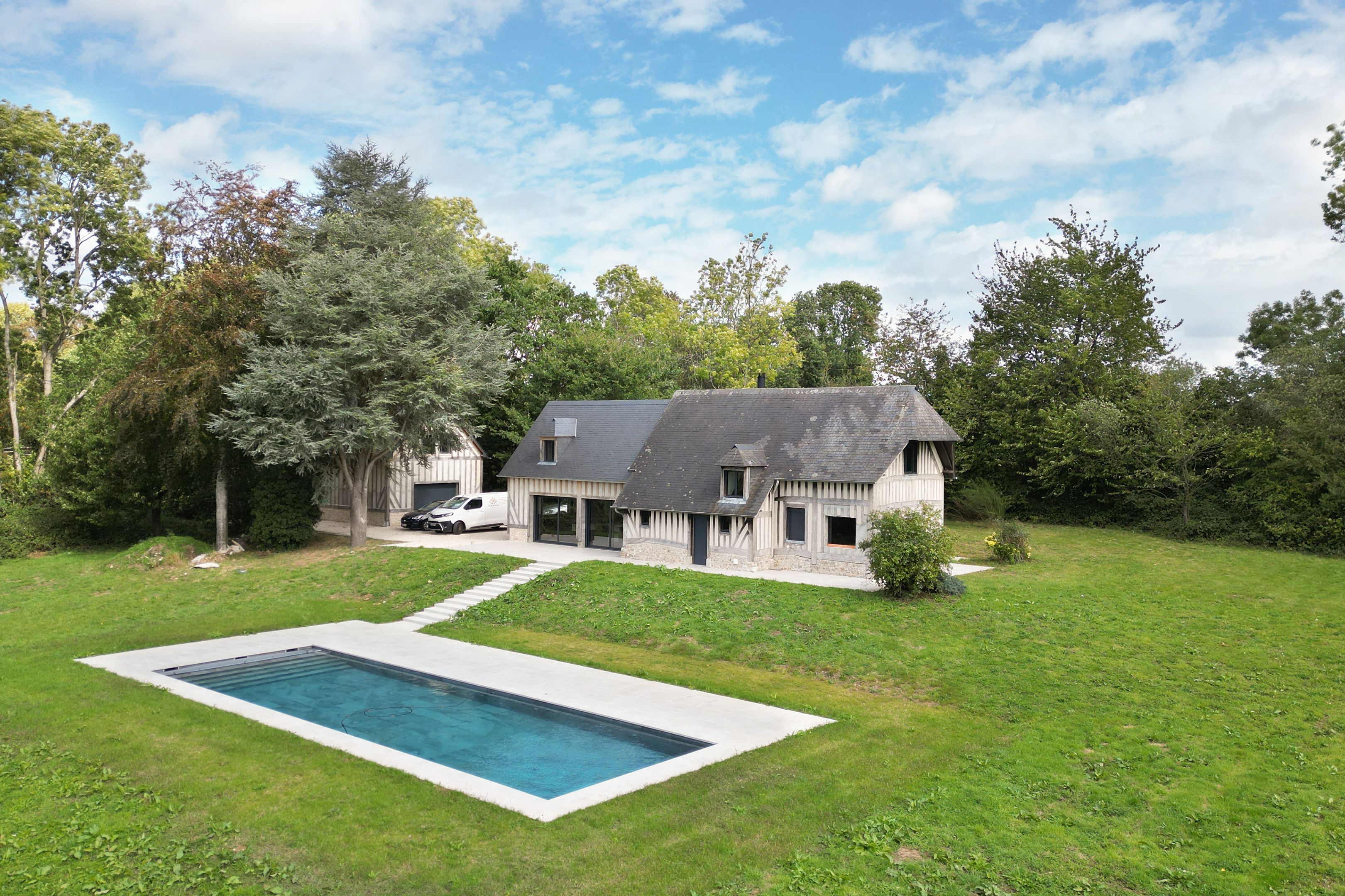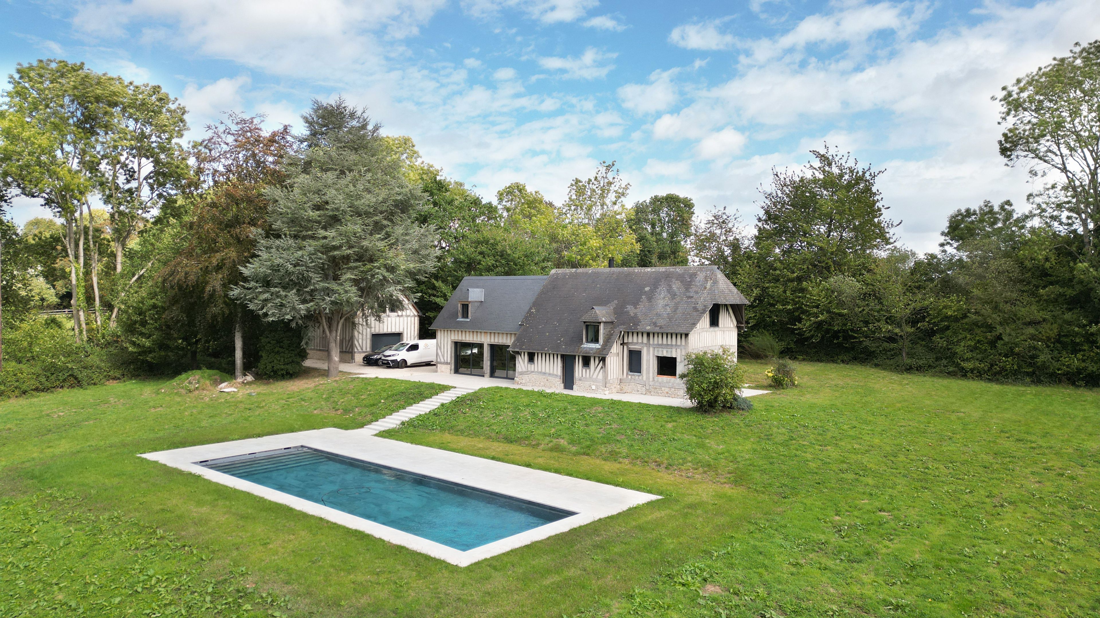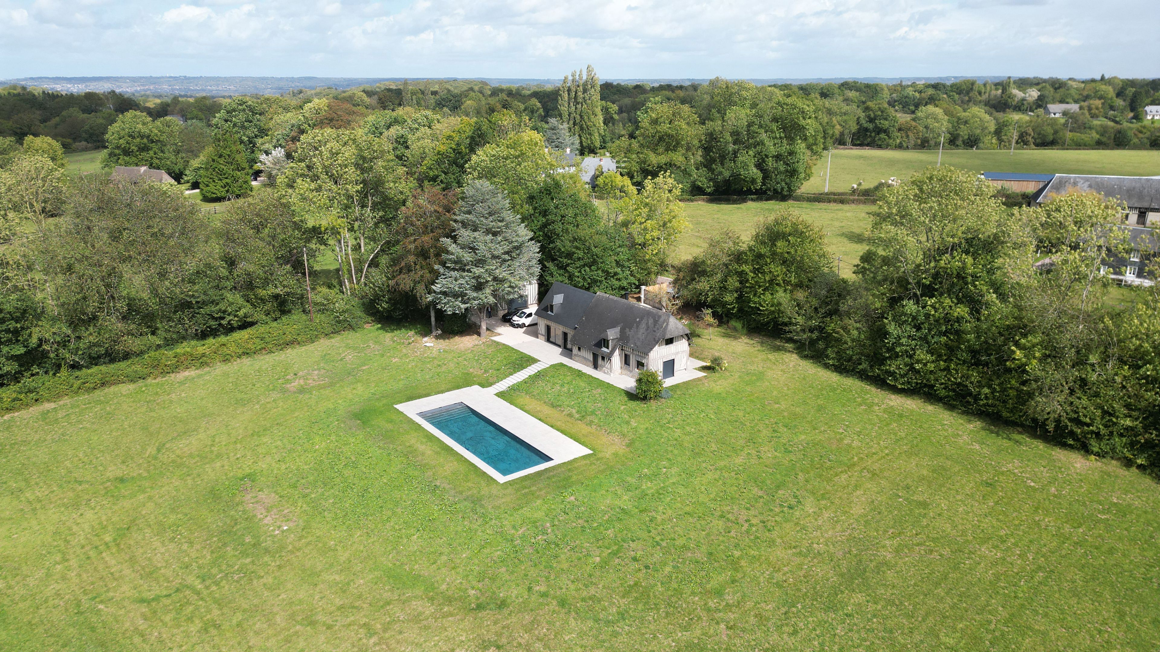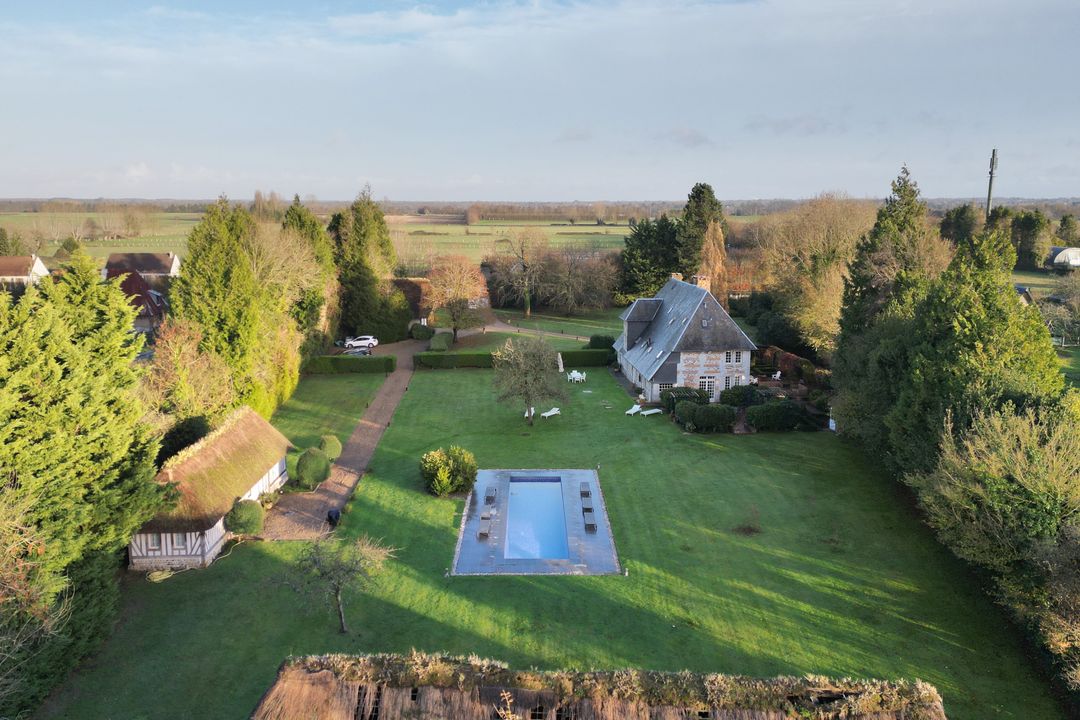 15min from Deauville, beautiful fully renovated longère set in 1 hectare of land. First floor: entrance, living room with fireplace opening onto west-facing terrace, fitted kitchen, bedroom with shower room, guest toilet. First floor: three bedrooms, one with en-suite shower room, separate toilet, shower room. Basement: cellar with laundry room. Outbuilding: large garage, two bedrooms, shower room and separate toilet. Heated 15x5m swimming pool.