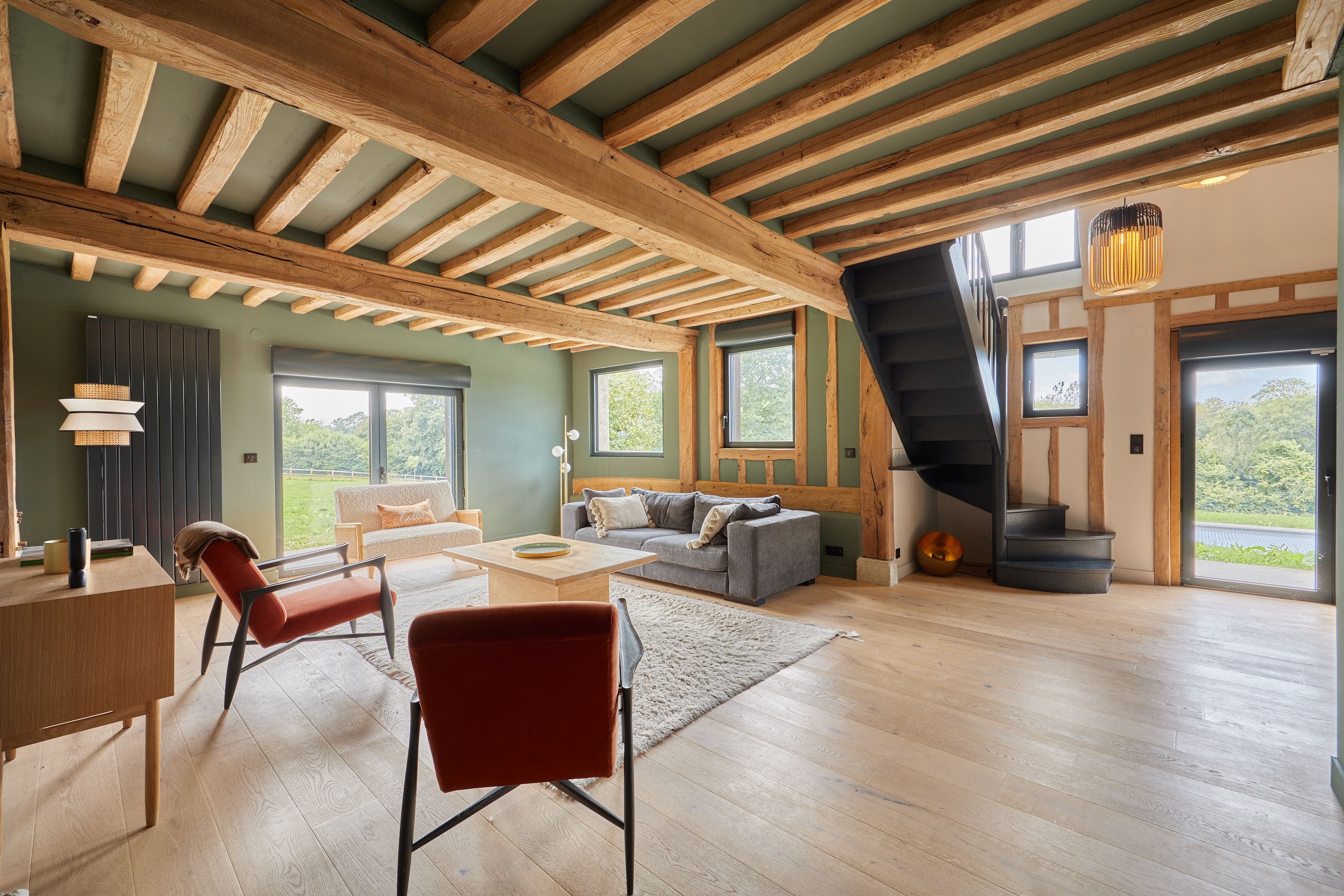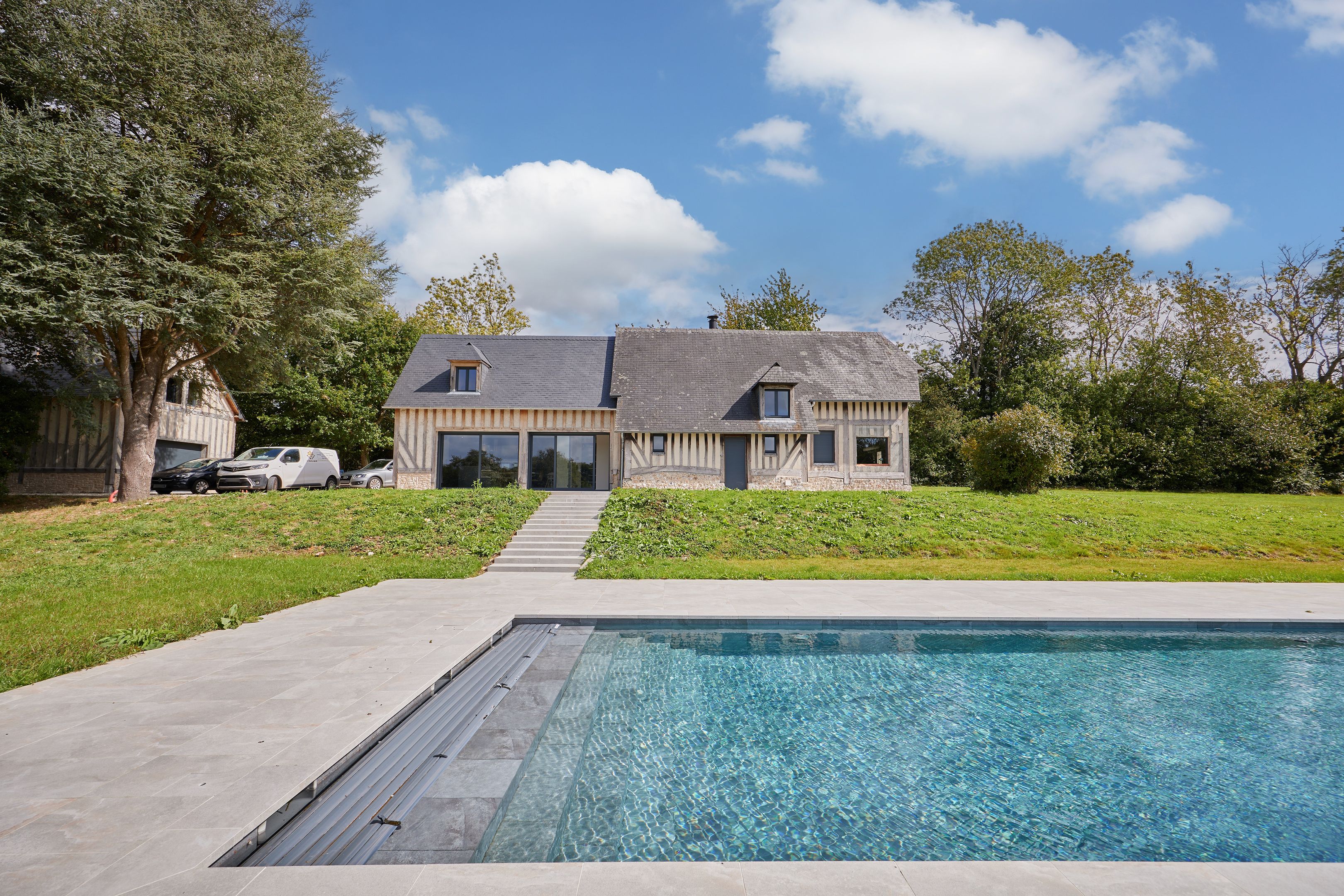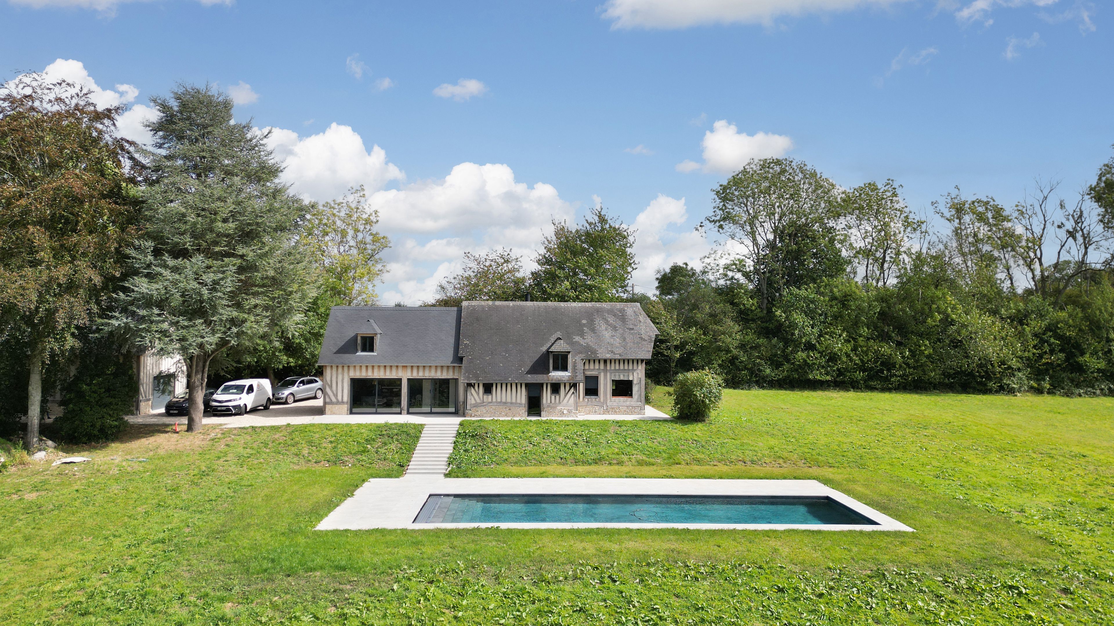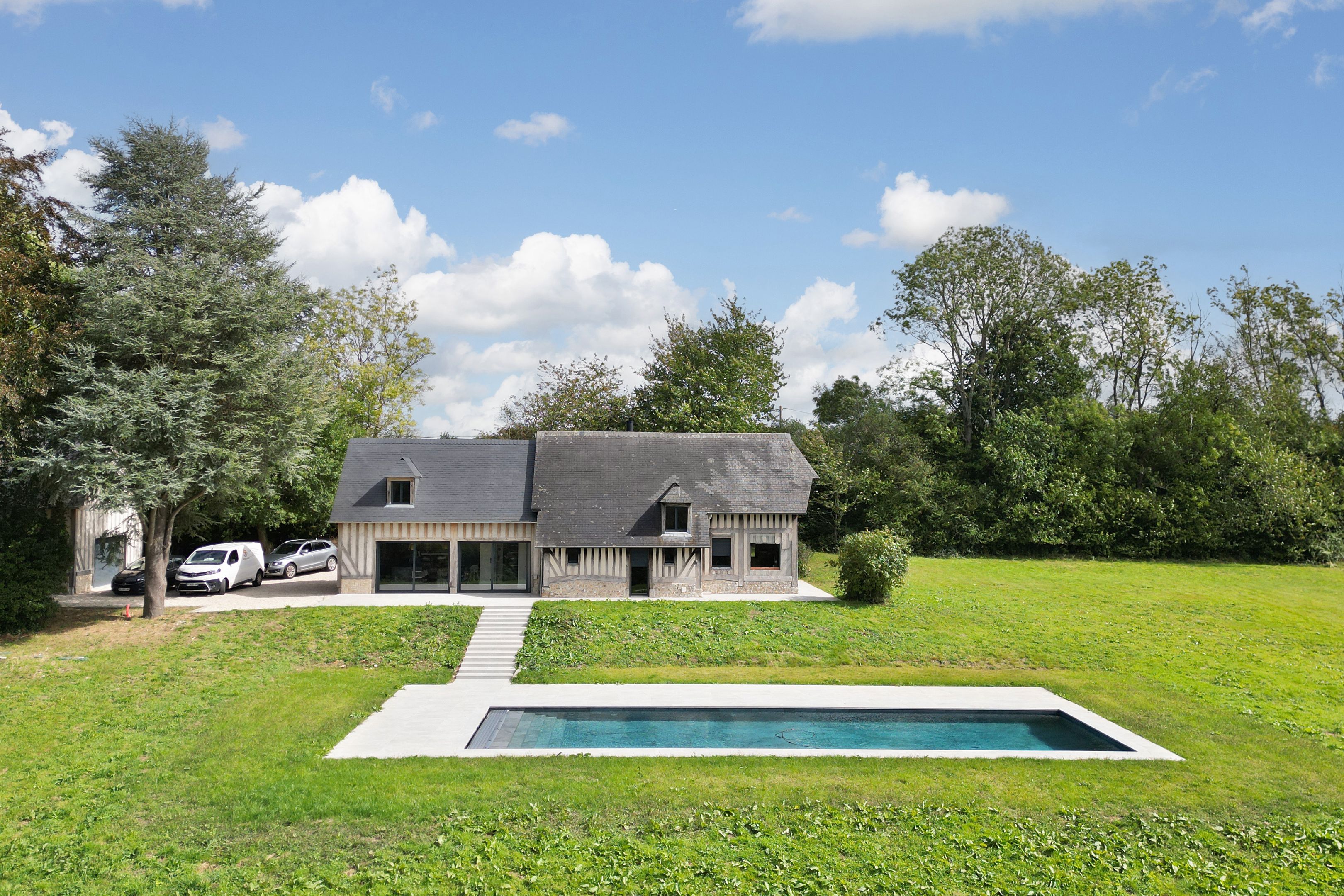 15min from Deauville, beautiful fully renovated longère set in 1 hectare of land. First floor: entrance, living room with fireplace opening onto west-facing terrace, fitted kitchen, bedroom with shower room, guest toilet. First floor: three bedrooms, one with en-suite shower room, separate toilet, shower room. Basement: cellar with laundry room. Outbuilding: large garage, two bedrooms, shower room and separate toilet. Heated 15x5m swimming pool.