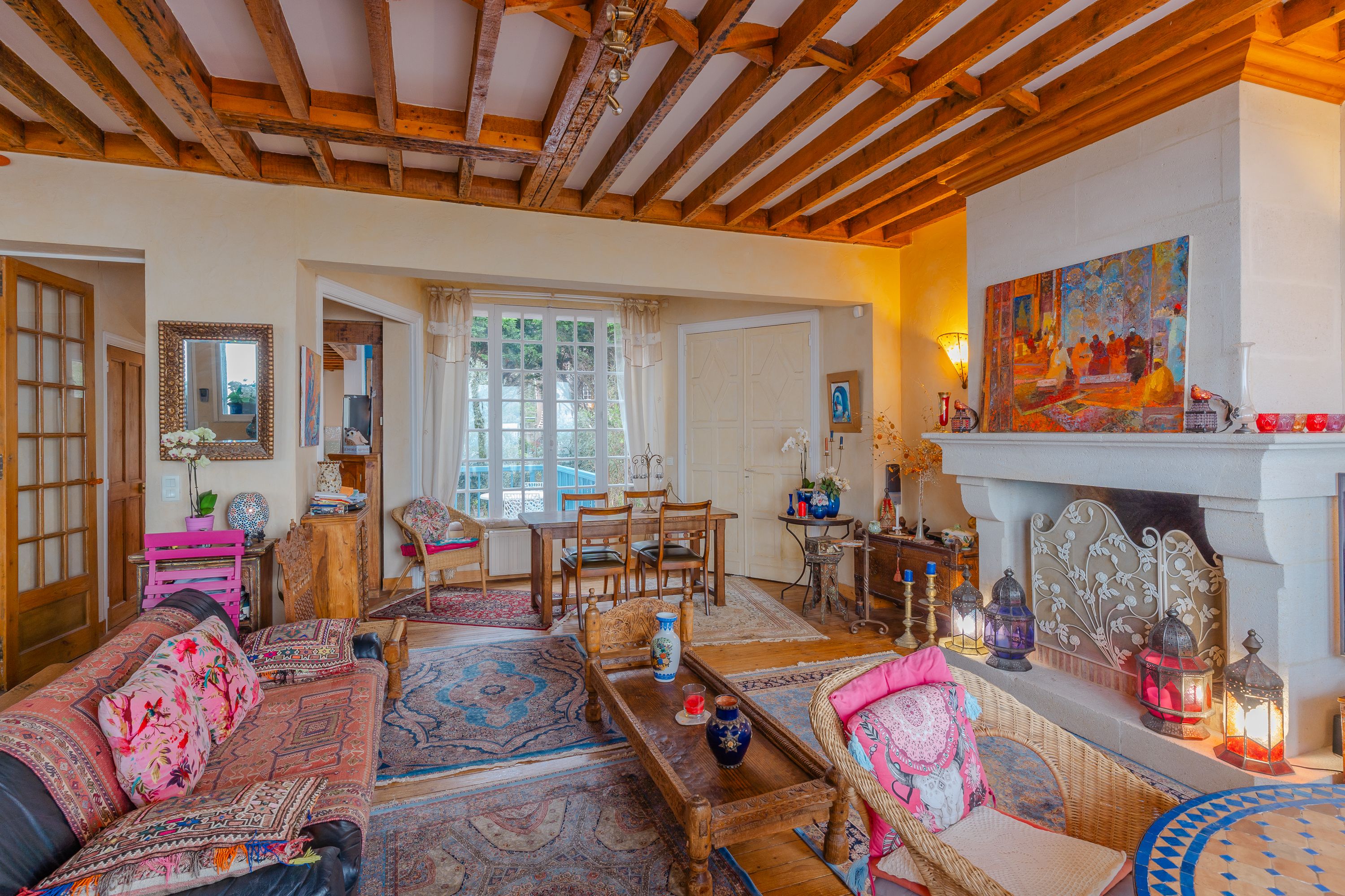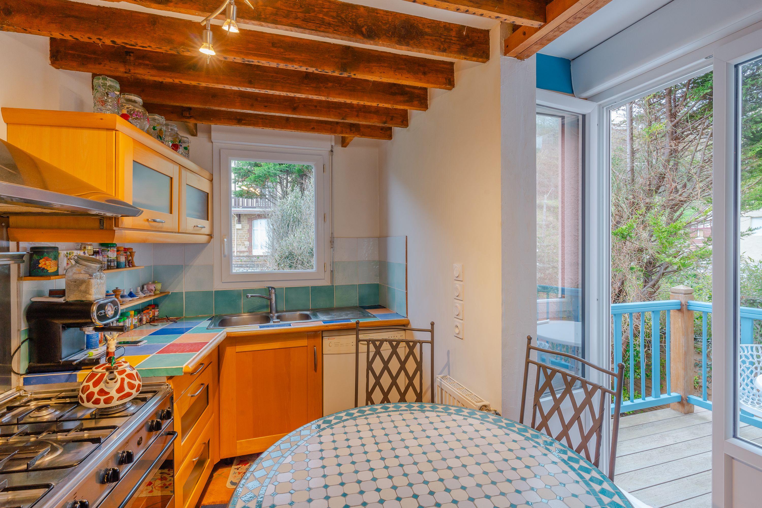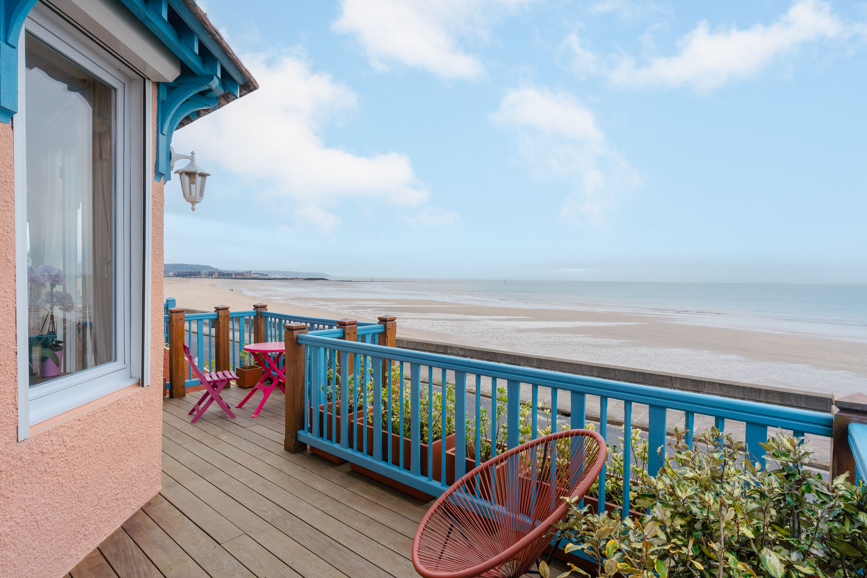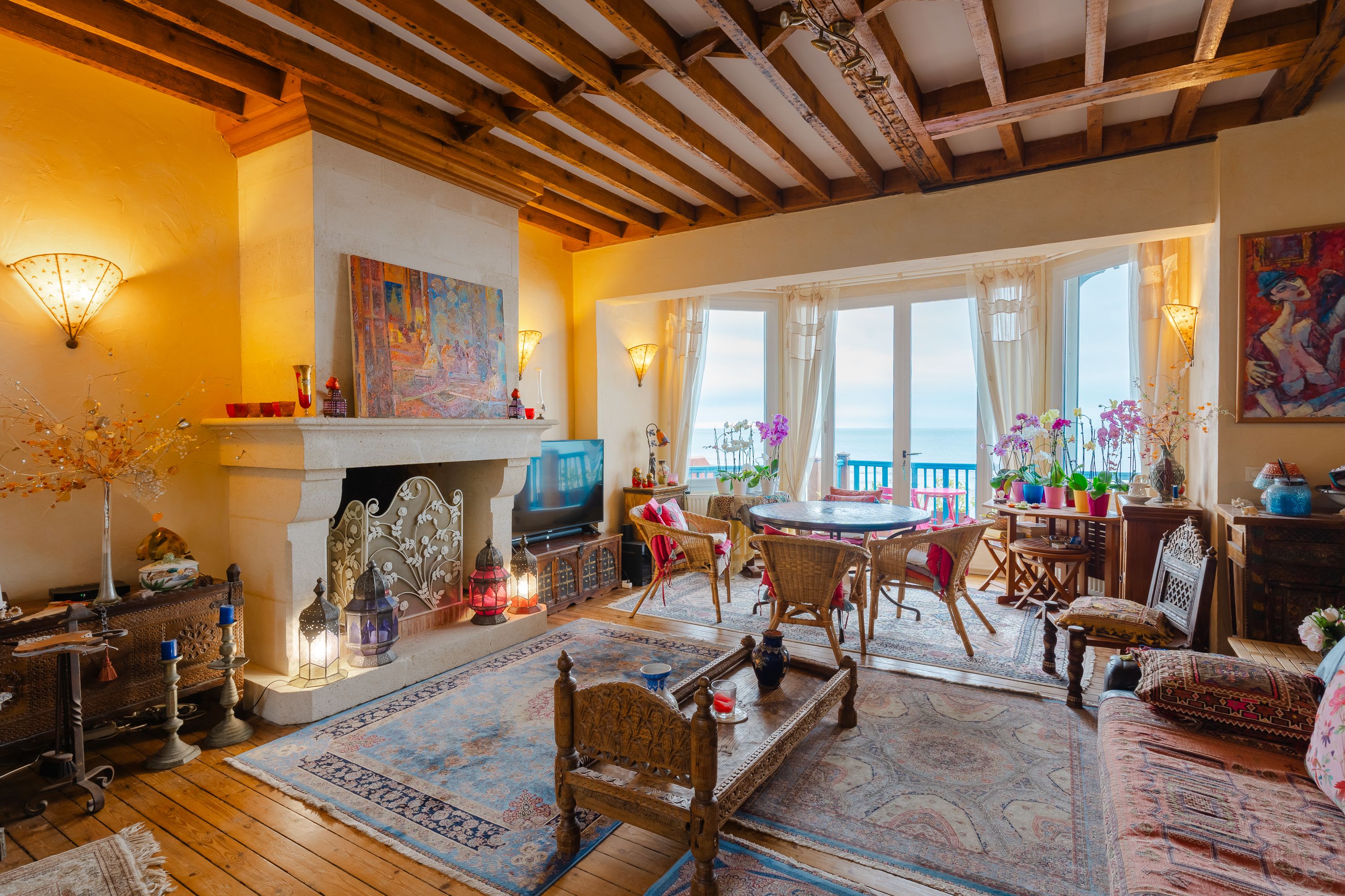 Exceptional location, a stone's throw from the Roches Noires beach, house offering panoramic sea views. On 5 levels: living/dining room with functional fireplace and west-facing terrace, open kitchen, five bedrooms, three bathrooms, laundry room. Car parking available. West-facing front courtyard, east-facing rear garden.