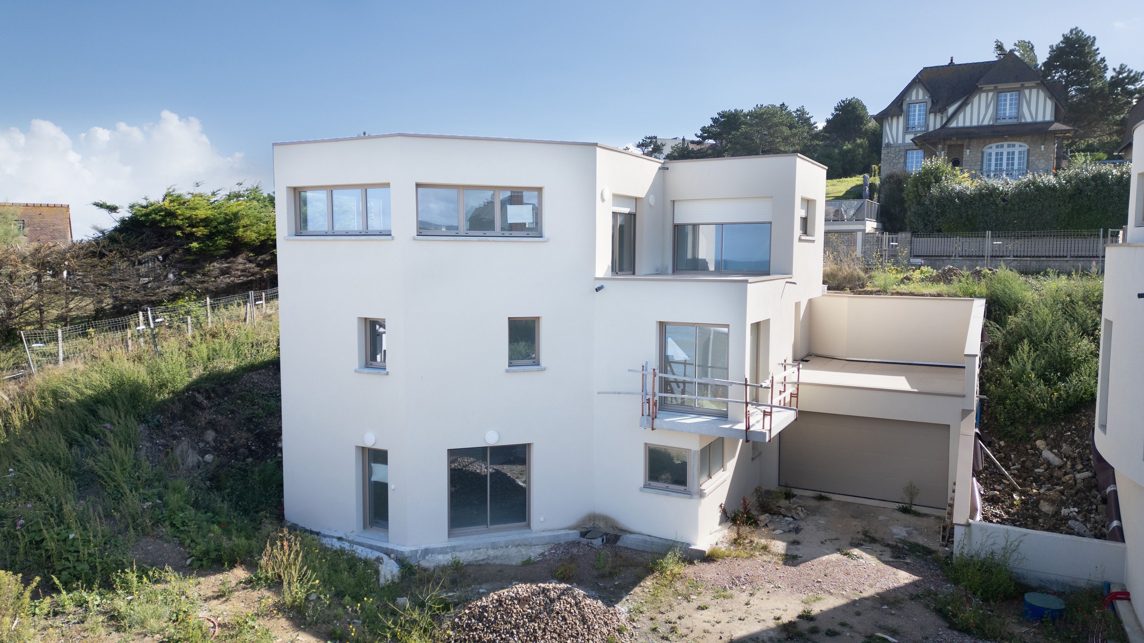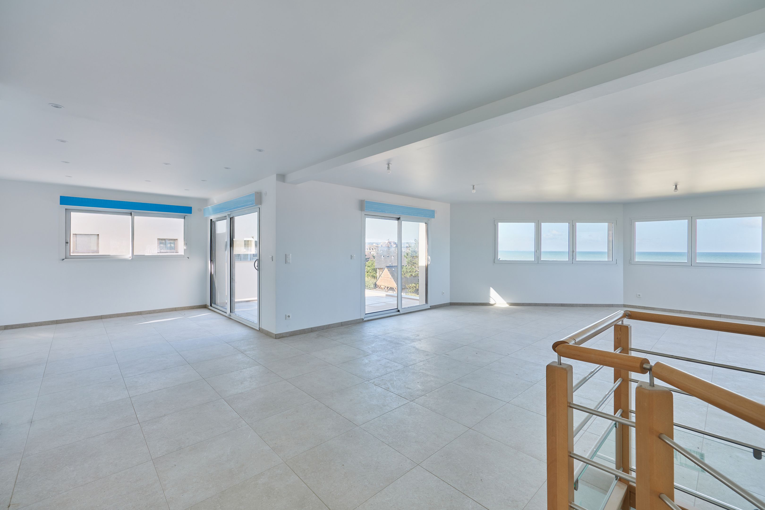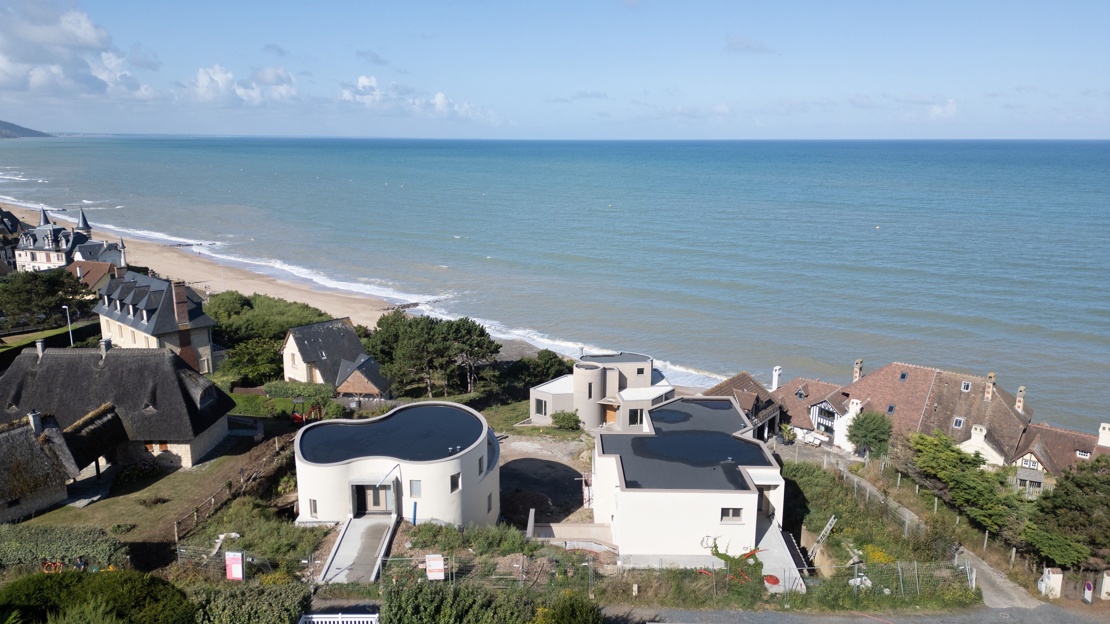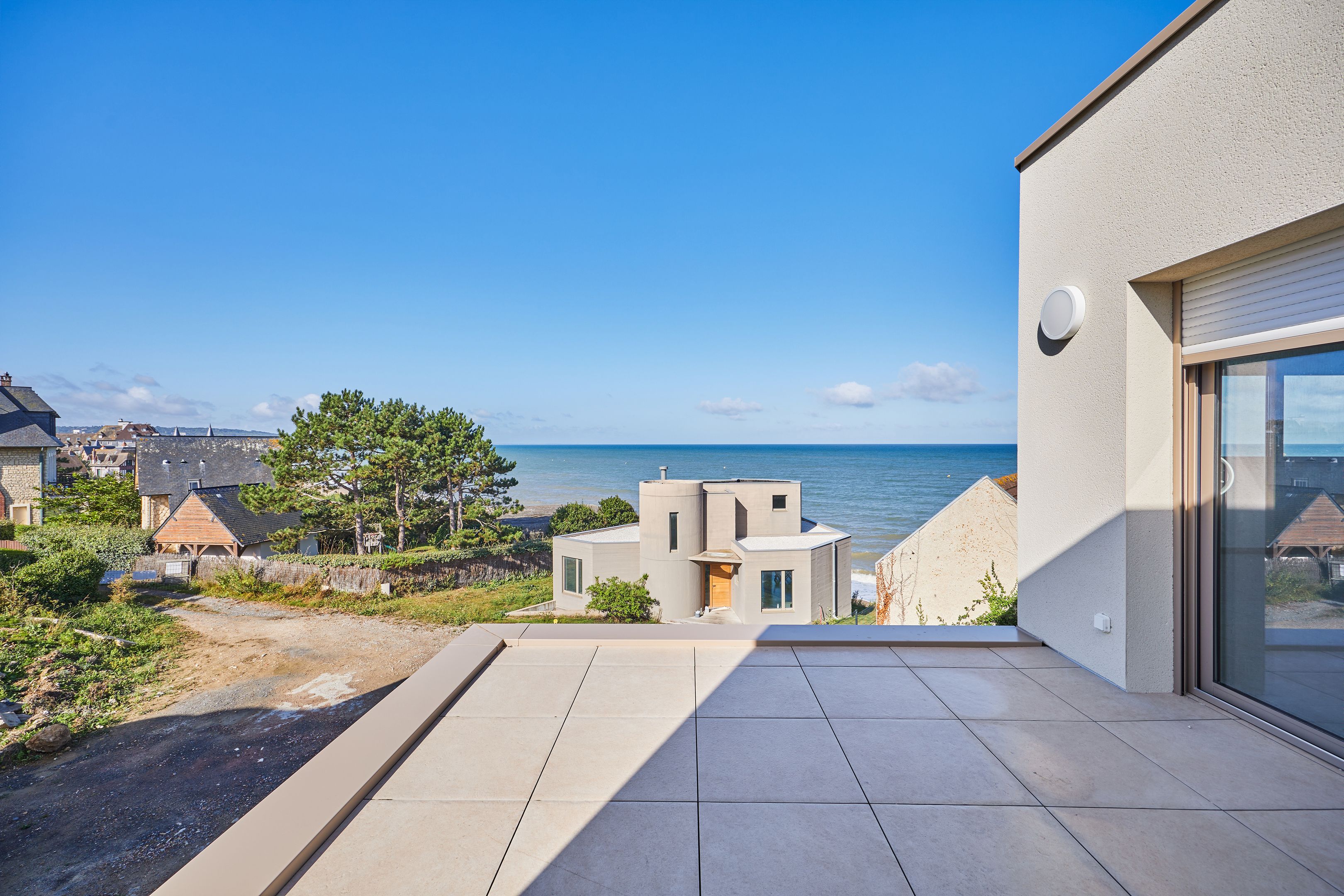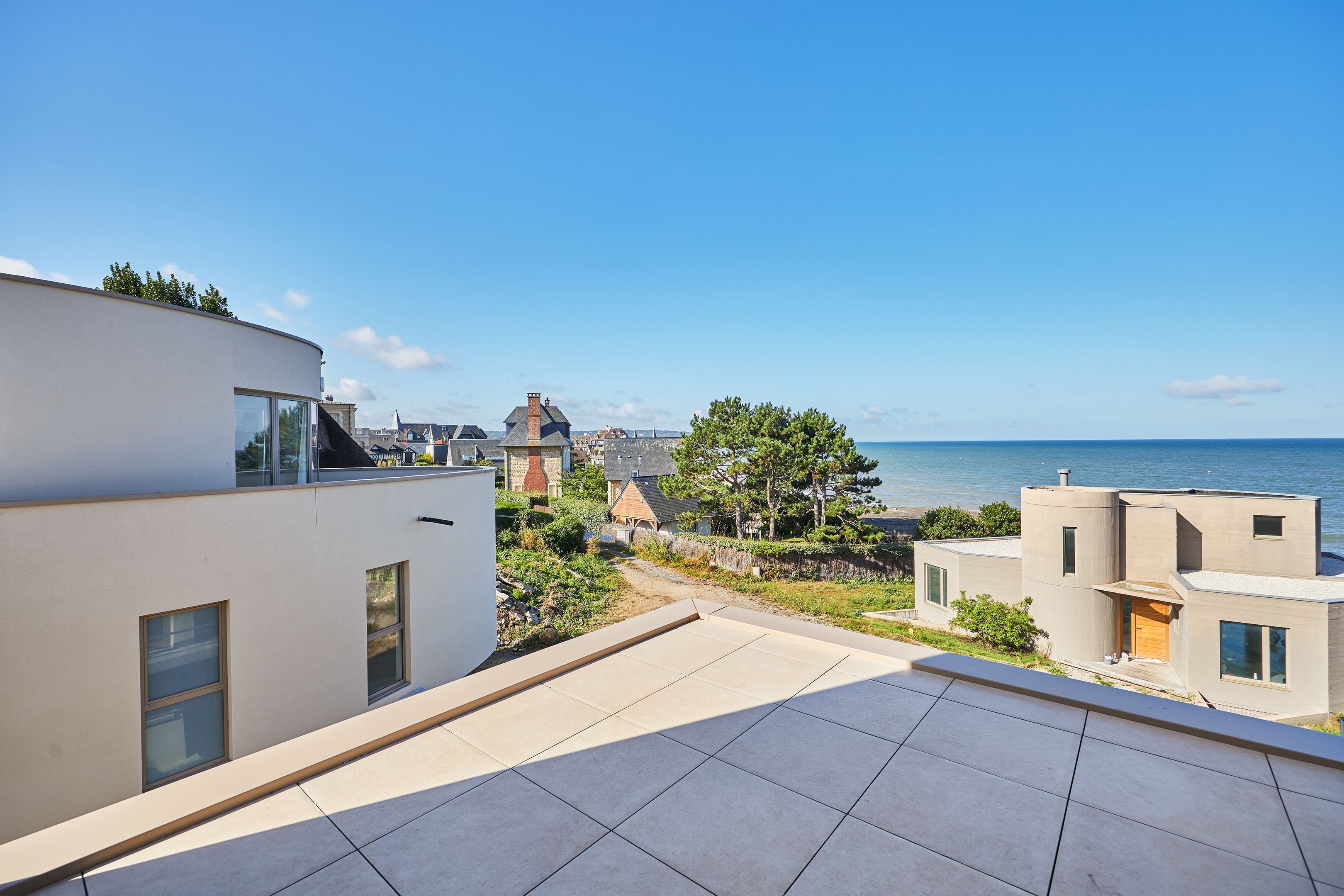 Exceptional location with direct beach access, 400m from shops in Blonville-sur-Mer, magnificent contemporary property. Designed to provide independence for 2 families, first floor: entrance hall, living room, open kitchen, master suite including bathroom, toilet, dressing room; garage. 1st floor: north wing: landing leading to two bedrooms with sea views, one with balcony, shower room with toilet; south wing: two bedrooms with shared terrace, laundry room, bathroom, separate toilet. On the 2nd floor, with separate entrance: 70m2 reception room with panoramic sea view, opening onto a 14m2 west-facing terrace, open kitchen, guest toilet, master suite with bathroom. 4 private outdoor parking spaces.
