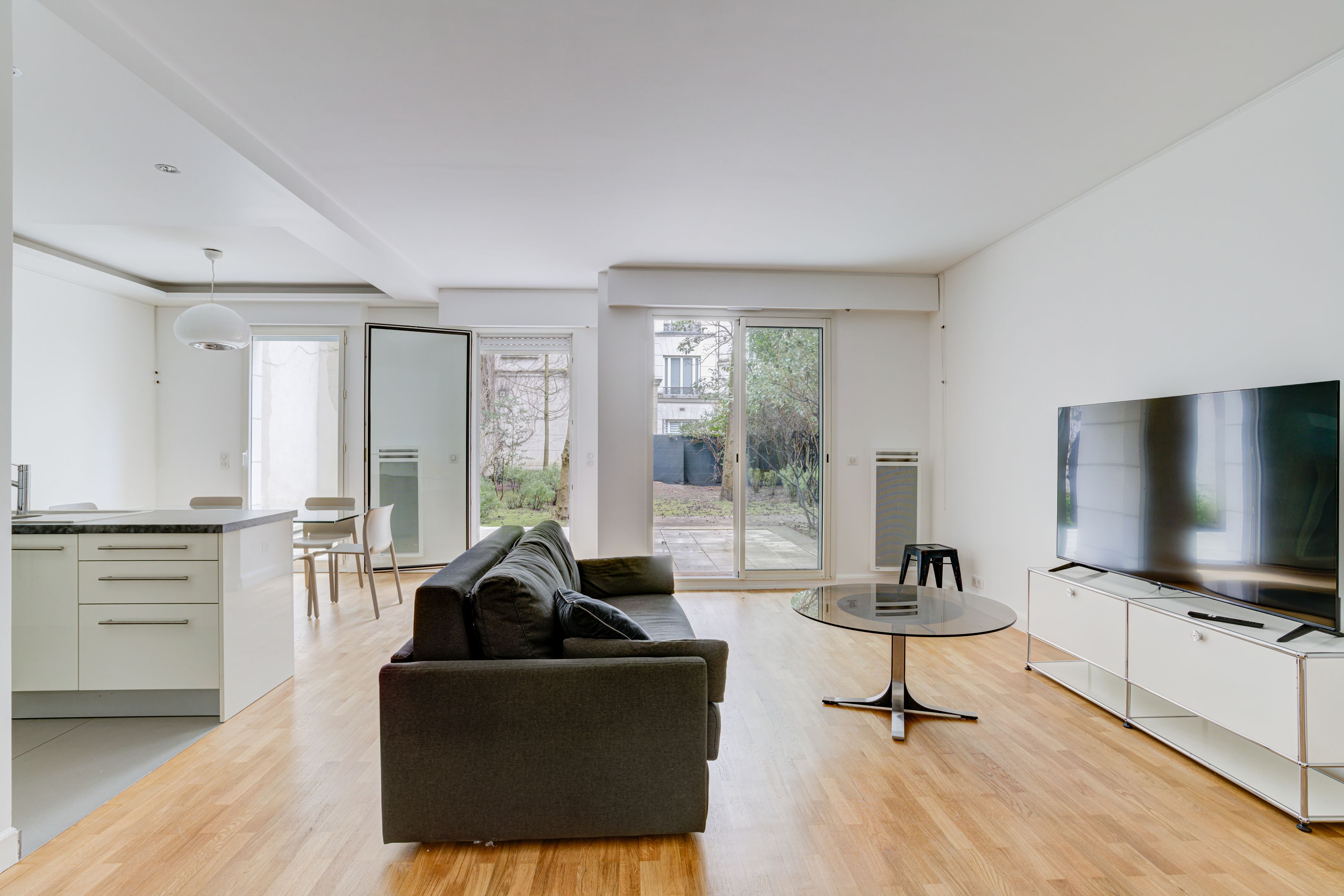Dans un immeuble moderne en parfait état, appartement de deux pièces et 64 m², meublé, en rez-de-jardin, avec jardin privatif. Entrée, séjour avec terrasse et jardin arboré, cuisine ouverte aménagée et équipée, chambre avec placards, salle de bains et toilettes séparées. Cave au sous-sol.