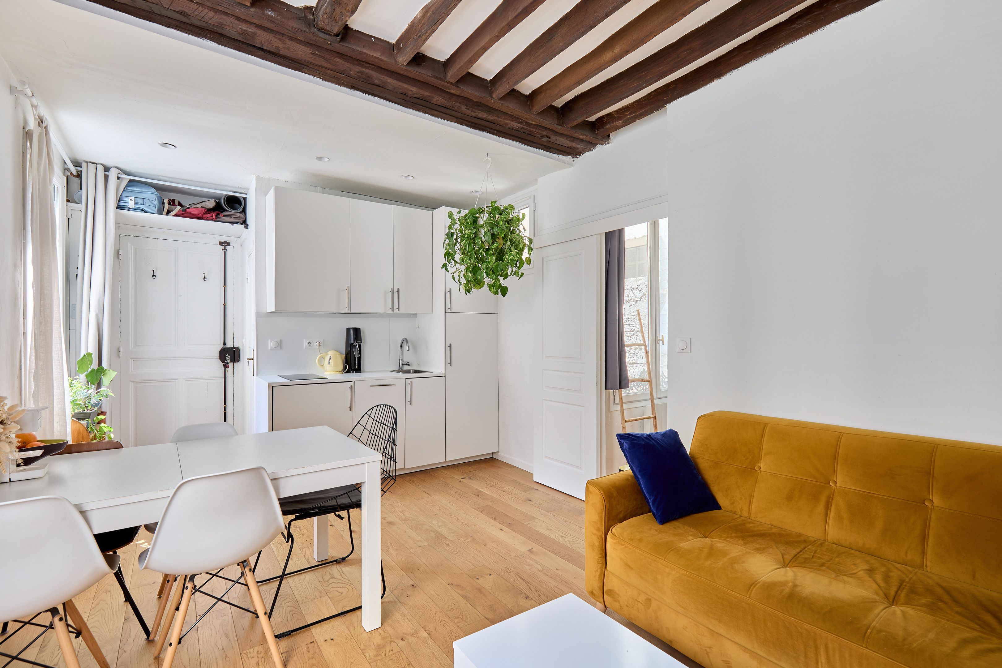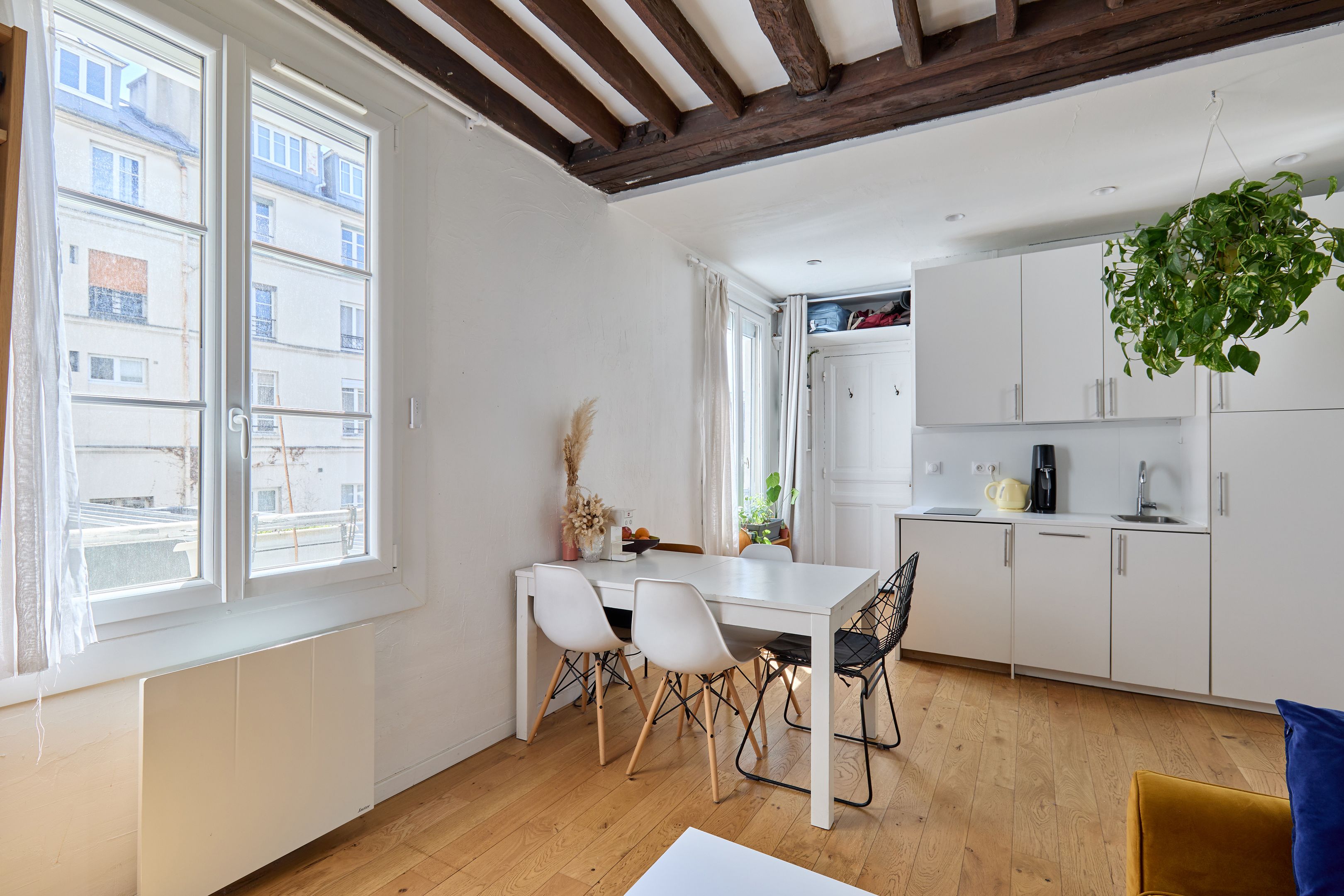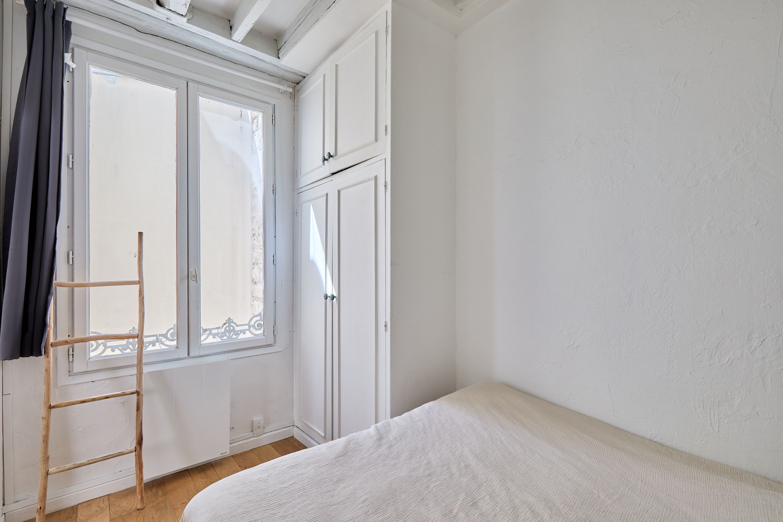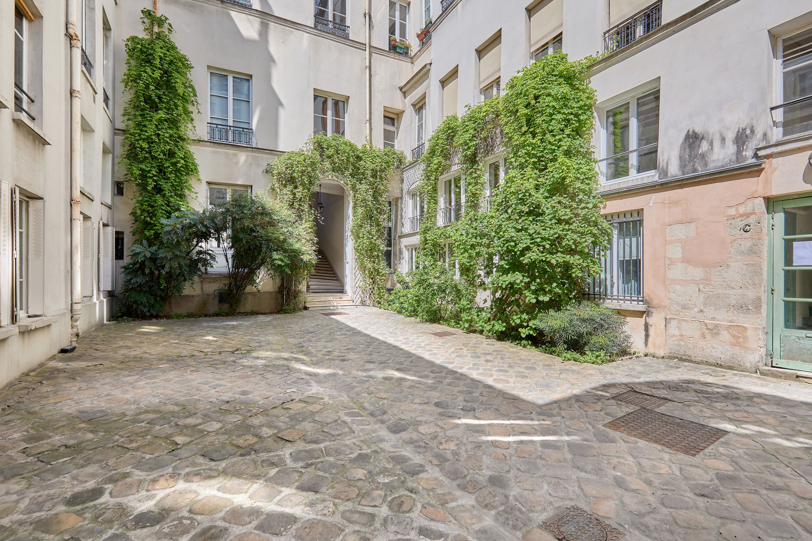 Immeuble de 1700 proche de la rue de Bretagne, au calme absolu. Appartement de deux pièces en excellent état, au 2ème étage desservi par escalier. Entrée, séjour orienté sud-est sur cour calme et dégagée, cuisine ouverte aménagée et équipée, espace nuit avec dressing, salle d'eau avec toilettes. Deux débarras. Gardien.