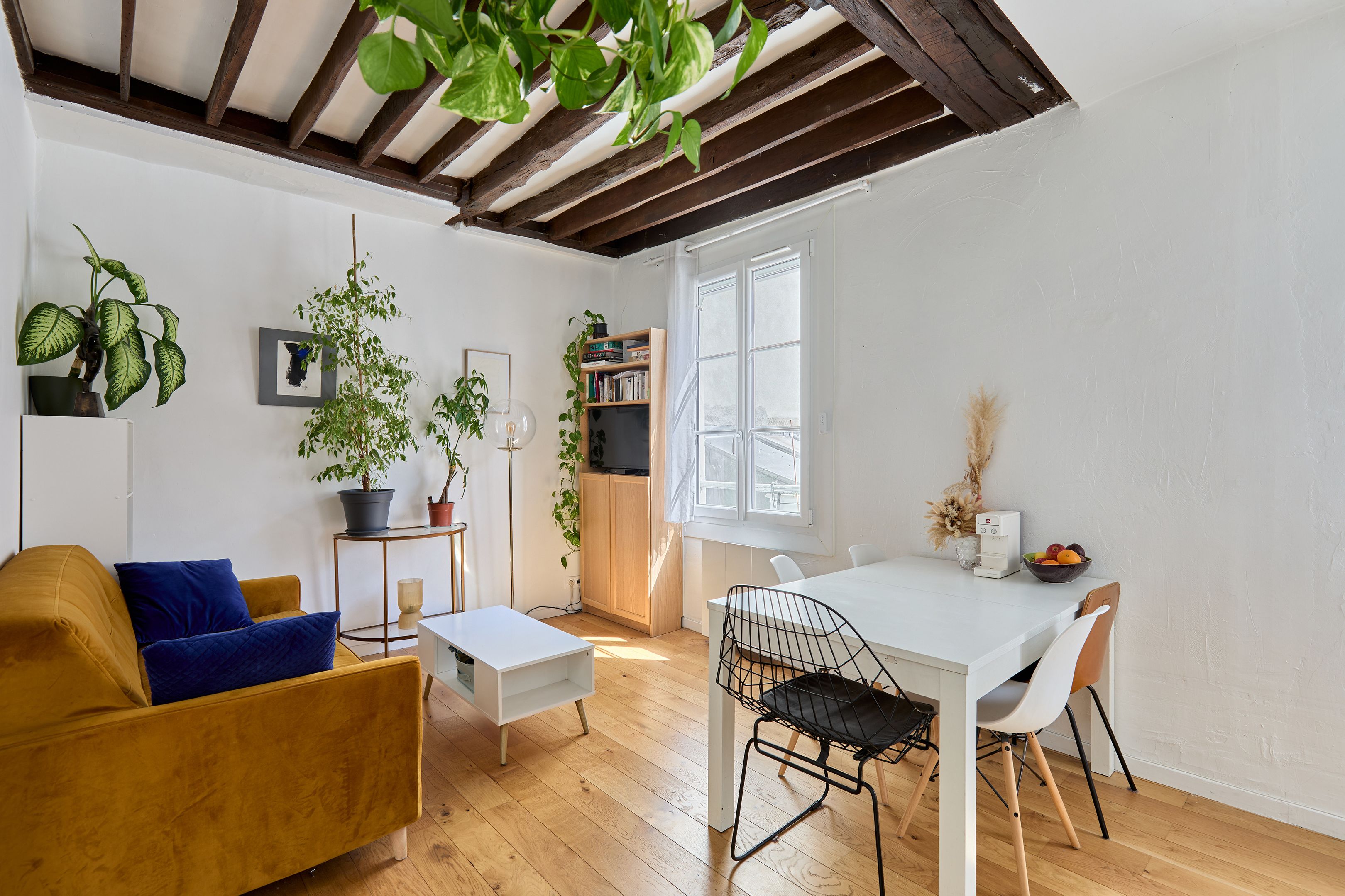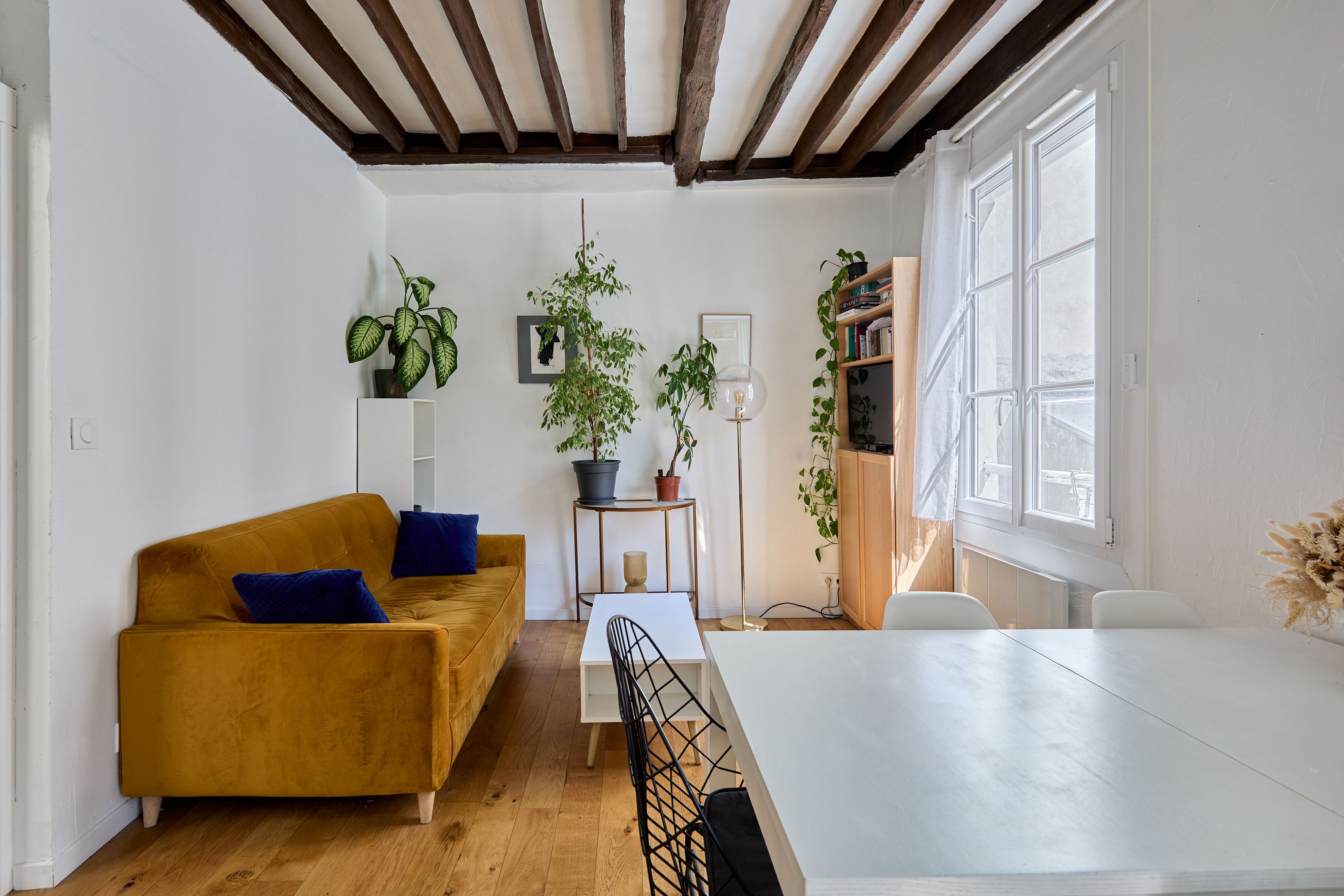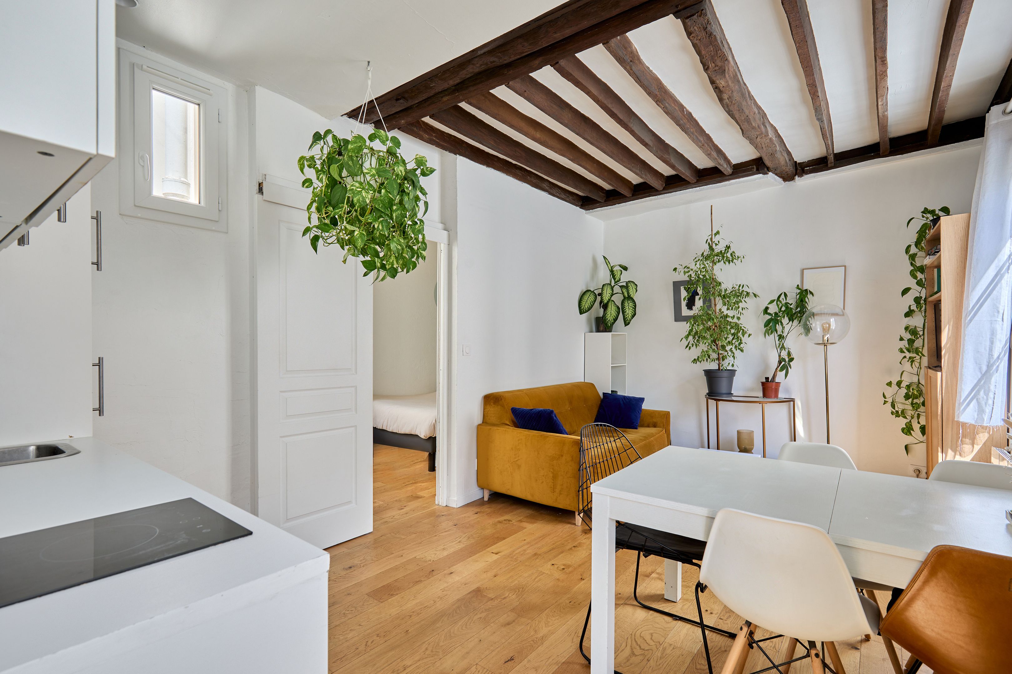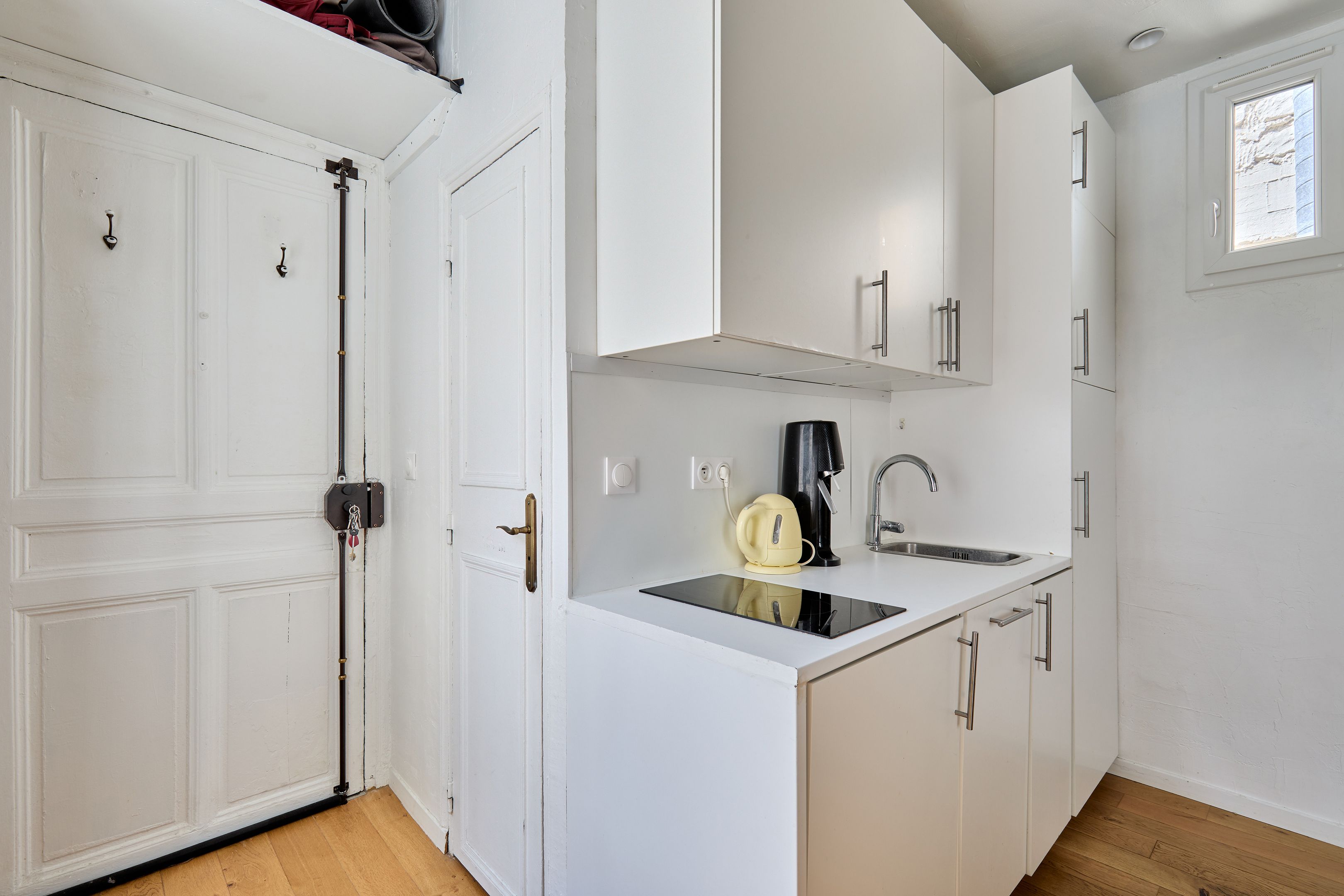 Immeuble de 1700 proche de la rue de Bretagne, au calme absolu. Appartement de deux pièces en excellent état, au 2ème étage desservi par escalier. Entrée, séjour orienté sud-est sur cour calme et dégagée, cuisine ouverte aménagée et équipée, espace nuit avec dressing, salle d'eau avec toilettes. Deux débarras. Gardien.