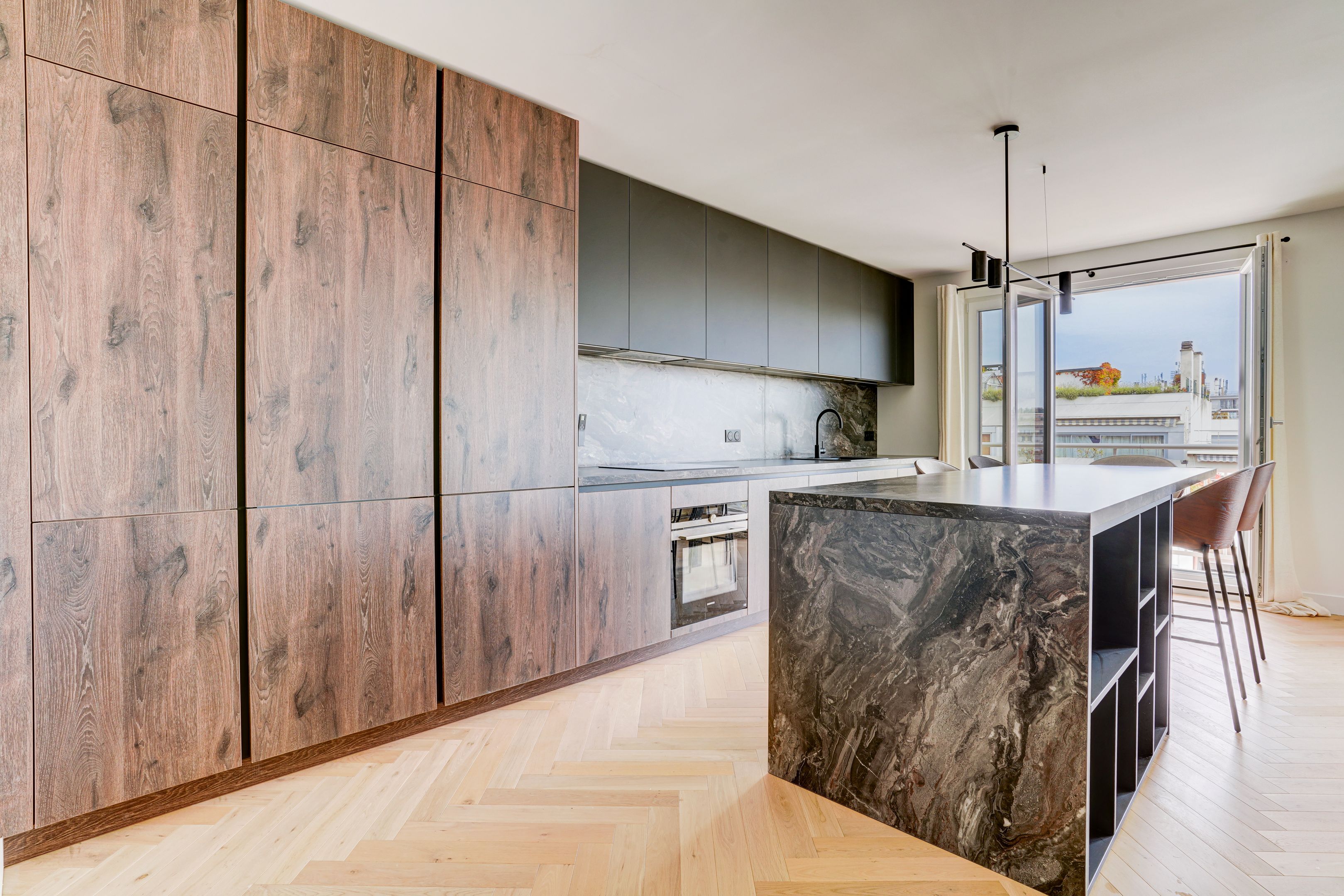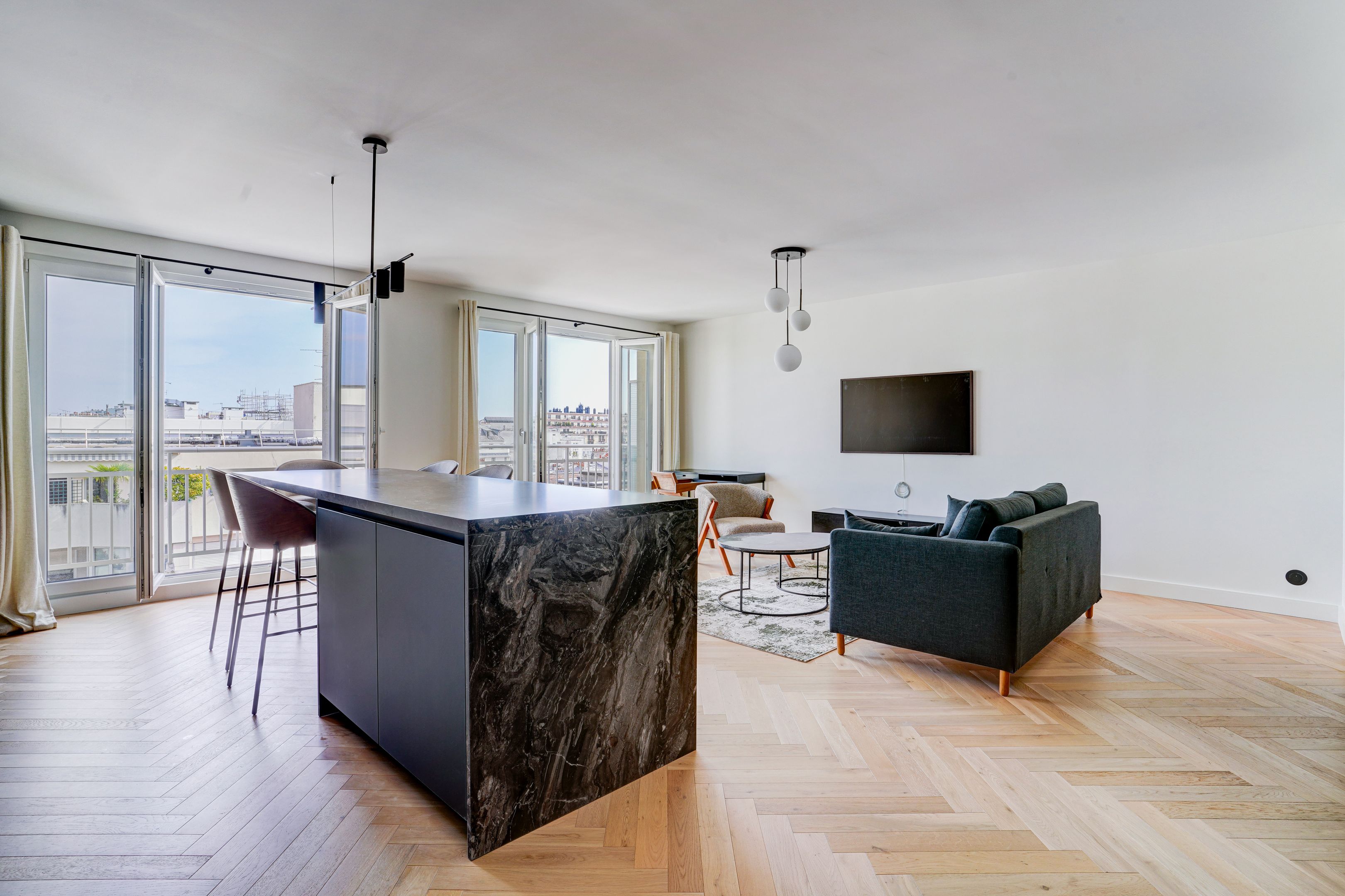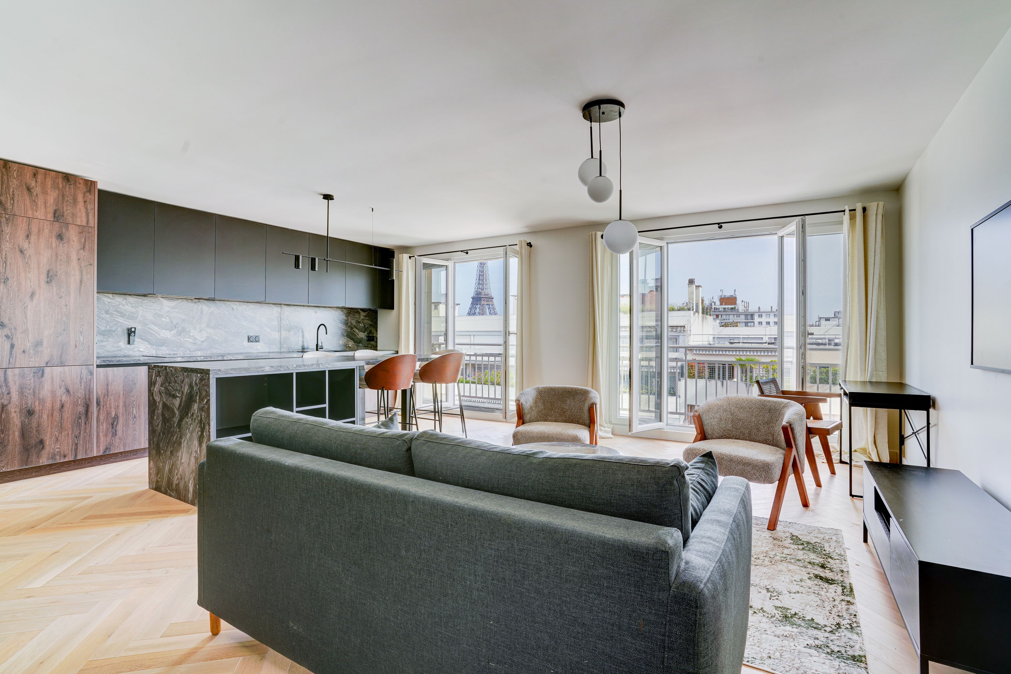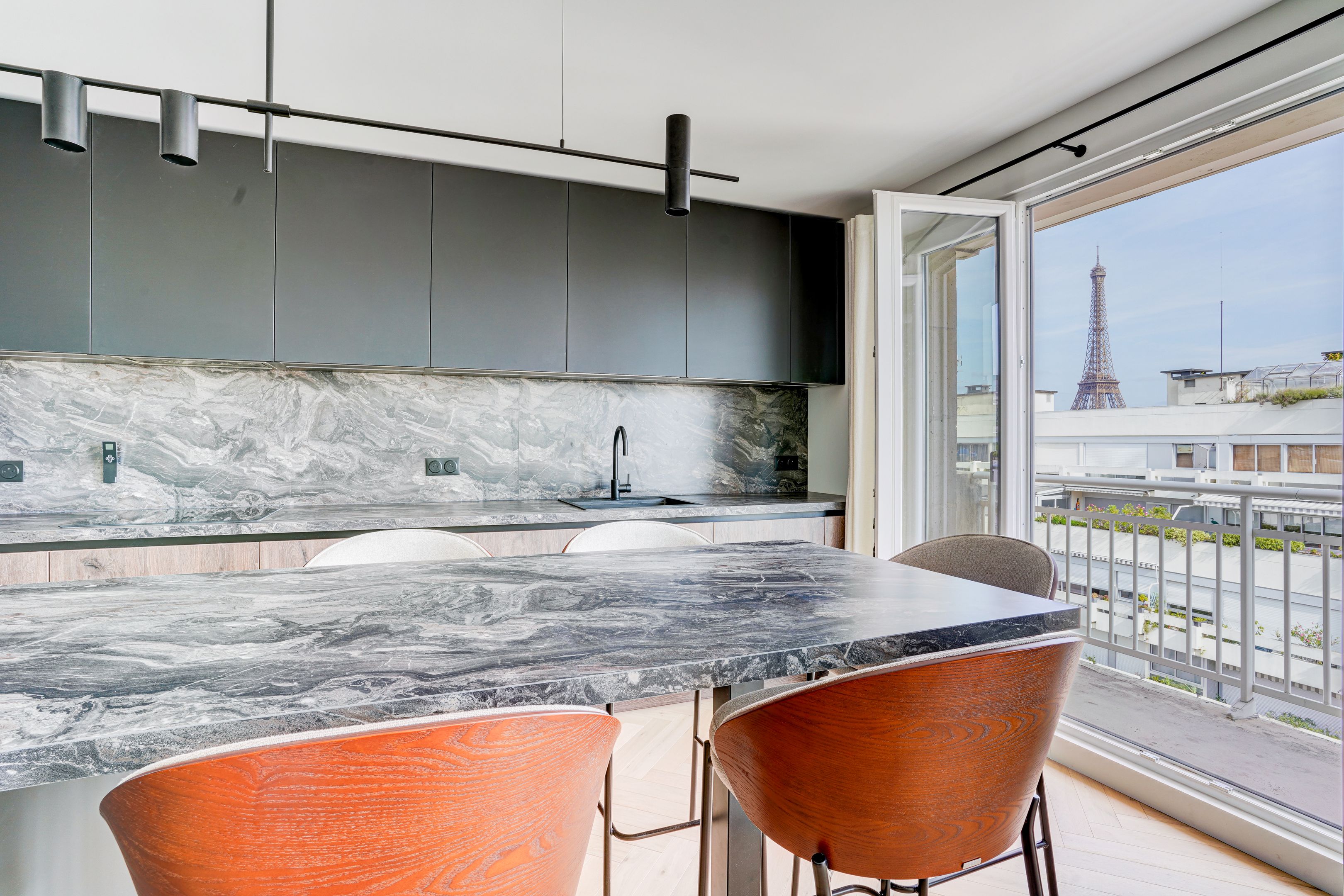 Au cœur du quartier Commerce, immeuble semi-récent de standing profitant des services d’un gardien, au 8ème étage desservi par ascenseur, appartement meublé de 65m2 ayant bénéficié d’une très belle rénovation haut de gamme et doté d’un large balcon de 7m2 environ et de vues totalement dégagées sur les toits de Paris, la tour Eiffel et le dôme des Invalides. Entrée, vaste séjour avec cuisine équipée agrémentée d’un ilot central, suite parentale avec salle de douches et dressing, toilettes indépendantes incluant coin buanderie.