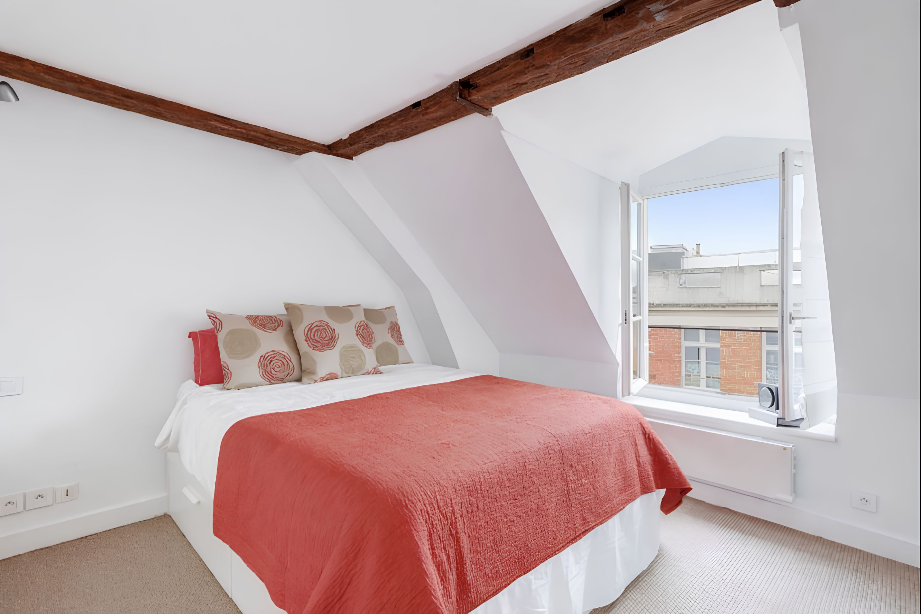 Bel immeuble typique du Marais, au 5ème étage sans ascenseur, desservi par un large escalier.