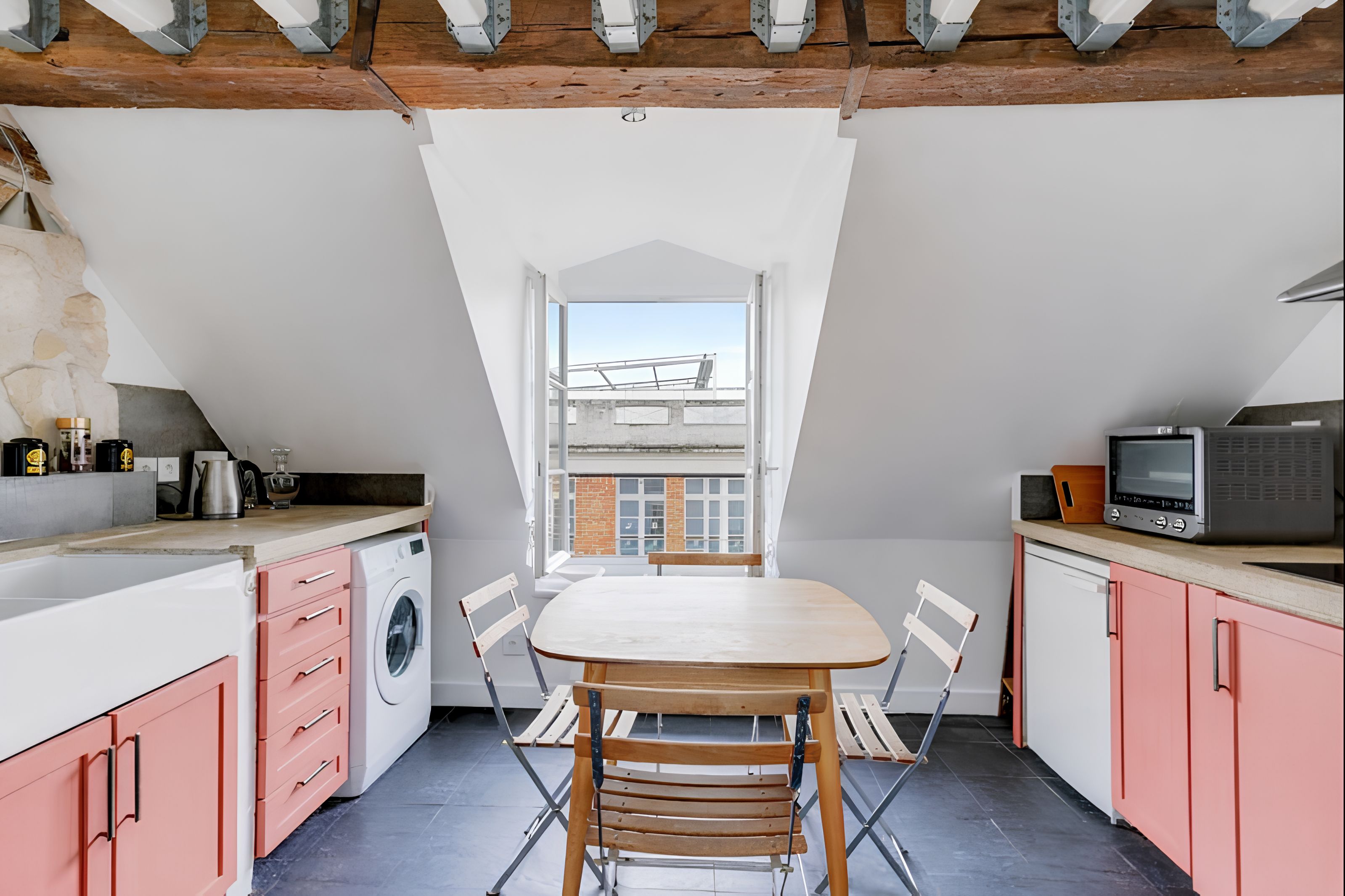 Joli appartement en duplex loué meublé comprenant une entrée, une pièce de réception bénéficiant d’une vue dégagée sur cour, une cuisine ouverte aménagée et équipée, une chambre avec sa salle de douches privative, un espace bureau sous mezzanine, ainsi qu’un grand débarras.