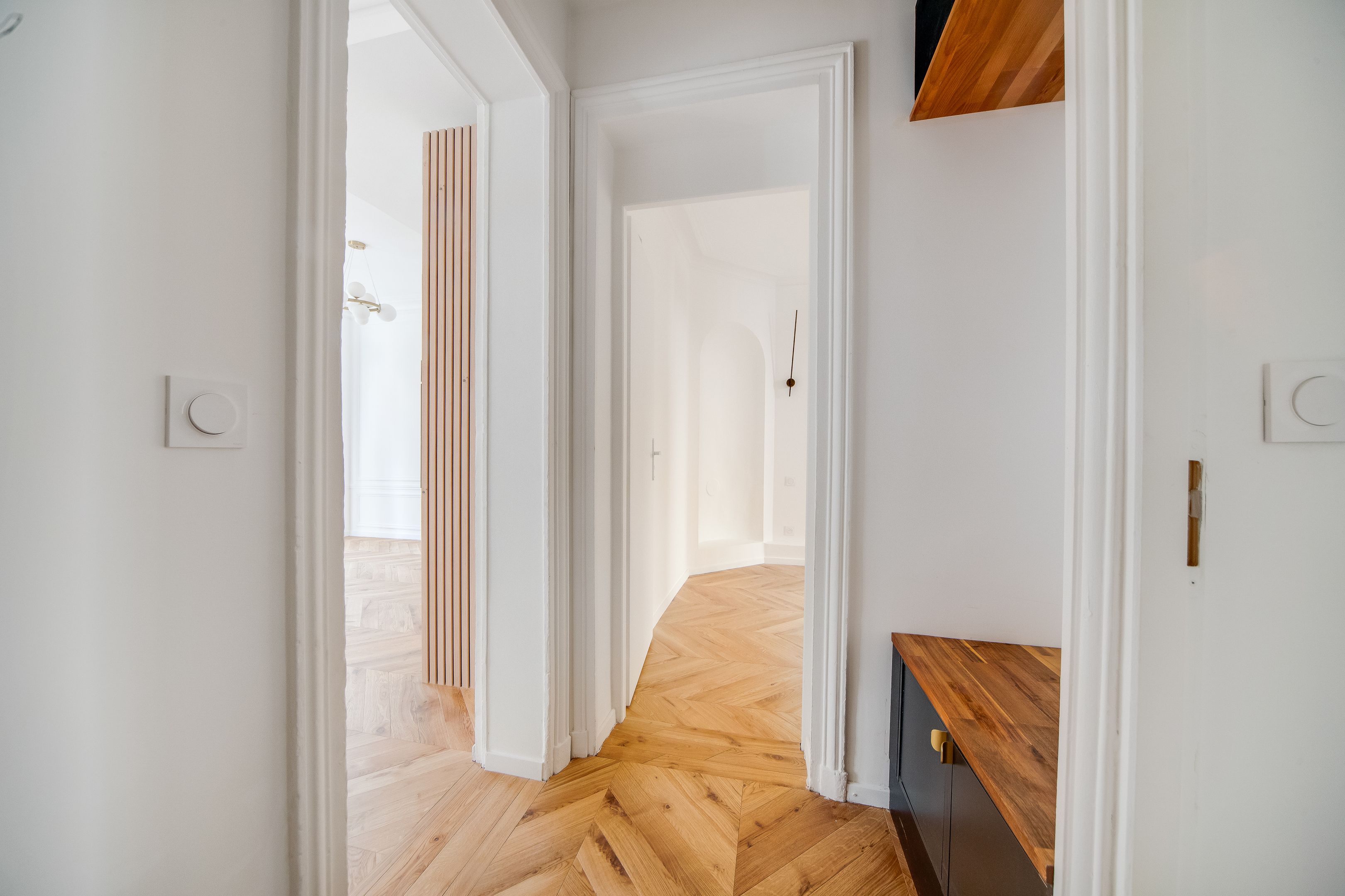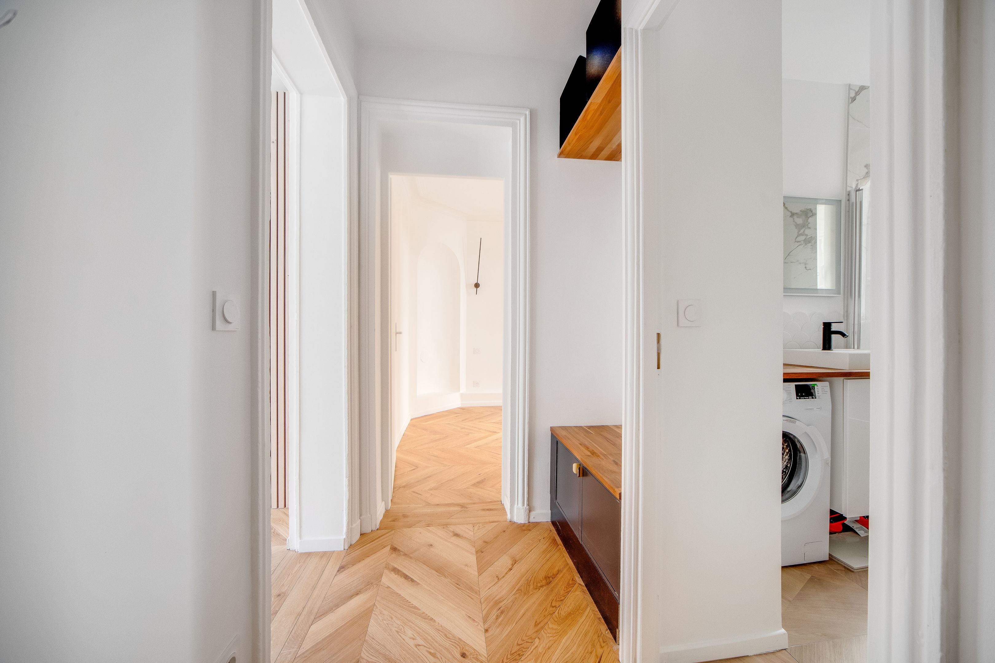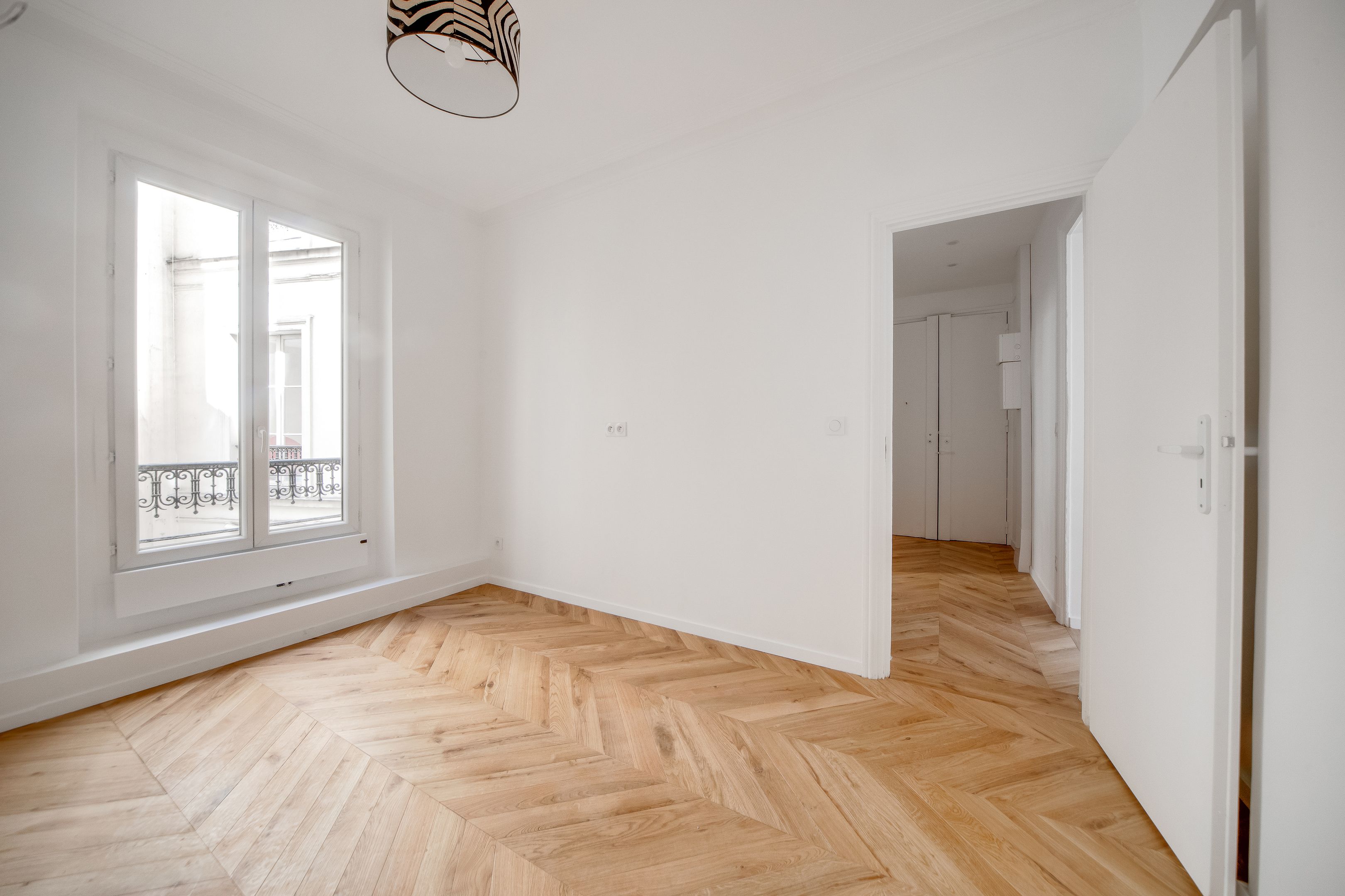 Étoile - Ternes, idéalement situé près des nombreux commerces et transports. Au 2ème étage accessible par ascenseur d'un immeuble ancien de belle facture édifié en 1900, bel appartement lumineux d'une surface de 44,03 m² loi Carrez (45,33 m² au sol) entièrement rénové avec goût, au charme de l'ancien et bénéficiant d'un plan parfait sans perte d'espace. Entrée, séjour orienté à l'est ouvrant sur un large balcon, cuisine ouverte, chambre au calme sur cour, salle d'eau avec toilettes, dégagement, nombreux rangements. Une cave.