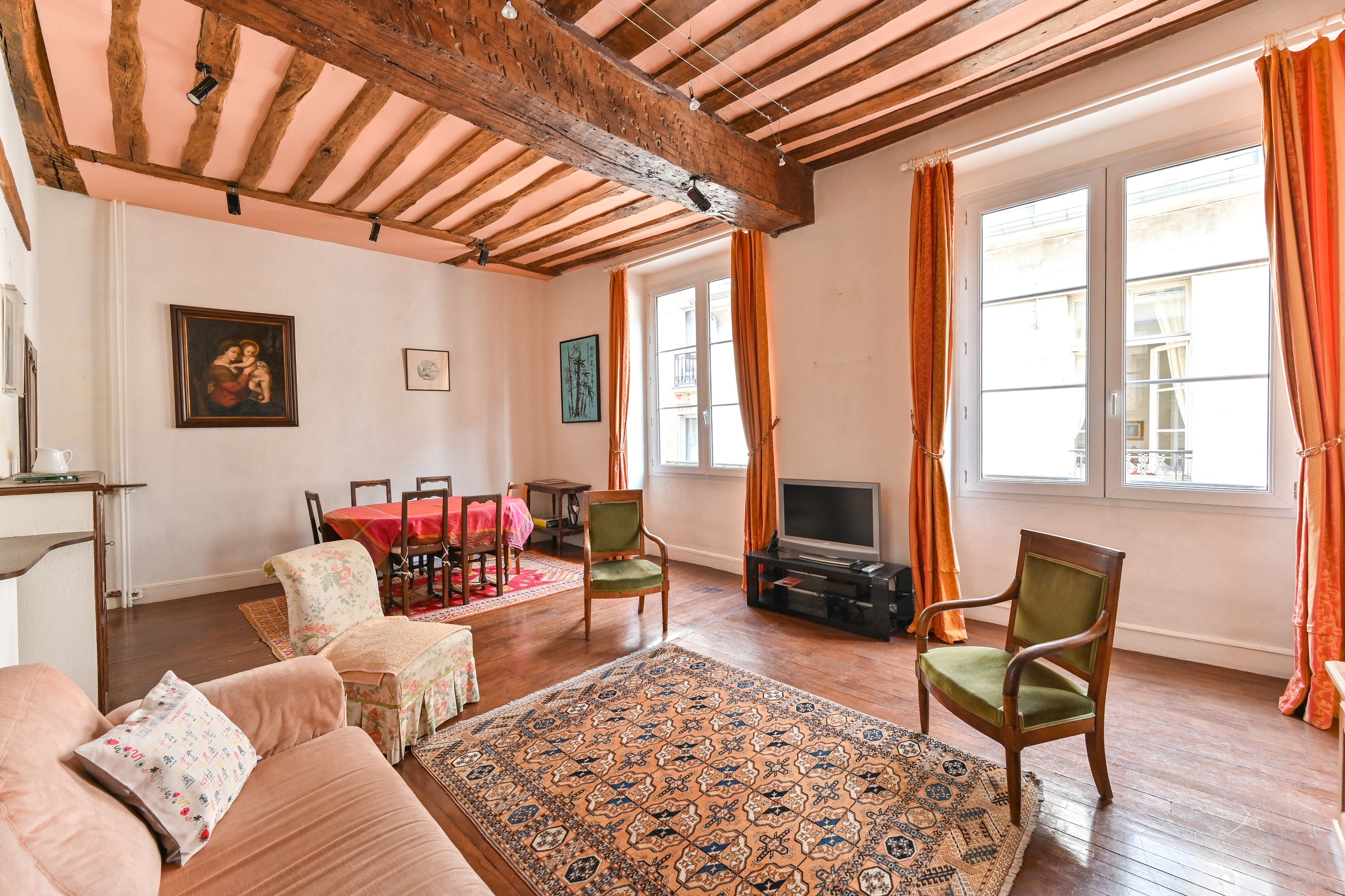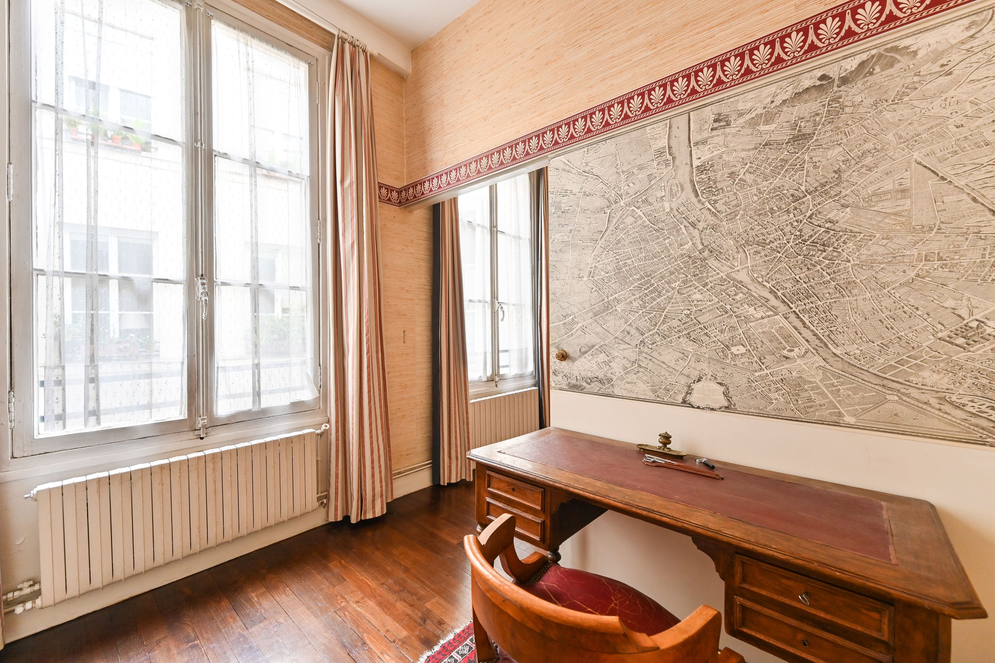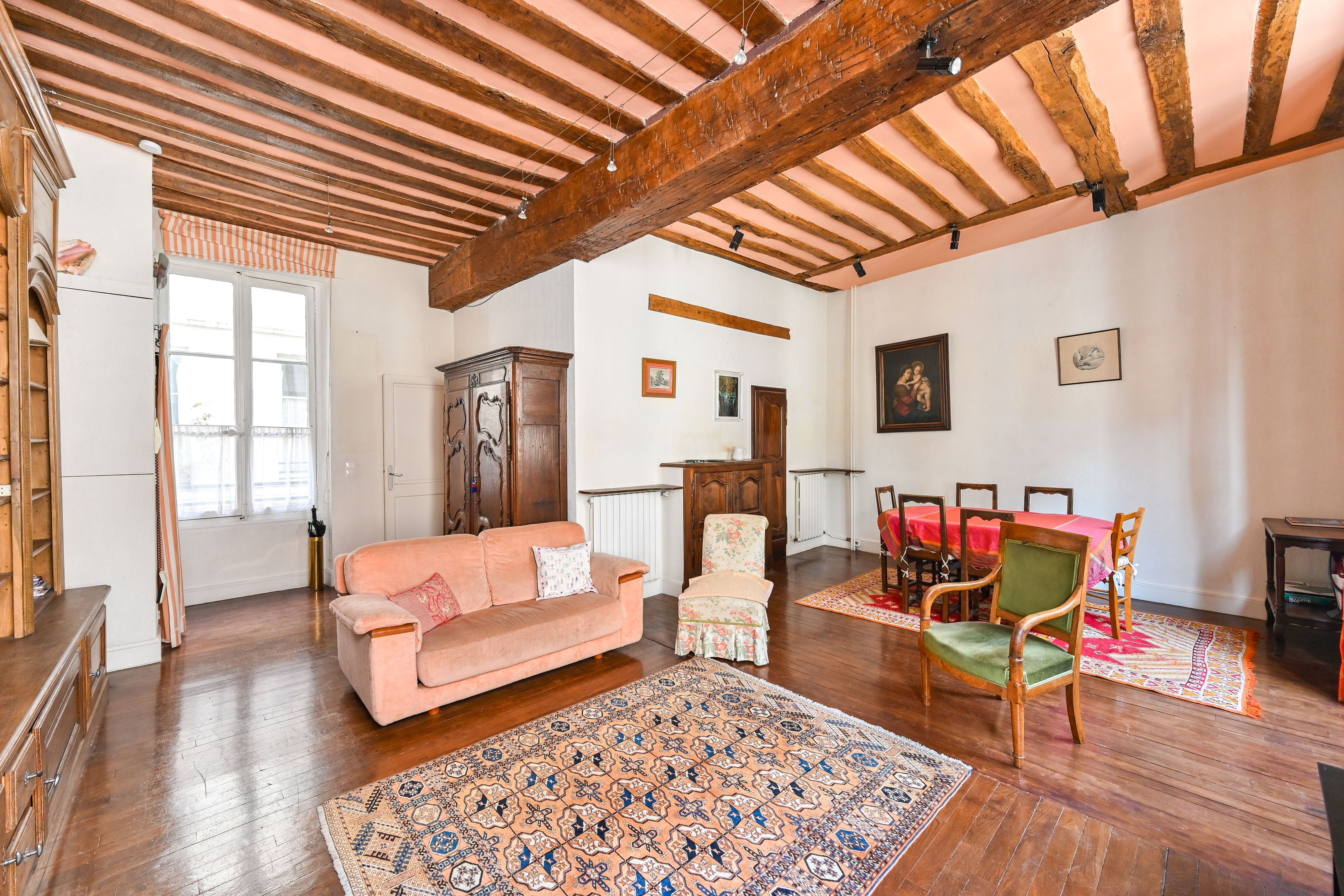 Bel immeuble ancien de 1820, de bon standing et idéalement situé dans le quartier Latin entre Odéon et la Seine, au 2ème étage desservi par ascenseur, un appartement traversant de 79m² (71,78m² loi Carrez + 7,3m² en jouissance exclusive), clair et calme, sans aucune perte de place, bénéficiant de beaux volumes (hauteur sous plafond de 3,20m) et de poutres apparentes. Grand séjour, cuisine séparée, bureau, 2 chambres, salle de bains, salle d'eau, débarras. Rénovation à prévoir, excellent potentiel.