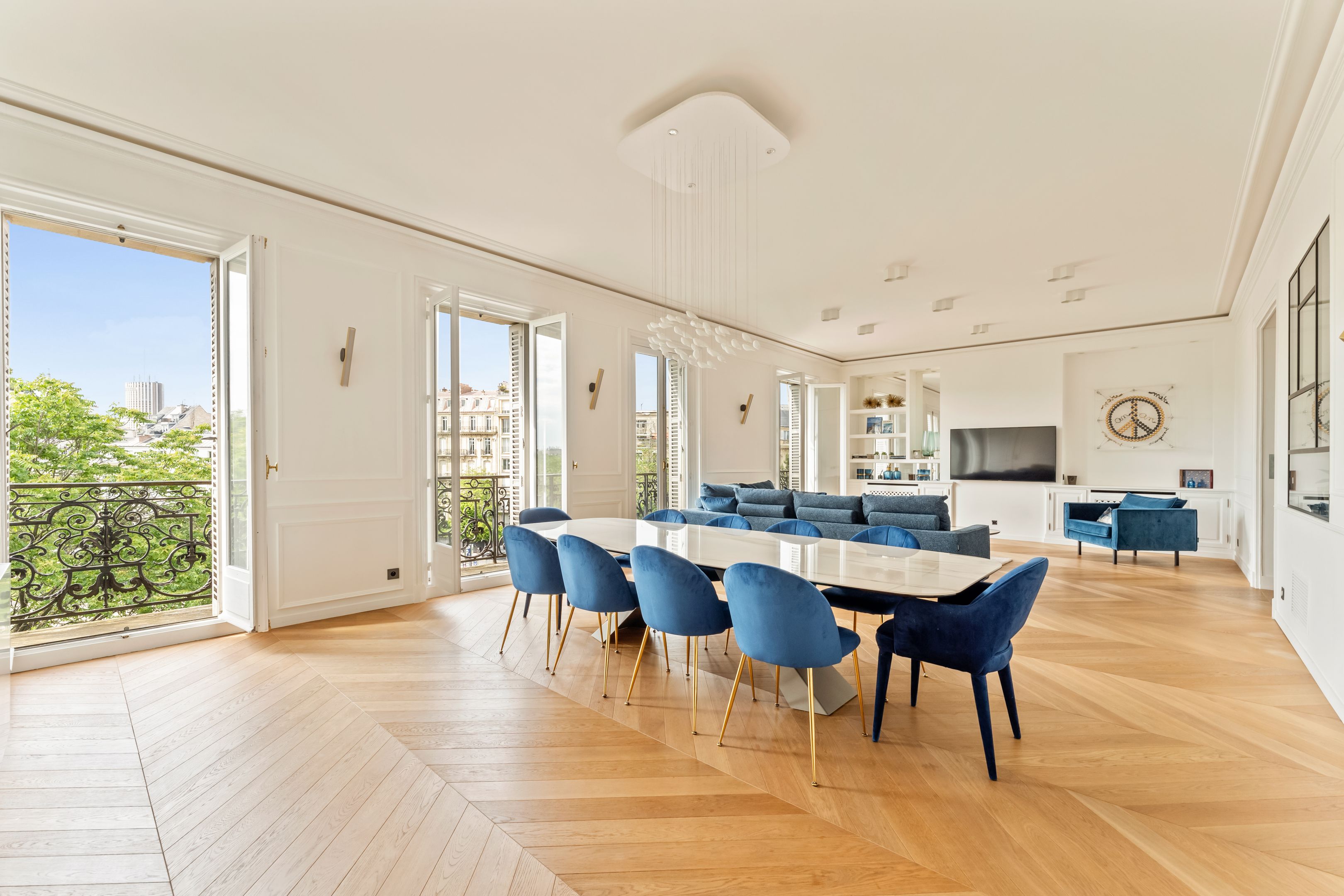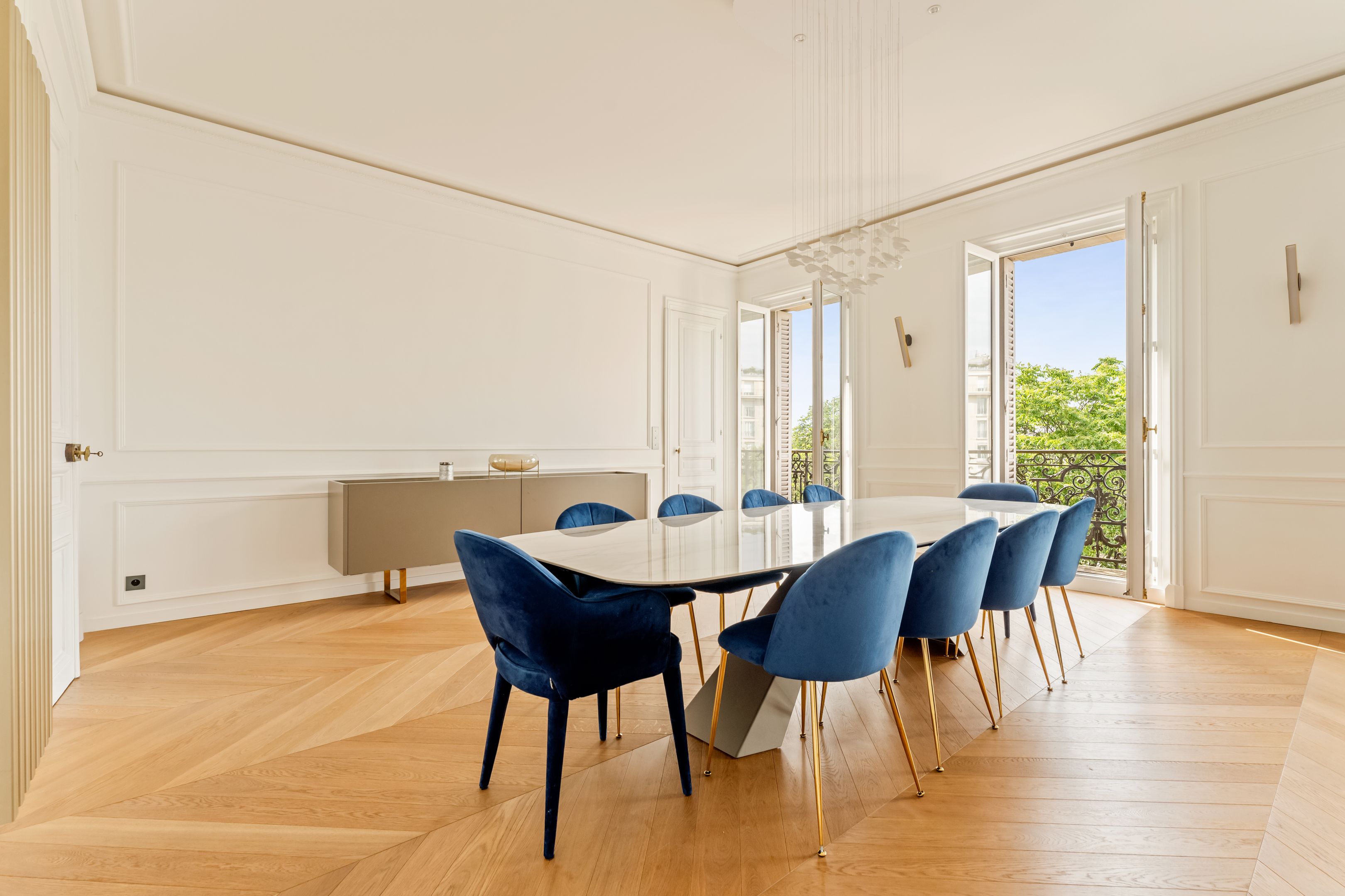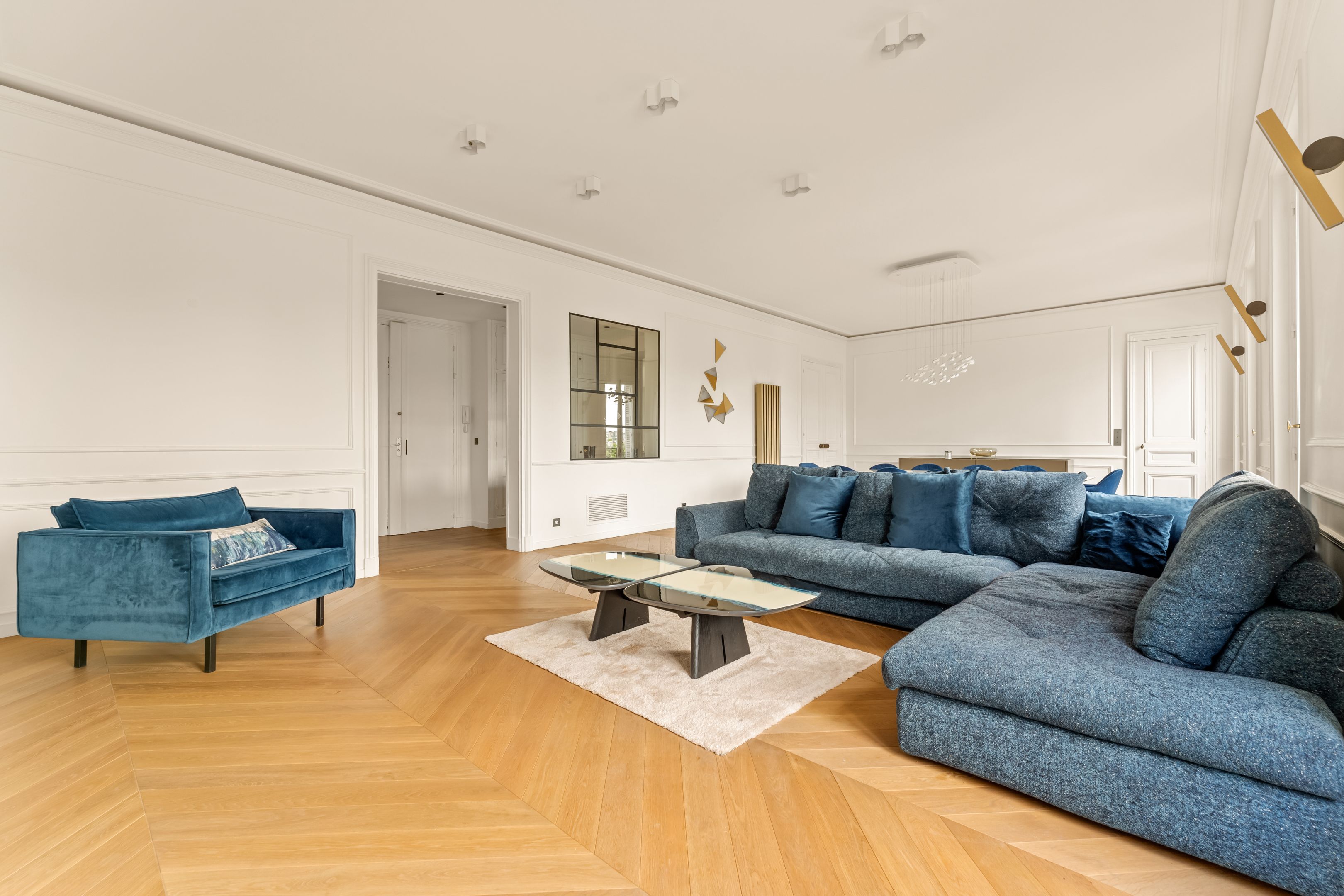 Immeuble pierre de Taille, sécurisé (digicodes, gardien). Très bel appartement meublé de 135 m², récemment rénové, au troisième étage desservi par ascenseur. Vaste entrée, double-réception avec balcon sur l'avenue Foch, cuisine séparée, aménagée et équipée, deux chambres, dressing, salle de bains complète et toilettes invités. Très nombreux rangements.